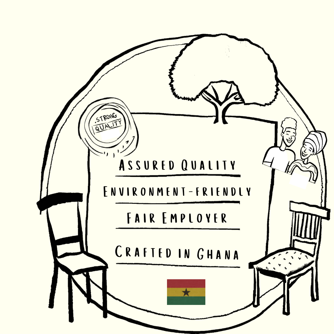 ...bedeutet für uns, dass wir vor Ort produzieren und unsere Materialien lokal beziehen, um die hiesige Handwerkskunst am Leben zu erhalten. Gleichzeitig möchten wir mit der Förderung von Innovation und modernem Design zu der Aufwertung und internationalen Anerkennung ghanaischen Handwerks beitragen. Durch inländische Wertschöpfung wird die lokale Wirtschaft eines Entwicklungslandes unterstützt.