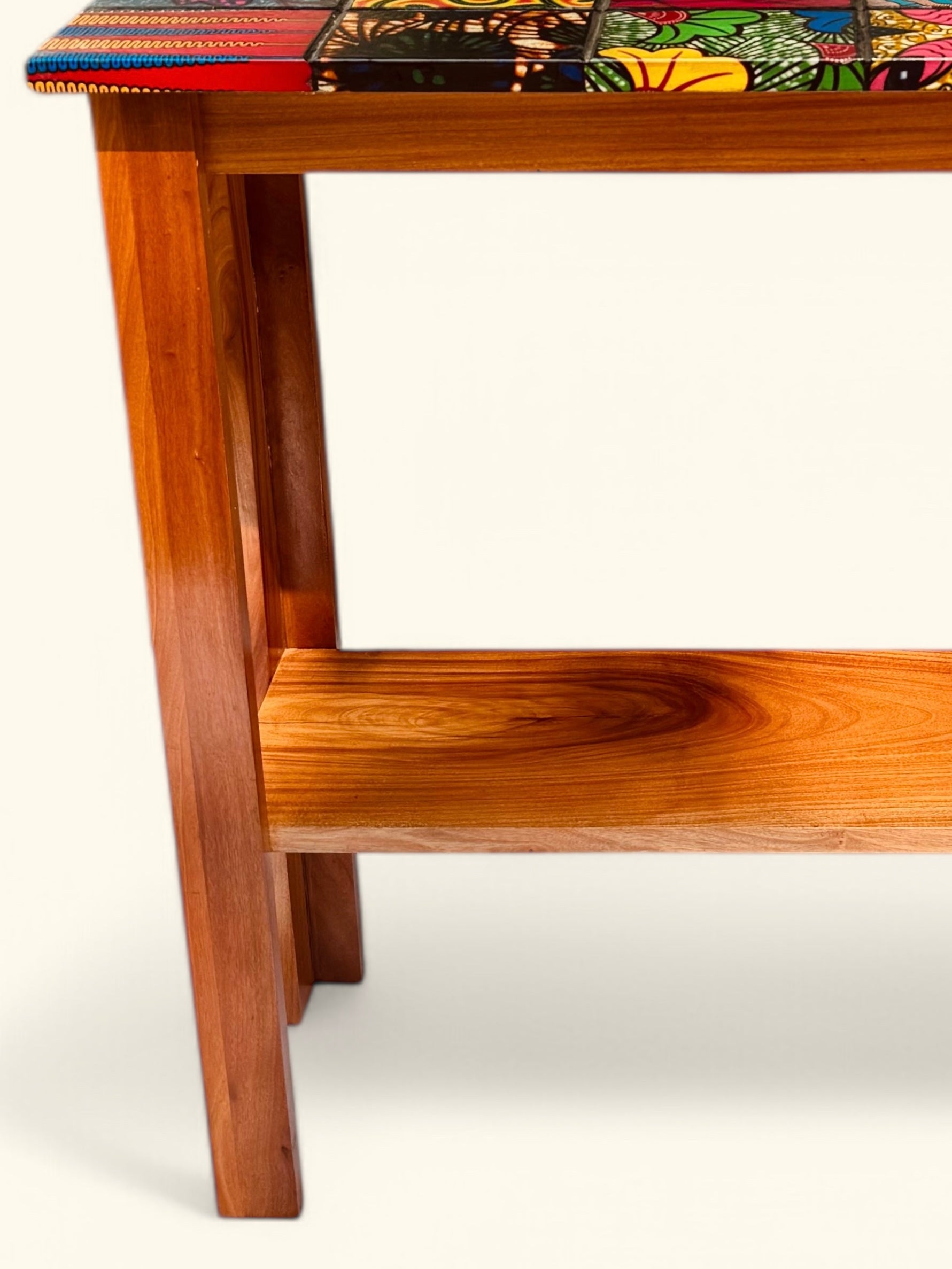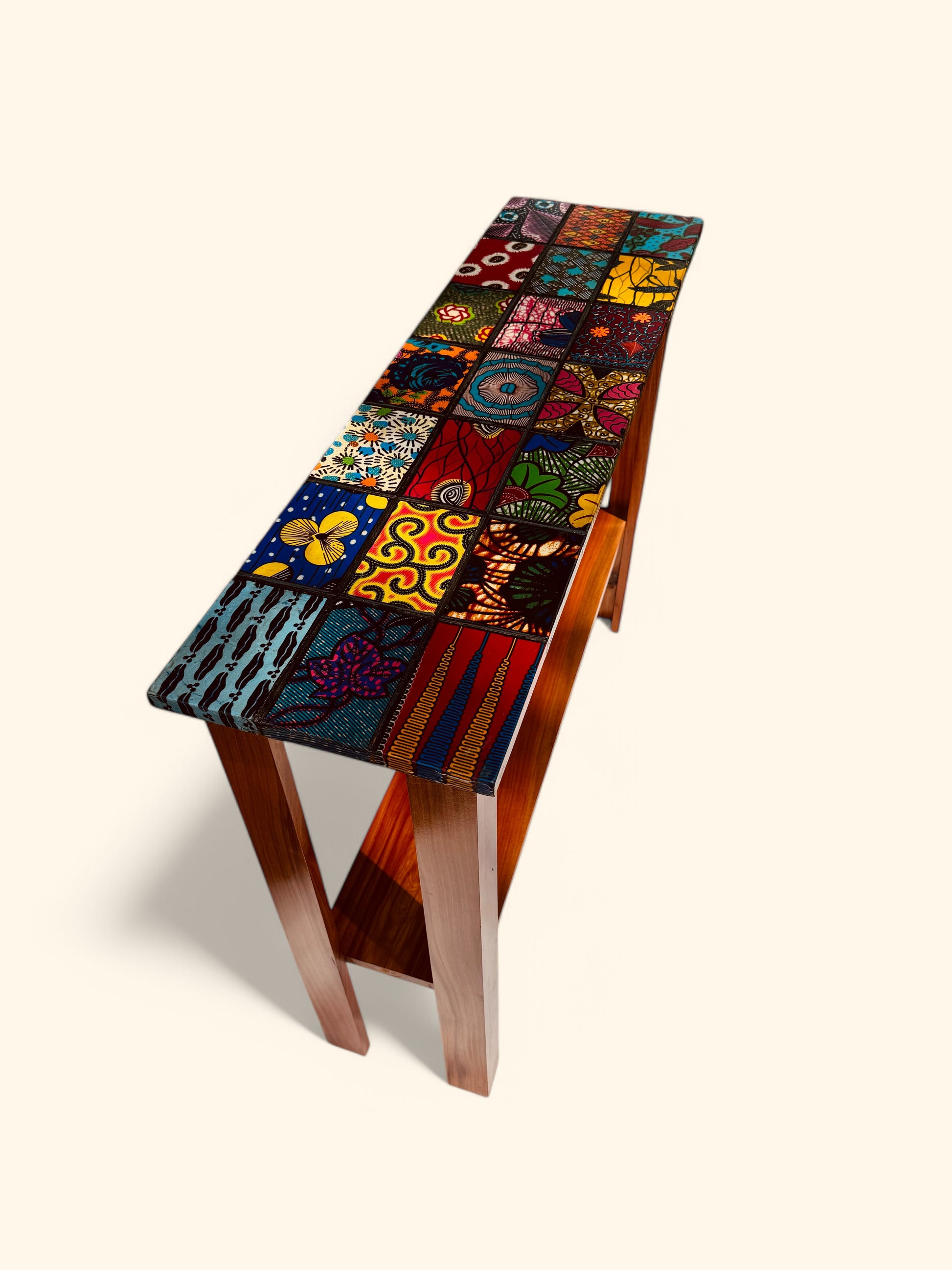 Verwandeln Sie Ihren Raum mit dem extravaganten Beistelltisch „Mosaics of Ntoma“, der kunstvoll aus robustem Danta-Holz gefertigt wurde. Das hervorstechende Merkmal ist die kräftige und verspielte Mosaikoberfläche aus echten afrikanischen Stoffstücken. Mit einer praktischen unteren Ablage kann dieses einzigartige Stück als Minibar, dekoratives Ausstellungsstück oder stilvolle Ergänzung für jeden Raum verwendet werden. Ob in Ihrem Eingangsbereich, Kinderzimmer oder Essbereich, dieses ausgefallene Möbelstück wird Ihrem Zuhause sicherlich einen Hauch von Freude verleihen.