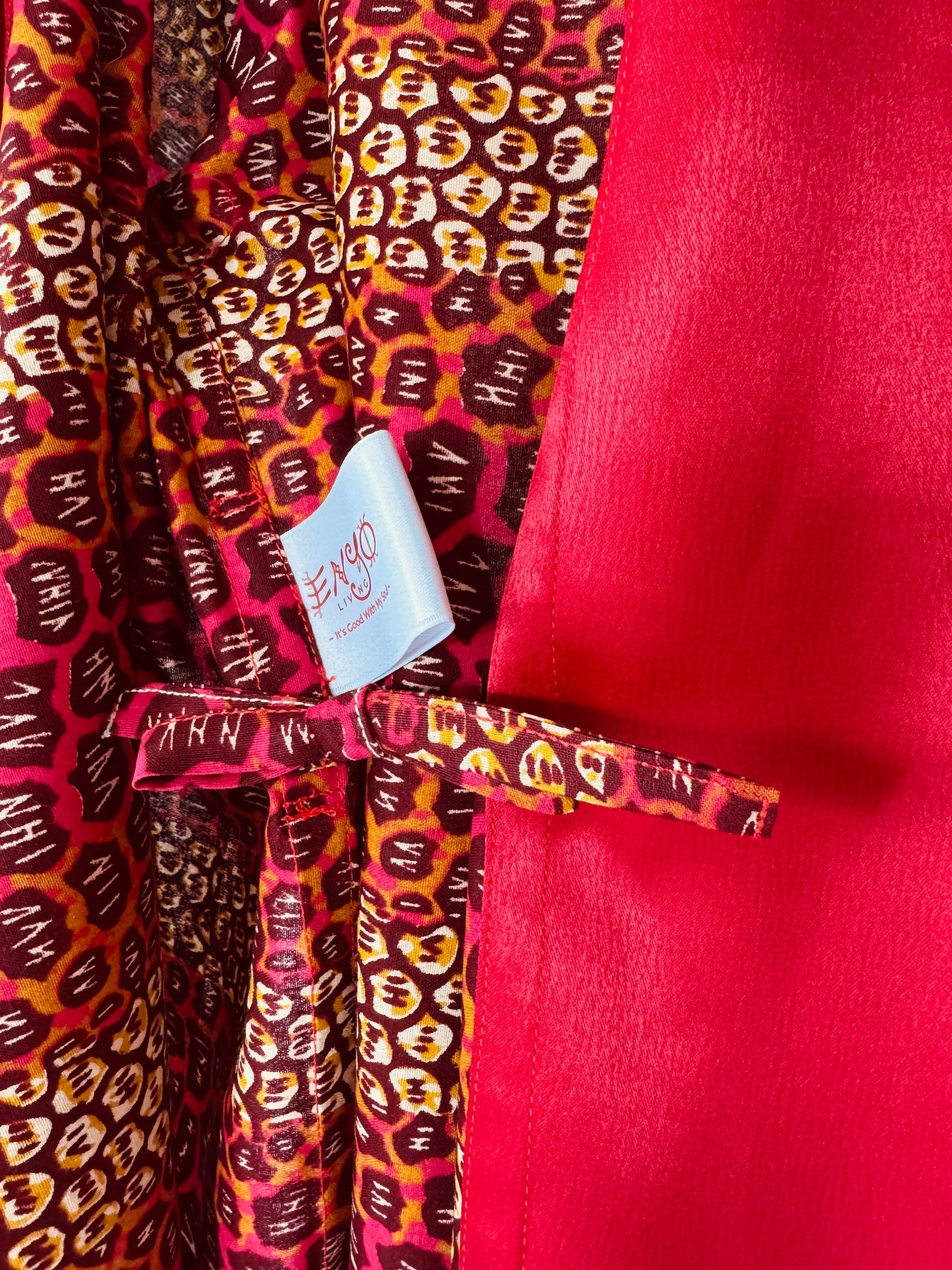 Step into a vibrant spirit with the "Gravels of Joy II" Afrikimo Jacket. Made from luxurious red satin and featuring a captivating pattern who's name is inspired by gravel stones in the local language. Some see the pattern also to be similar to the classy lepard design. This jacket adds a splash of bold elegance to your closet. Perfect for those who love to stand out with a touch of refined flair! Our Afrikimo Jackets are so much more than just a piece of clothing. They are a celebration of natural beauty and confidence, designed to make you feel good in your own skin.