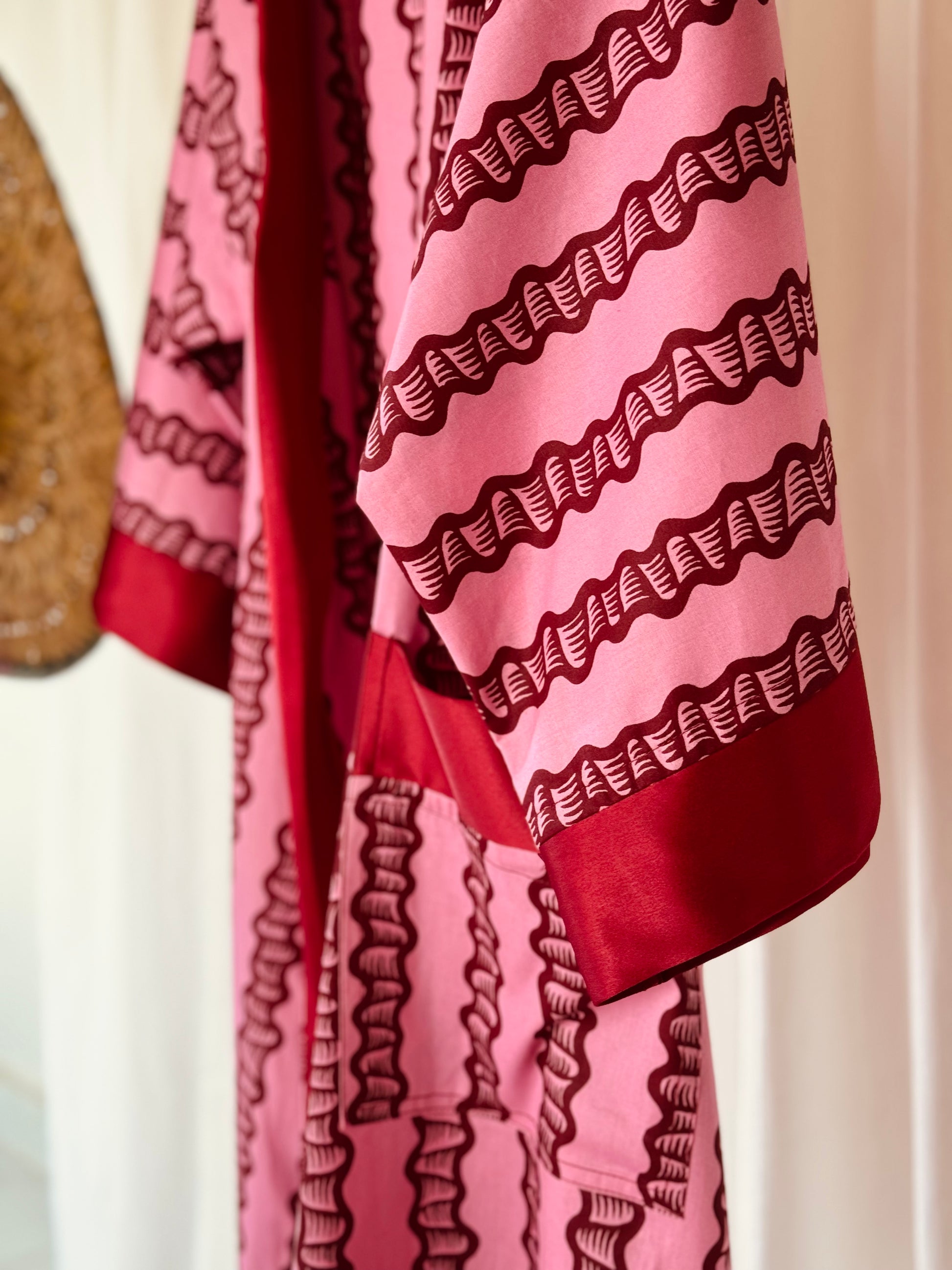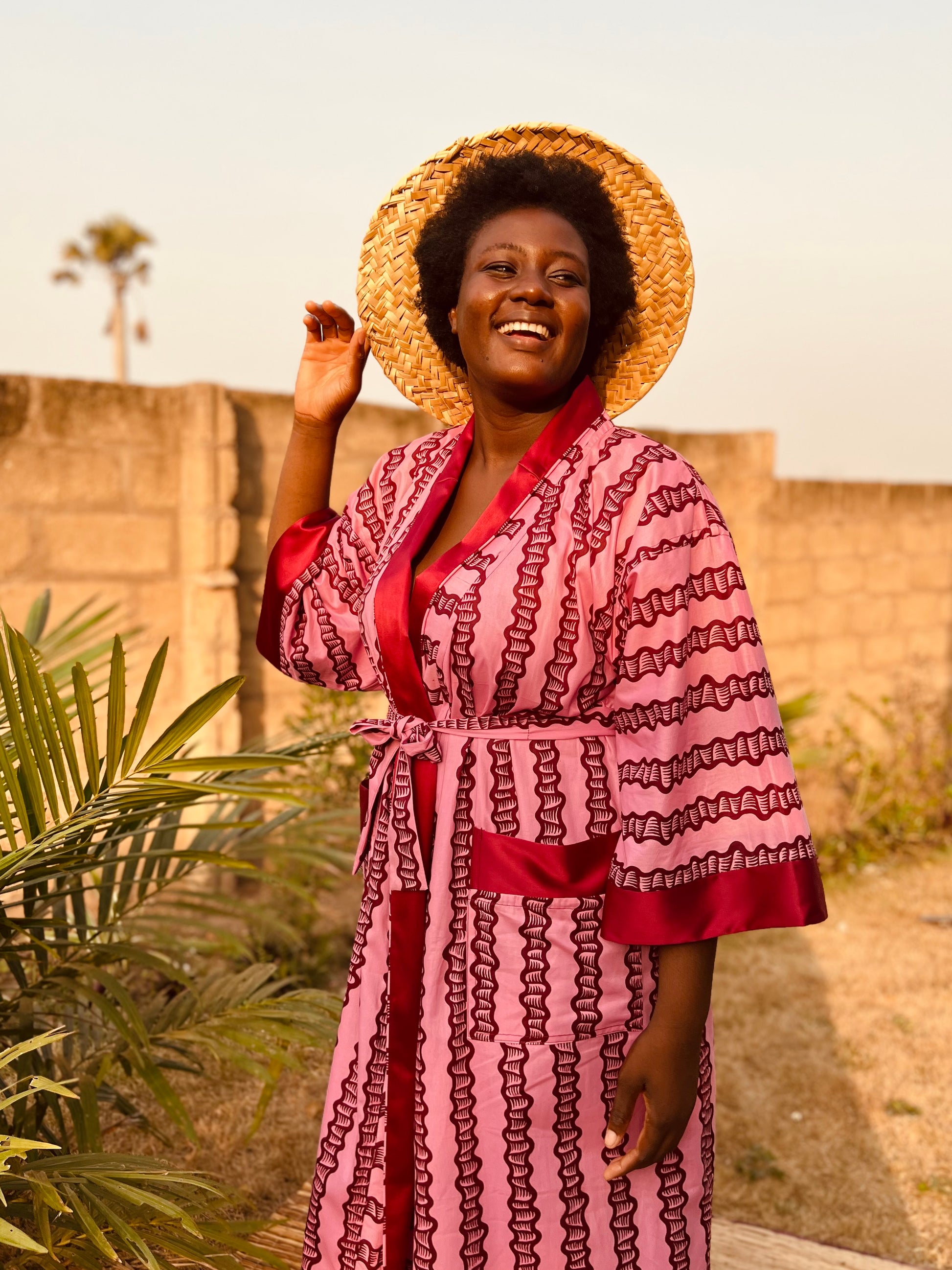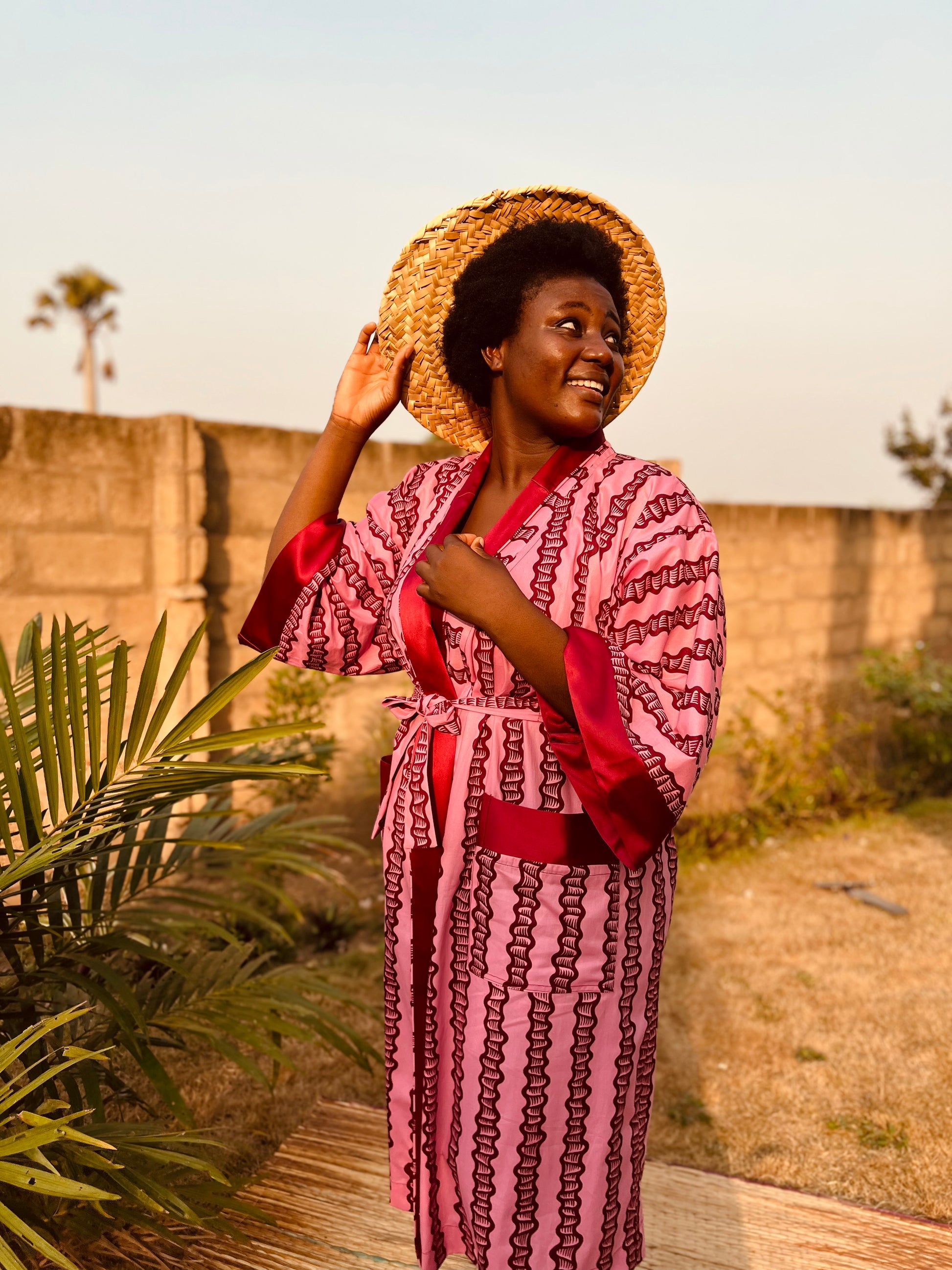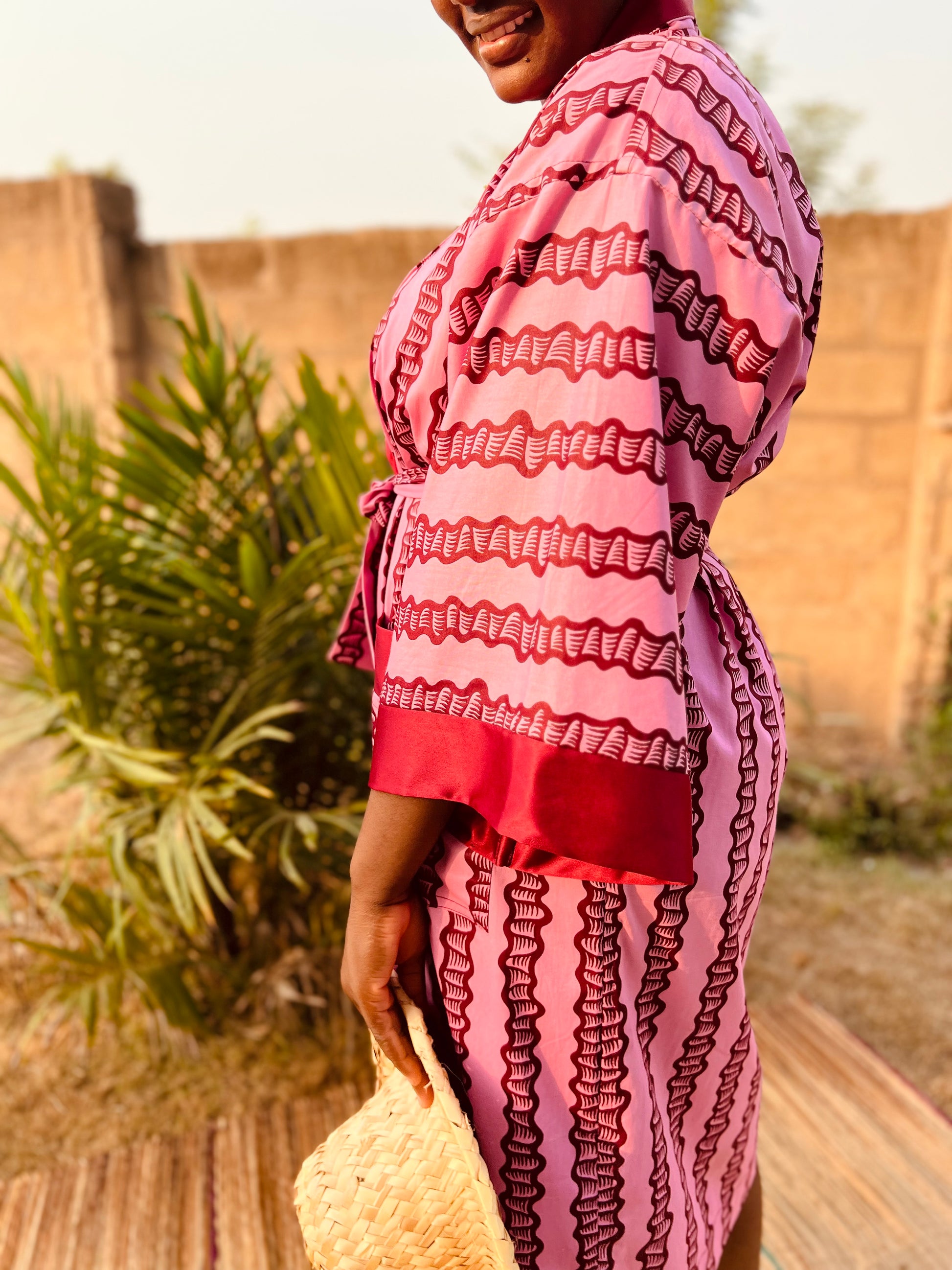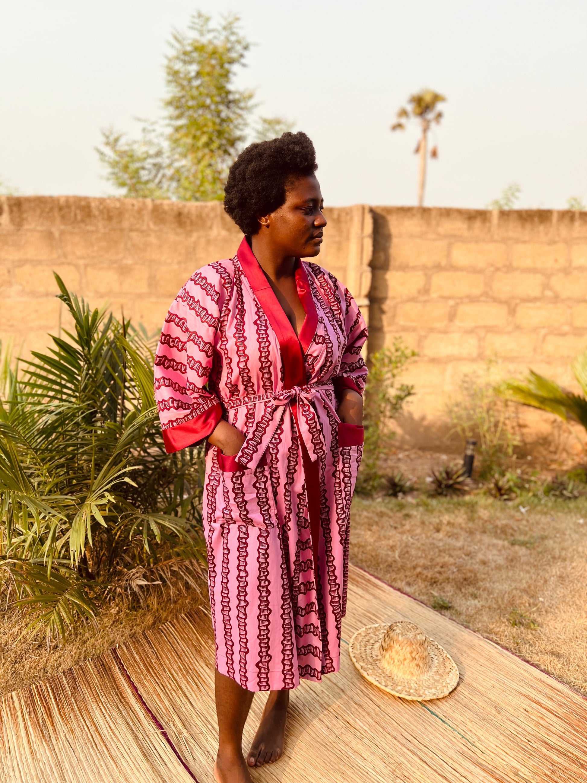 Der zarte rosafarbene Stoff und der auffällige rote Satin vereinen sich in perfekter Harmonie und hüllen dich in ein Gefühl von Ruhe und Ausstrahlung. Ob du dich zu Hause entspannst oder einen Moment für dich selbst nimmst – dieser Afrikimo kombiniert mühelos Lebendigkeit und Eleganz und ist die perfekte Bereicherung für deine Garderobe. Umarm die Schönheit und modernen Luxus mit diesem exquisiten Kleidungsstück, das darauf ausgelegt ist, deine alltägliche Routine zu bereichern und gleichzeitig Momente der Ruhe, Entspannung und unaufdringlichen Selbstsicherheit zu feiern.