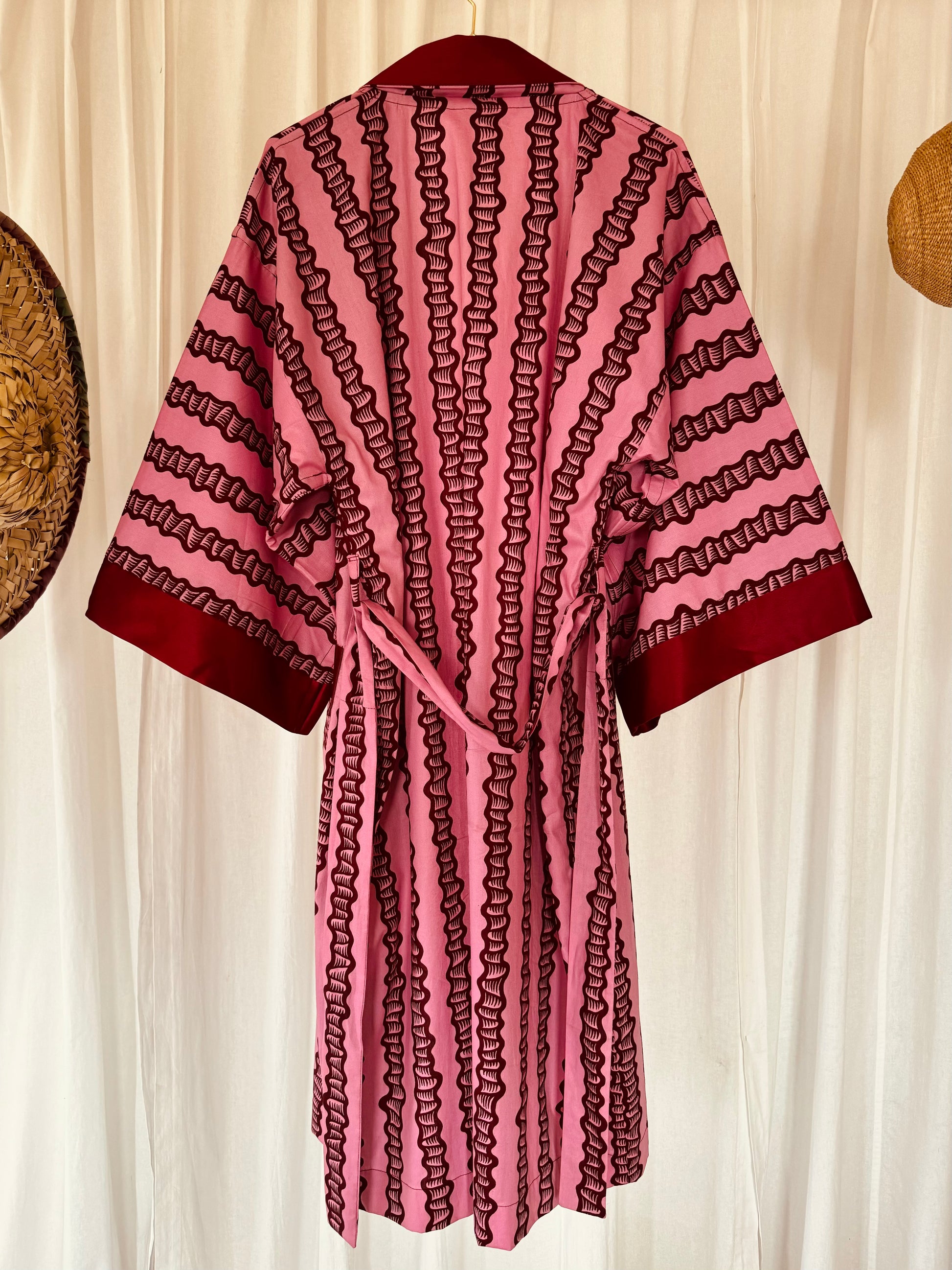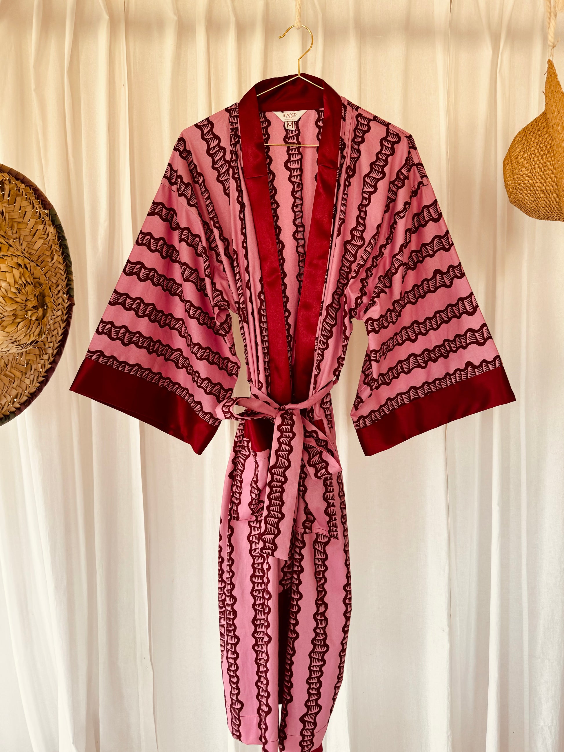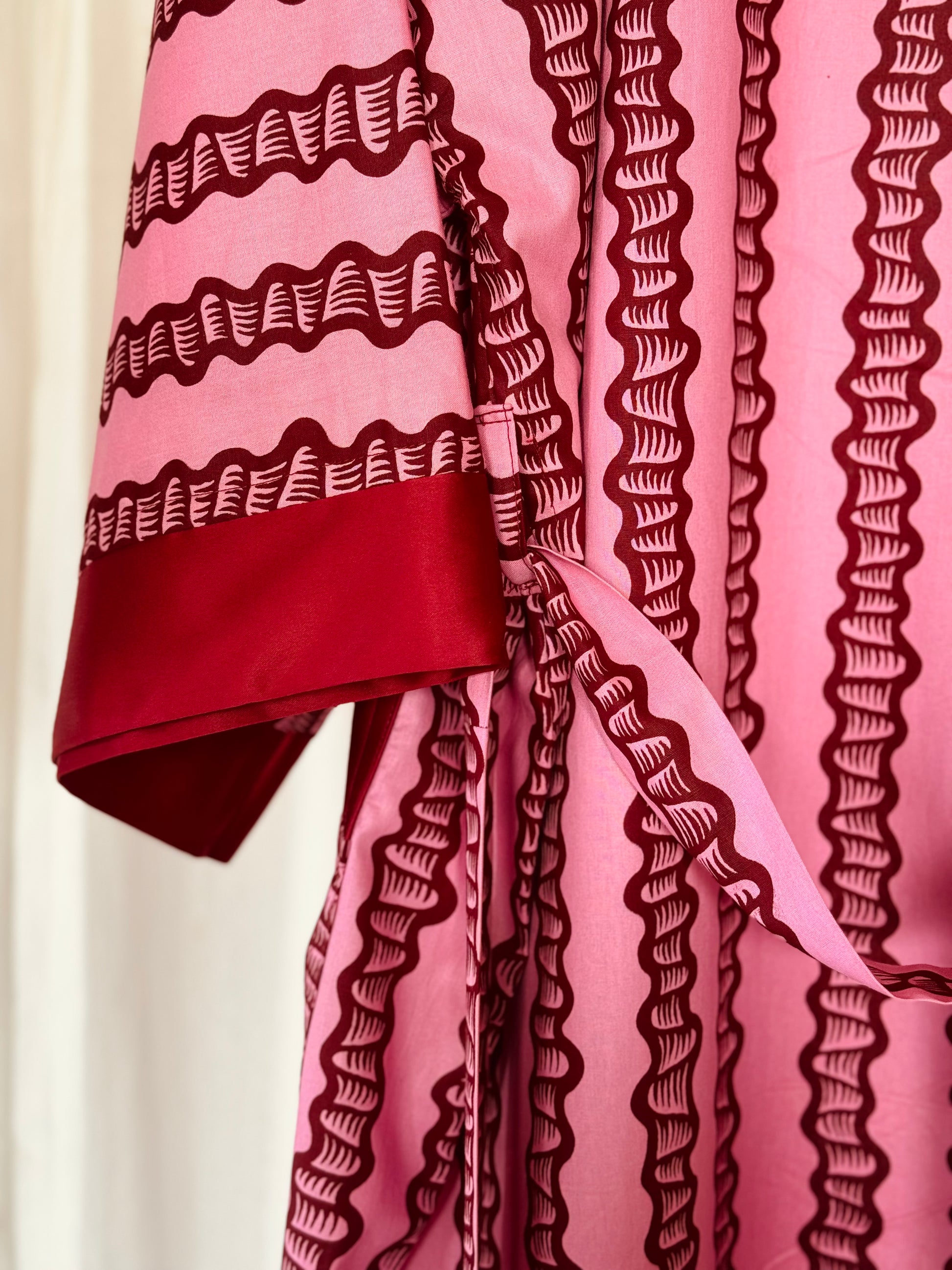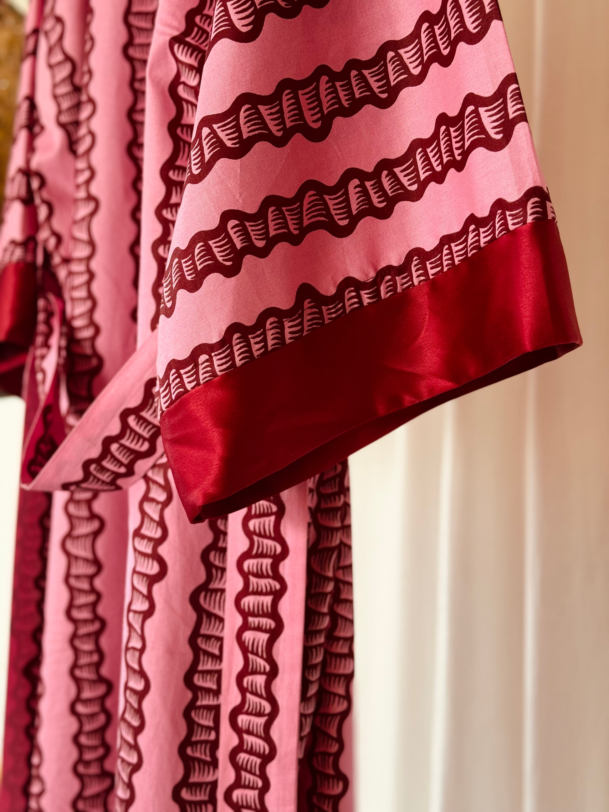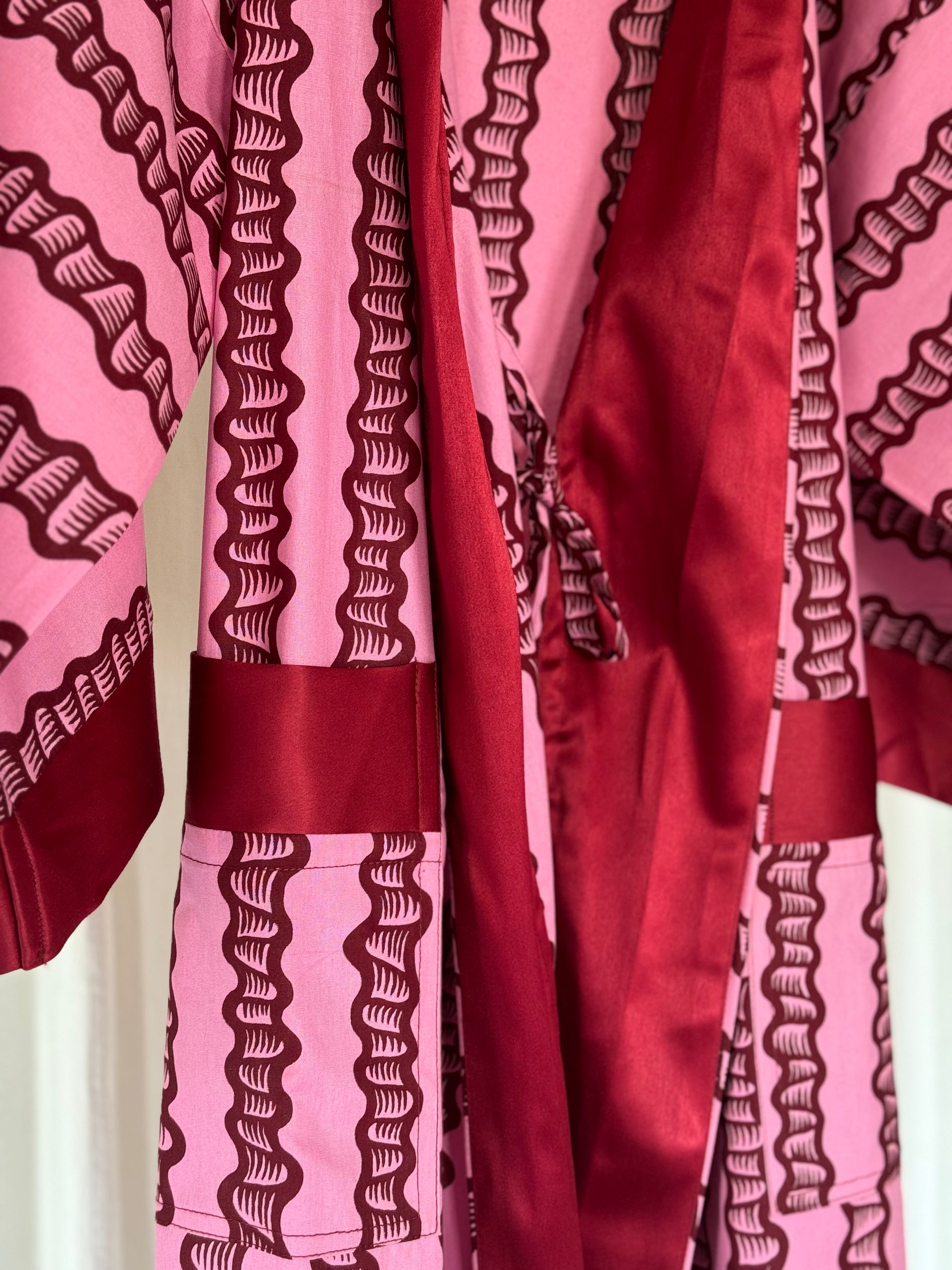 Der zarte rosafarbene Stoff und der auffällige rote Satin vereinen sich in perfekter Harmonie und hüllen dich in ein Gefühl von Ruhe und Ausstrahlung. Ob du dich zu Hause entspannst oder einen Moment für dich selbst nimmst – dieser Afrikimo kombiniert mühelos Lebendigkeit und Eleganz und ist die perfekte Bereicherung für deine Garderobe. Umarm die Schönheit und modernen Luxus mit diesem exquisiten Kleidungsstück, das darauf ausgelegt ist, deine alltägliche Routine zu bereichern und gleichzeitig Momente der Ruhe, Entspannung und unaufdringlichen Selbstsicherheit zu feiern.