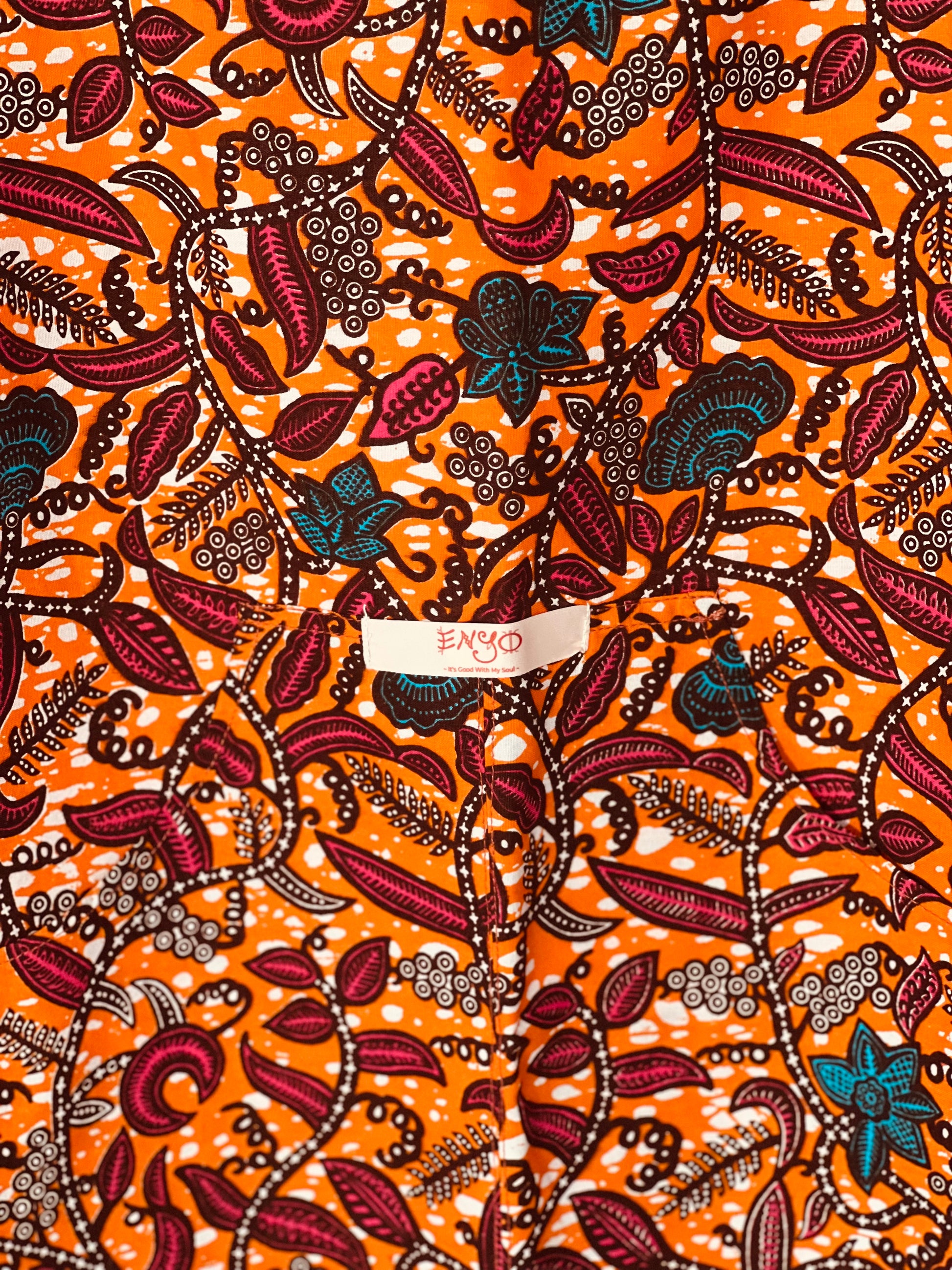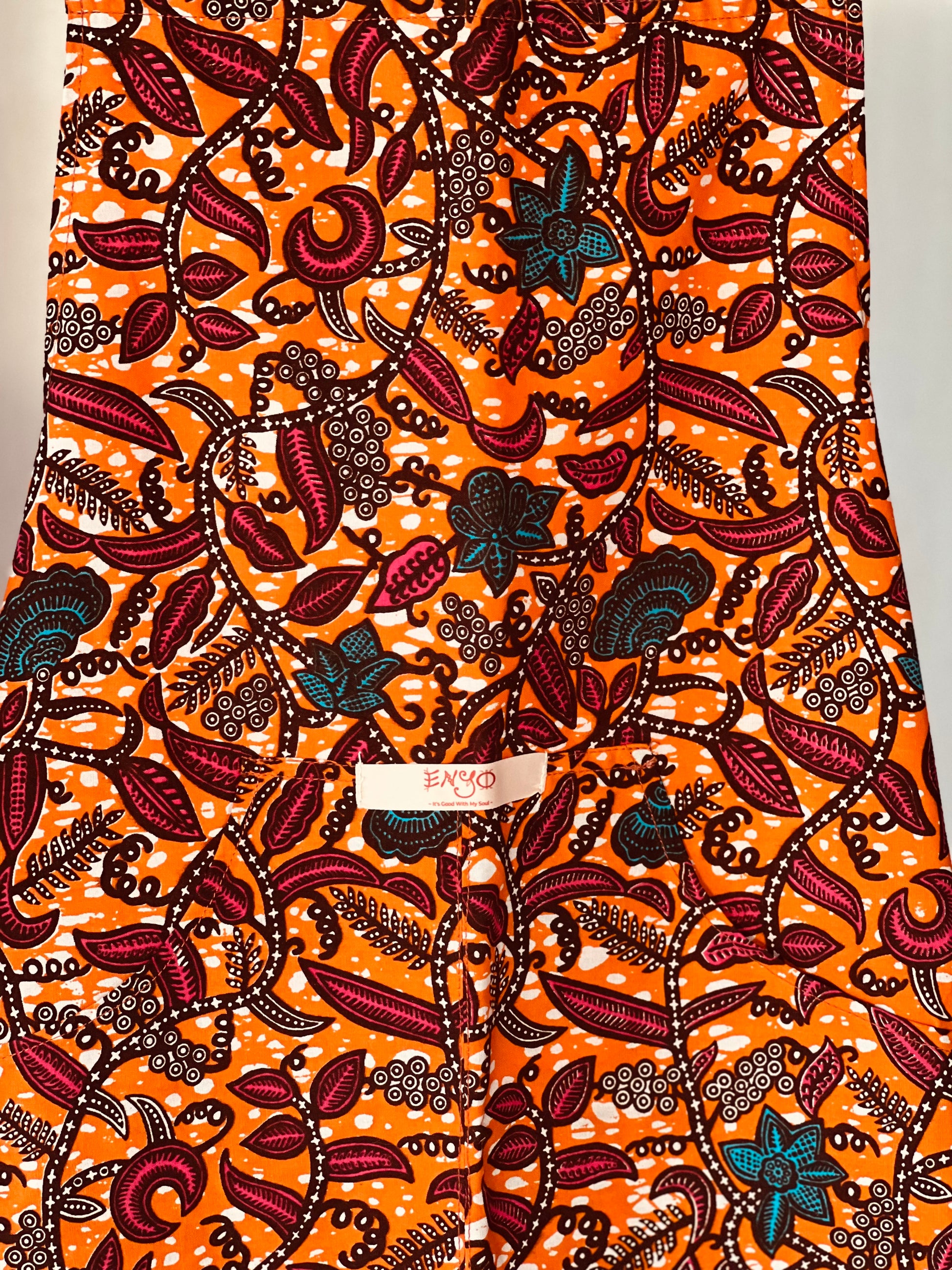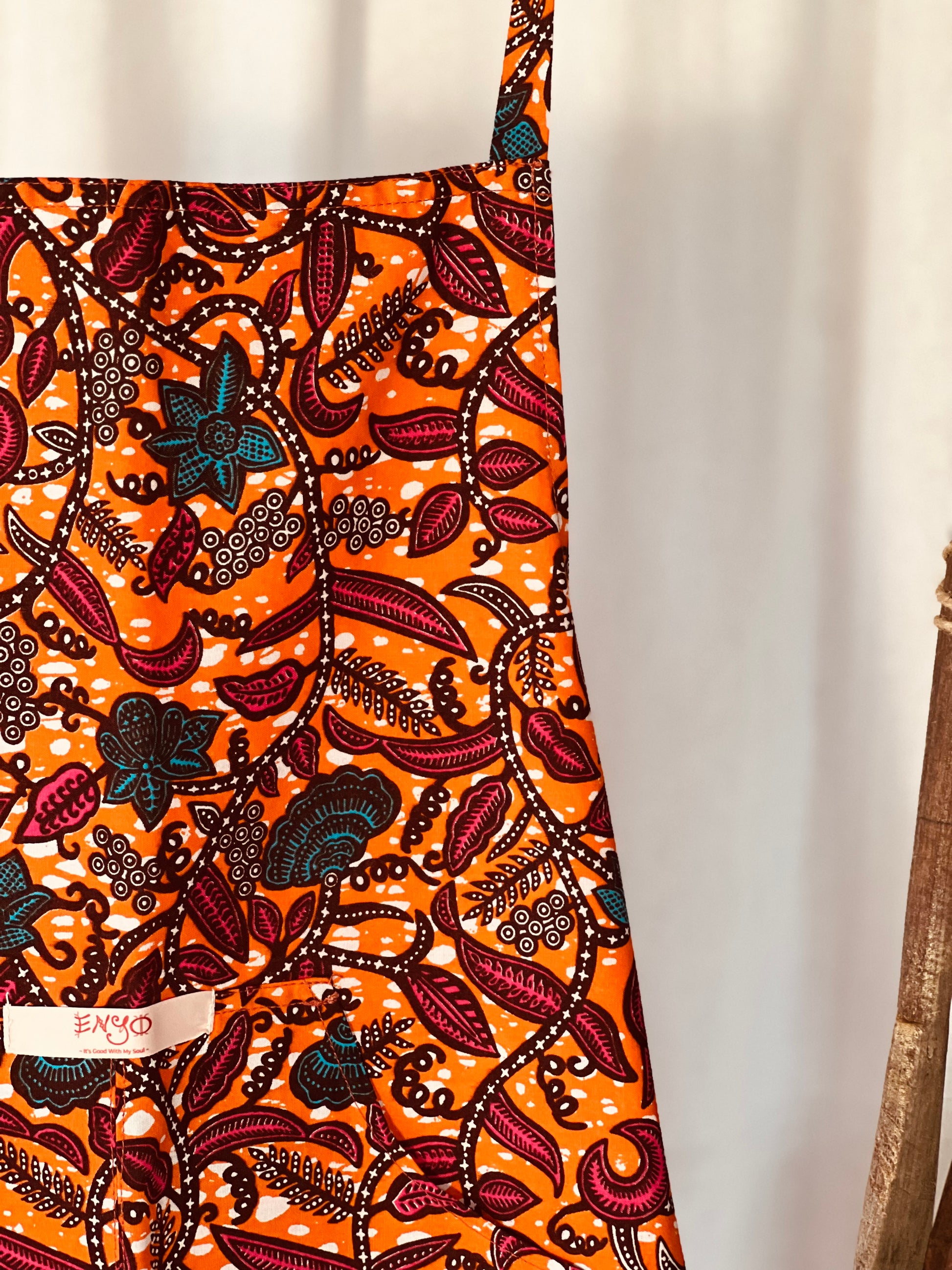 Bring etwas ghanaisch-frühlingshaften Flair in deine Küche mit der Schürze „Blooming Bliss“! Mit ihrem lebhaften und fröhlichen Blumendesign in Orange, Pink und Blau schützt diese Schürze nicht nur deine Kleidung vor Spritzern, sondern lässt dich auch in der Küche gut aussehen und dich gut fühlen. Mit ihren abgerundeten Kanten bekommt das Modell „Mademoiselle“ eine charmant feminine Ausstrahlung. Die Wendefunktion mit robuster, einfarbiger Baumwolle auf einer Seite sorgt für vielseitigen Stil und zusätzlichen Schutz durch die doppelte Stofflage. Große Taschen auf beiden Seiten bieten praktischen Stauraum für Kochutensilien, dein Handy oder Rezepte. Diese Schürze ist so schön, dass du sie bestimmt auch beim Abendessen mit Freunden anbehalten möchtest.