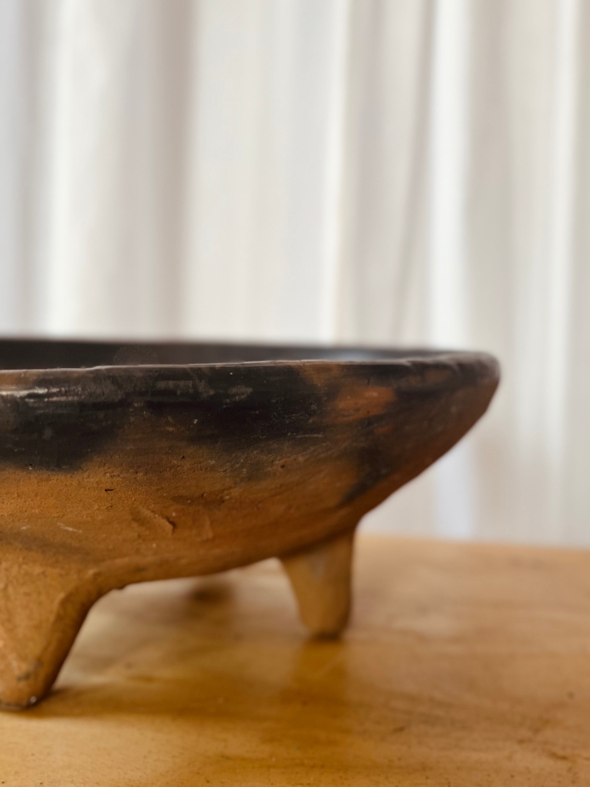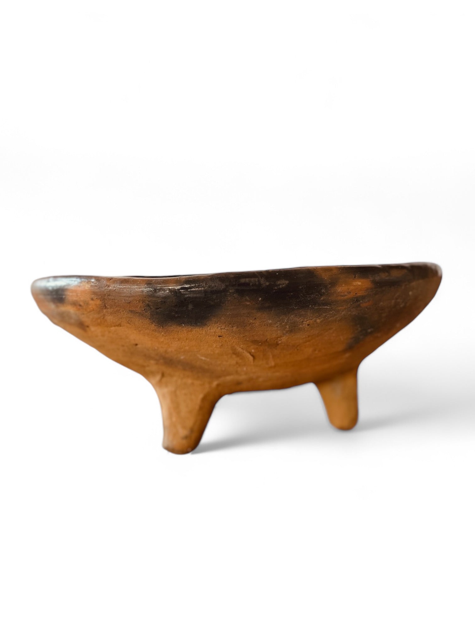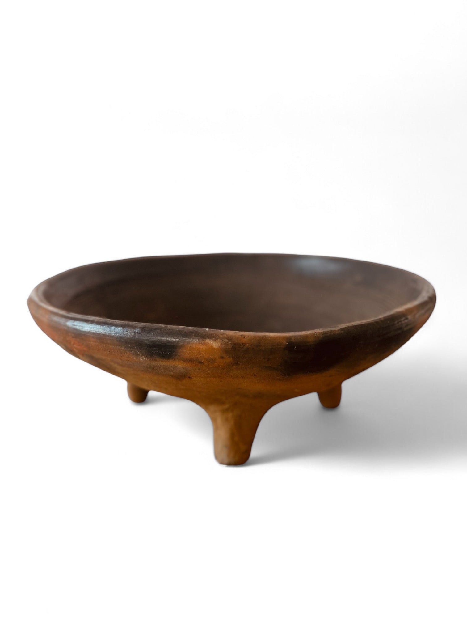 Diese vierbeinige Meko-Schüssel aus natürlichem Ton beeindruckt mit ihrer einzigartigen Struktur und den sanften Farbnuancen. Mit einem Durchmesser von 13 Zoll (33 cm) ist sie ein wahres skulpturales Kunstwerk. Nutze sie als dekoratives Herzstück, als stilvolle Obst- oder Gemüseschale in der Küche oder als elegante Ablage für Schlüssel im Eingangsbereich. Egal, wo du sie hinstellst – sie bringt auf jeden Fall einen Hauch von Eleganz in dein Zuhause, tief verwurzelt in natürlicher Schönheit und Tradition.