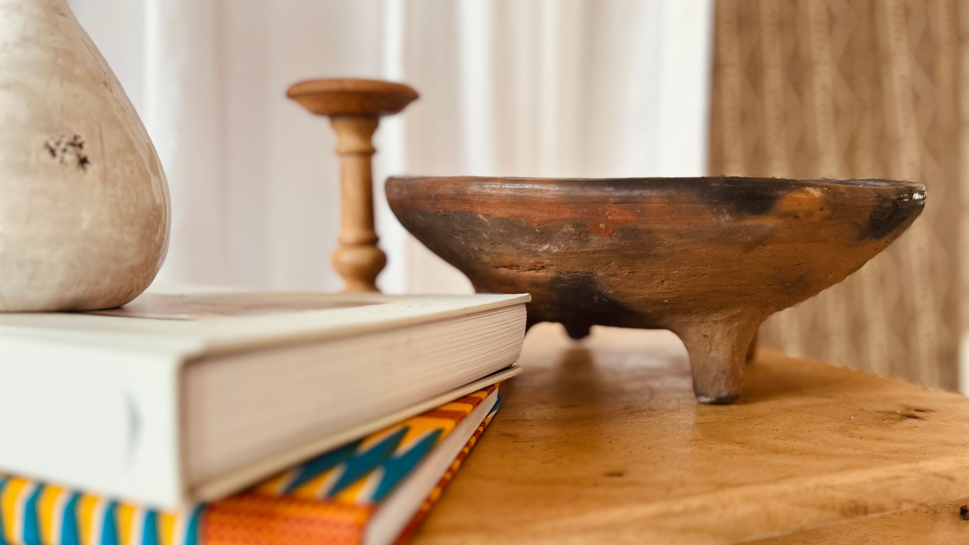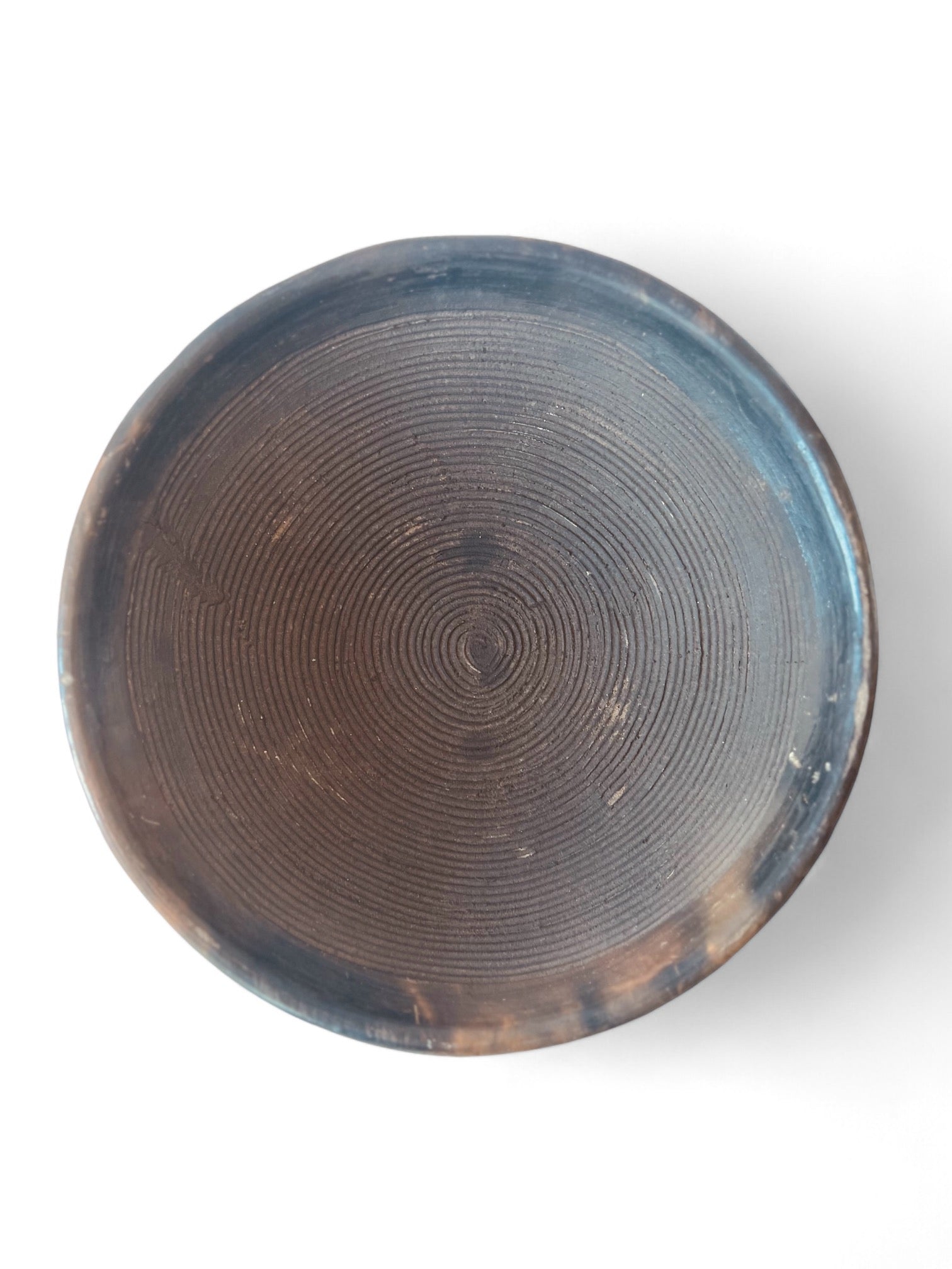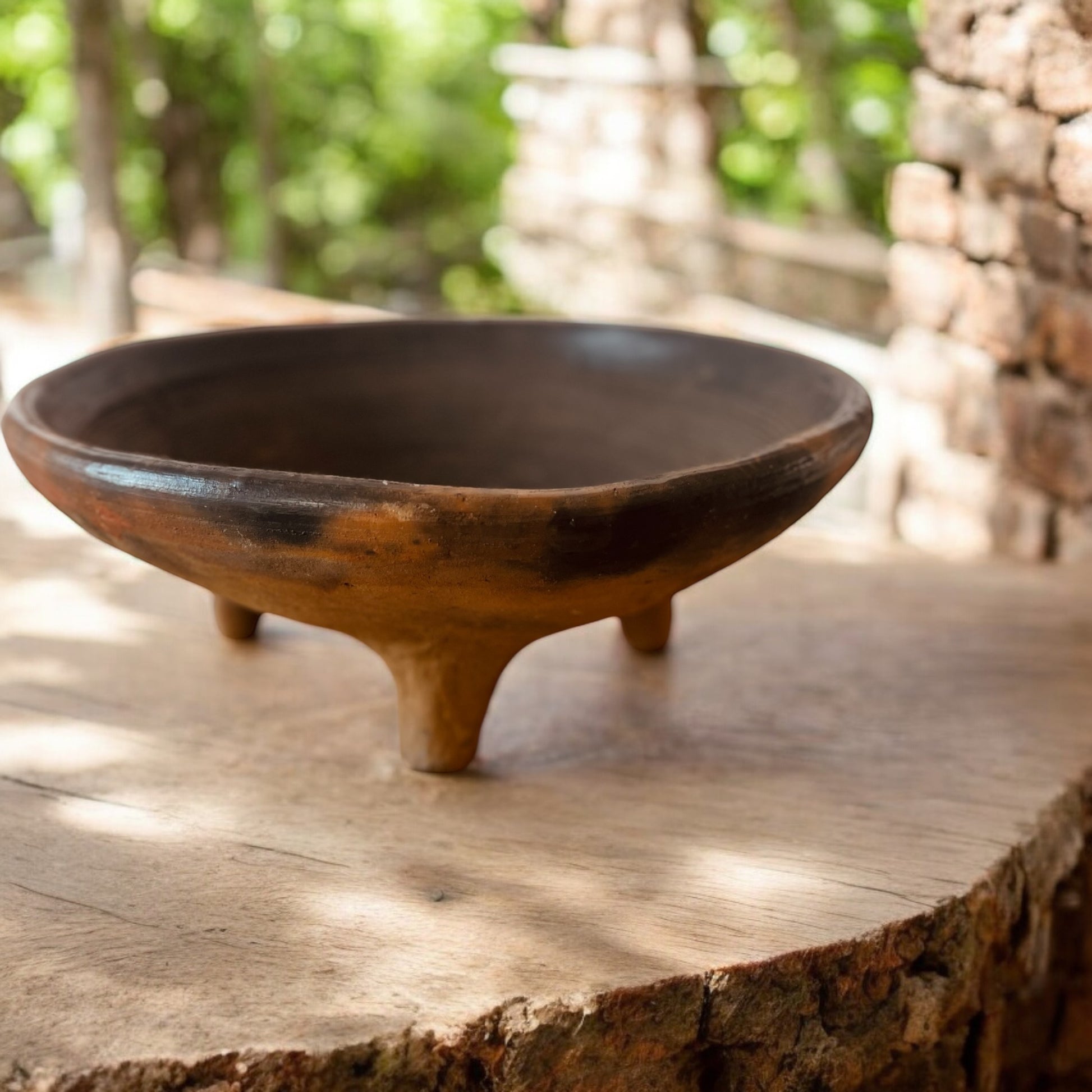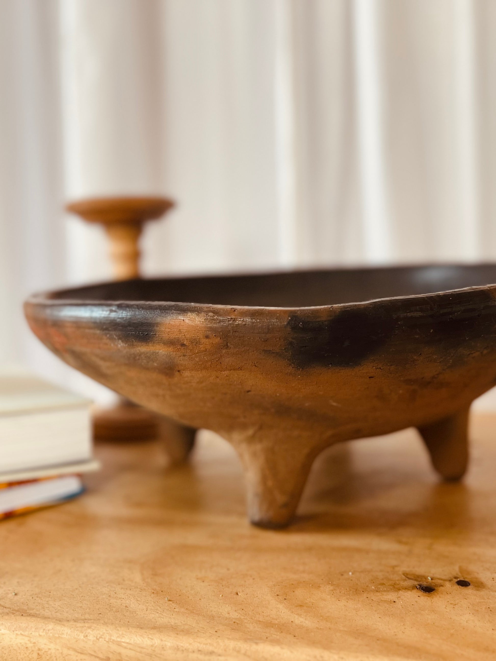 Diese vierbeinige Meko-Schüssel aus natürlichem Ton beeindruckt mit ihrer einzigartigen Struktur und den sanften Farbnuancen. Mit einem Durchmesser von 13 Zoll (33 cm) ist sie ein wahres skulpturales Kunstwerk. Nutze sie als dekoratives Herzstück, als stilvolle Obst- oder Gemüseschale in der Küche oder als elegante Ablage für Schlüssel im Eingangsbereich. Egal, wo du sie hinstellst – sie bringt auf jeden Fall einen Hauch von Eleganz in dein Zuhause, tief verwurzelt in natürlicher Schönheit und Tradition.