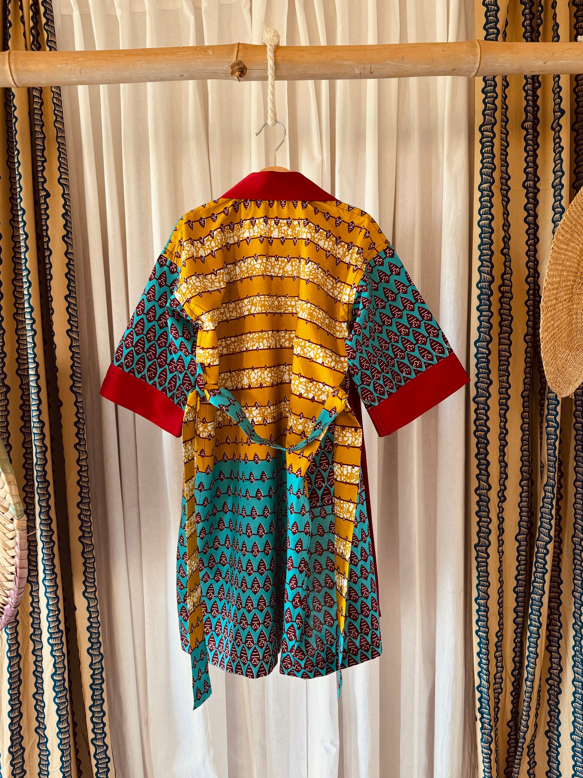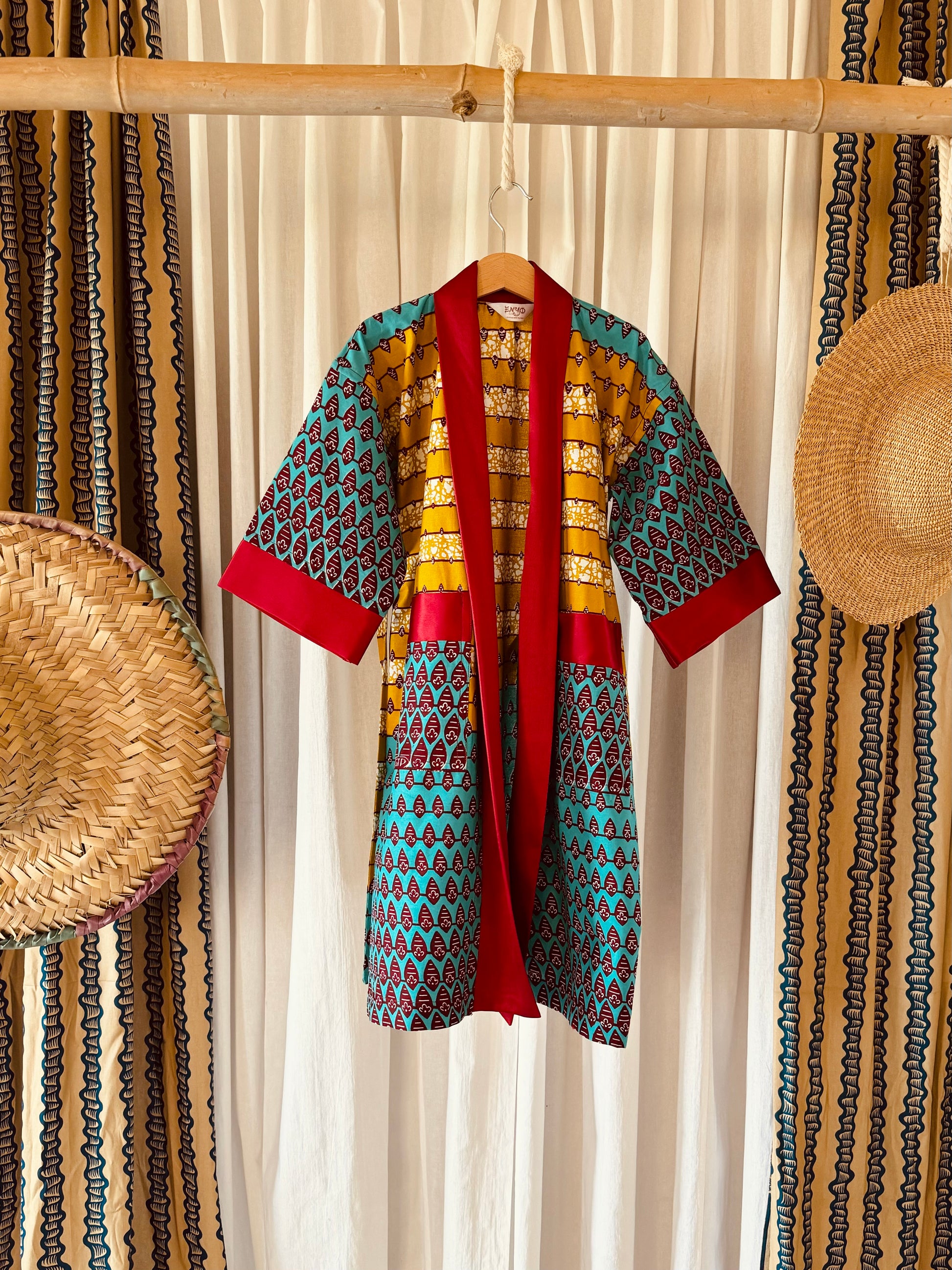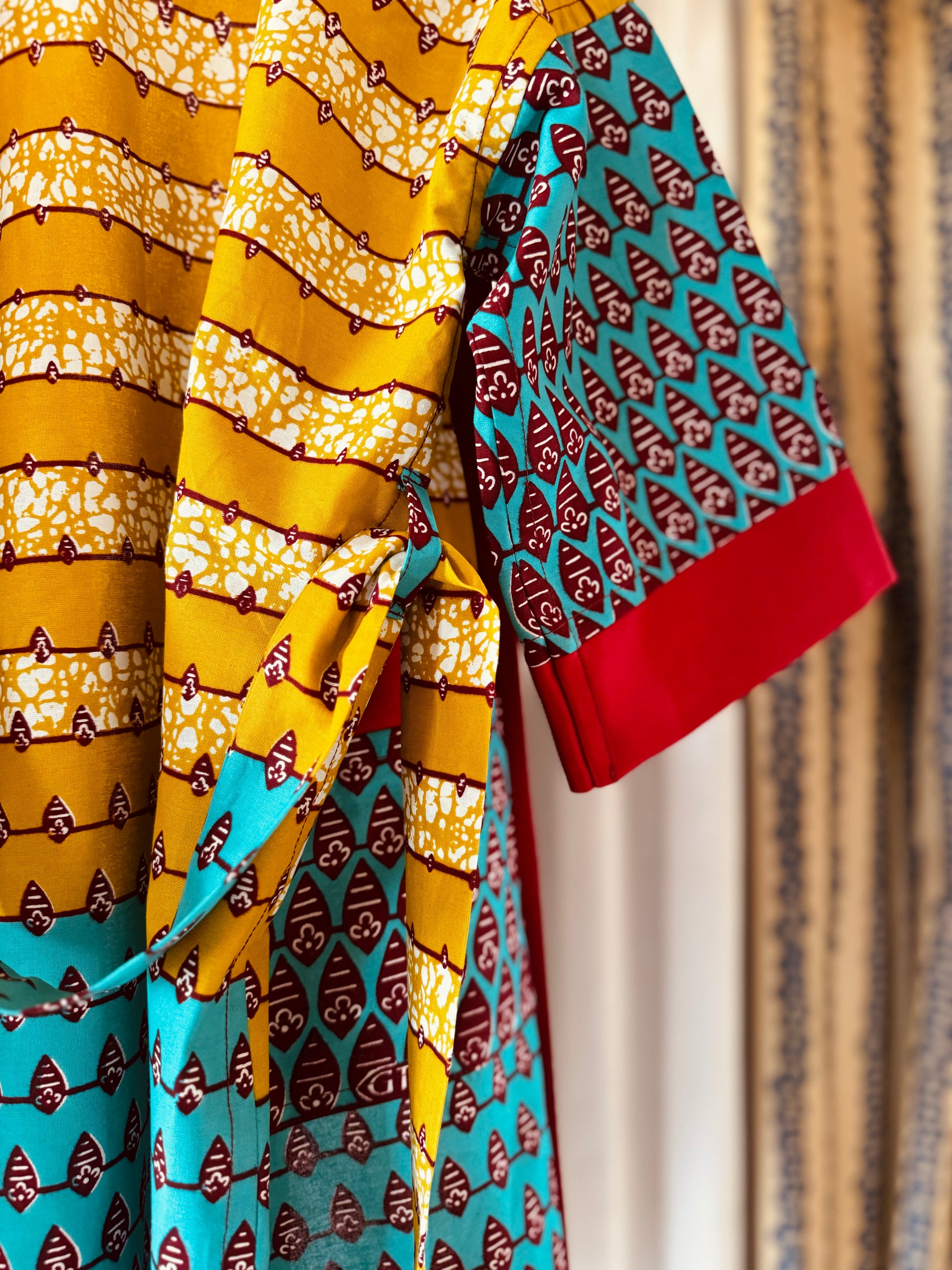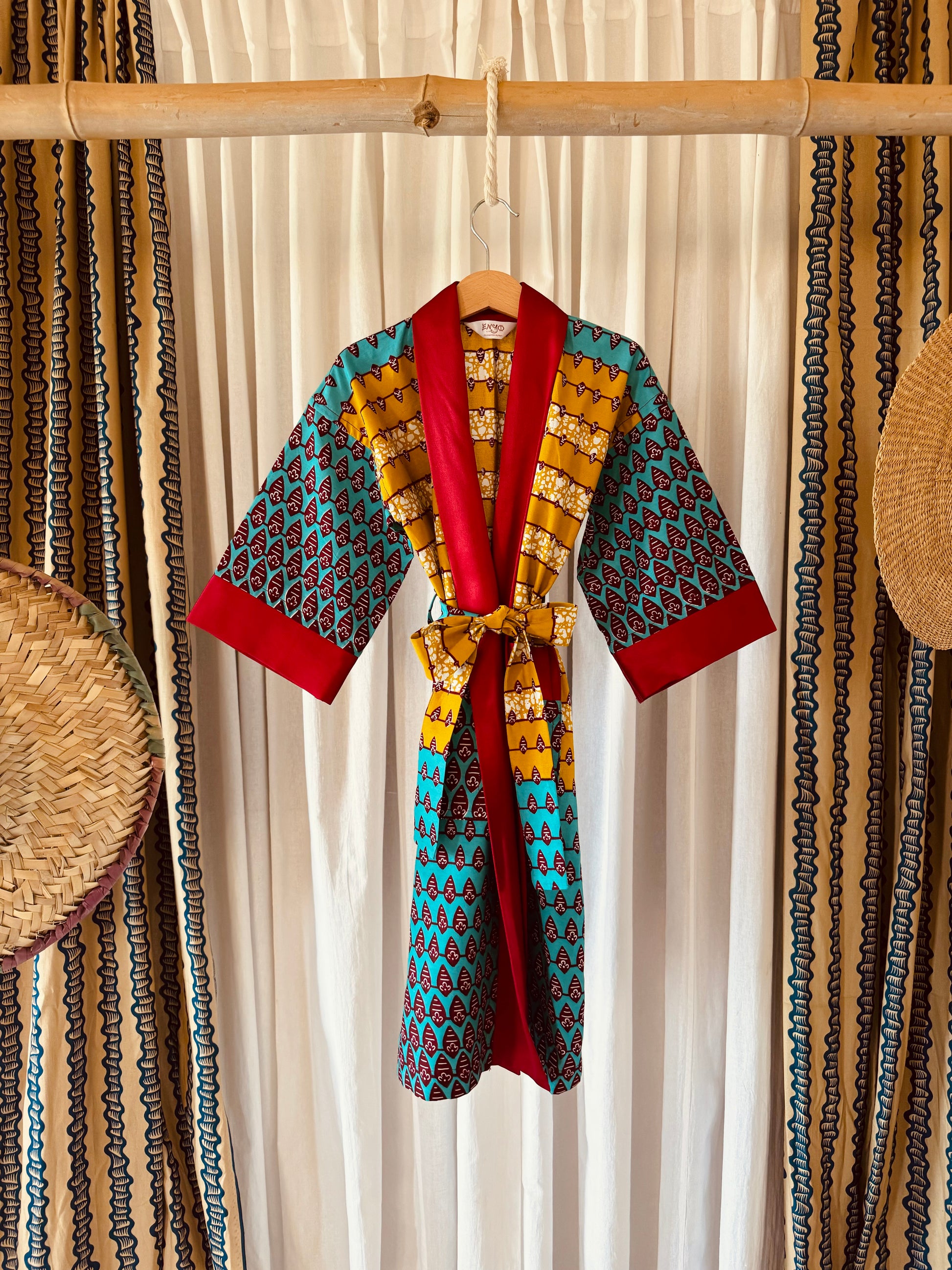 Wrap your child in comfort with our Kids - Afrikimo "Cracking Nut". The robe features a turquoise and ocre yellow pattern with striking red satin applications. Made of breathable cotton, it's perfect for daily bath time, getting ready for bed, snuggling on the couch, or a quick warm cover at the pool. The fun design will inspire their imagination, if as little princess or as karate-kid.