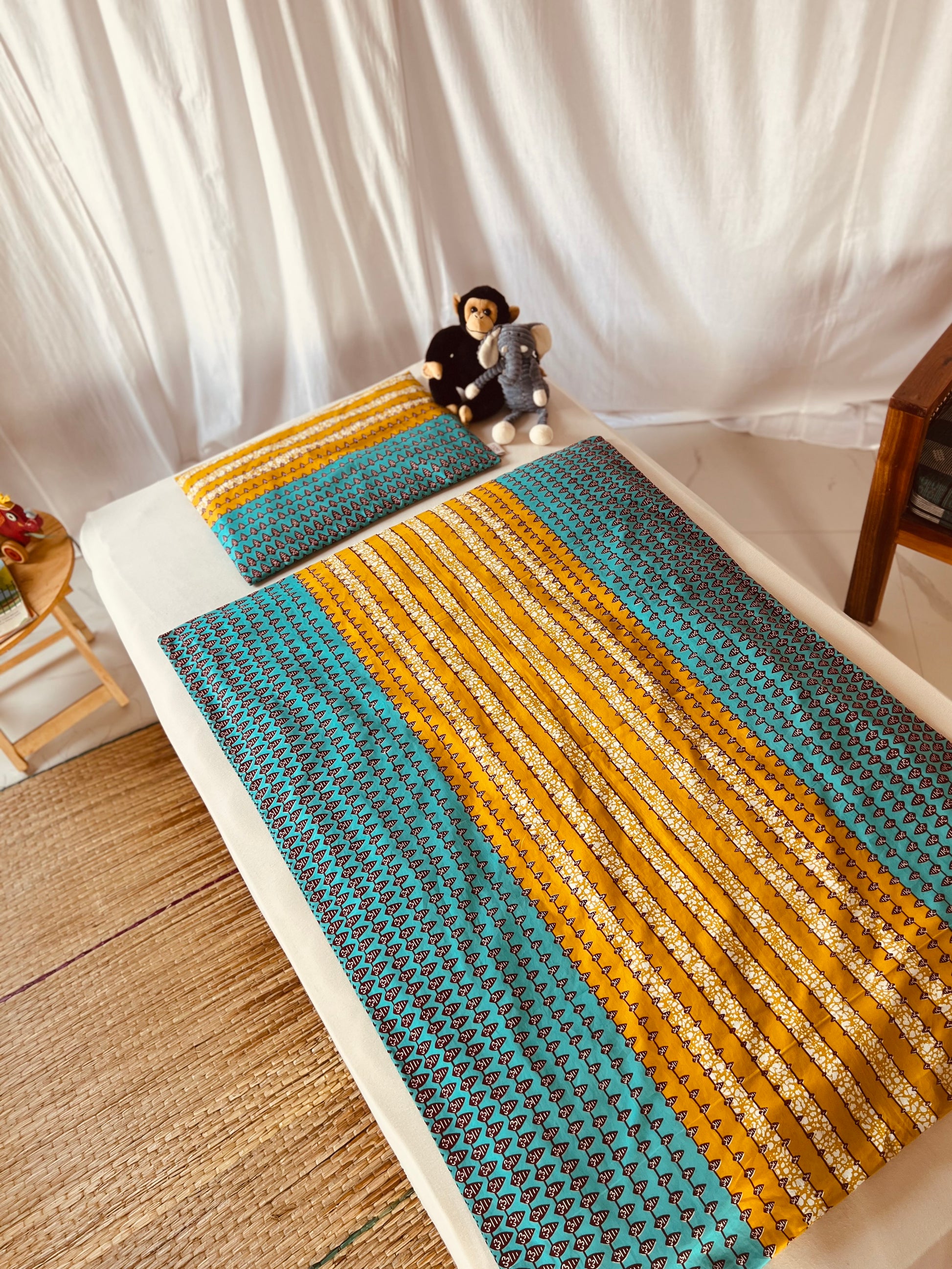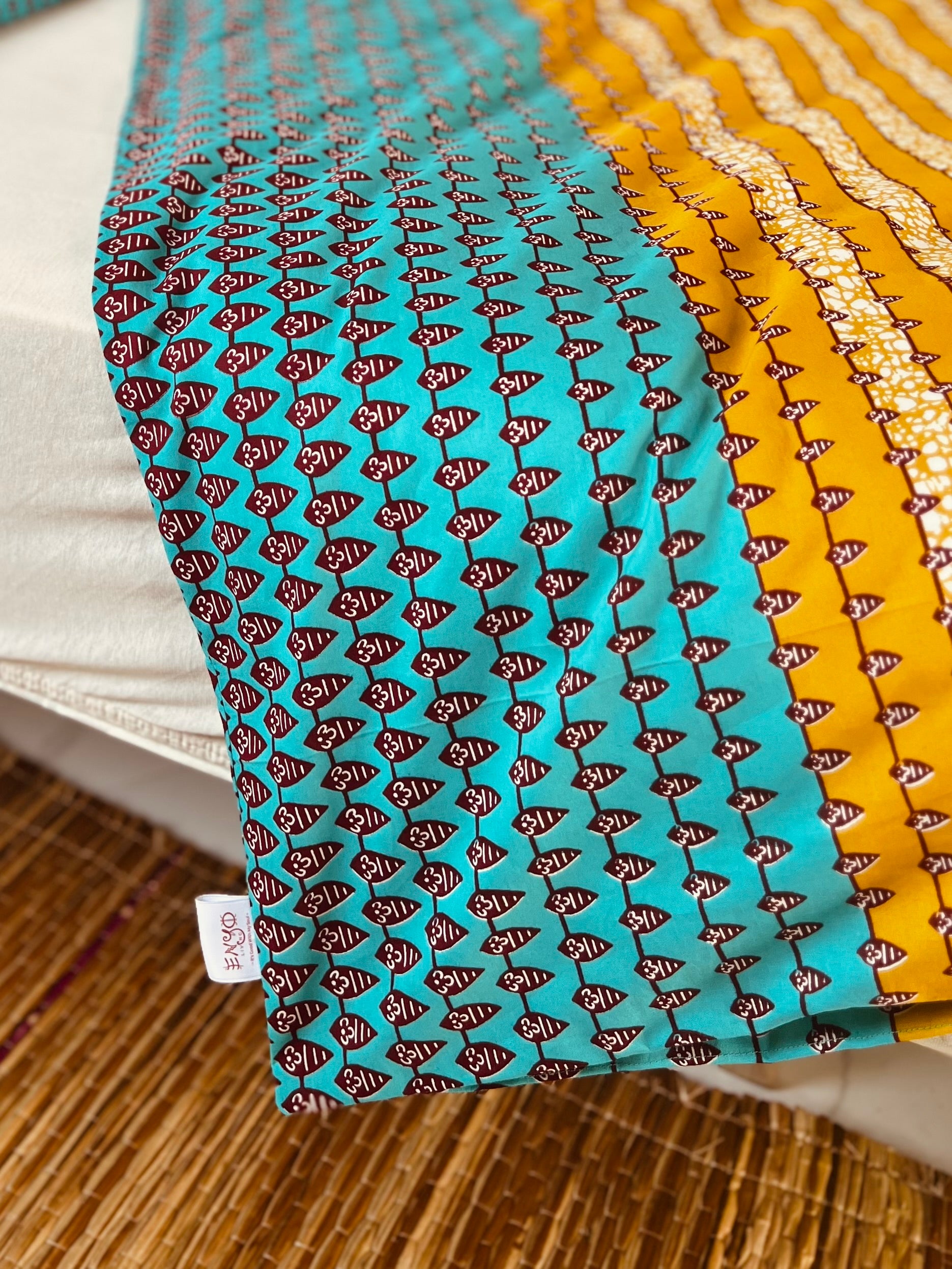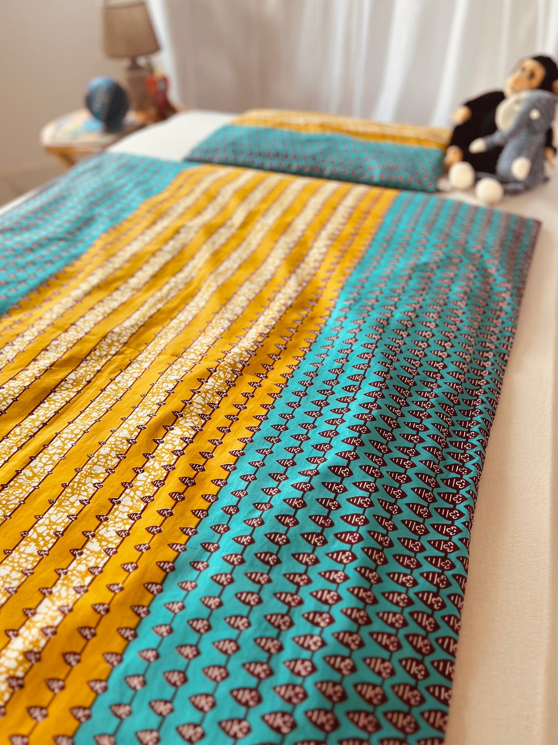 Bringe lebendige Energie und zauberhafte Träume in das Kinderzimmer mit unserer verspielten Bettwäsche aus African Print. Das bezaubernde geometrische Muster in Türkis und Mangogelb setzt frische Farbakzente und schafft eine fröhliche Atmosphäre. Die leuchtenden, harmonischen Töne regen die Fantasie an und machen die Schlafenszeit zu einem besonderen Erlebnis.