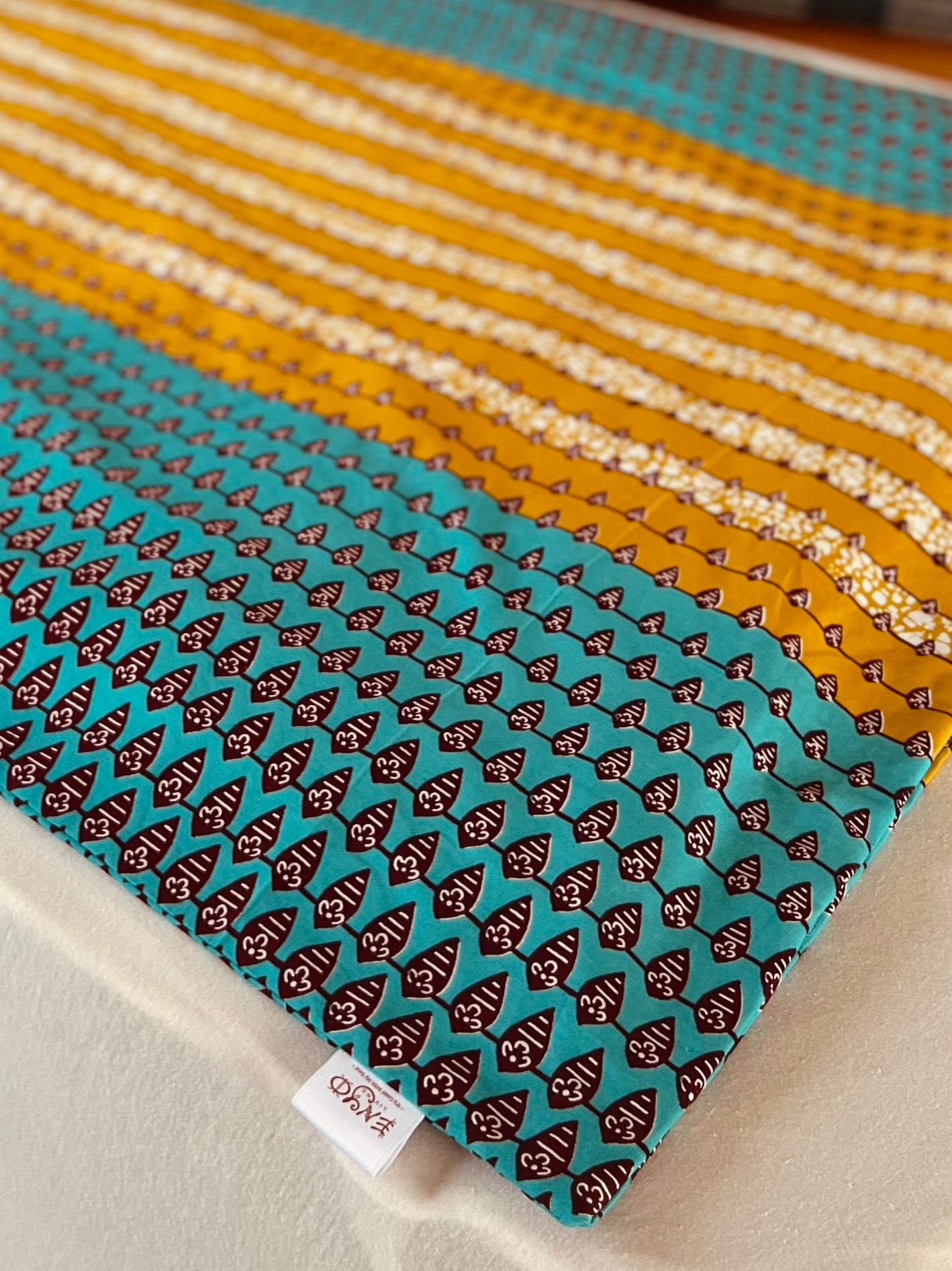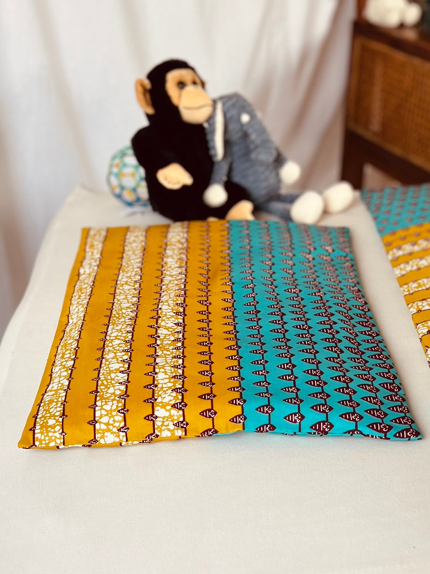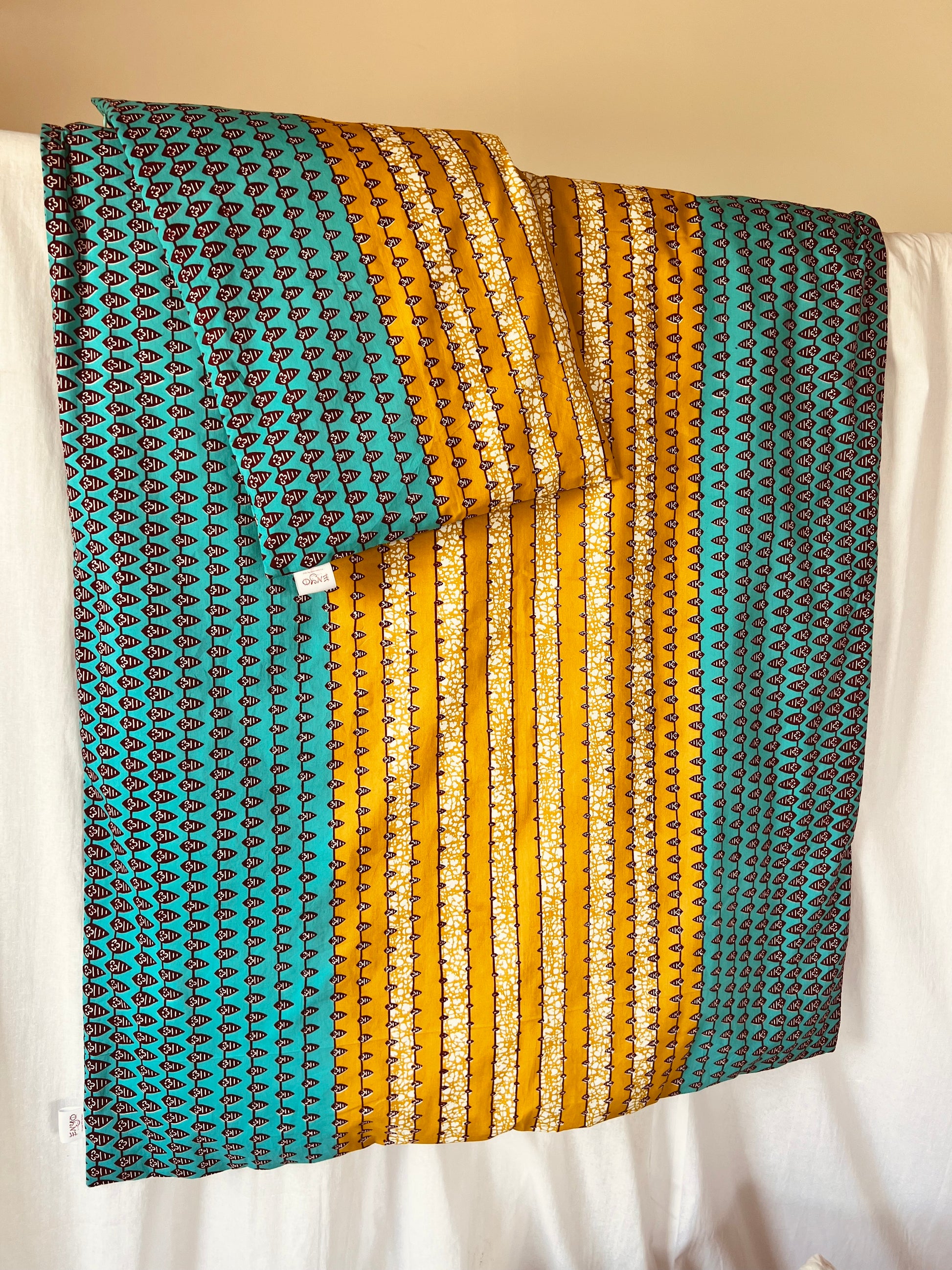 Bringe lebendige Energie und zauberhafte Träume in das Kinderzimmer mit unserer verspielten Bettwäsche aus African Print. Das bezaubernde geometrische Muster in Türkis und Mangogelb setzt frische Farbakzente und schafft eine fröhliche Atmosphäre. Die leuchtenden, harmonischen Töne regen die Fantasie an und machen die Schlafenszeit zu einem besonderen Erlebnis.