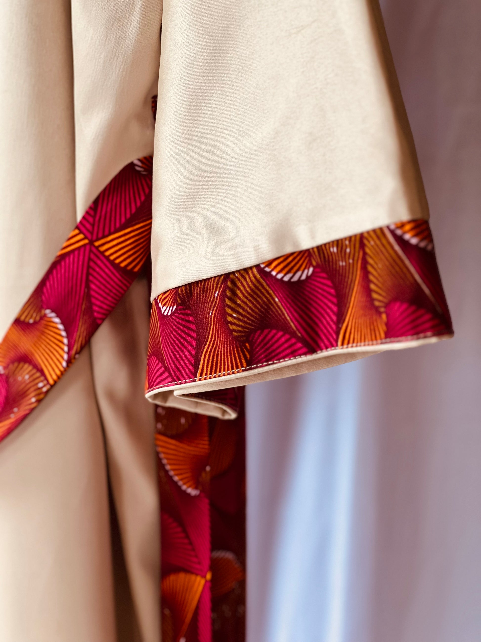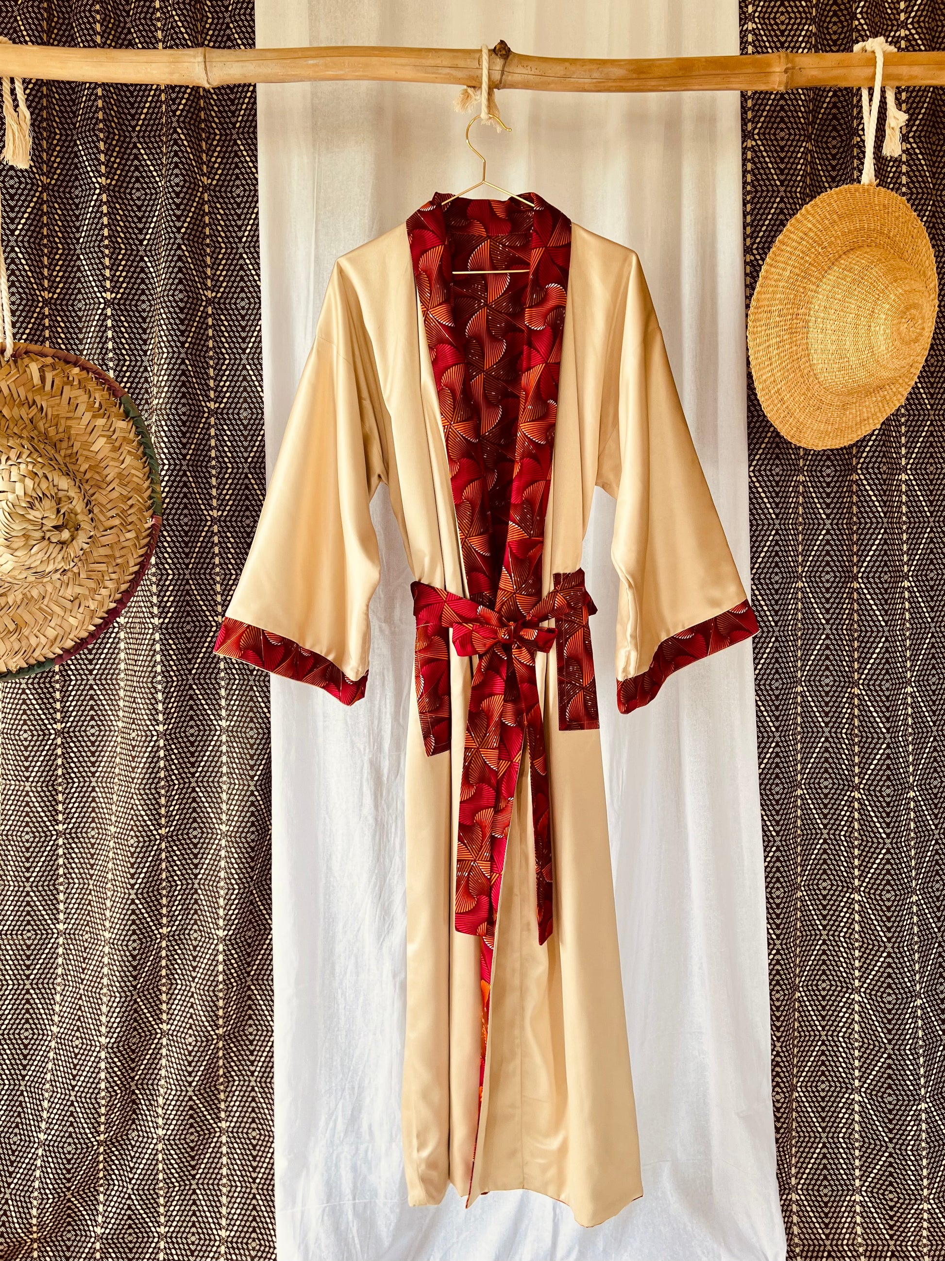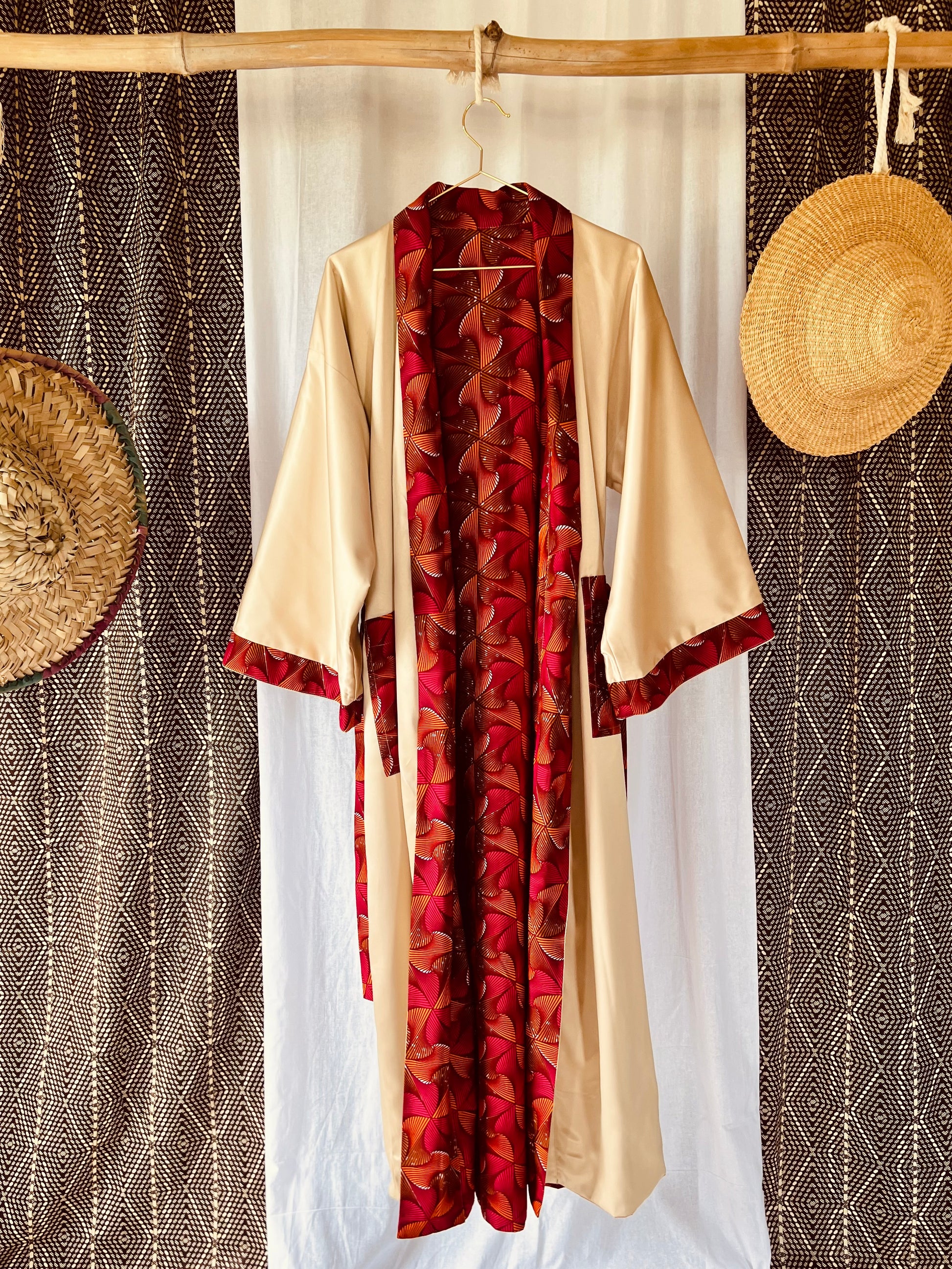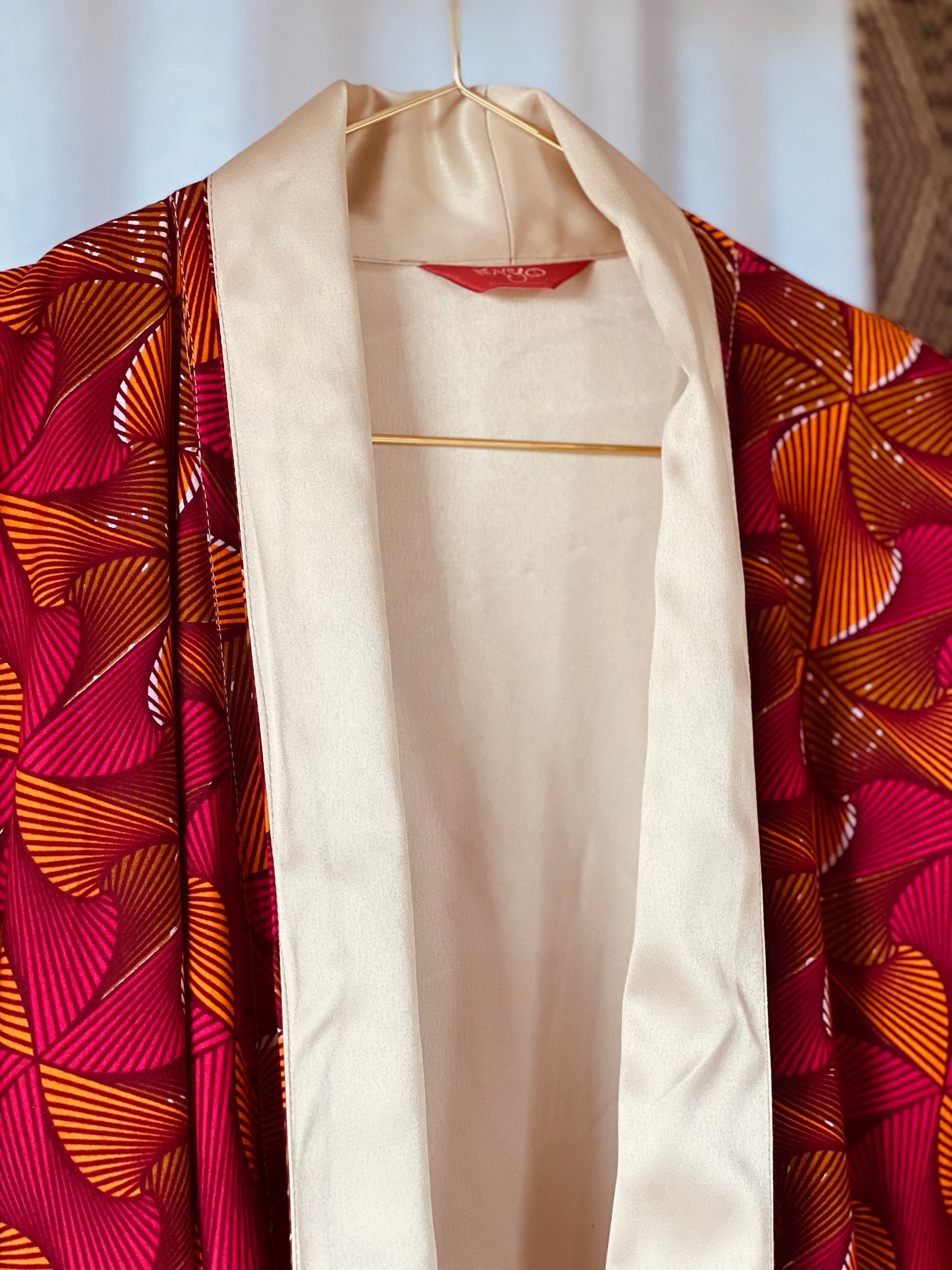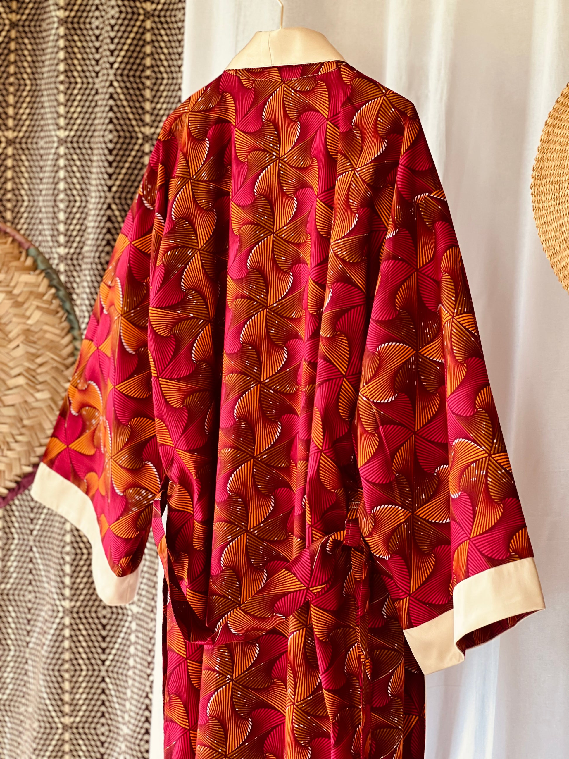 Tanze zu deinem eigenen Rhythmus mit unserem Kimono „Beating Drum“! Dieses wendbare Stück kombiniert leuchtend rosa und orangefarbenen afrikanischen Stoff mit cremefarbenem Satin für einen einzigartigen Look. Perfekt zum Entspannen oder zum lauten Singen und Tanzen nach einer belebenden Dusche. Mit diesem vielseitigen Wende-Afrikimo kannst du zwischen verspielt oder gelassen wählen, was auch immer sich für dich gut anfühlt.