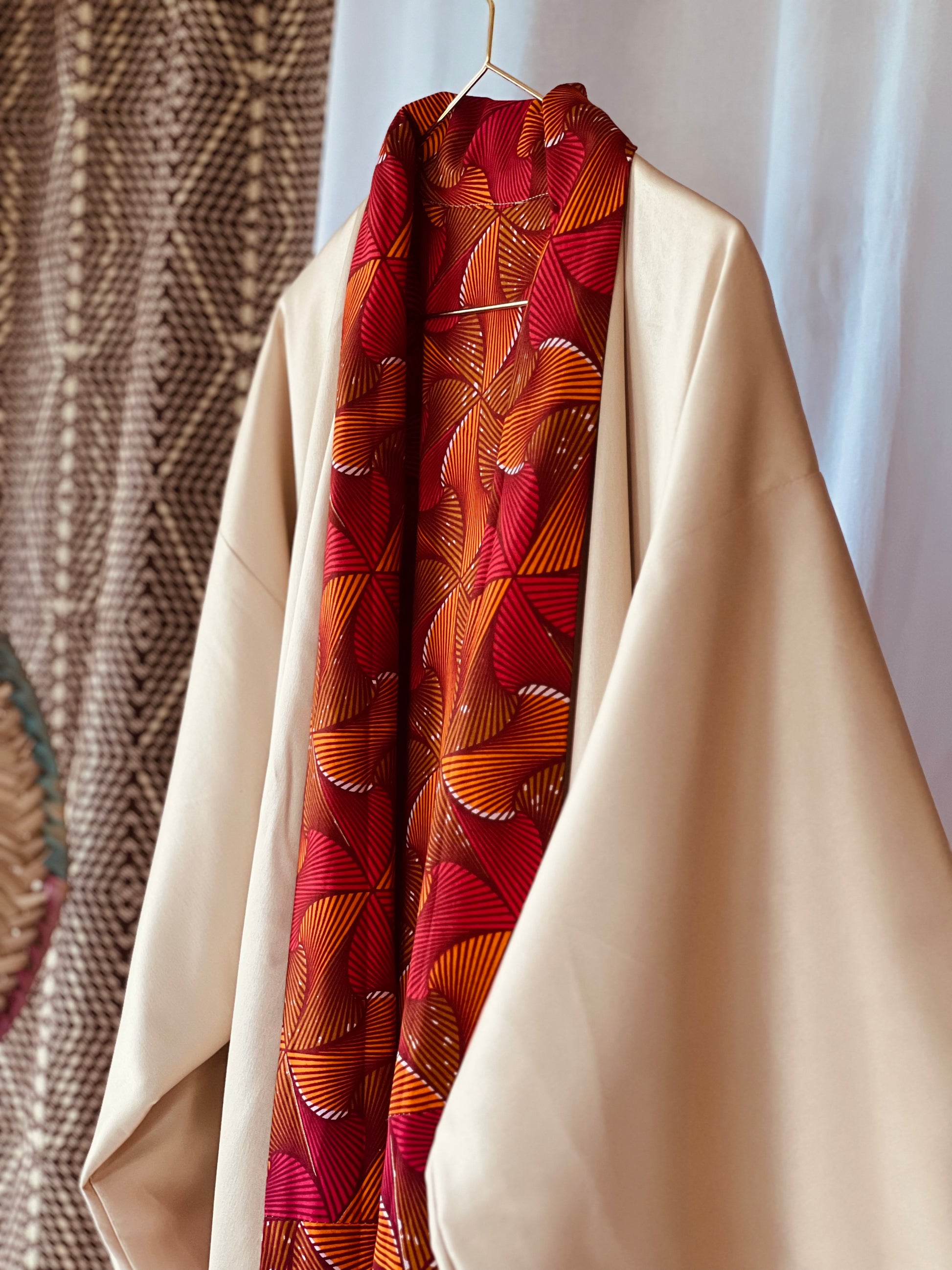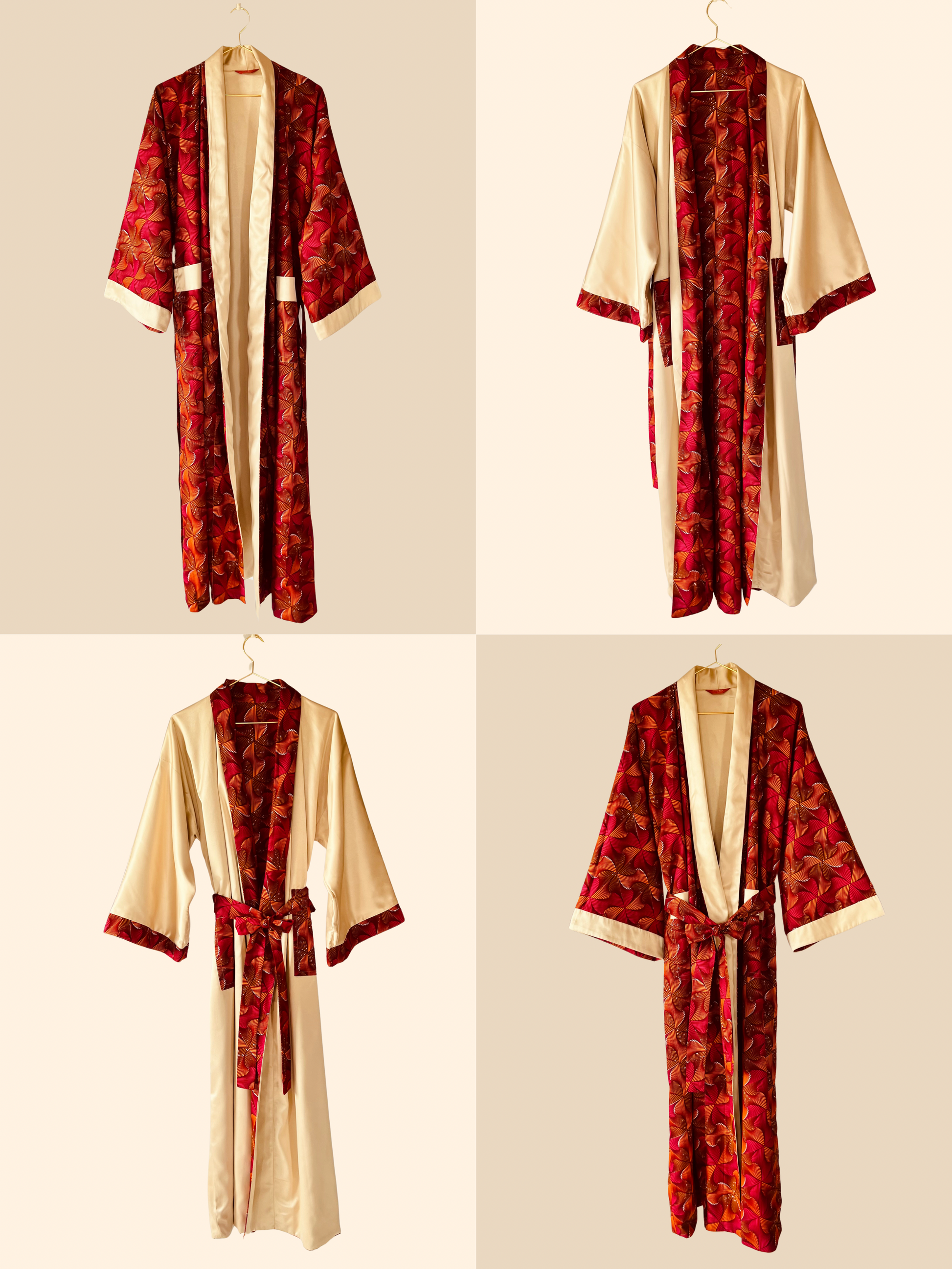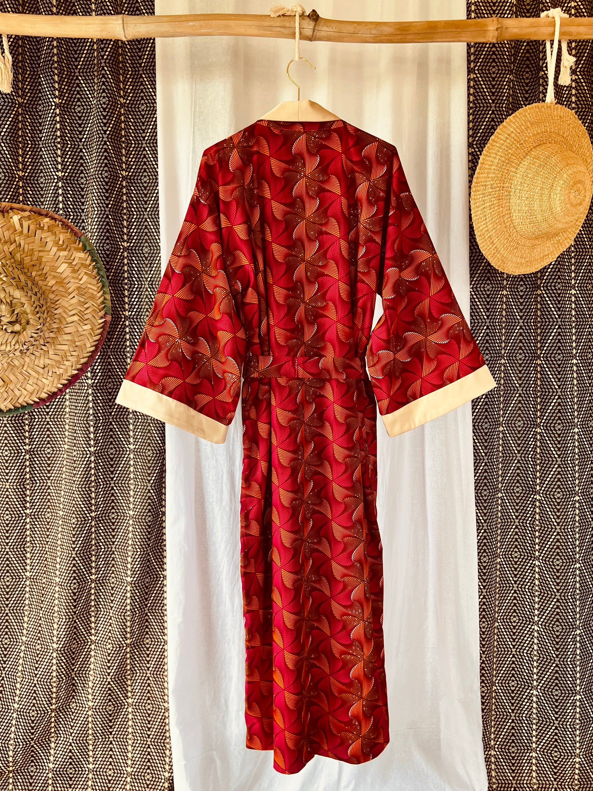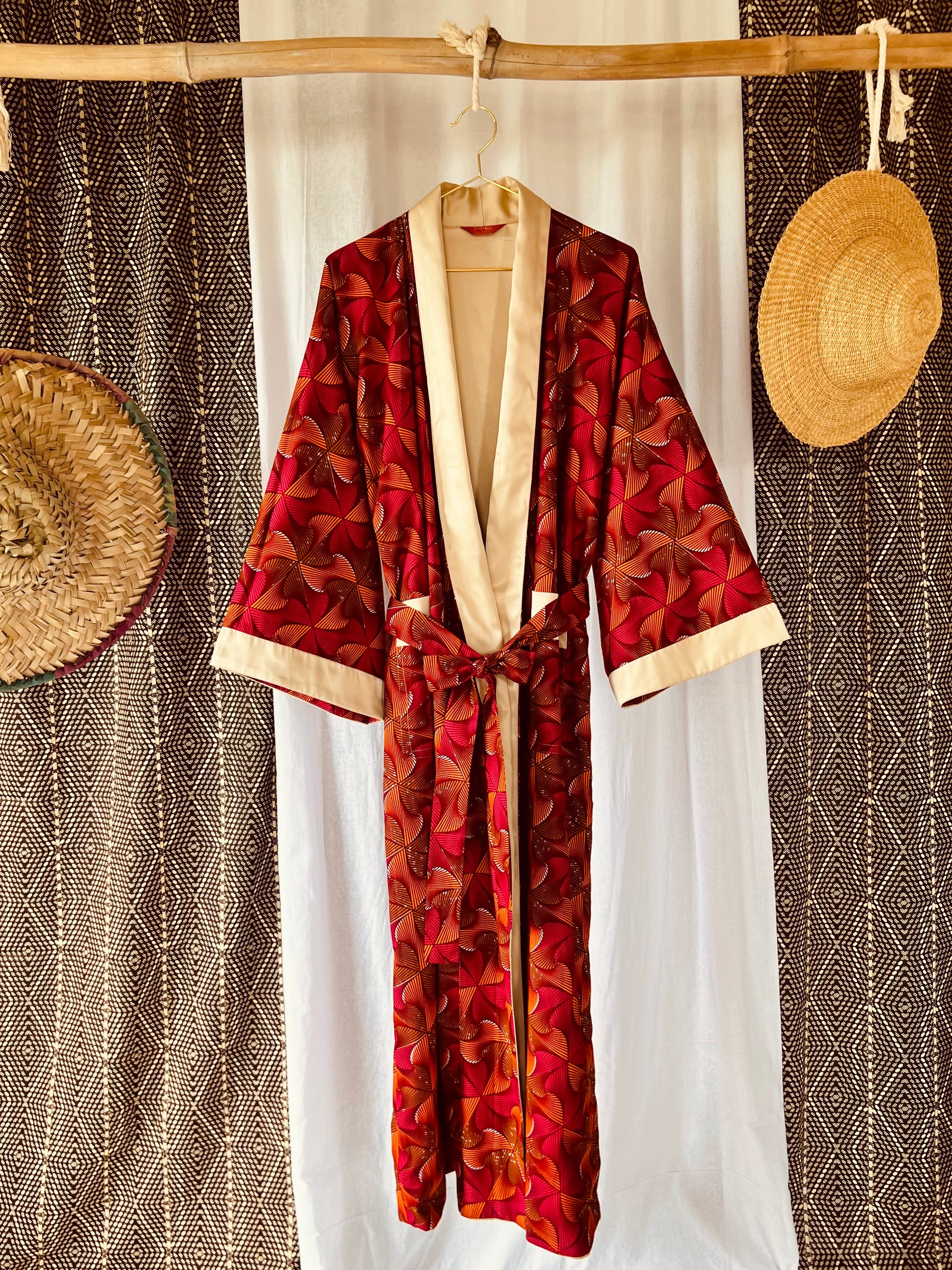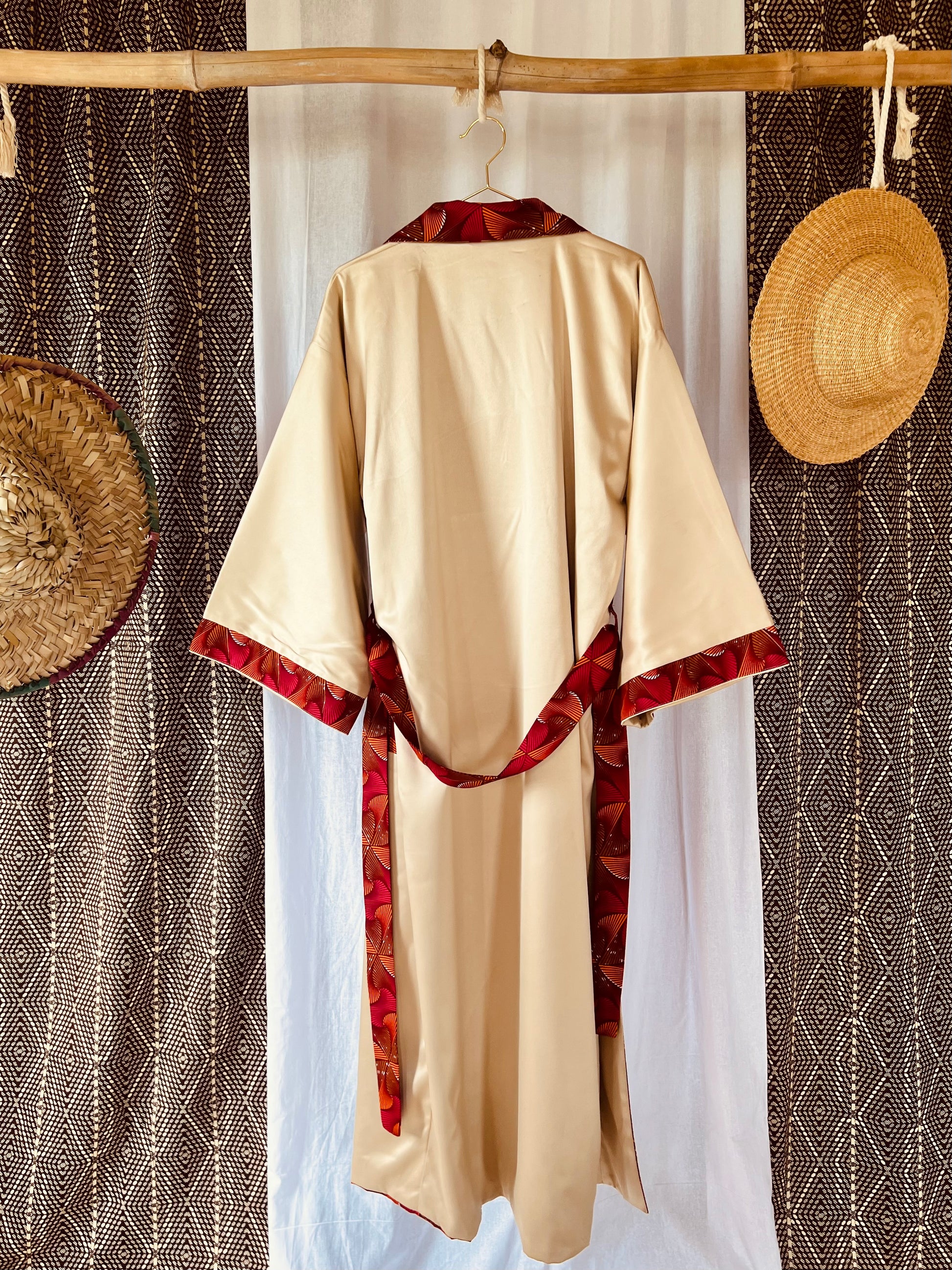 Tanze zu deinem eigenen Rhythmus mit unserem Kimono „Beating Drum“! Dieses wendbare Stück kombiniert leuchtend rosa und orangefarbenen afrikanischen Stoff mit cremefarbenem Satin für einen einzigartigen Look. Perfekt zum Entspannen oder zum lauten Singen und Tanzen nach einer belebenden Dusche. Mit diesem vielseitigen Wende-Afrikimo kannst du zwischen verspielt oder gelassen wählen, was auch immer sich für dich gut anfühlt.