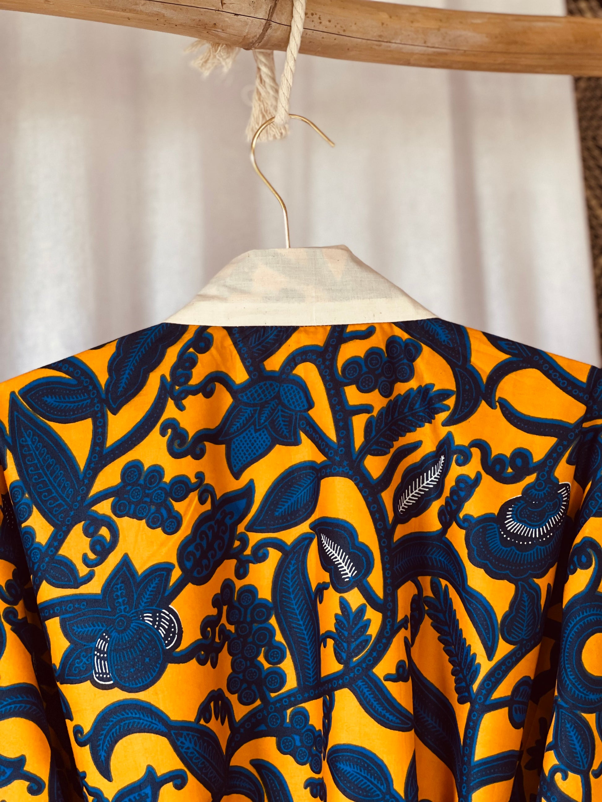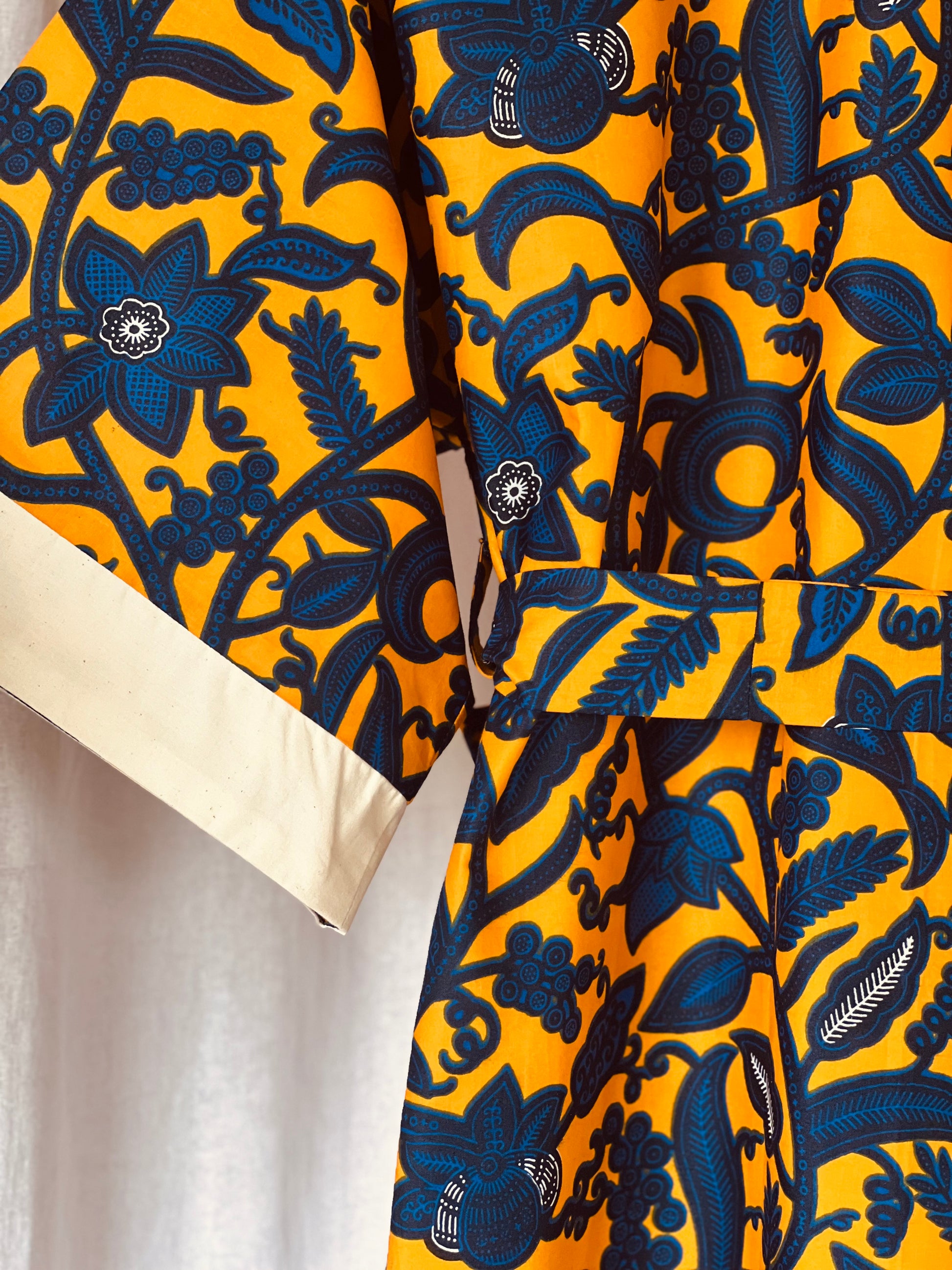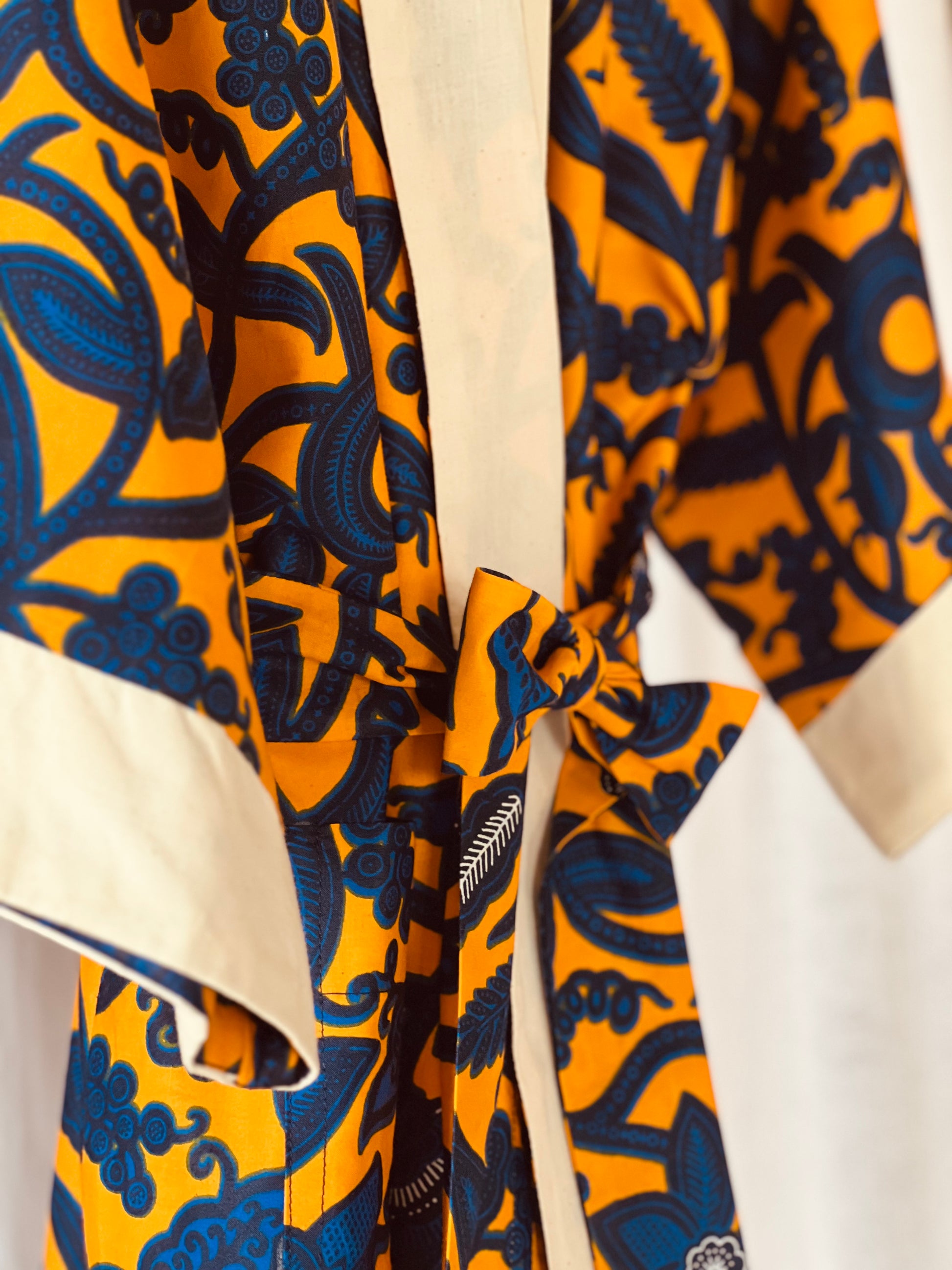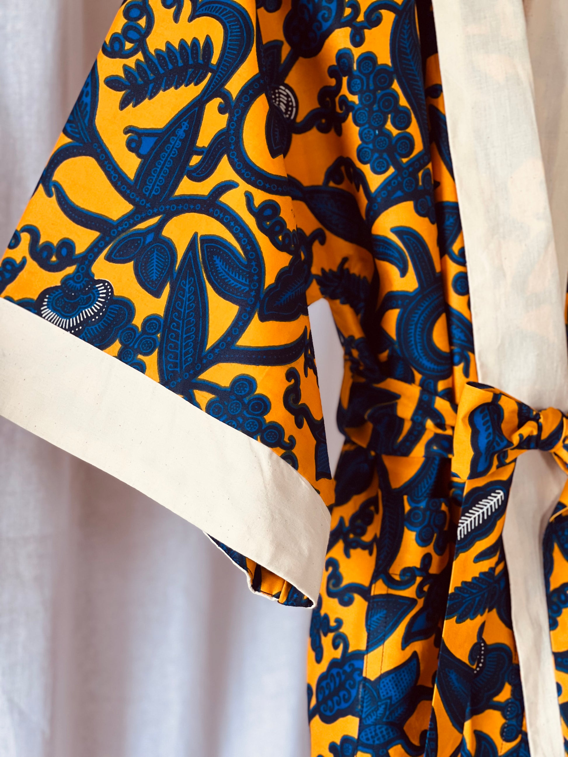 Atme tief durch, fühle dich wohl und sehe stilvoll aus in dieser Robe aus reiner Baumwolle. Unser „Rise and Shine I“-Afrikimo ist die perfekte Mischung aus African Print und natürlicher Baumwolle. Er kombiniert ein luftiges Gefühl mit genau der richtigen Menge an Wärme, die durch den doppellagigen Look entsteht. Der lebendige Druck in Blau und Mangogelb verleiht deinem Raum eine frische und belebende Note – perfekt für alle, die natürliche Akzente lieben.