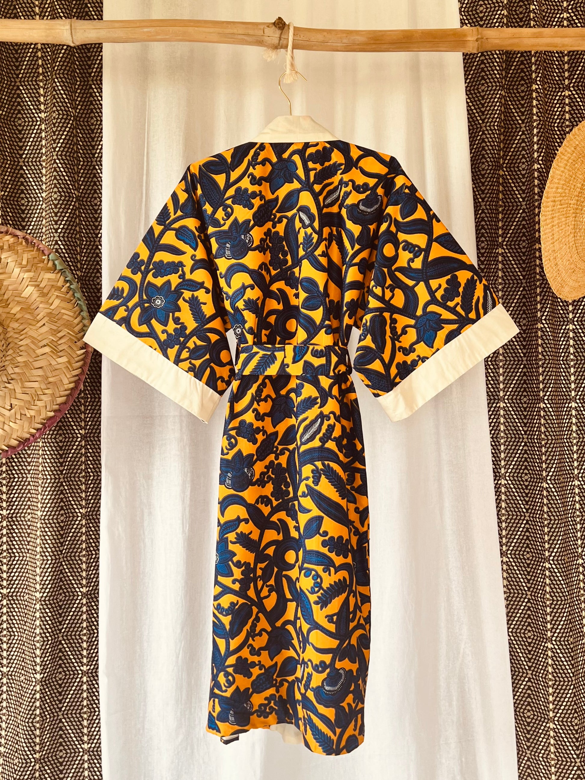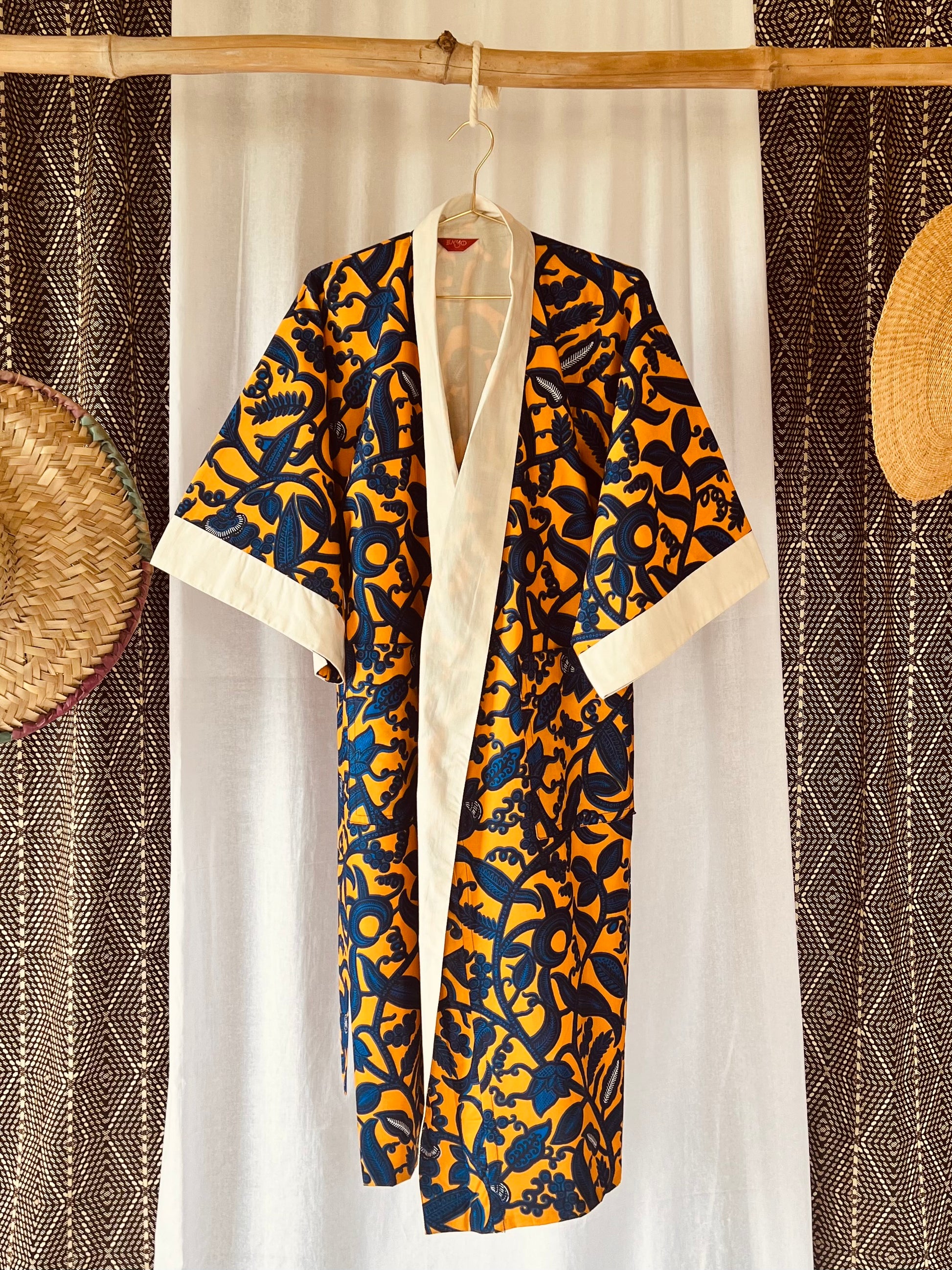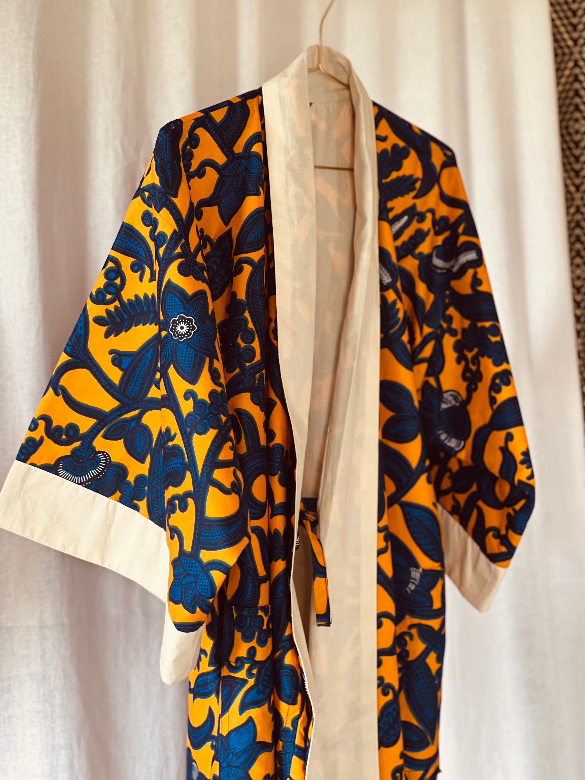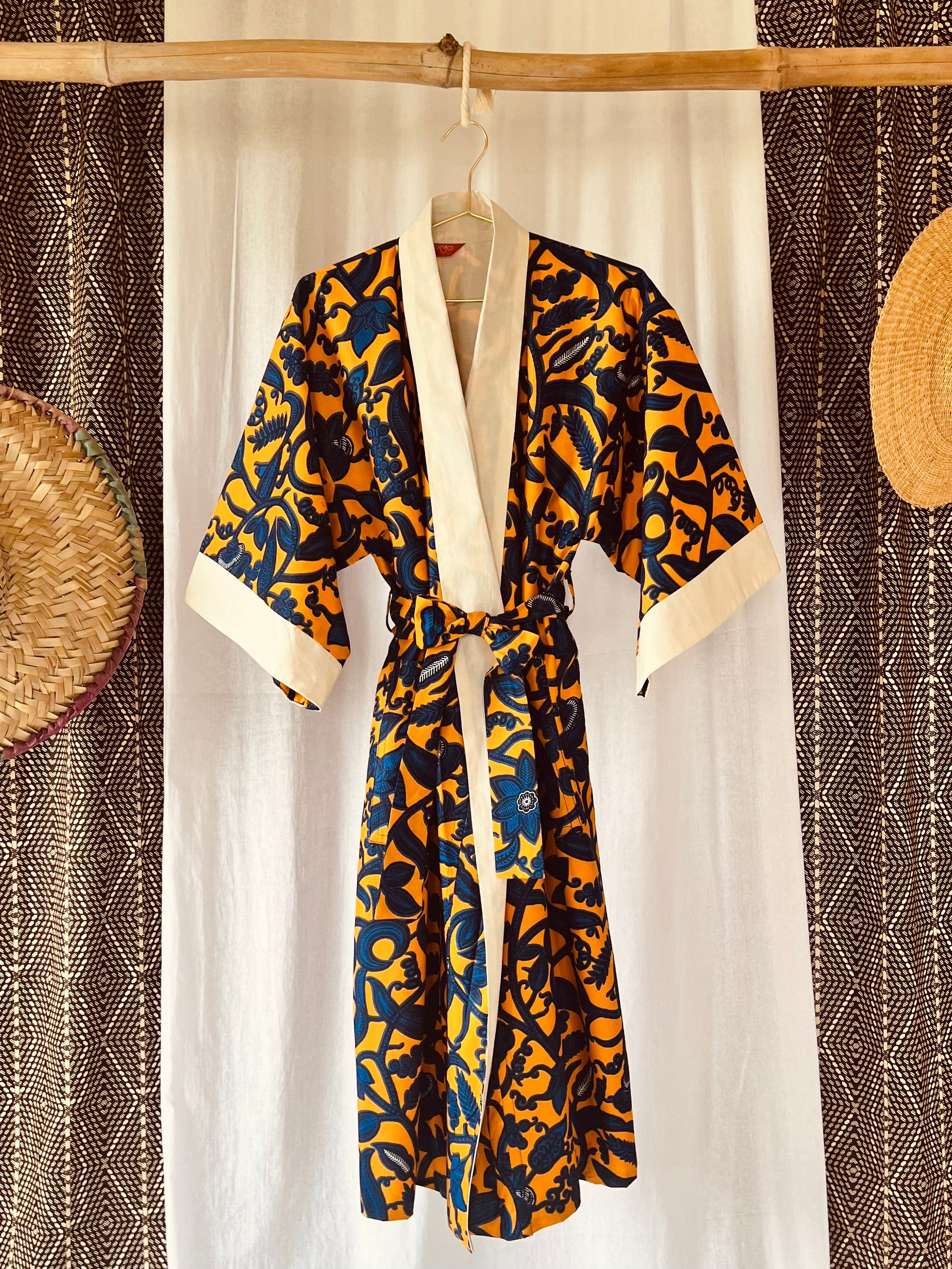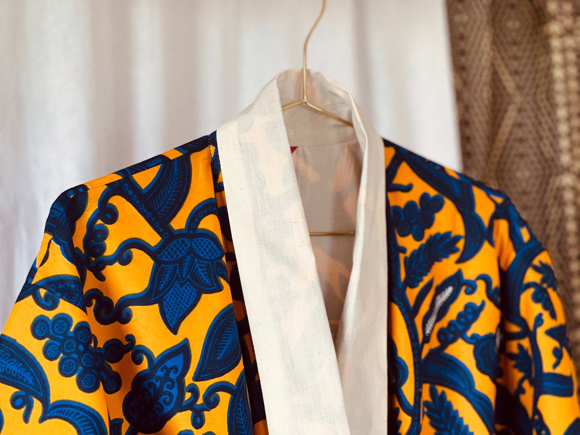 Atme tief durch, fühle dich wohl und sehe stilvoll aus in dieser Robe aus reiner Baumwolle. Unser „Rise and Shine I“-Afrikimo ist die perfekte Mischung aus African Print und natürlicher Baumwolle. Er kombiniert ein luftiges Gefühl mit genau der richtigen Menge an Wärme, die durch den doppellagigen Look entsteht. Der lebendige Druck in Blau und Mangogelb verleiht deinem Raum eine frische und belebende Note – perfekt für alle, die natürliche Akzente lieben.