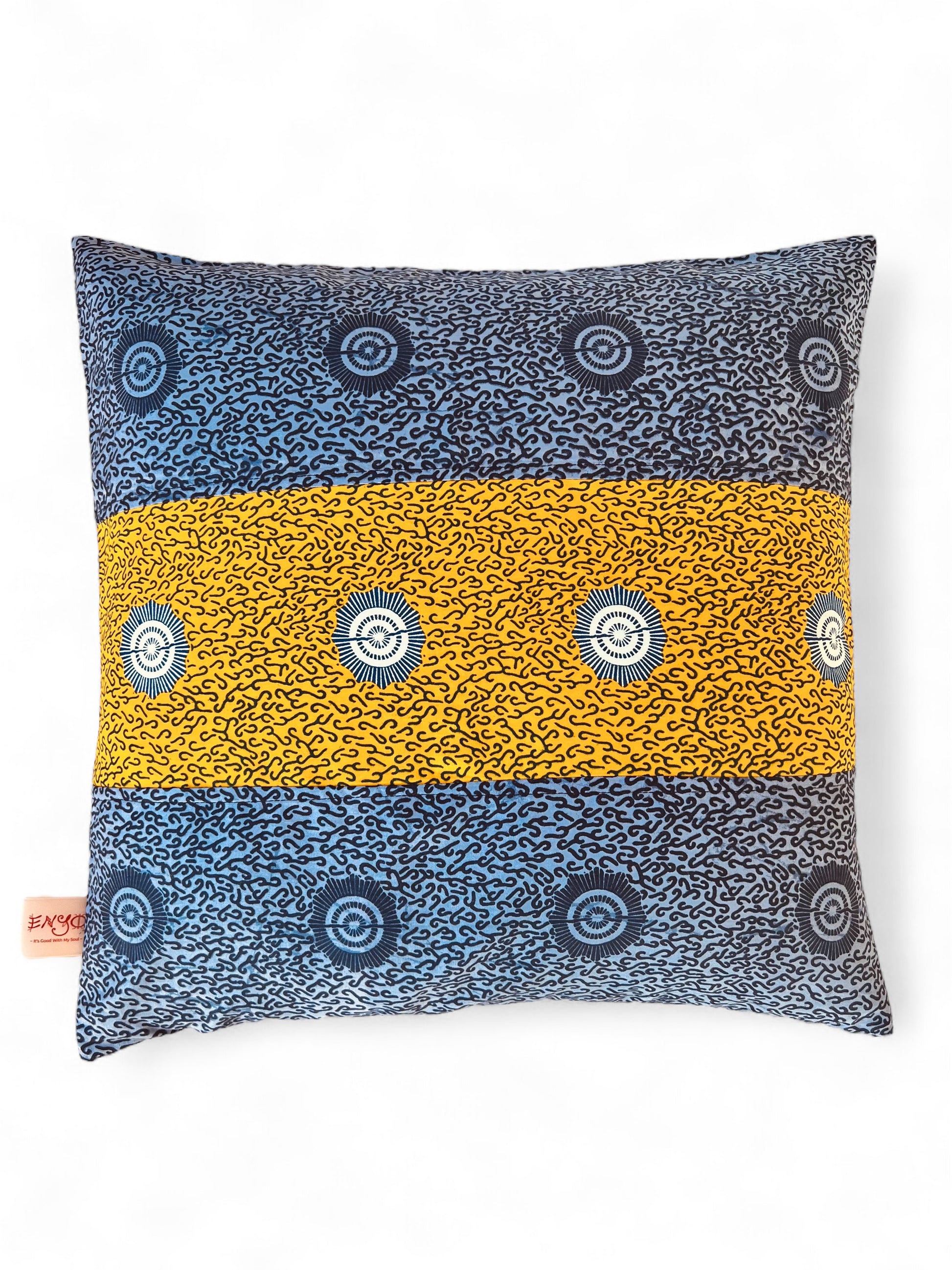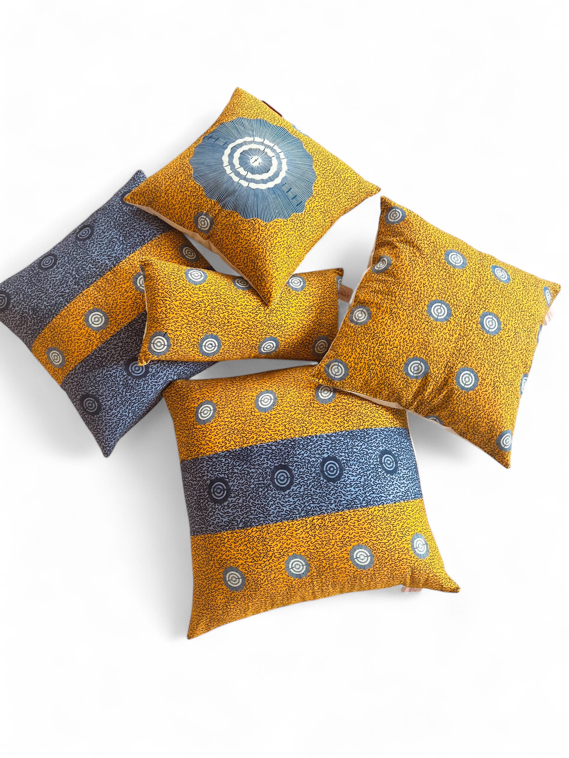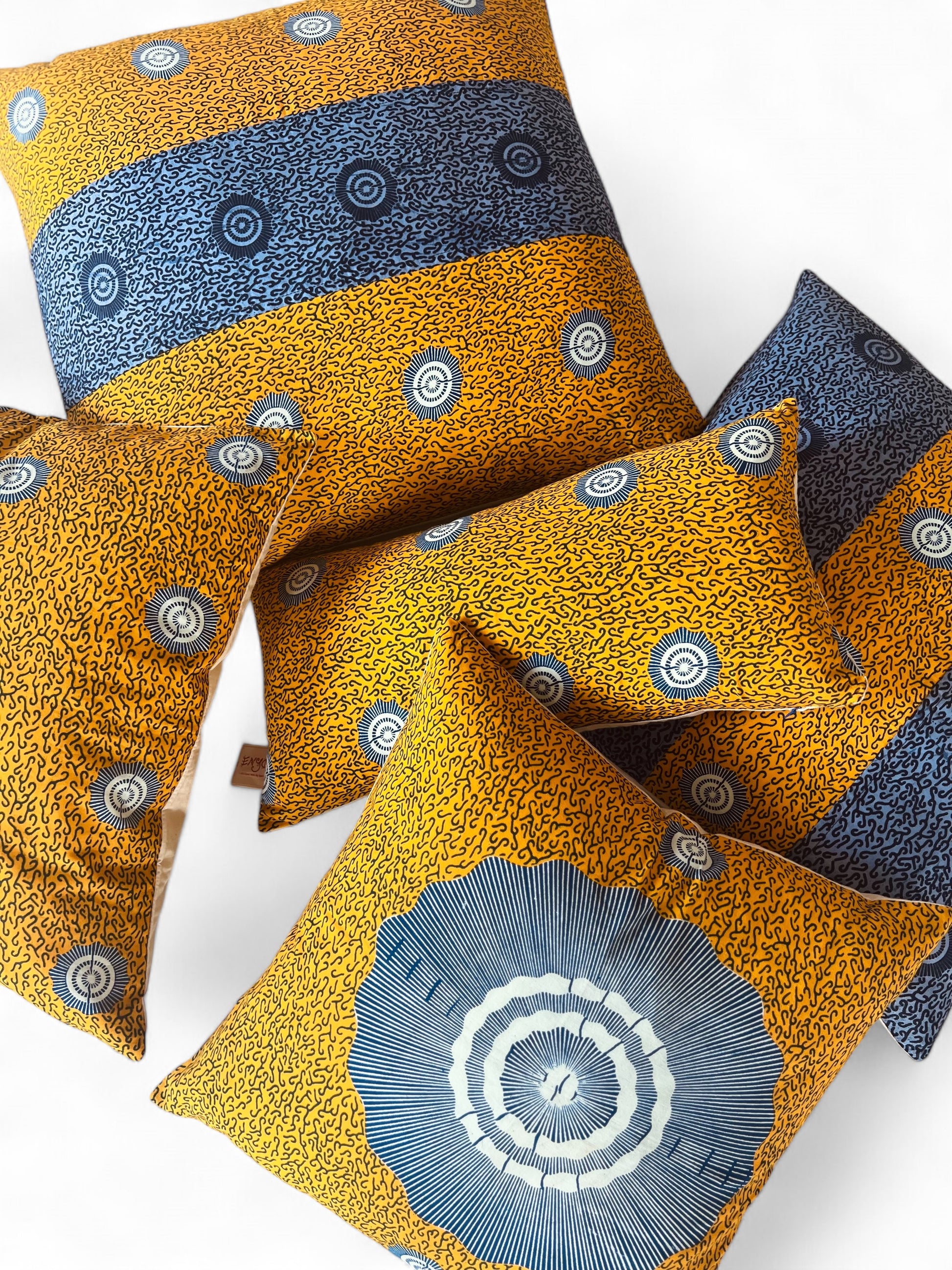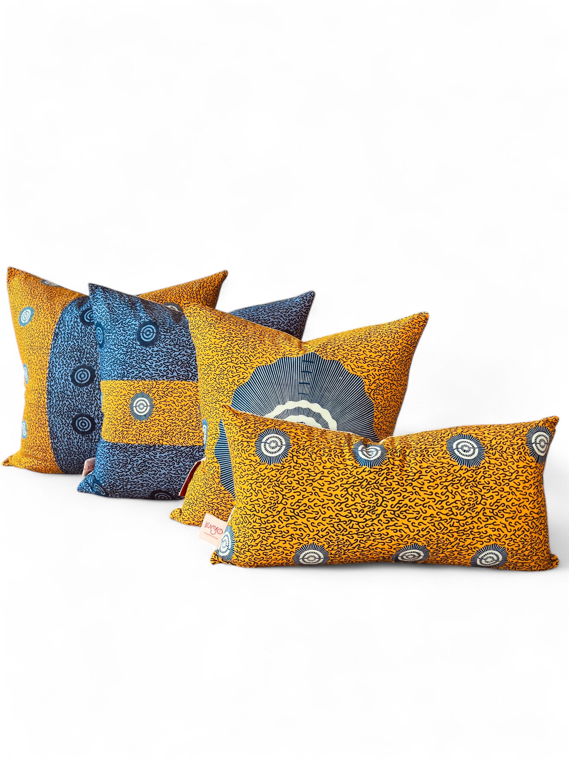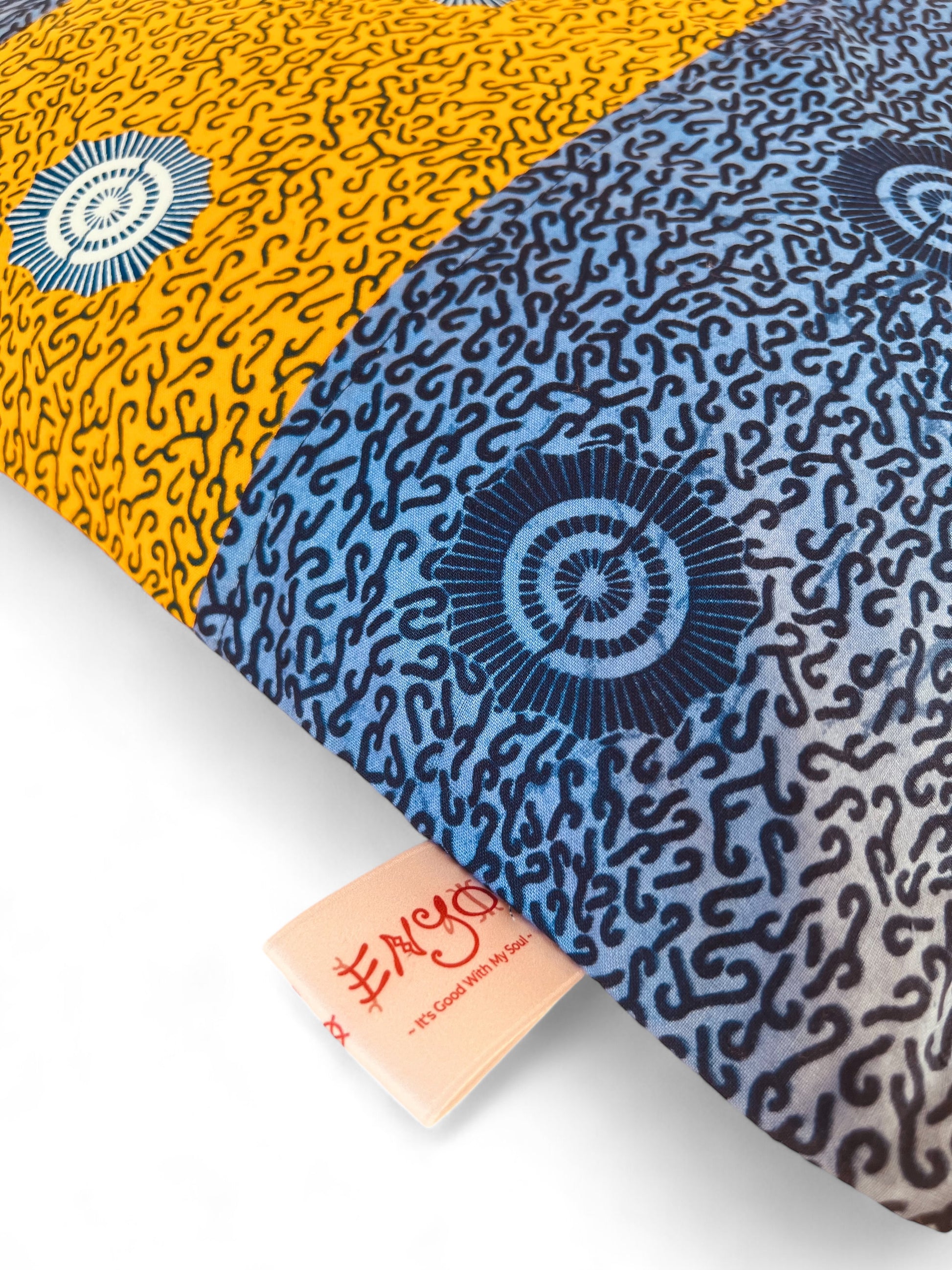 Bringe mit unseren Kissenbezügen „Gramophone“ etwas Rhythmus und Harmonie in dein Zuhause. Diese einzigartigen Dekostücke zeigen einen sonnigen gelben und himmelblauen afrikanischen Druck auf natürlicher Baumwolle. Sie heben garantiert deine Stimmung und erhellen deinen Wohnraum! Jedes Stück hat einen versteckten Reißverschluss, der zu den Farben des Kissens passt.