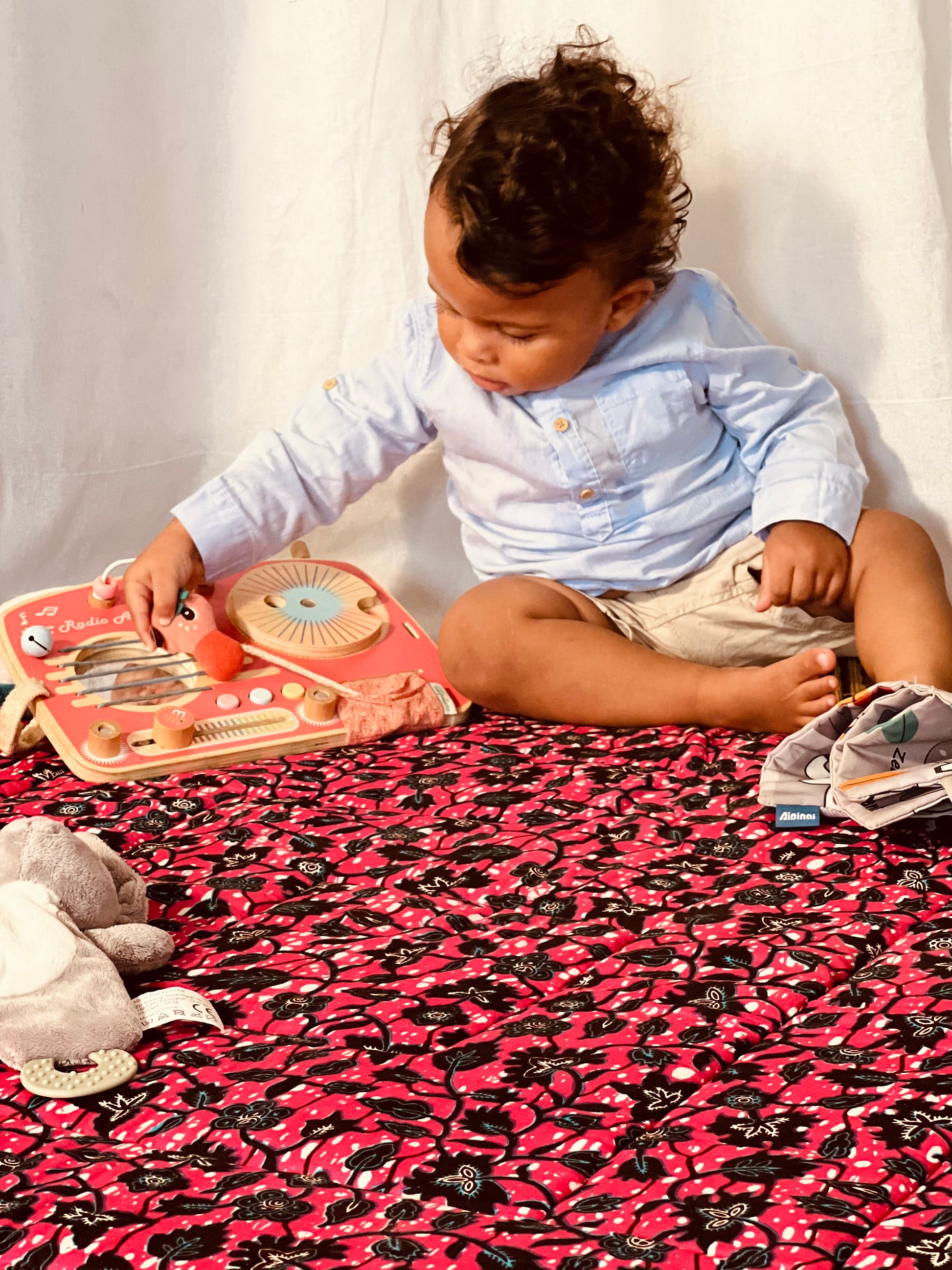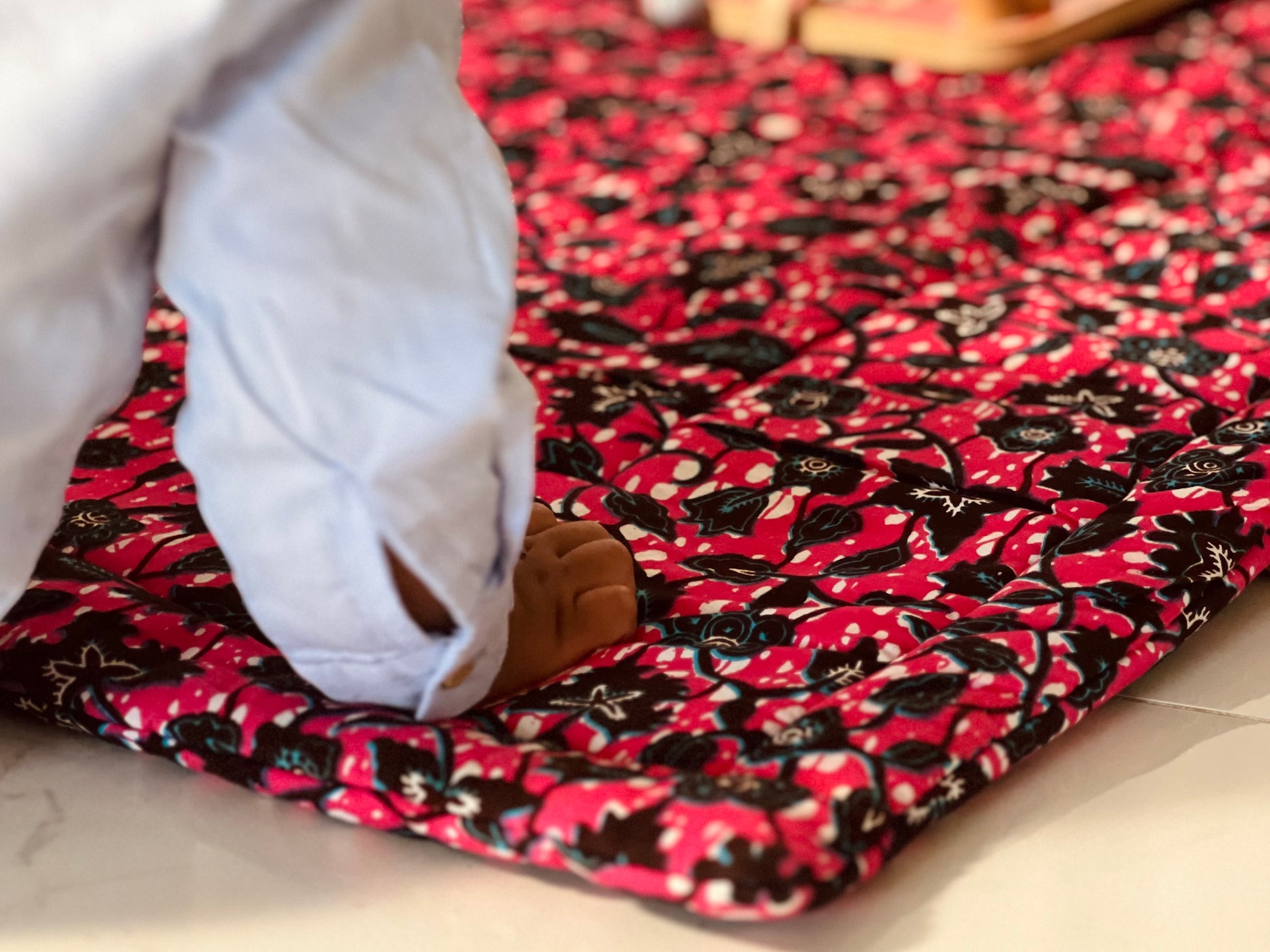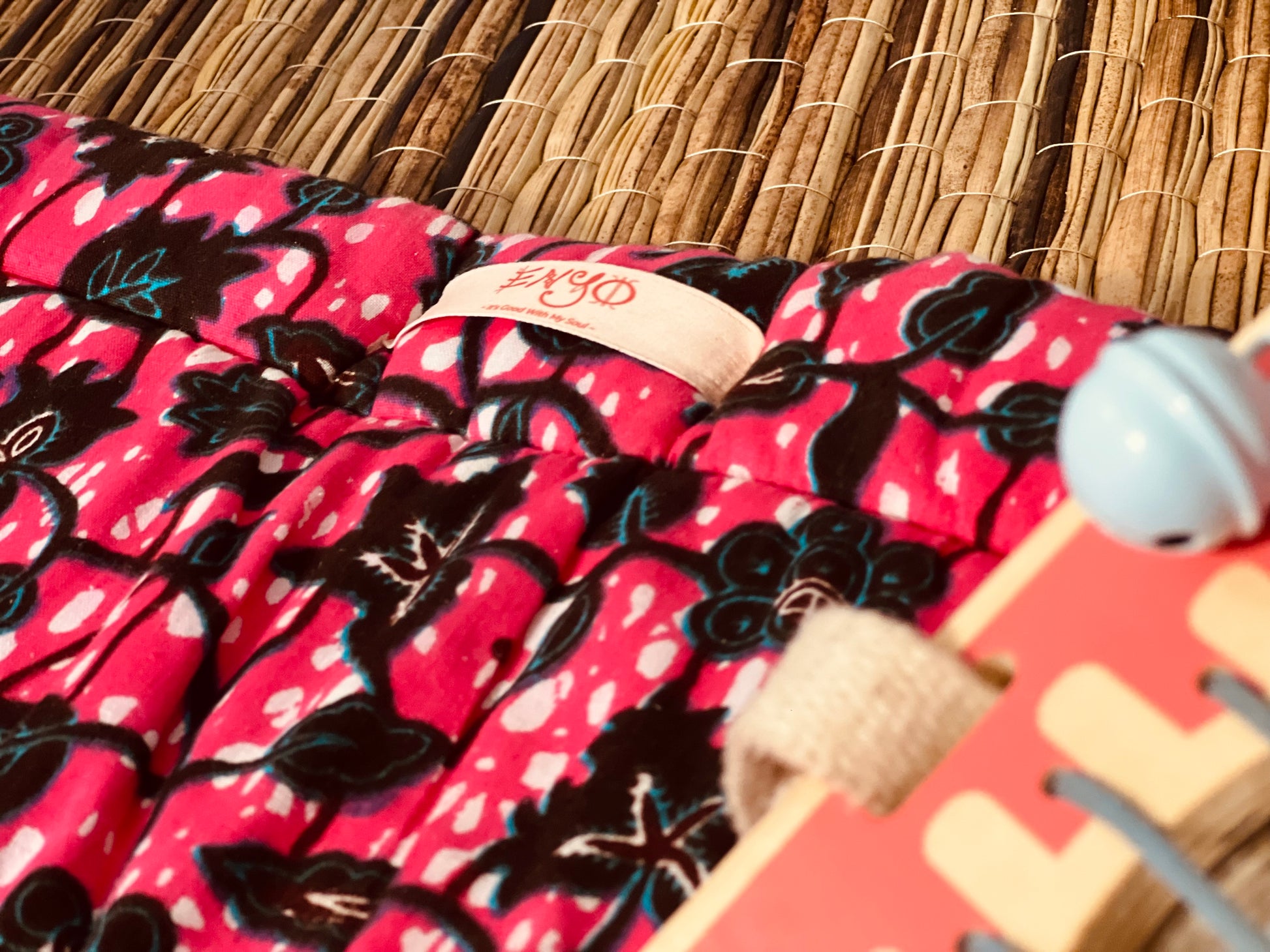 Mit Liebe handgefertigt und mit authentischem African Print ist jede Spielmatte ein Unikat. Das bedeutet, dass jedes einzelne Stück leicht von dem auf den Bildern abgebildeten Modell abweichen kann.