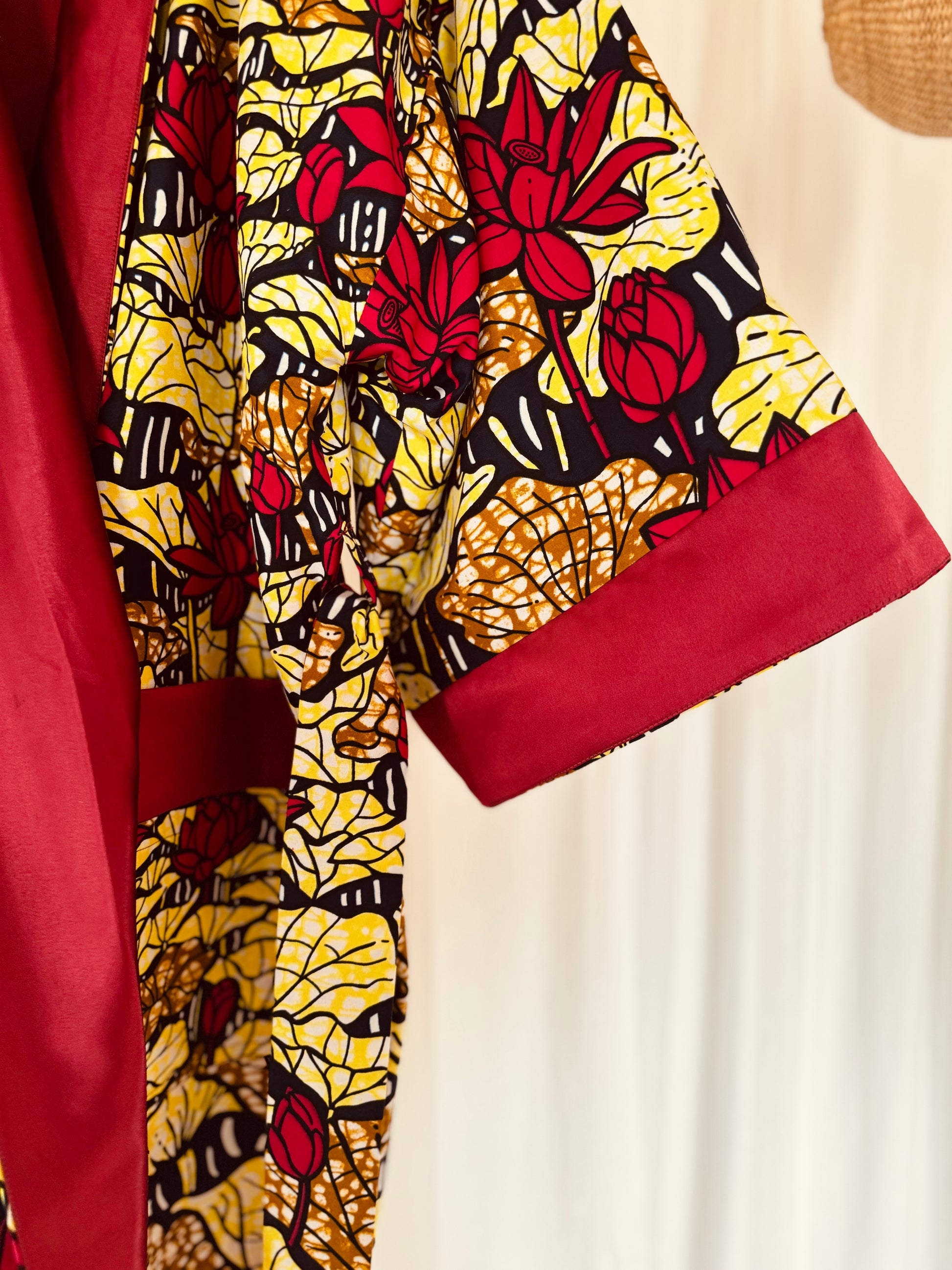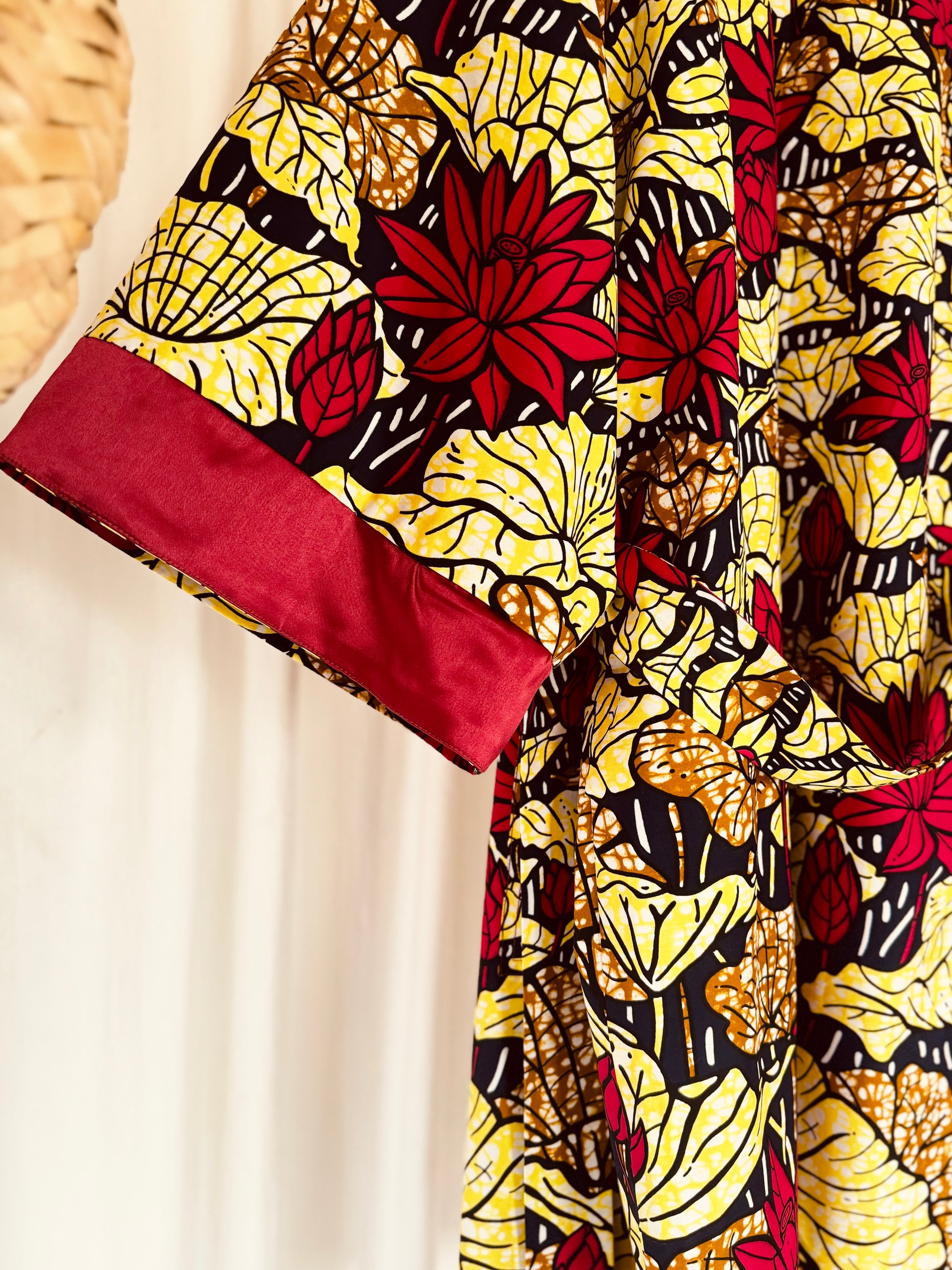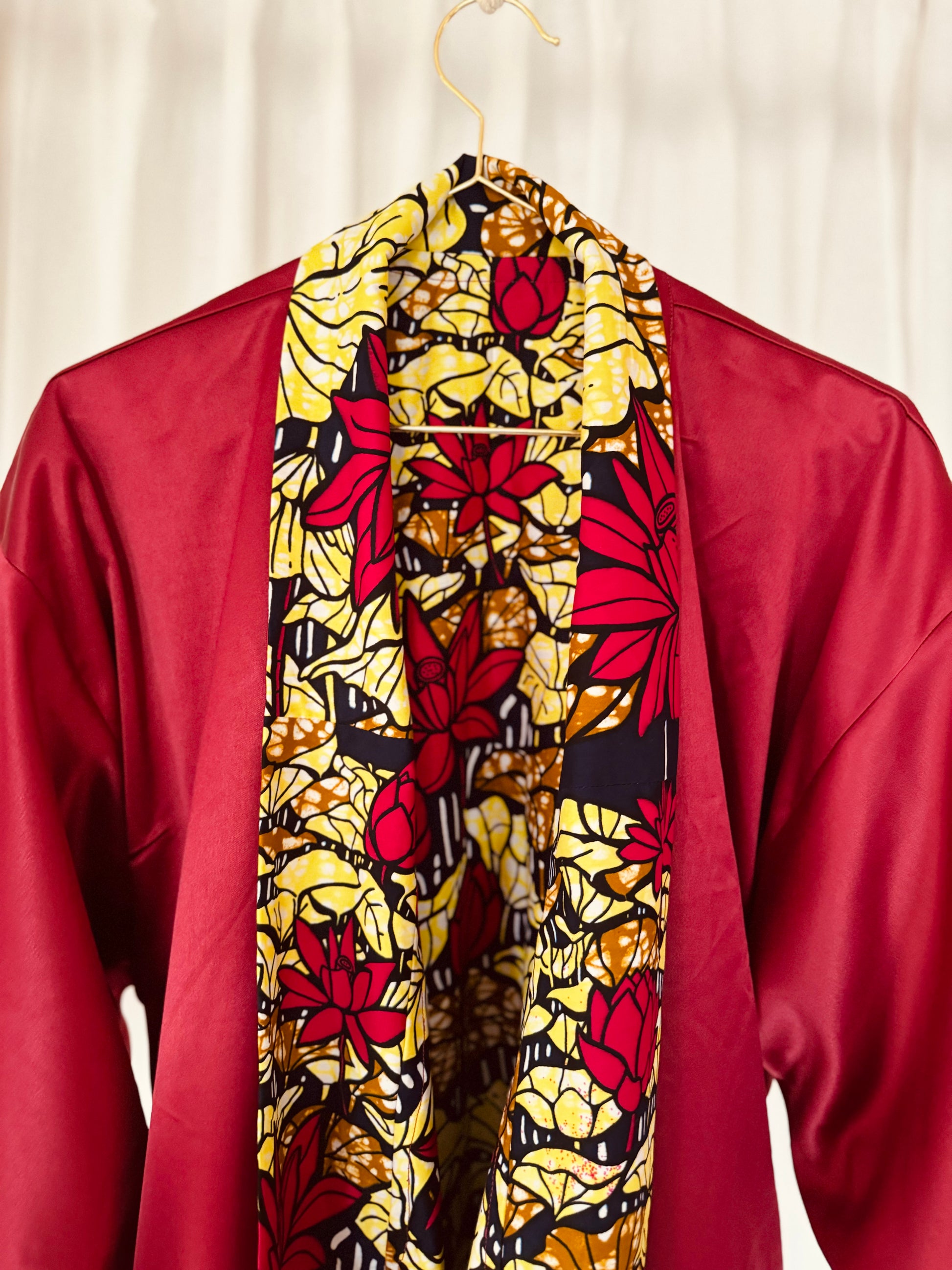 Gönn dir den Luxus unseres wendbaren Afrikimo „Lake of Lotus II“ – eine perfekte Kombination aus Eleganz und Lebendigkeit. Hergestellt aus einem auffälligen African Print aus Lomé, Togo, und kombiniert mit opulentem roten Satin, hüllt dich dieser Afrikimo in Wärme und Selbstbewusstsein.