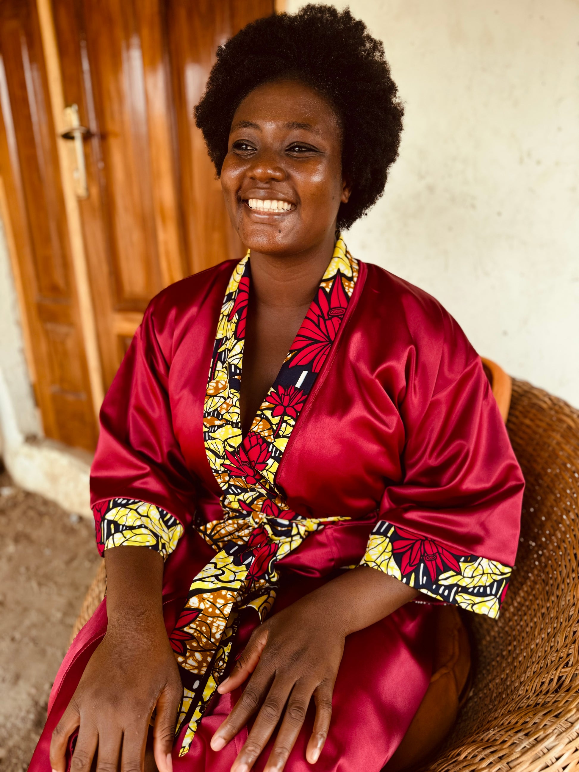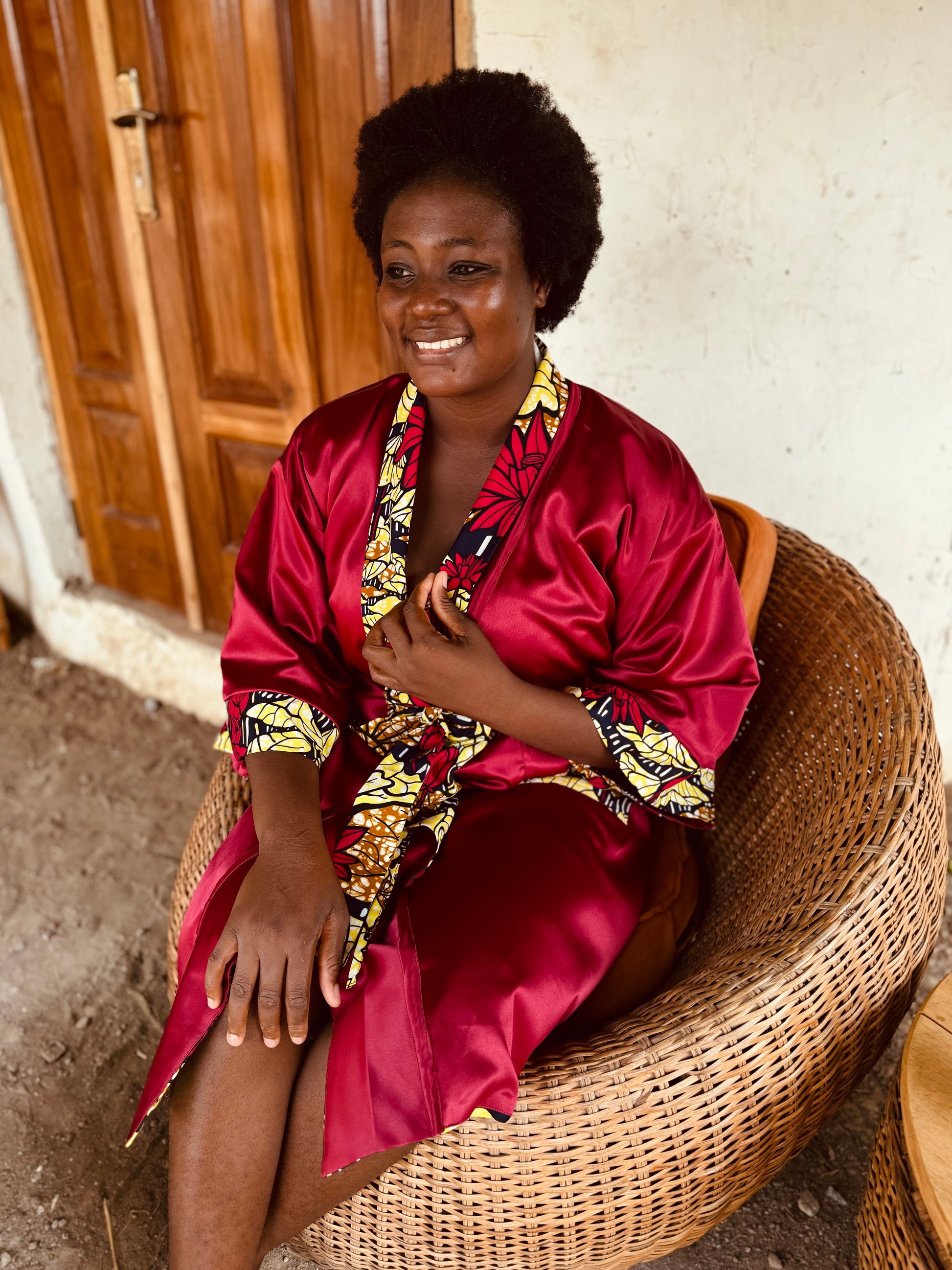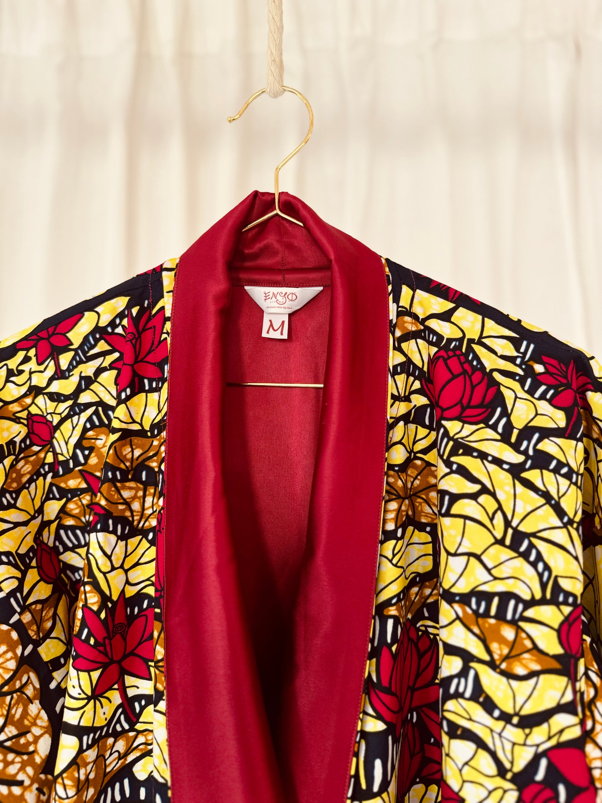 Gönn dir den Luxus unseres wendbaren Afrikimo „Lake of Lotus II“ – eine perfekte Kombination aus Eleganz und Lebendigkeit. Hergestellt aus einem auffälligen African Print aus Lomé, Togo, und kombiniert mit opulentem roten Satin, hüllt dich dieser Afrikimo in Wärme und Selbstbewusstsein.