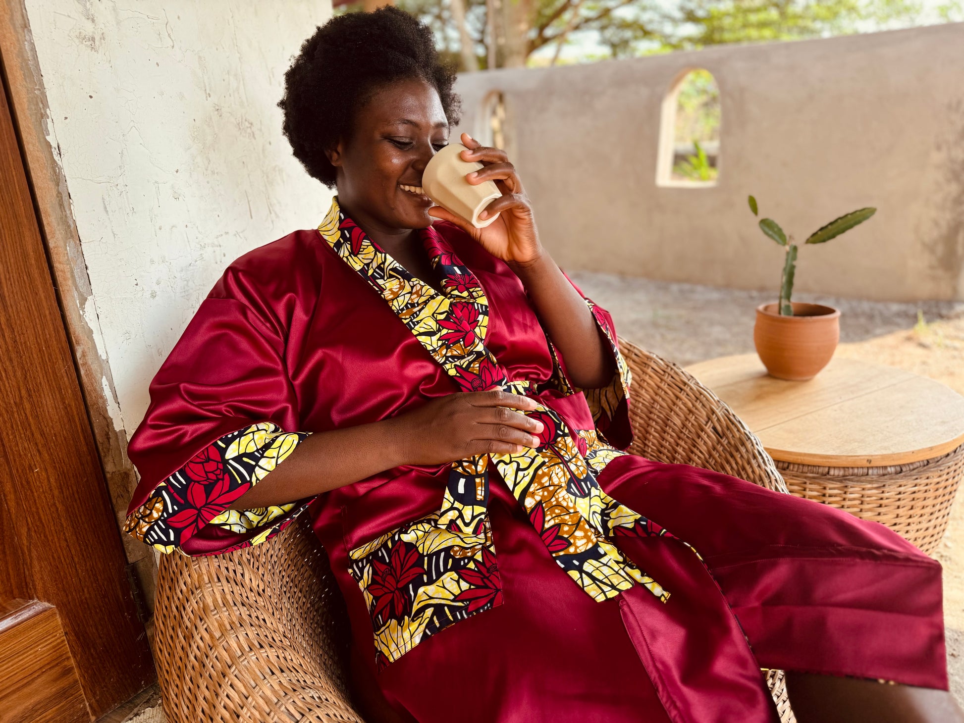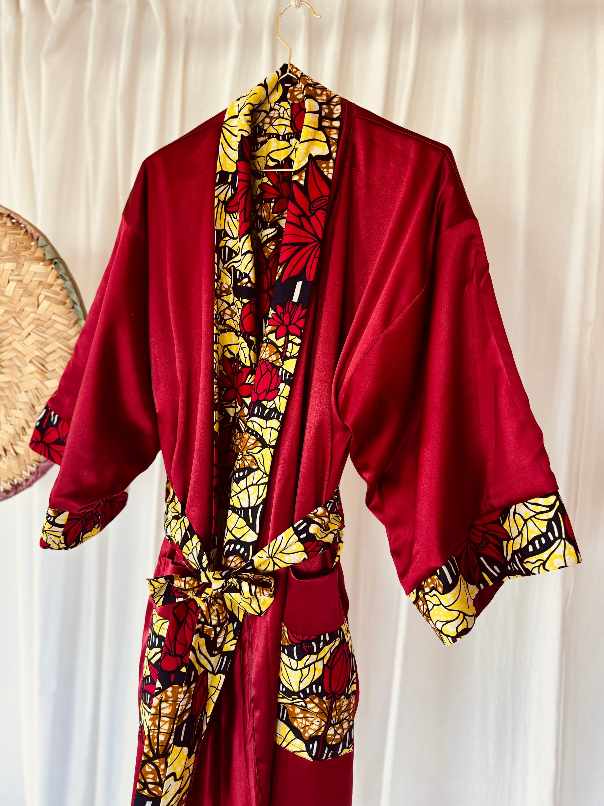 Eine Seite präsentiert den glatten, raffinierten roten Satin, während die andere die kräftigen Rottöne, Gelb und ein sanftes Braun zeigt, geschmückt mit Lotusblumen, die ruhig auf einem tiefblauen See treiben. Das wendbare Design ermöglicht es dir, mühelos zwischen lebendiger Farbe und zeitloser Eleganz zu wechseln, wodurch es ein unverzichtbares Stück für Entspannung und anspruchsvollen Stil wird. Ob beim Entspannen oder beim Aufwerten deiner täglichen Routine – dieser Afrikimo bringt Vielseitigkeit, Schönheit und Tiefe in jeden Moment.