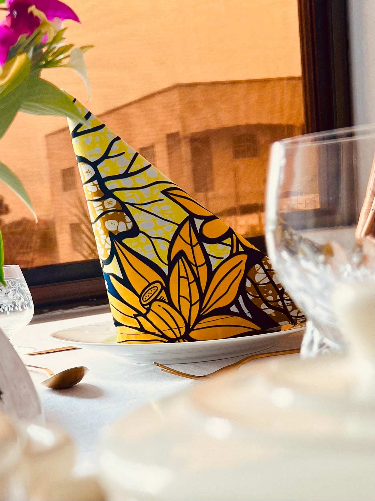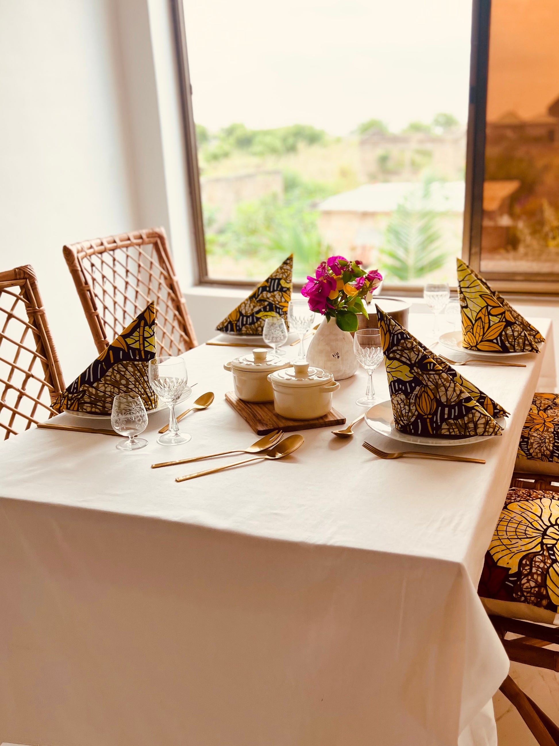 Verleihe deinem Tisch mit unseren „Lake Of Lotus I“-Servietten eine Prise Freude und verträumte Eleganz! Egal ob für ein elegantes Dinner oder einen stilvollen Gartenbrunch – diese Servietten bringen Stil auf den Tisch und sorgen für gute Laune bei deinen Gästen. Das afrikanische Design zeigt sonnengelbe Lotusblüten, die auf einem tiefblauen See treiben, mit braun-beigen Akzenten, die die Farbpalette harmonisch abrunden. Der Stoff gehört zu unserer Lomé-Kollektion und stammt aus Togo. Gefertigt aus 100 % afrikanischer Baumwolle, sind diese Servietten nicht nur eine zauberhafte Ergänzung zu deinem Esserlebnis, sondern auch eine umweltfreundliche Wahl.