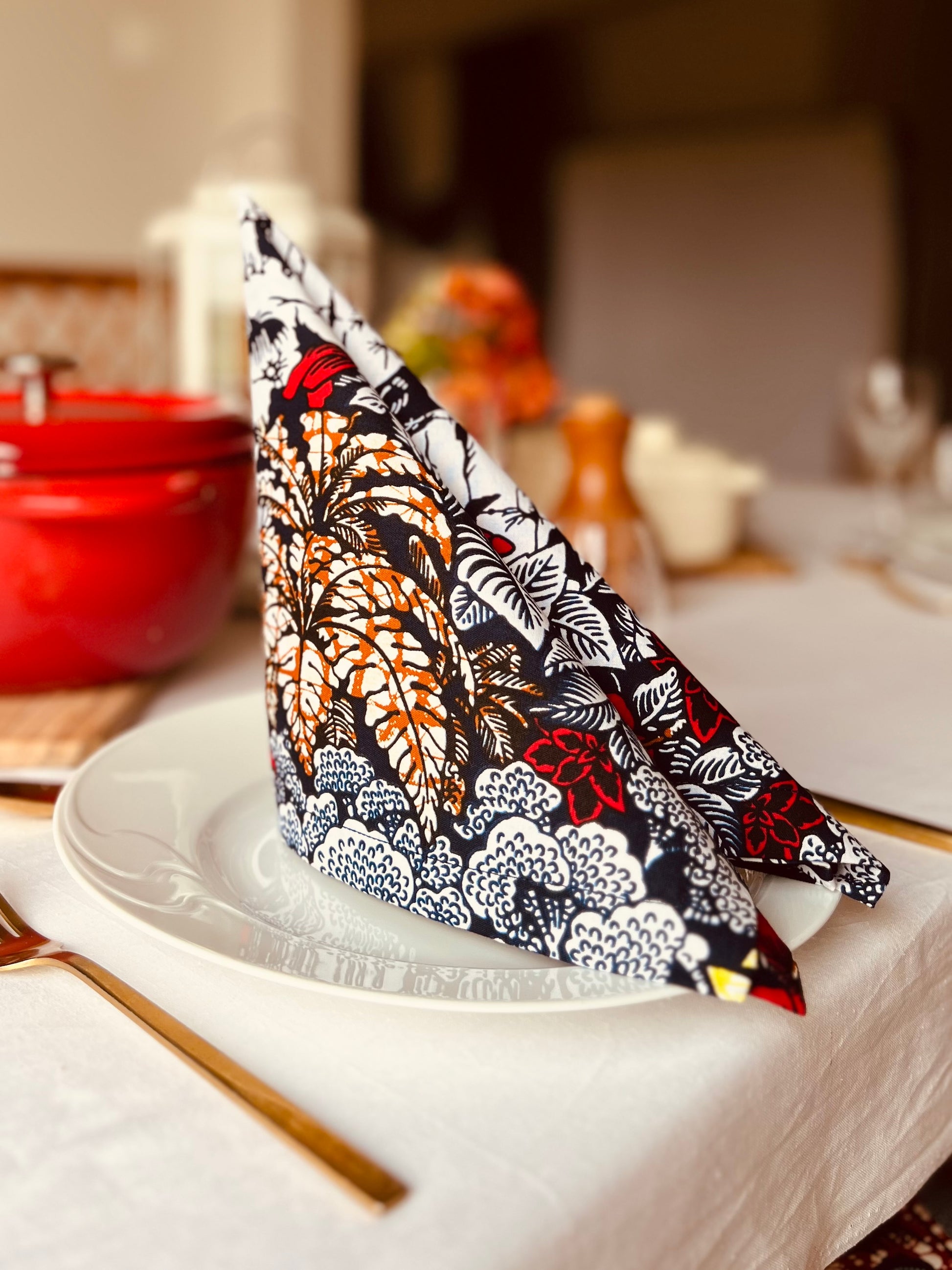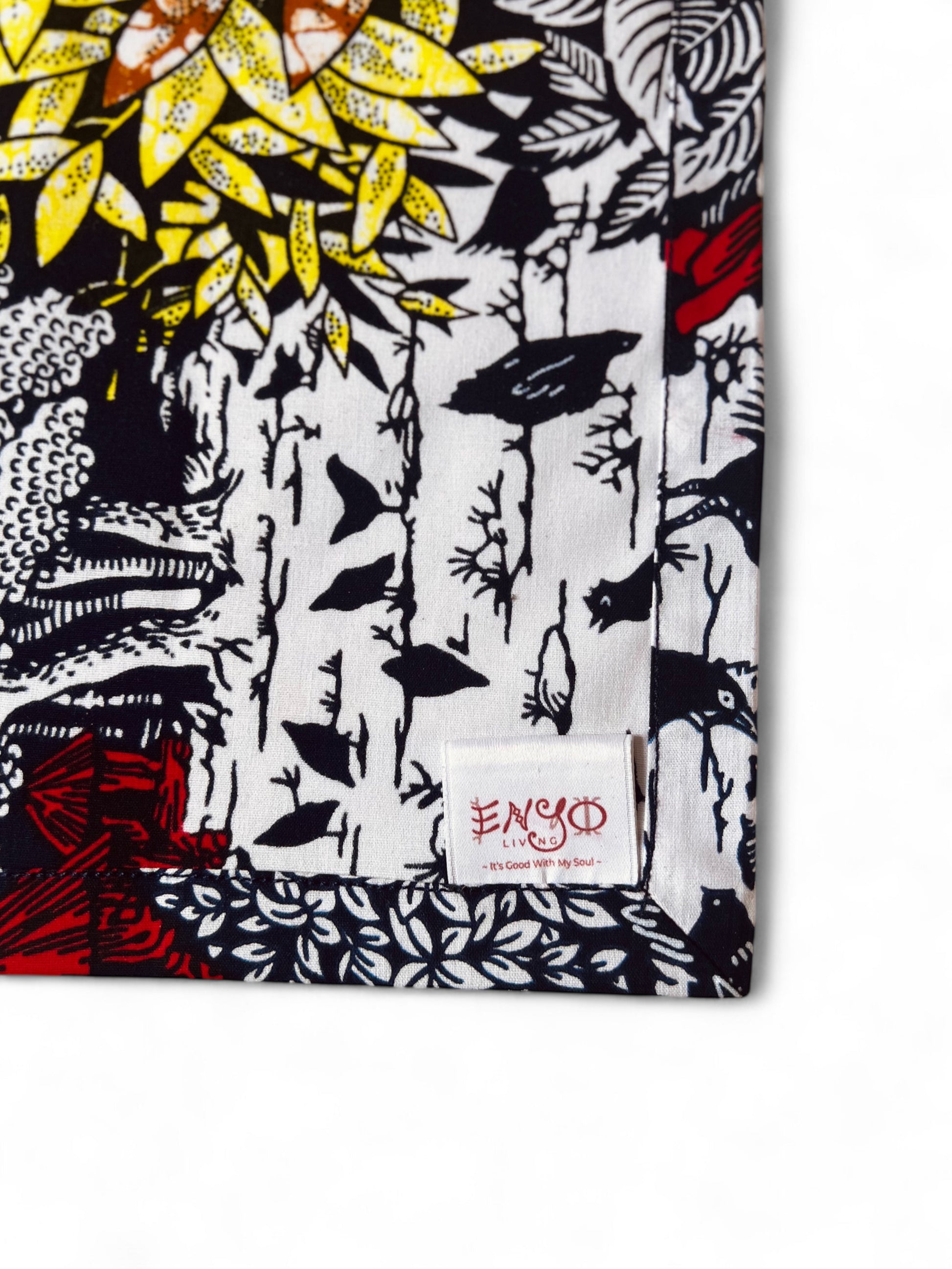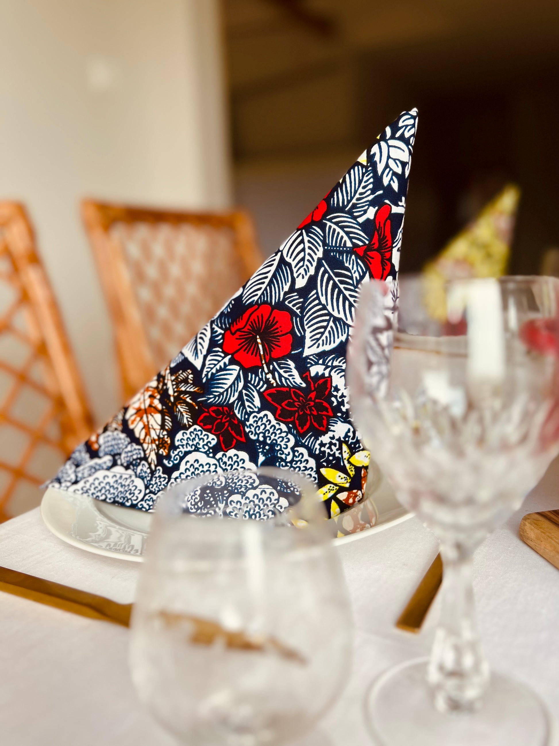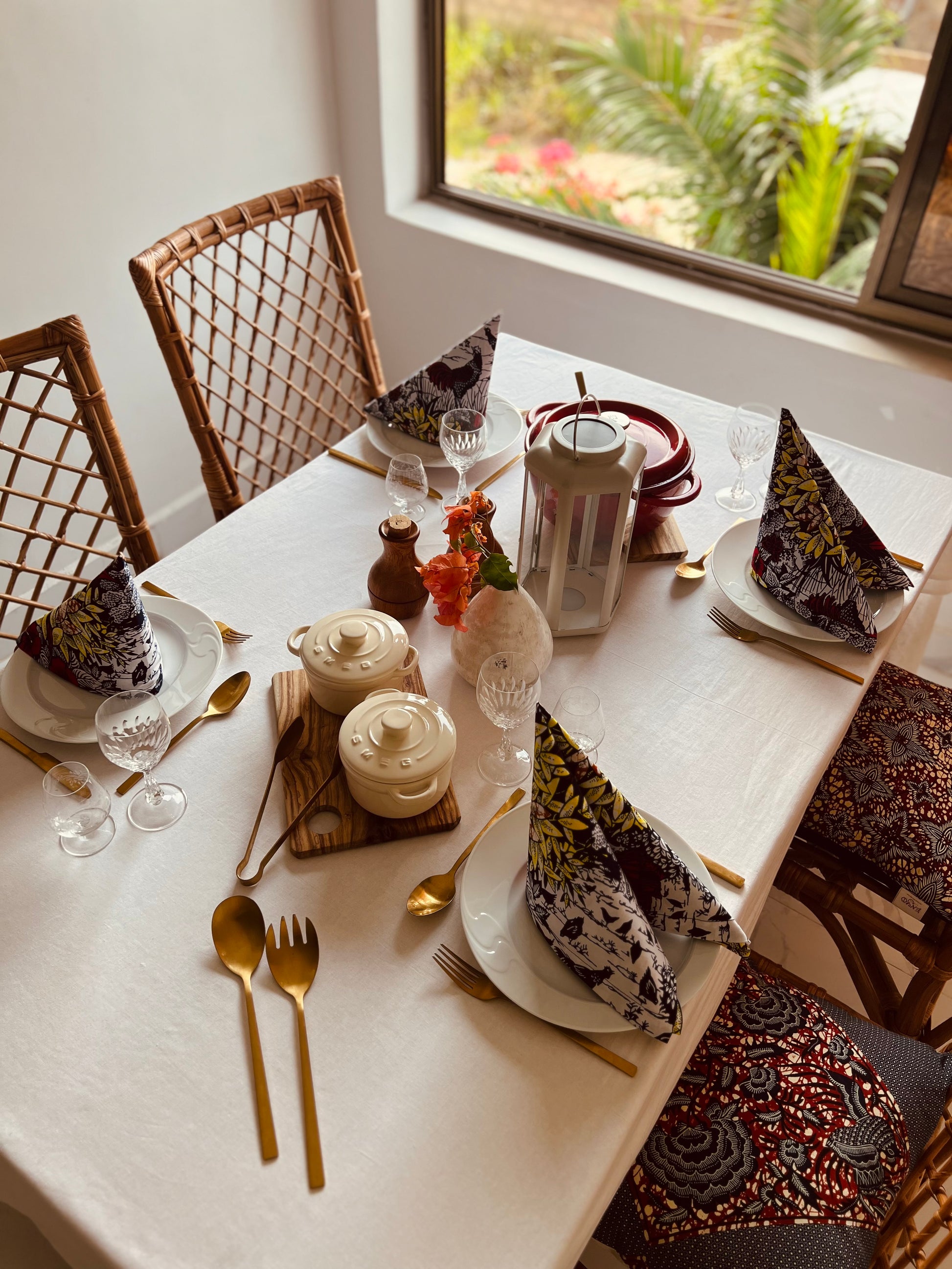 Bringe mit den Servietten „Mon Petit Village“ einen Hauch von westafrikanischer Nostalgie auf deinen Tisch. Die Servietten zeigen ein liebevolles Motiv eines ruhigen Dorflebens – mit einer traditionellen Hütte, frei umherlaufenden Hühnern und leuchtend roten Hibiskusbüschen. Der tiefblaue Print, kombiniert mit fröhlichem Gelb und erdigen Brauntönen, entführt dich und deine Gäste sofort in eine friedliche, idyllische Atmosphäre. Lass dich inspirieren, Kindheitsgeschichten zu teilen, und verwandle deine Mahlzeit in eine kleine Flucht aus dem hektischen Trubel des Stadtlebens.