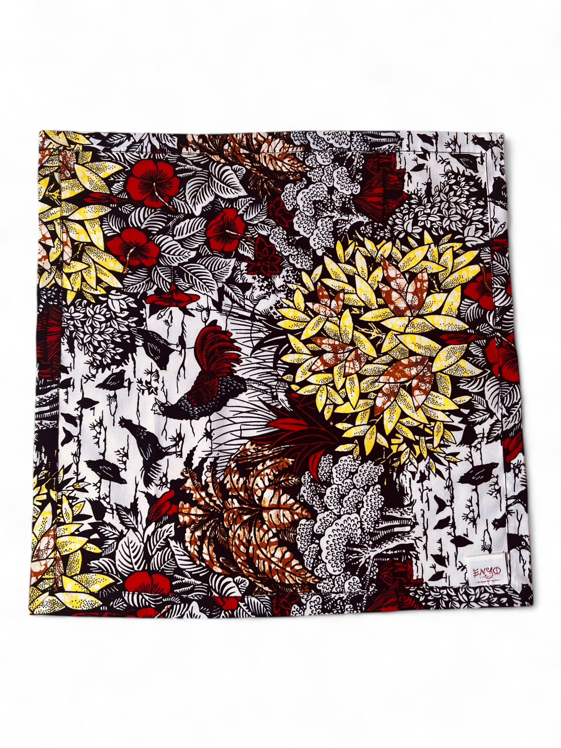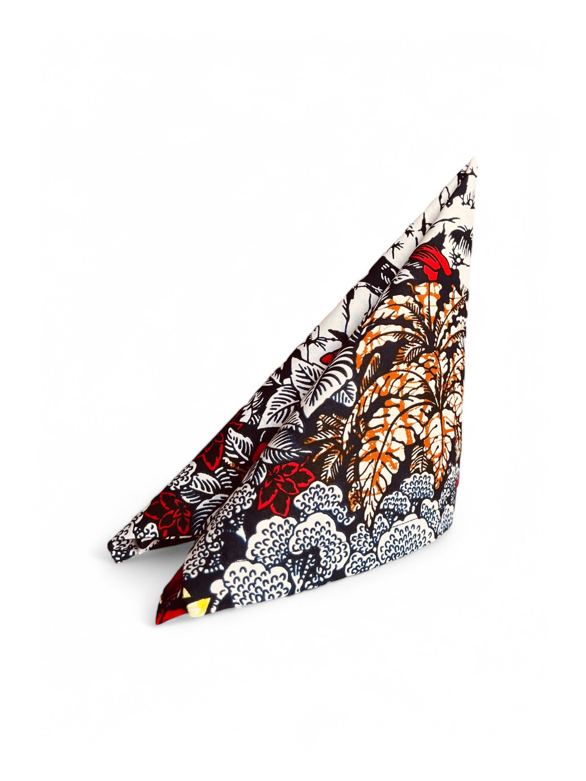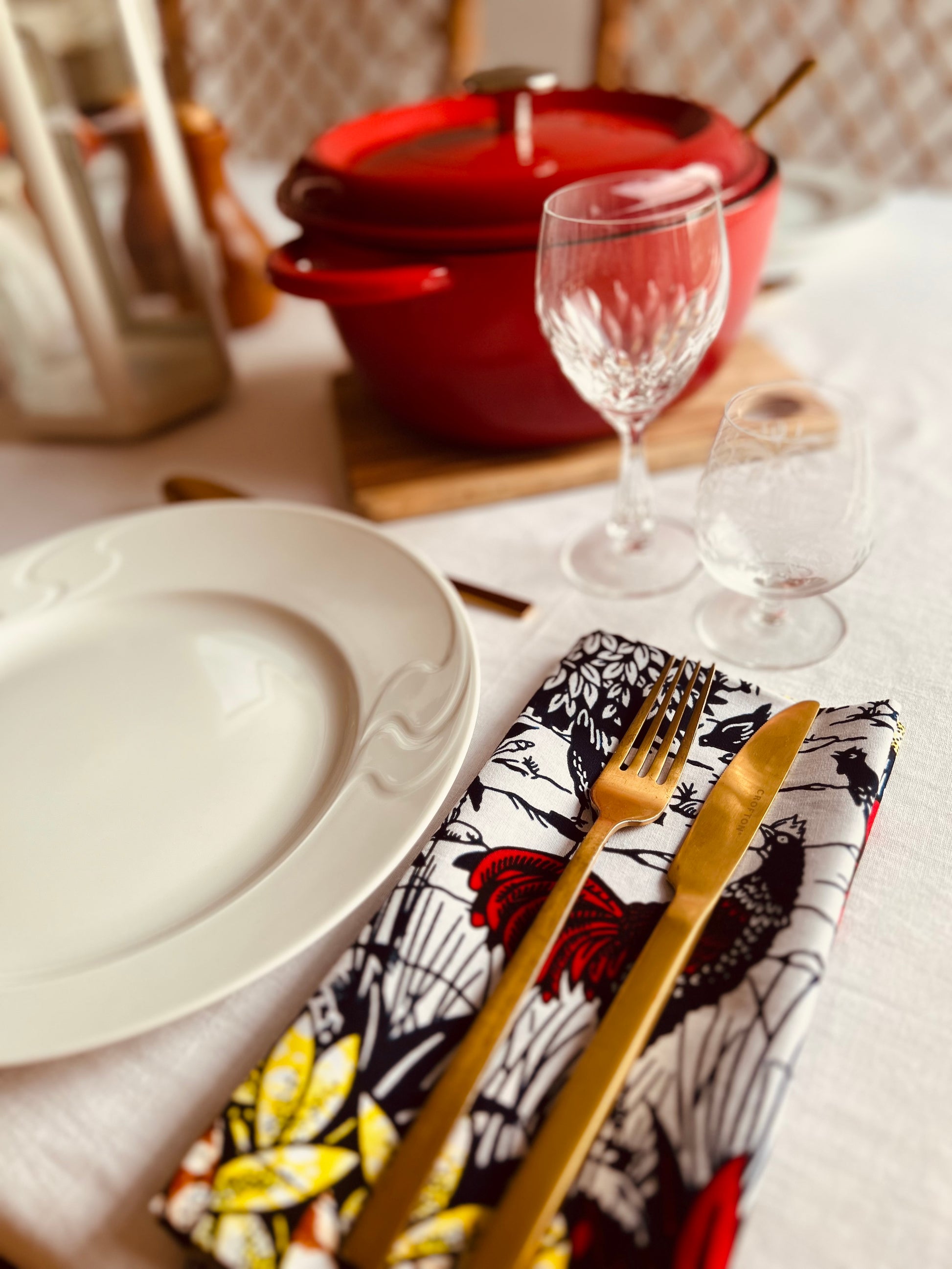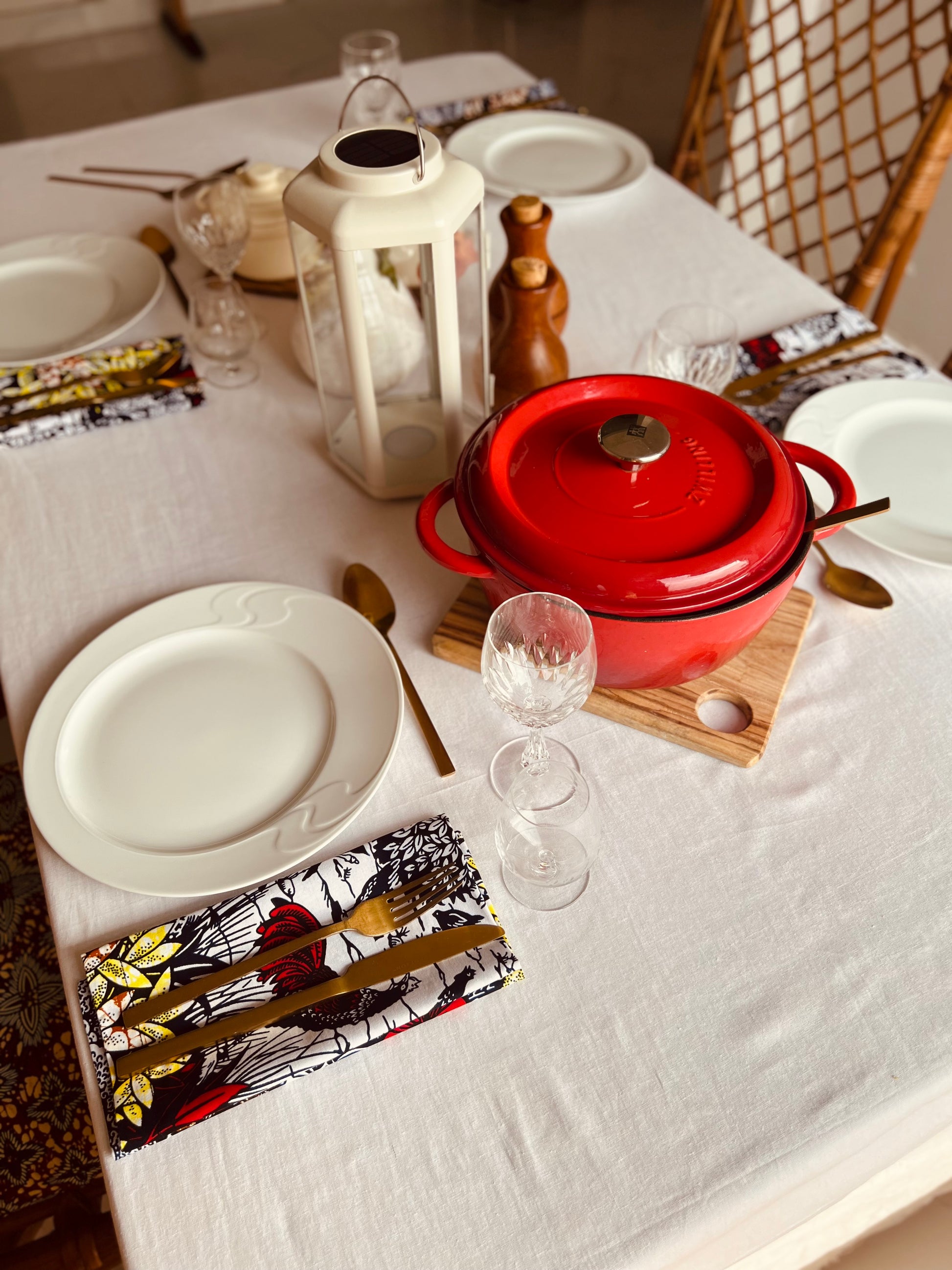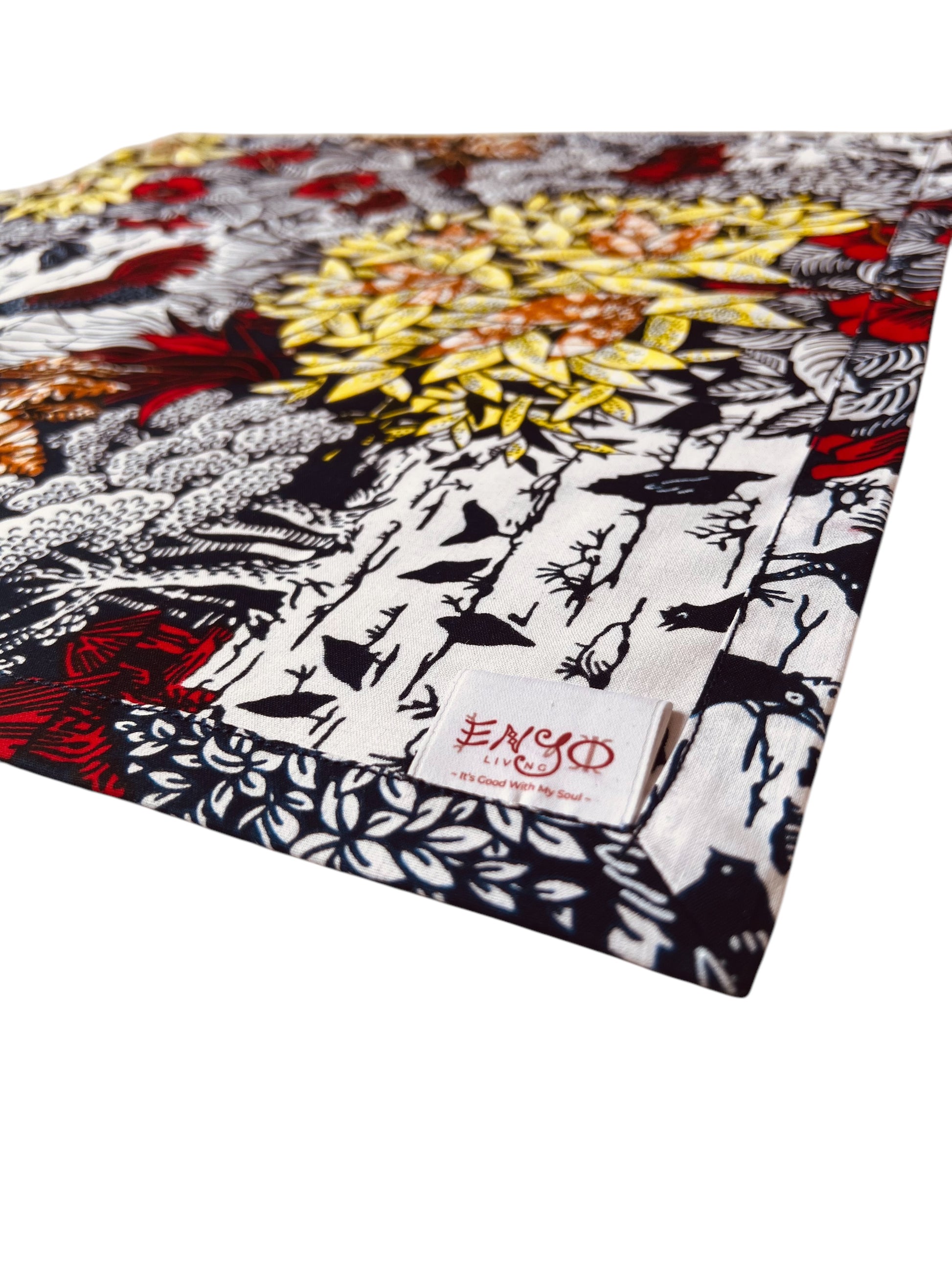 Bringe mit den Servietten „Mon Petit Village“ einen Hauch von westafrikanischer Nostalgie auf deinen Tisch. Die Servietten zeigen ein liebevolles Motiv eines ruhigen Dorflebens – mit einer traditionellen Hütte, frei umherlaufenden Hühnern und leuchtend roten Hibiskusbüschen. Der tiefblaue Print, kombiniert mit fröhlichem Gelb und erdigen Brauntönen, entführt dich und deine Gäste sofort in eine friedliche, idyllische Atmosphäre. Lass dich inspirieren, Kindheitsgeschichten zu teilen, und verwandle deine Mahlzeit in eine kleine Flucht aus dem hektischen Trubel des Stadtlebens.