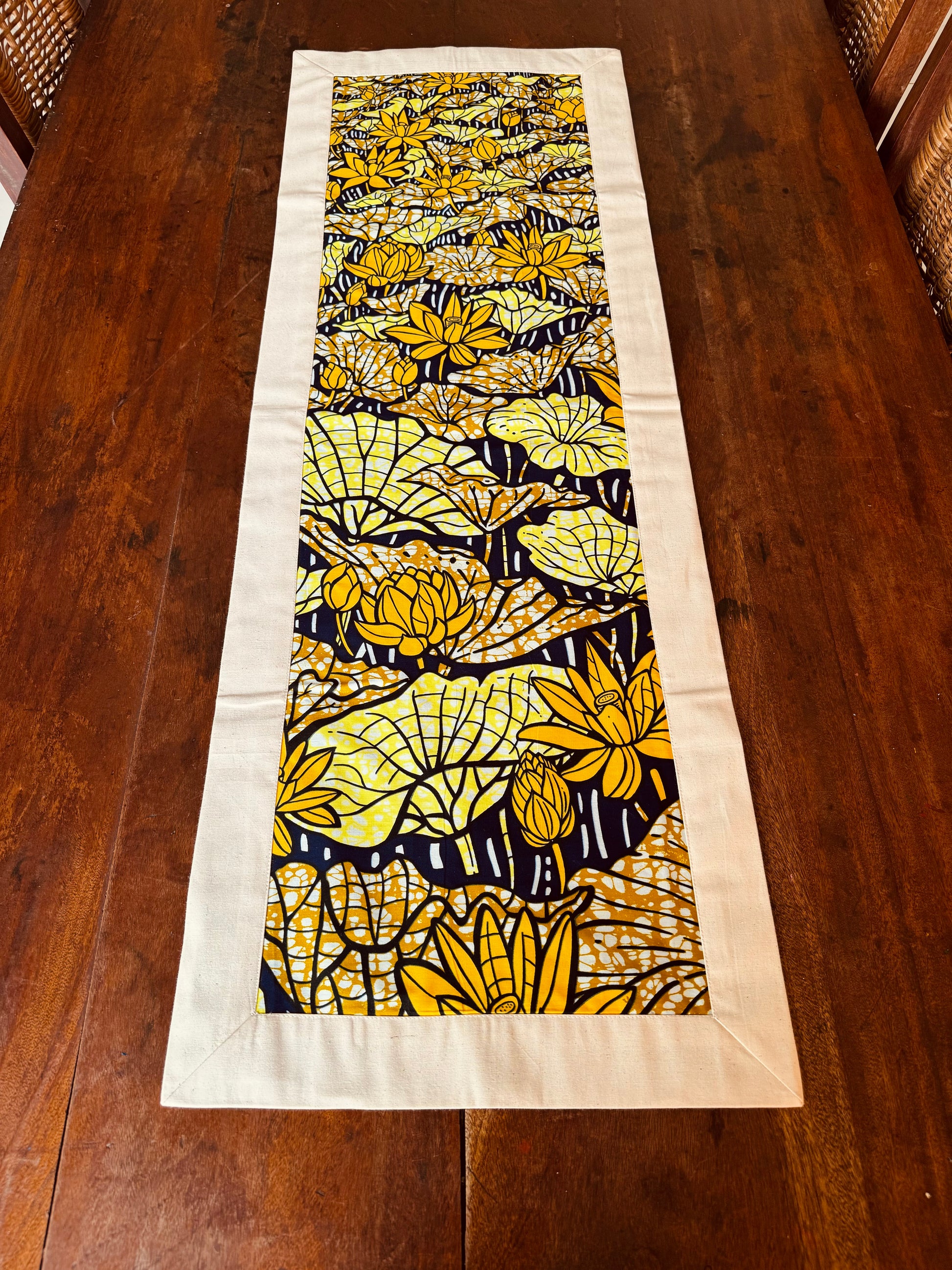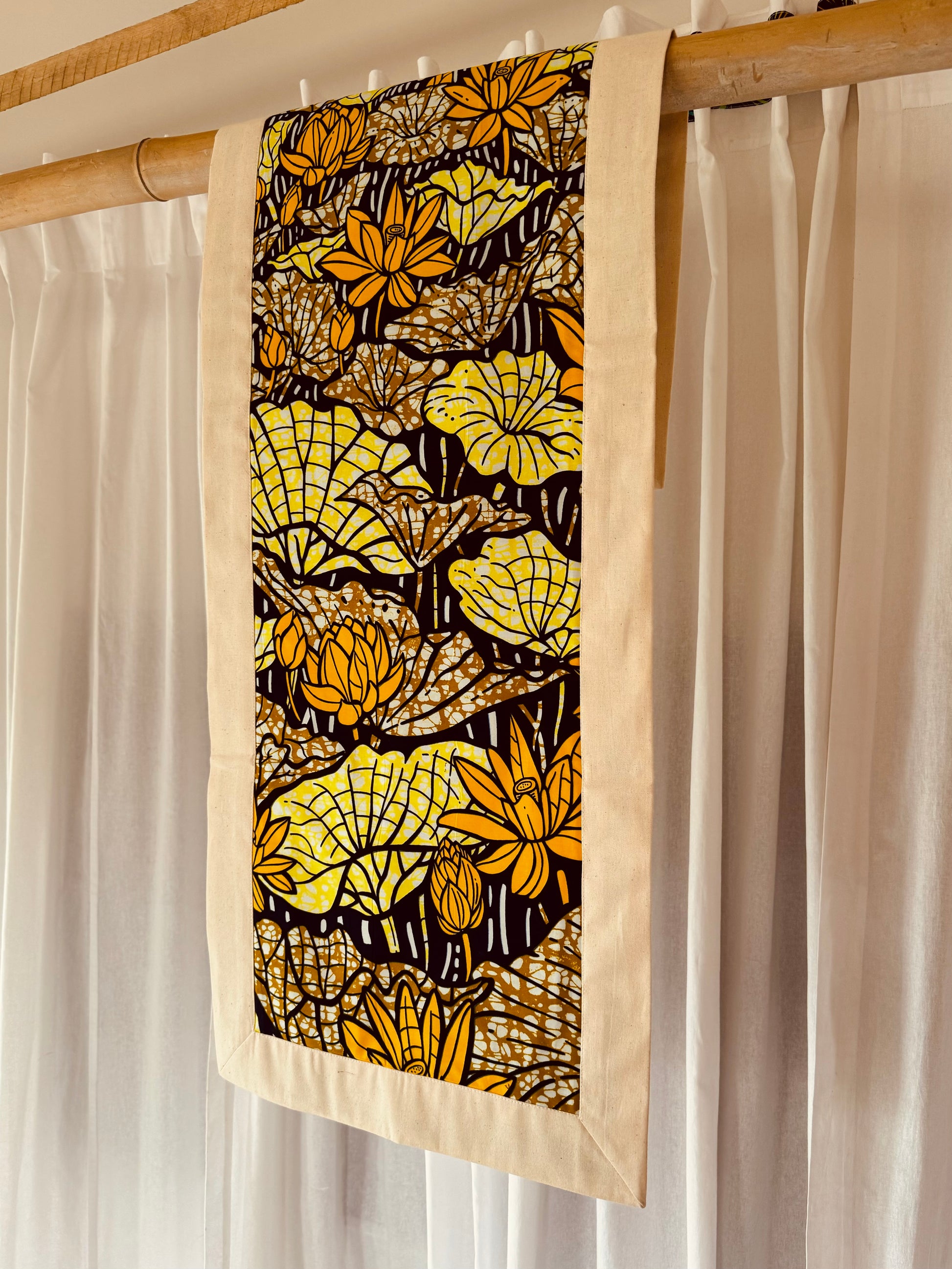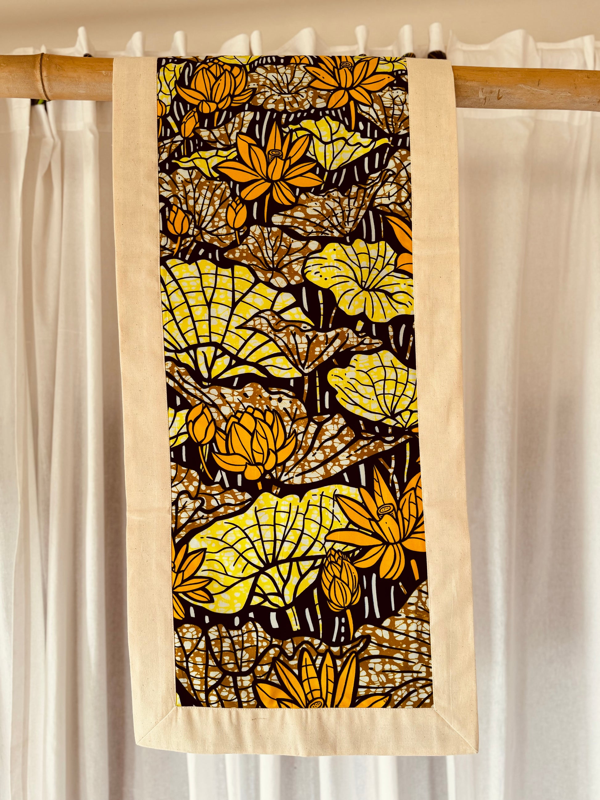 Unser Tischläufer „Lake of Lotus I“ ist handgefertigt aus African Print und bringt mühelos Eleganz auf deinen Tisch. Die strahlend gelben Lotusblumen auf dem tiefblauen See, kombiniert mit warmen braun-beigen Tönen, schaffen eine harmonische und stilvolle Atmosphäre. Der Creme-Baumwollrand rundet das Design ab und passt perfekt zu den warmen Akzenten des Stoffs. Dieser einzigartige Tischläufer stammt aus unserer Lomé-Kollektion und wurde aus hochwertigem Stoff aus Togo gefertigt. Mit seiner vielseitigen Farbpalette ist er die ideale Wahl für festliche Anlässe, gemütliche Abendessen oder einfach für den täglichen Charme. Lass deinen Tisch mit natürlicher Schönheit und Stil erstrahlen.