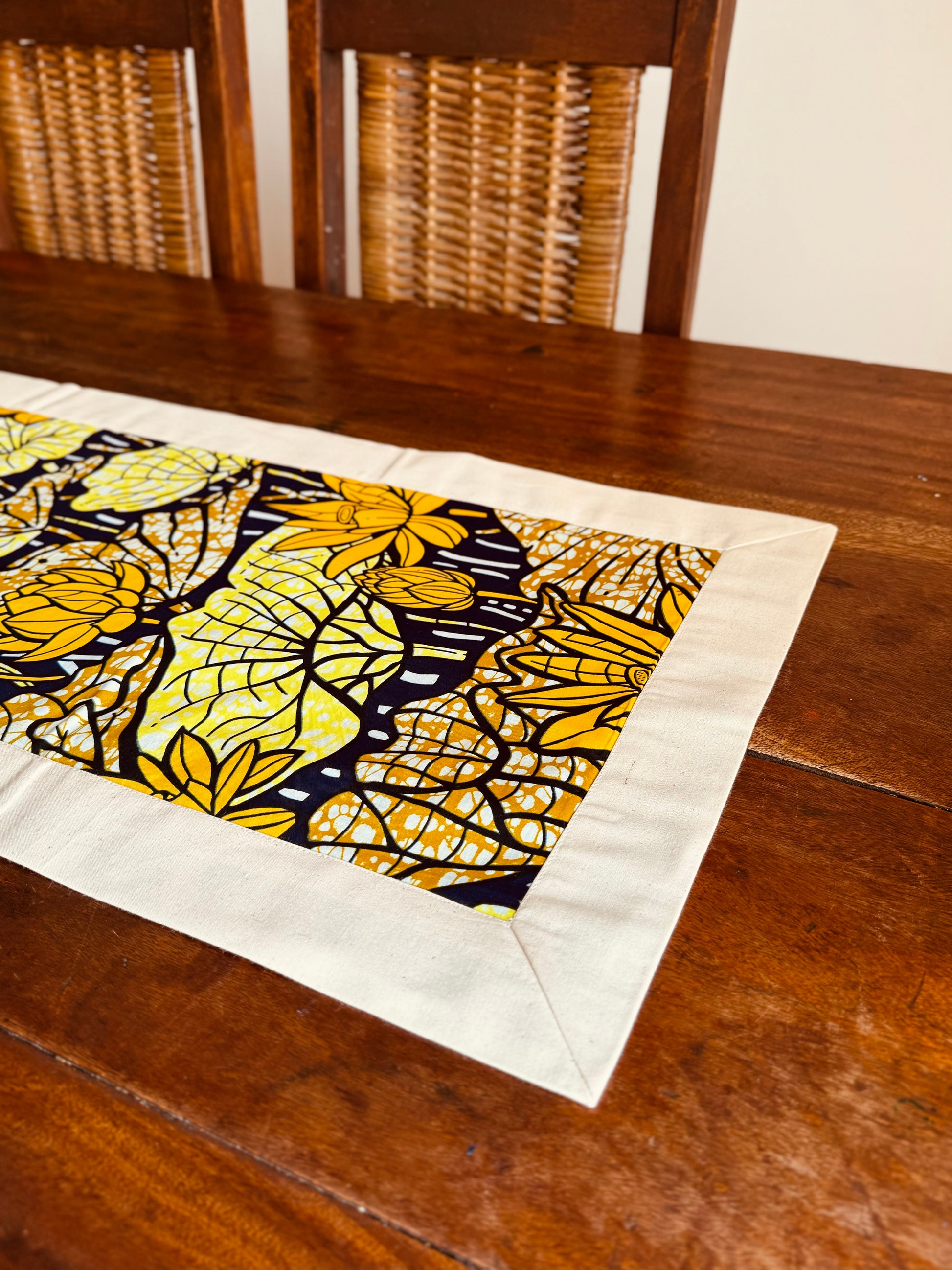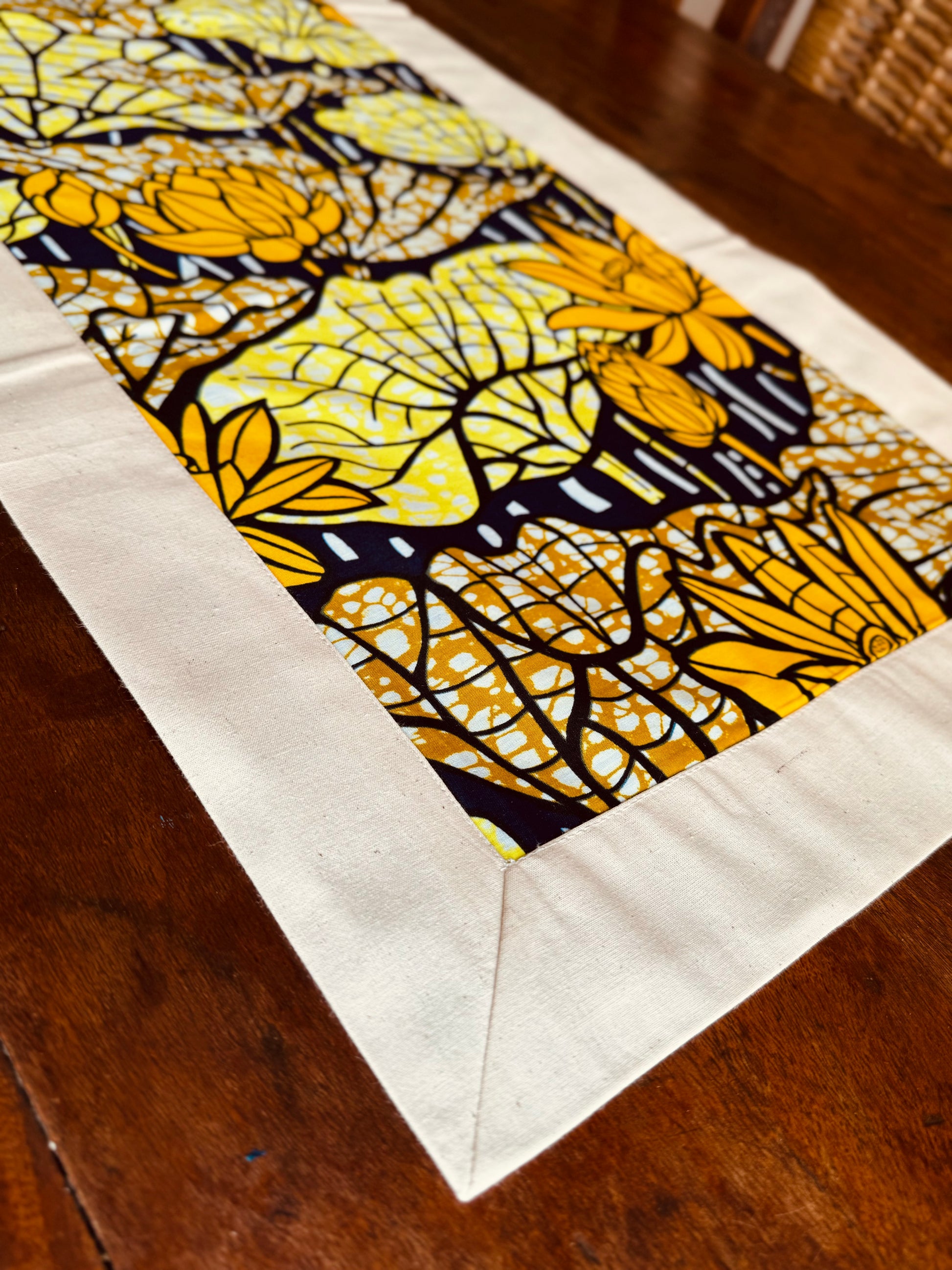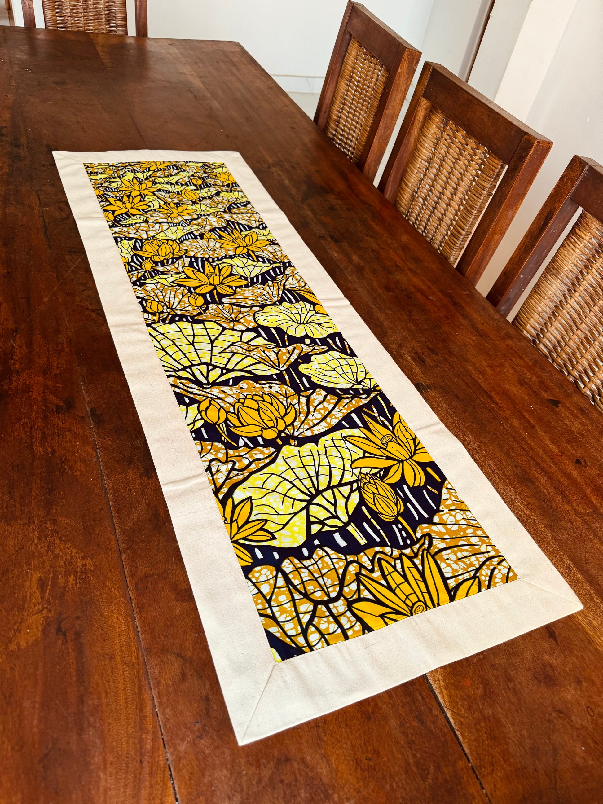 Unser Tischläufer „Lake of Lotus I“ ist handgefertigt aus African Print und bringt mühelos Eleganz auf deinen Tisch. Die strahlend gelben Lotusblumen auf dem tiefblauen See, kombiniert mit warmen braun-beigen Tönen, schaffen eine harmonische und stilvolle Atmosphäre. Der Creme-Baumwollrand rundet das Design ab und passt perfekt zu den warmen Akzenten des Stoffs. Dieser einzigartige Tischläufer stammt aus unserer Lomé-Kollektion und wurde aus hochwertigem Stoff aus Togo gefertigt. Mit seiner vielseitigen Farbpalette ist er die ideale Wahl für festliche Anlässe, gemütliche Abendessen oder einfach für den täglichen Charme. Lass deinen Tisch mit natürlicher Schönheit und Stil erstrahlen.