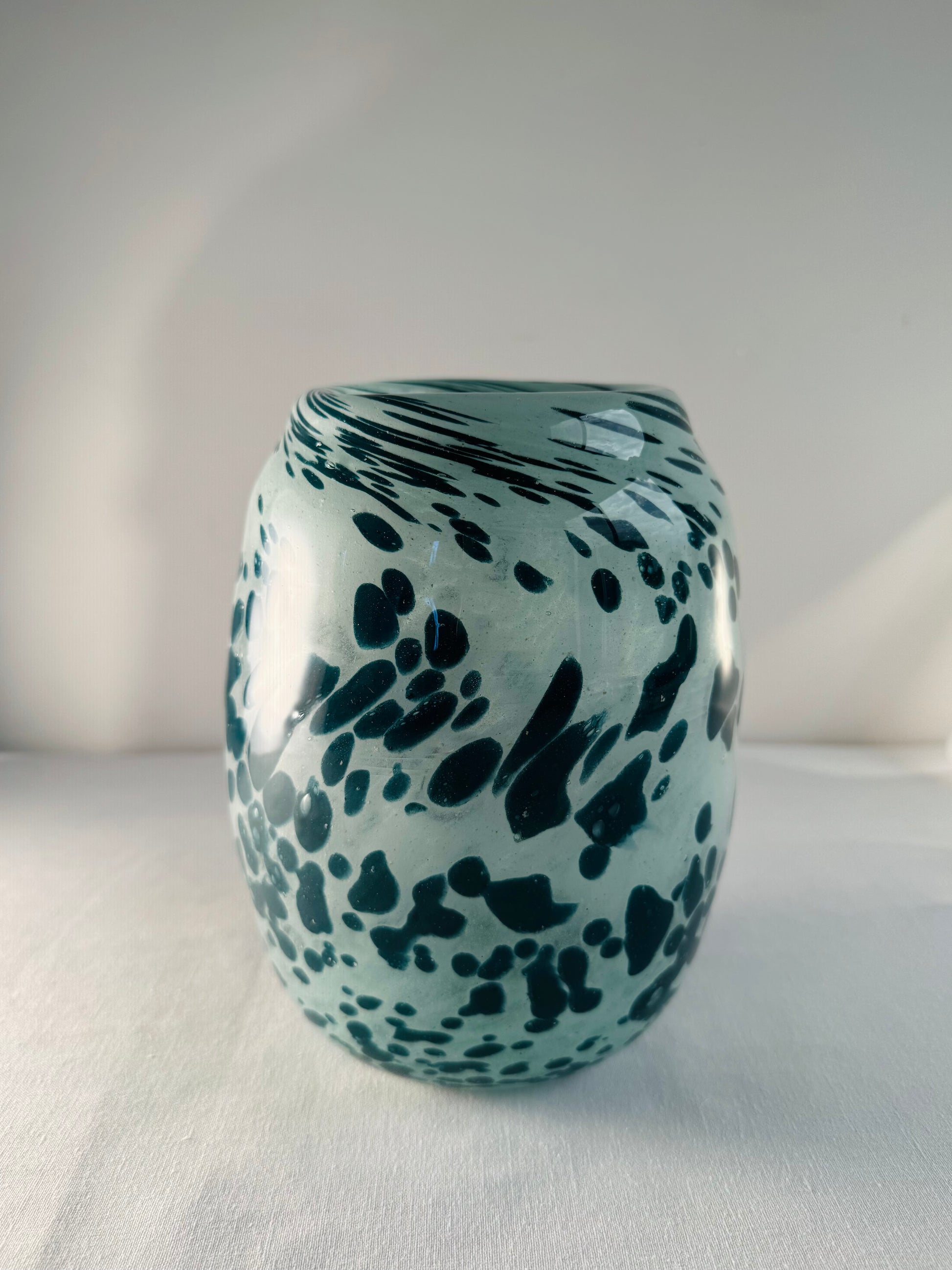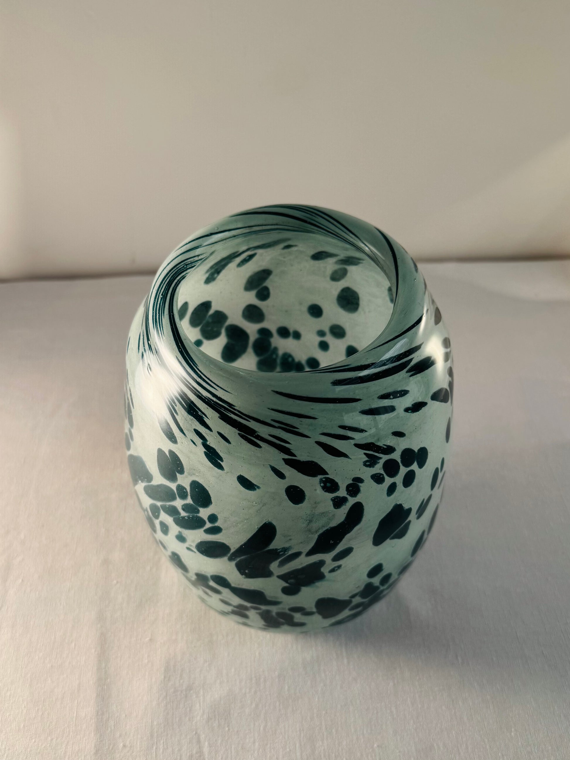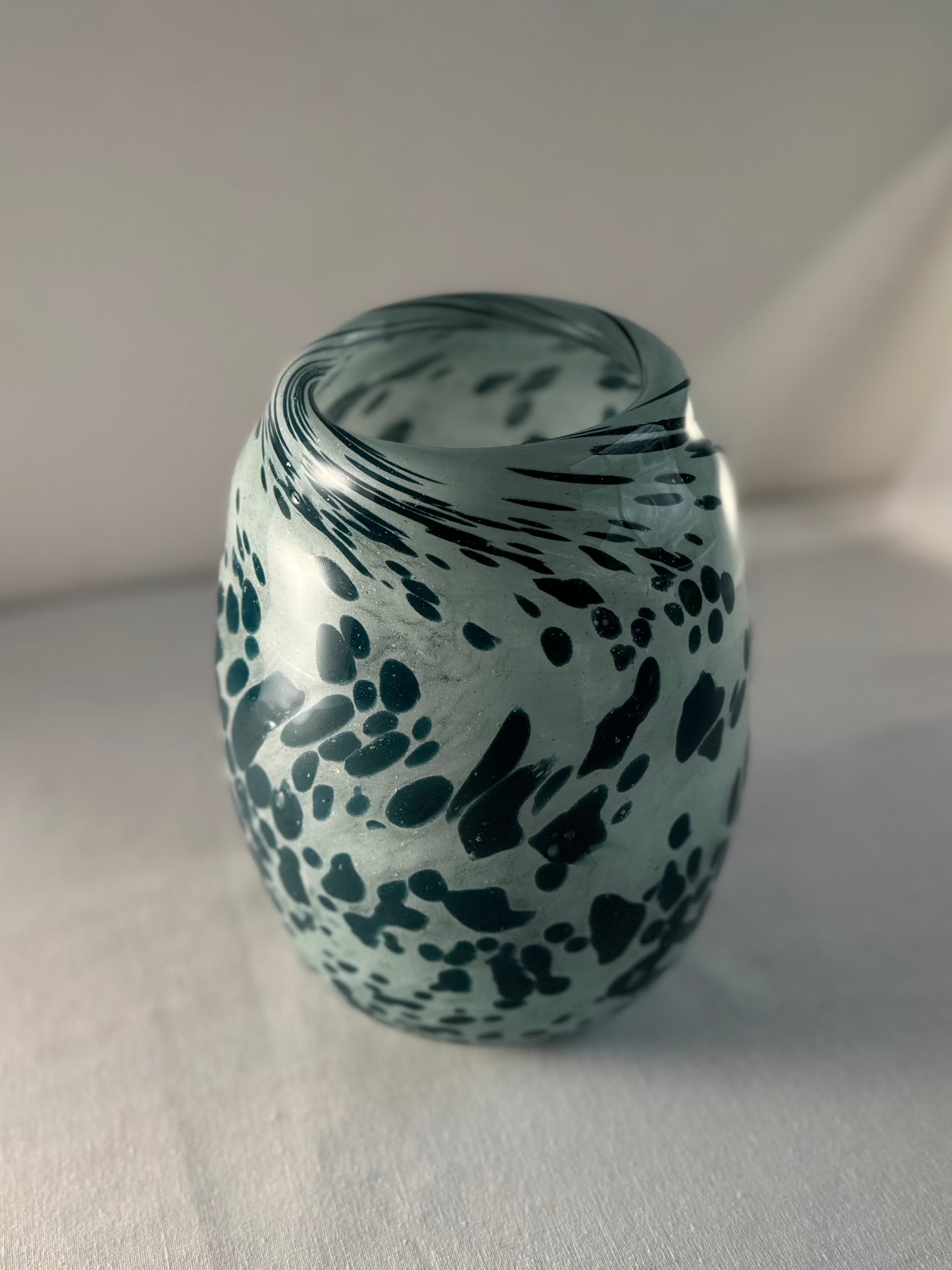 Crafted from recycled glass, the Glass Vase "Sea-Green Confetti" breathes new life into materials that might otherwise be discarded. Its milky surface is beautifully adorned with sea-green confetti, created by grinding traditional Krobo beads. This vase combines sustainability with vibrant artistry, making it a striking and eco-conscious addition to your home. Whether decorated with tropical flowers and leaves, a minimalist branch or standing alone as a work of art in itself, this vase will surely add character to your space.