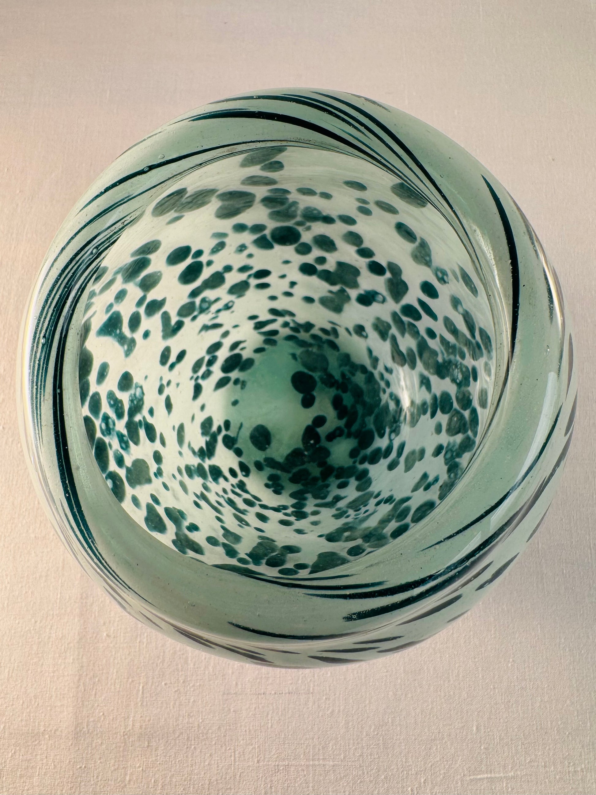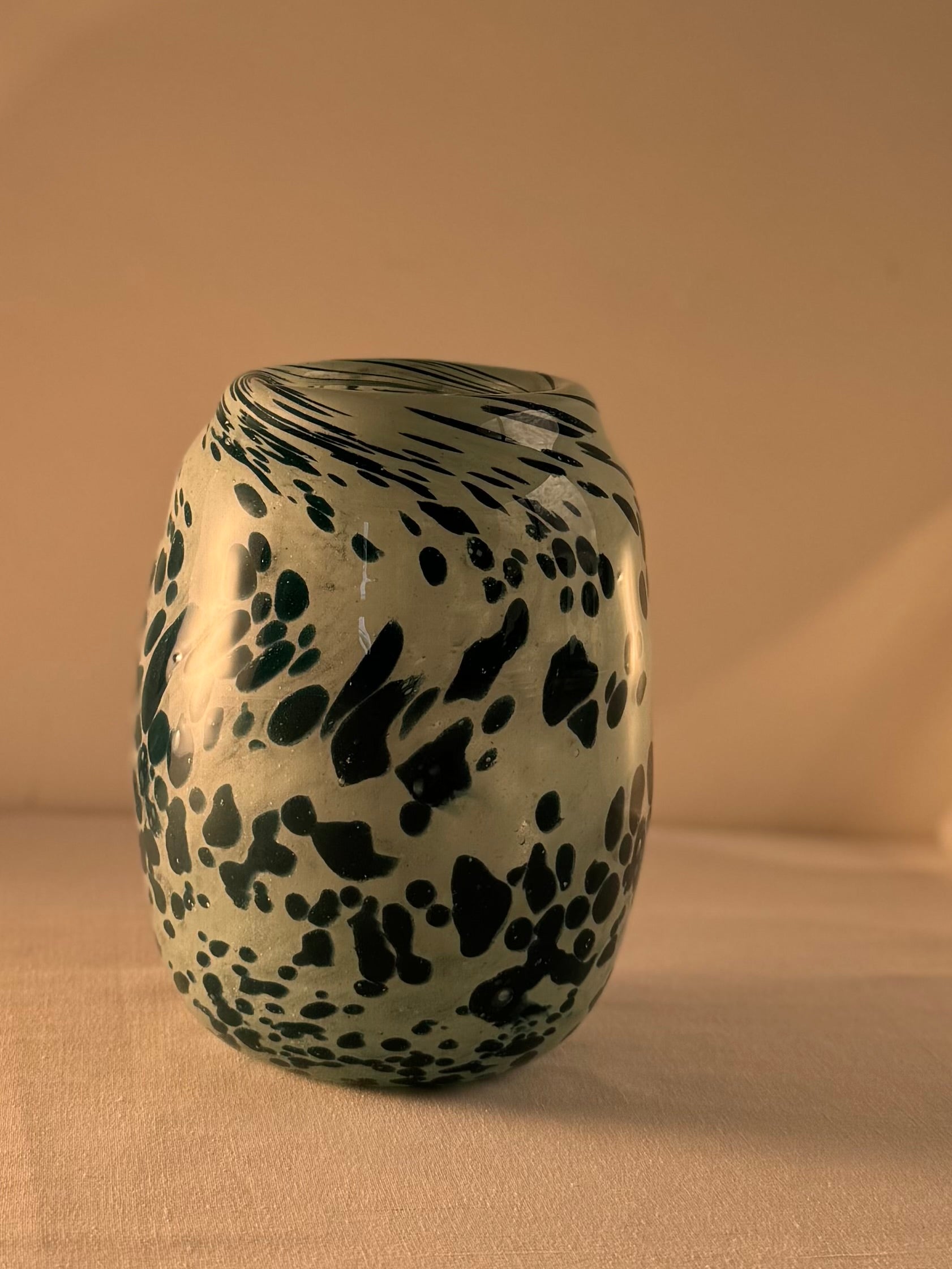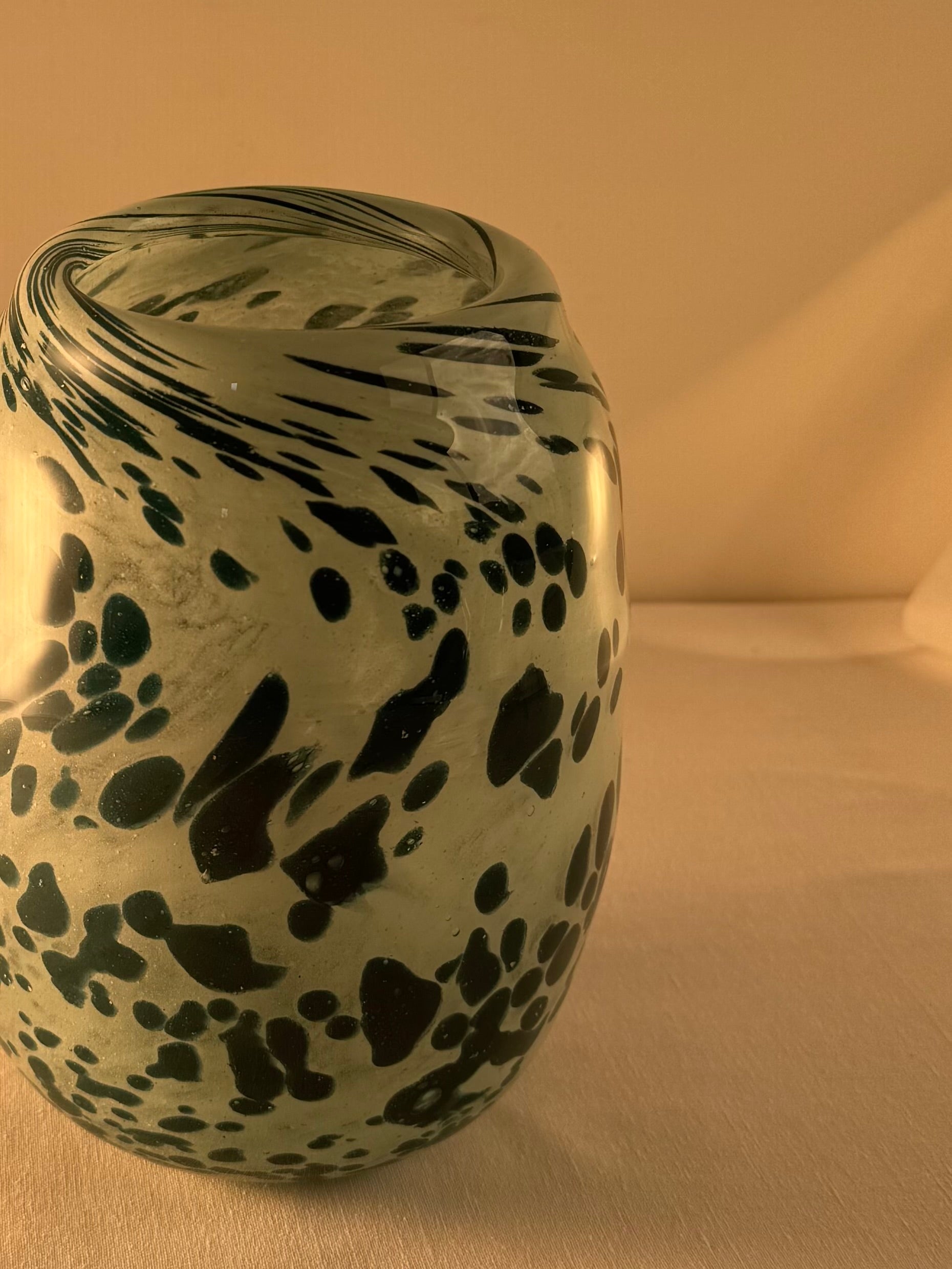 Crafted from recycled glass, the Glass Vase "Sea-Green Confetti" breathes new life into materials that might otherwise be discarded. Its milky surface is beautifully adorned with sea-green confetti, created by grinding traditional Krobo beads. This vase combines sustainability with vibrant artistry, making it a striking and eco-conscious addition to your home. Whether decorated with tropical flowers and leaves, a minimalist branch or standing alone as a work of art in itself, this vase will surely add character to your space.