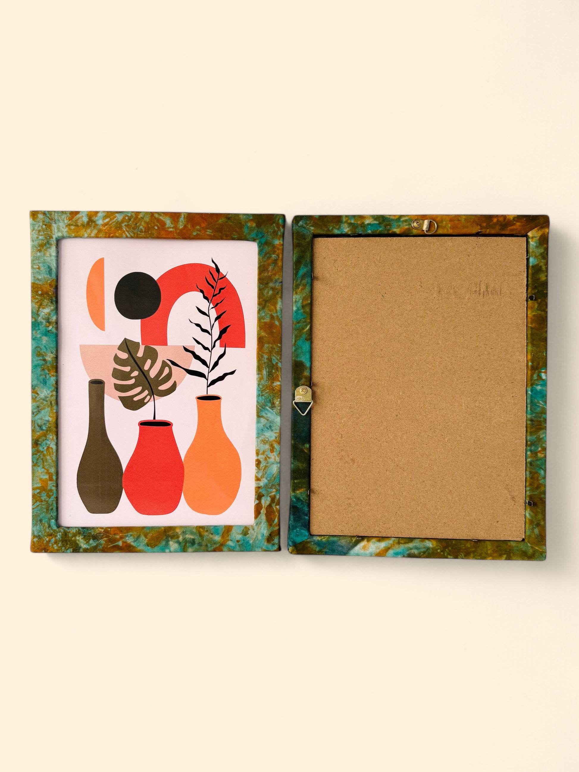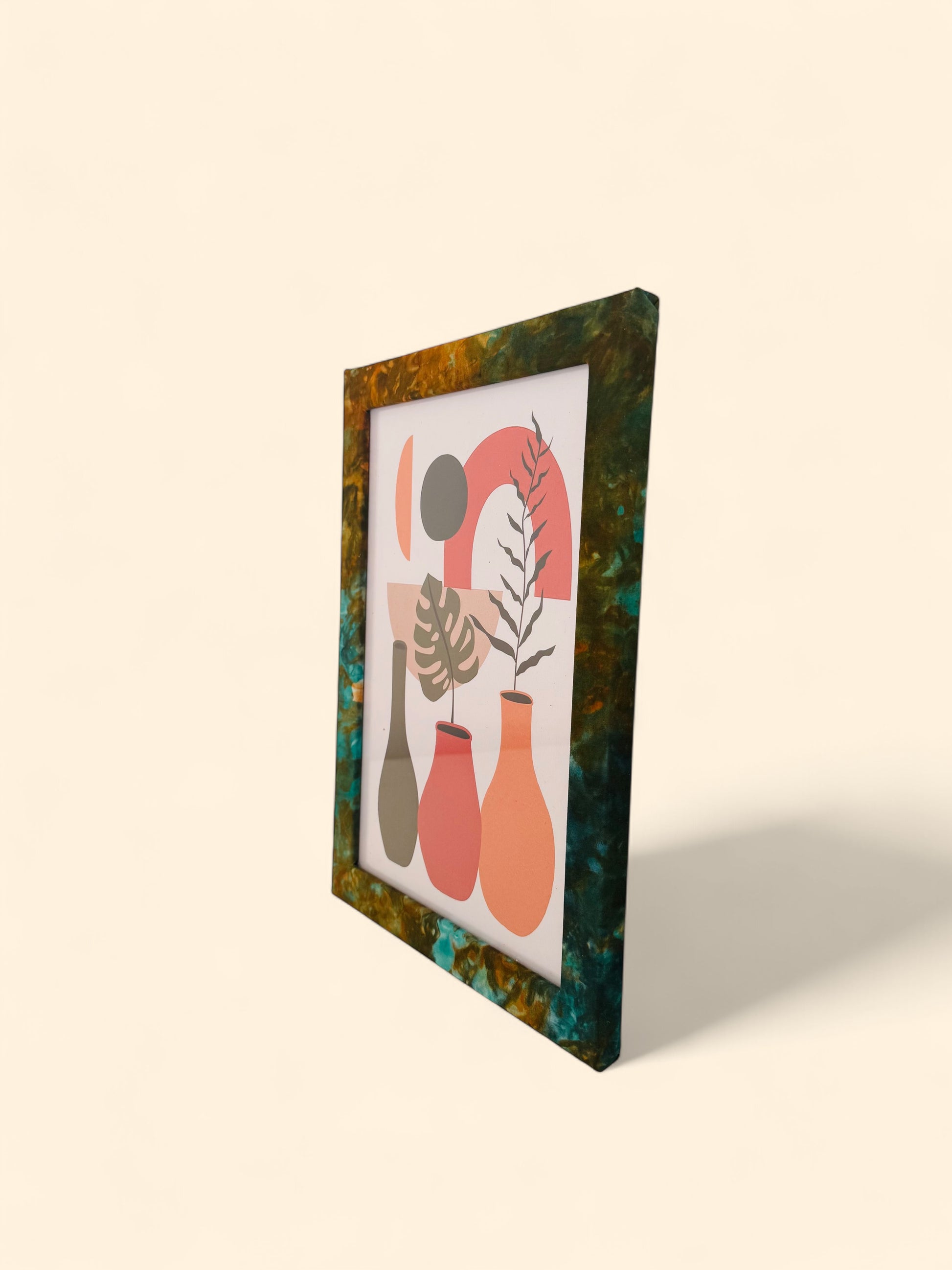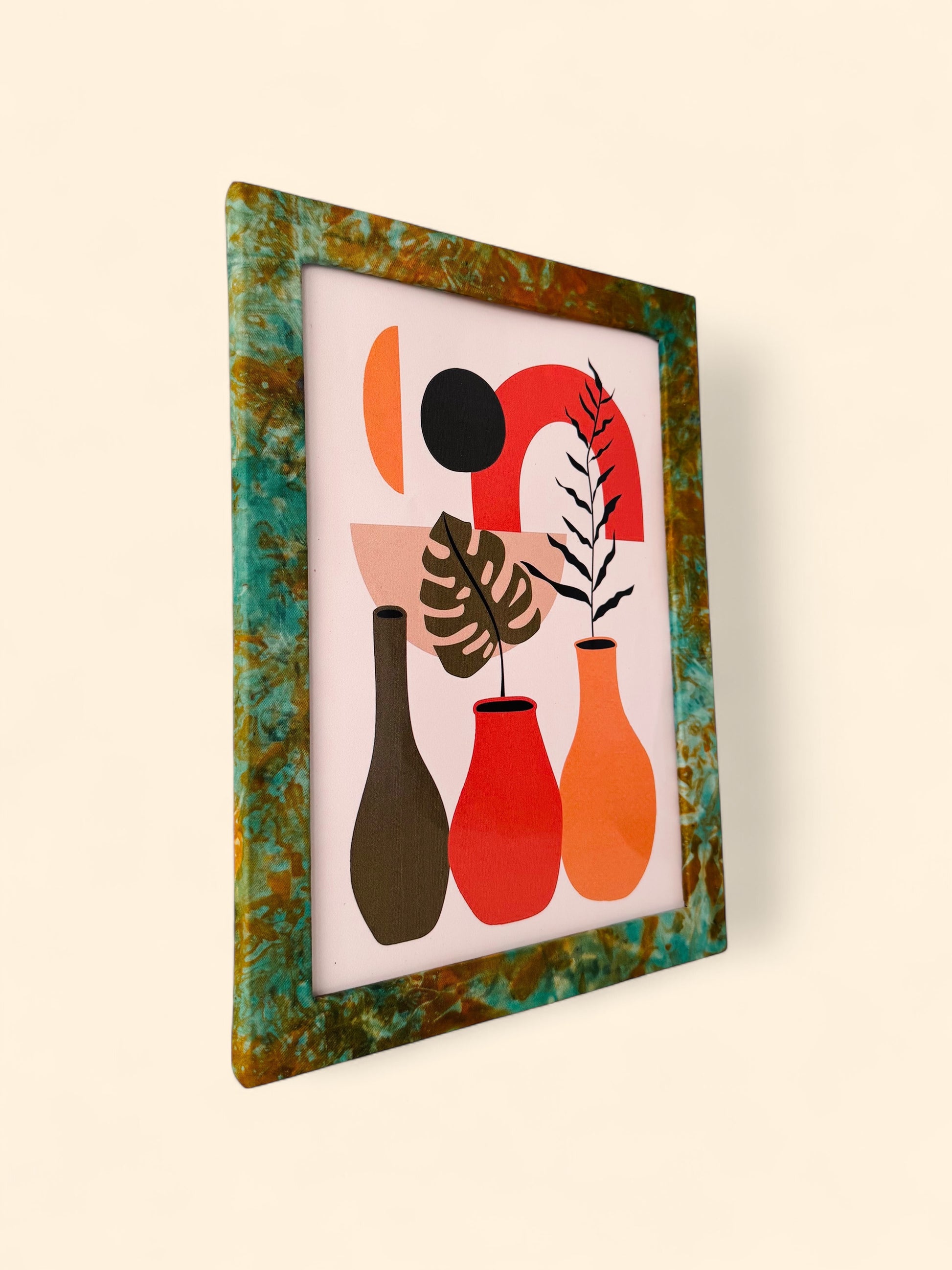 This elegant A4 picture frame, crafted in Ghana, features a distinctive tie and dye design in petrol orange and brown hues. Its unique pattern complements the beautifully arranged vases with tropical plants and abstract art, making it a refined choice to showcase your favorite photo or artwork. Perfect for adding a touch of cultured warmth and style to any space.