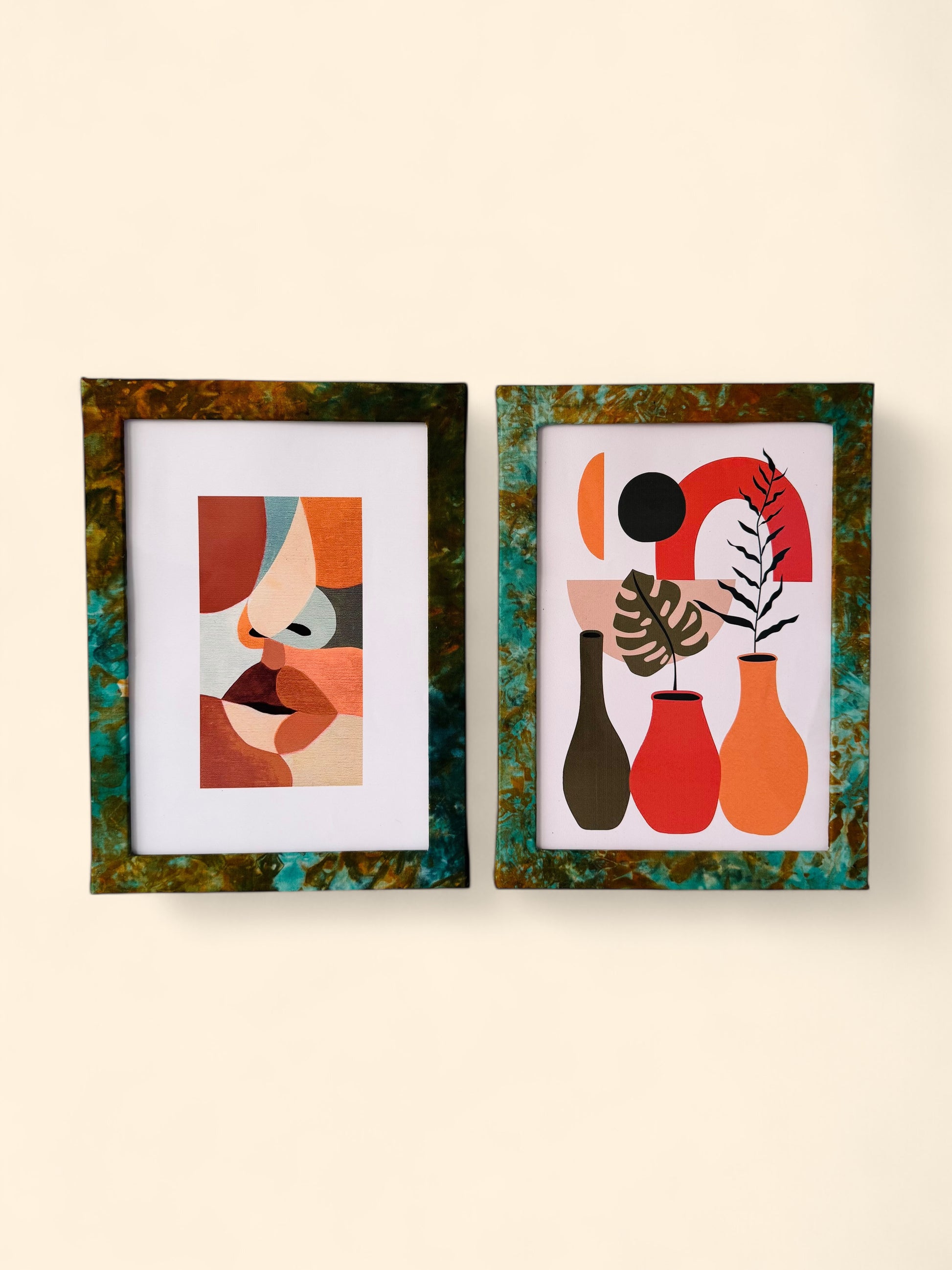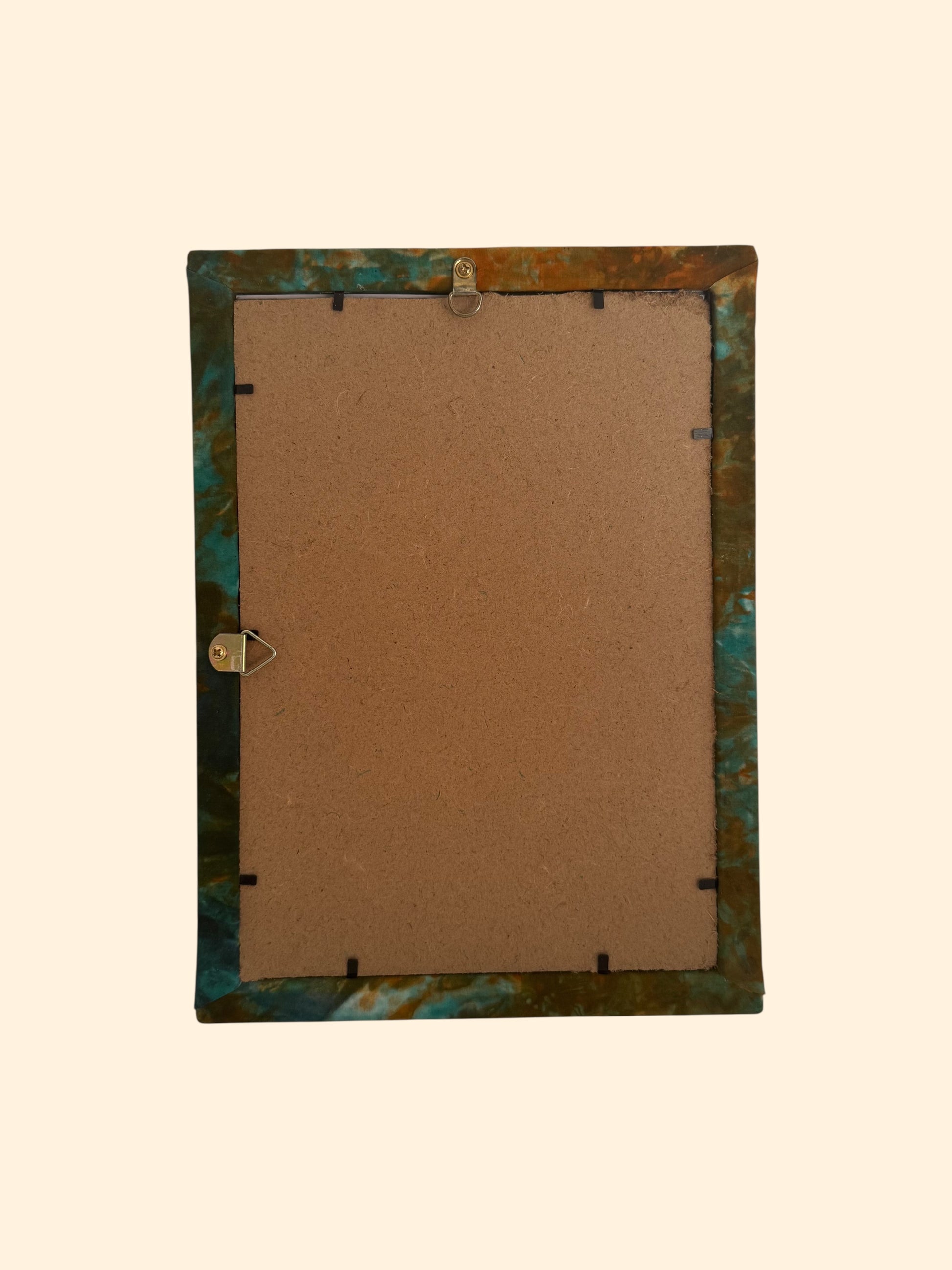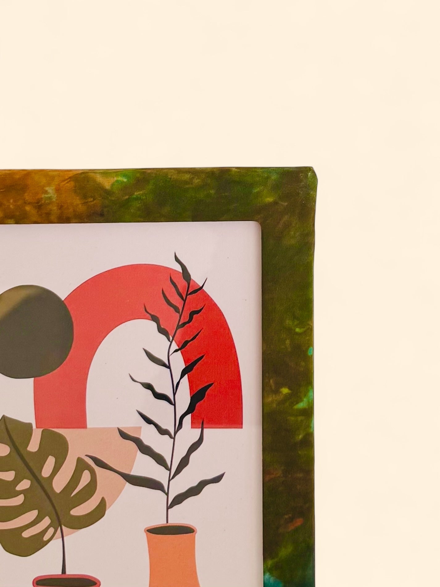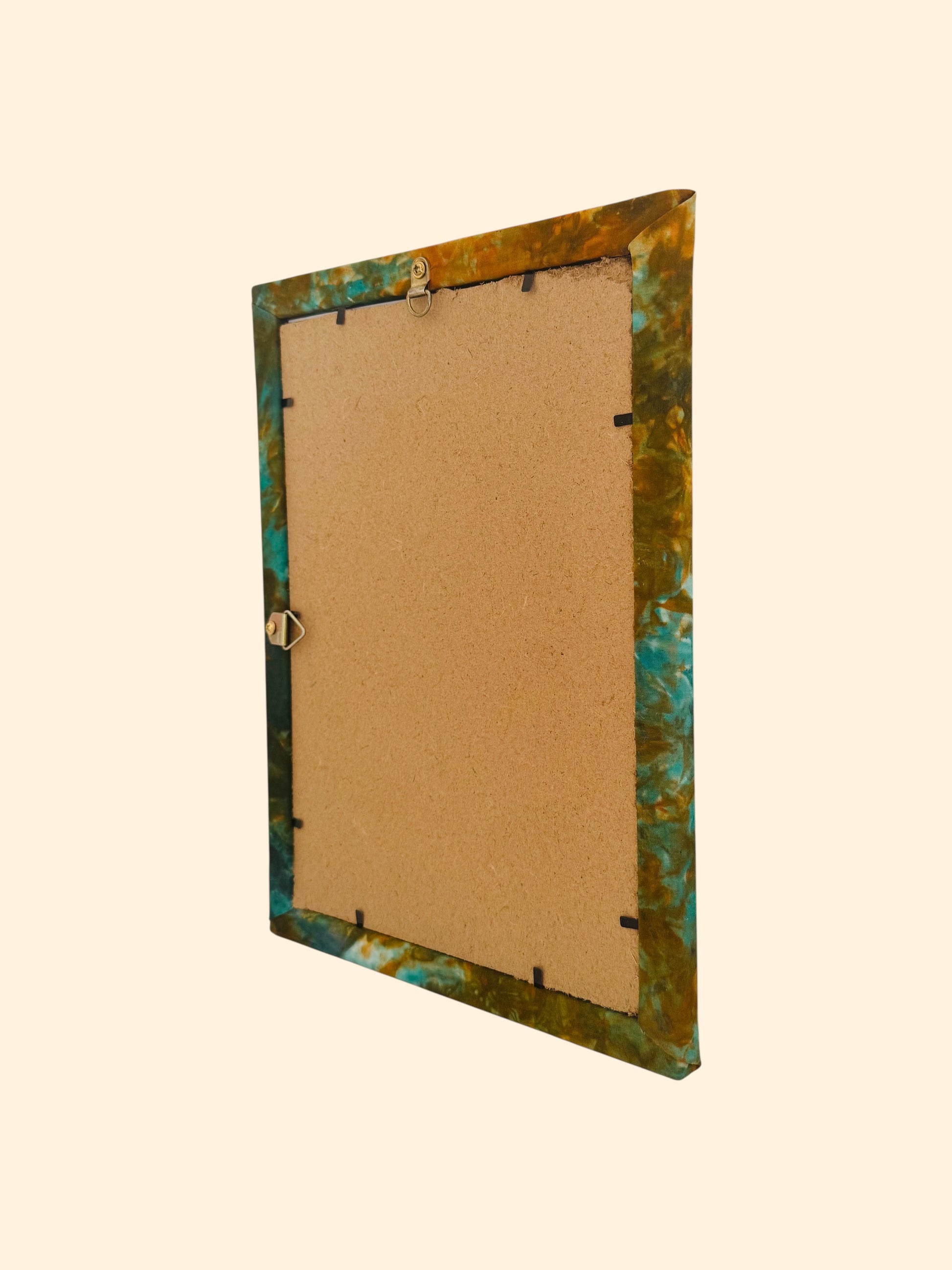 This elegant A4 picture frame, crafted in Ghana, features a distinctive tie and dye design in petrol orange and brown hues. Its unique pattern complements the beautifully arranged vases with tropical plants and abstract art, making it a refined choice to showcase your favorite photo or artwork. Perfect for adding a touch of cultured warmth and style to any space.