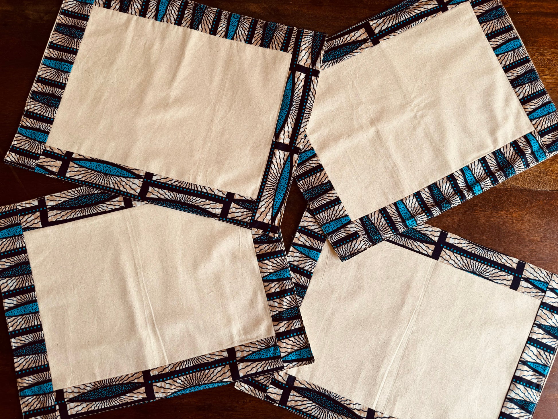 Our placemat "Sunlit Tide" brings a wave of easy-going elegance to your dining space. The design features a beautiful African Print fabric with a pattern that evokes the warmth of sunlight touching the ocean’s surface. The inner part is made from a soft creme cotton fabric, creating a serene and balanced composition overall. This placemat is the perfect fusion of beachside flair and understated elegance, ideal for adding style to any meal, whether it’s a special gathering or a casual dinner. Let it bring a soothing, sun-kissed feel to your table setting.