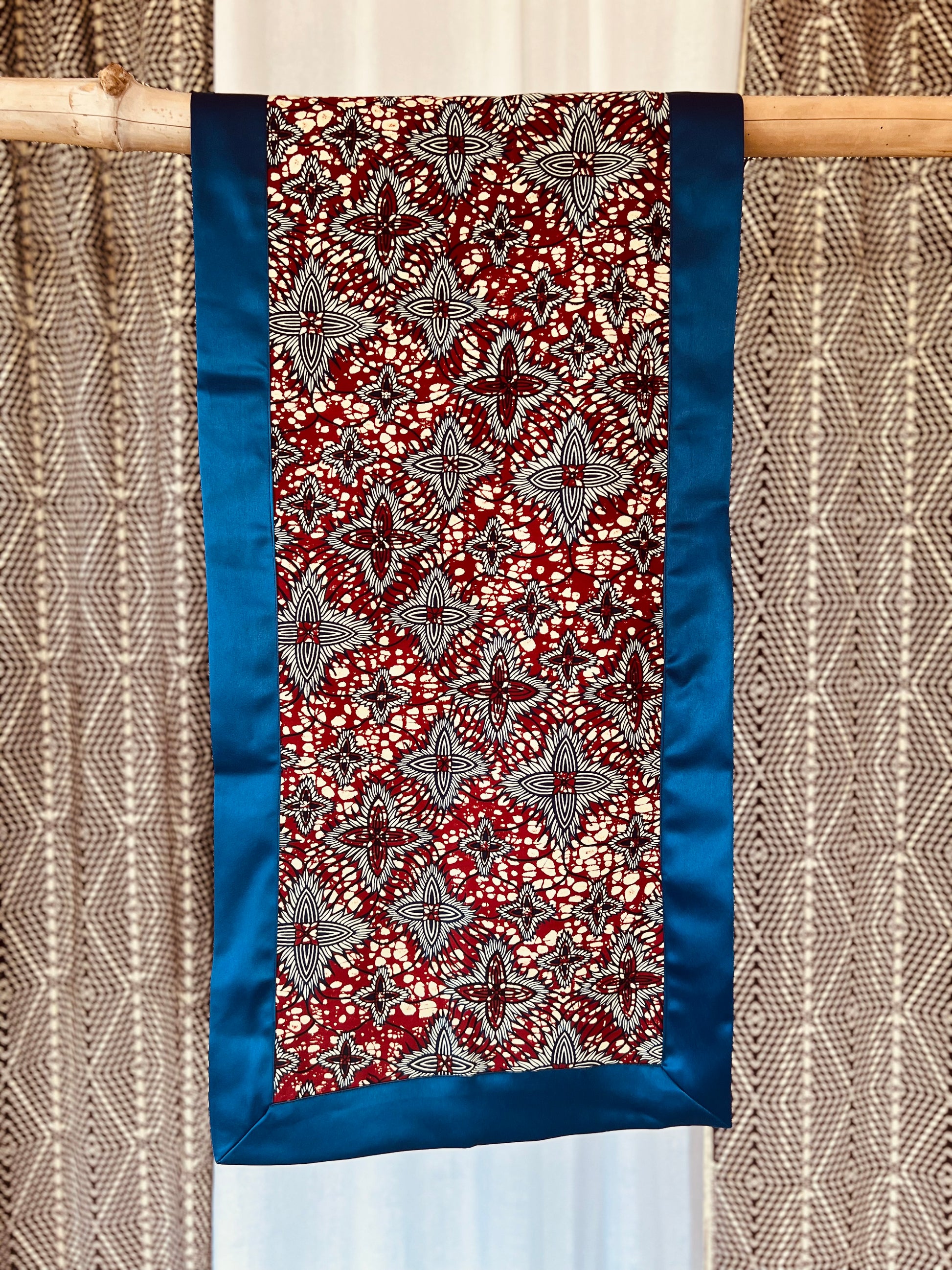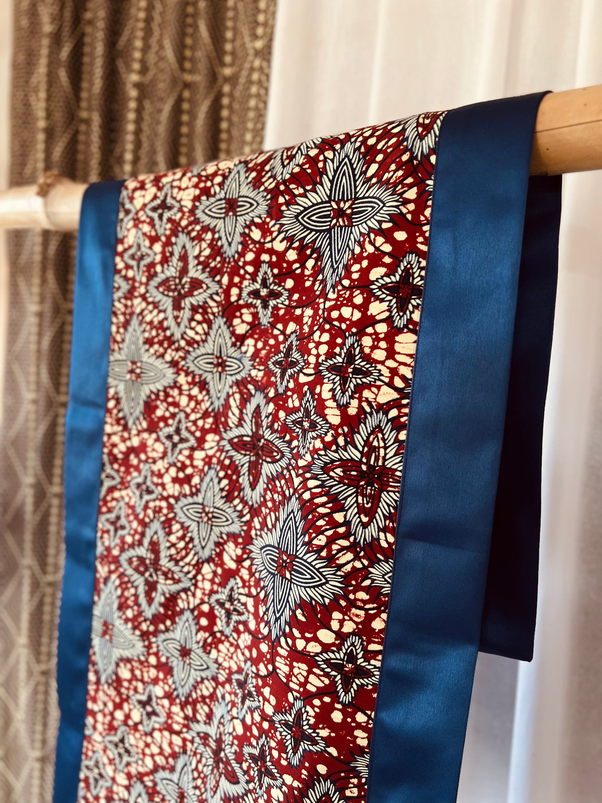 Elevate your table setting with the timeless beauty of our "Morning Star" table runner. Featuring an elegant midnight blue and maroon, brown design with a neutral creme undertone - reminiscent of the morning star in the night sky - this design evokes a sense of calm sophistication. The royal blue satin band adds perfectly to the shine of the design. If for classy breakfast gatherings with the family, cozy dinners with friends, or as an addition to a festive occasion – it’s your table’s new shining star.