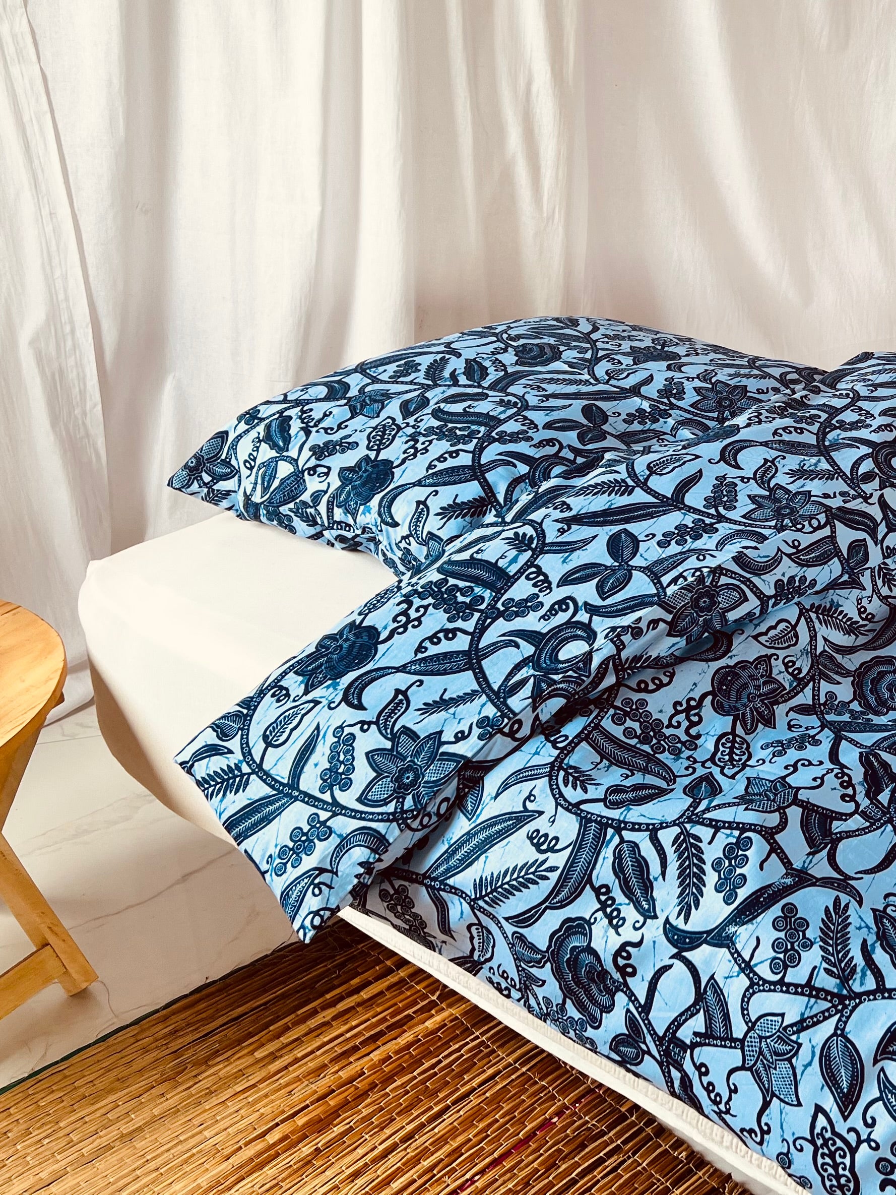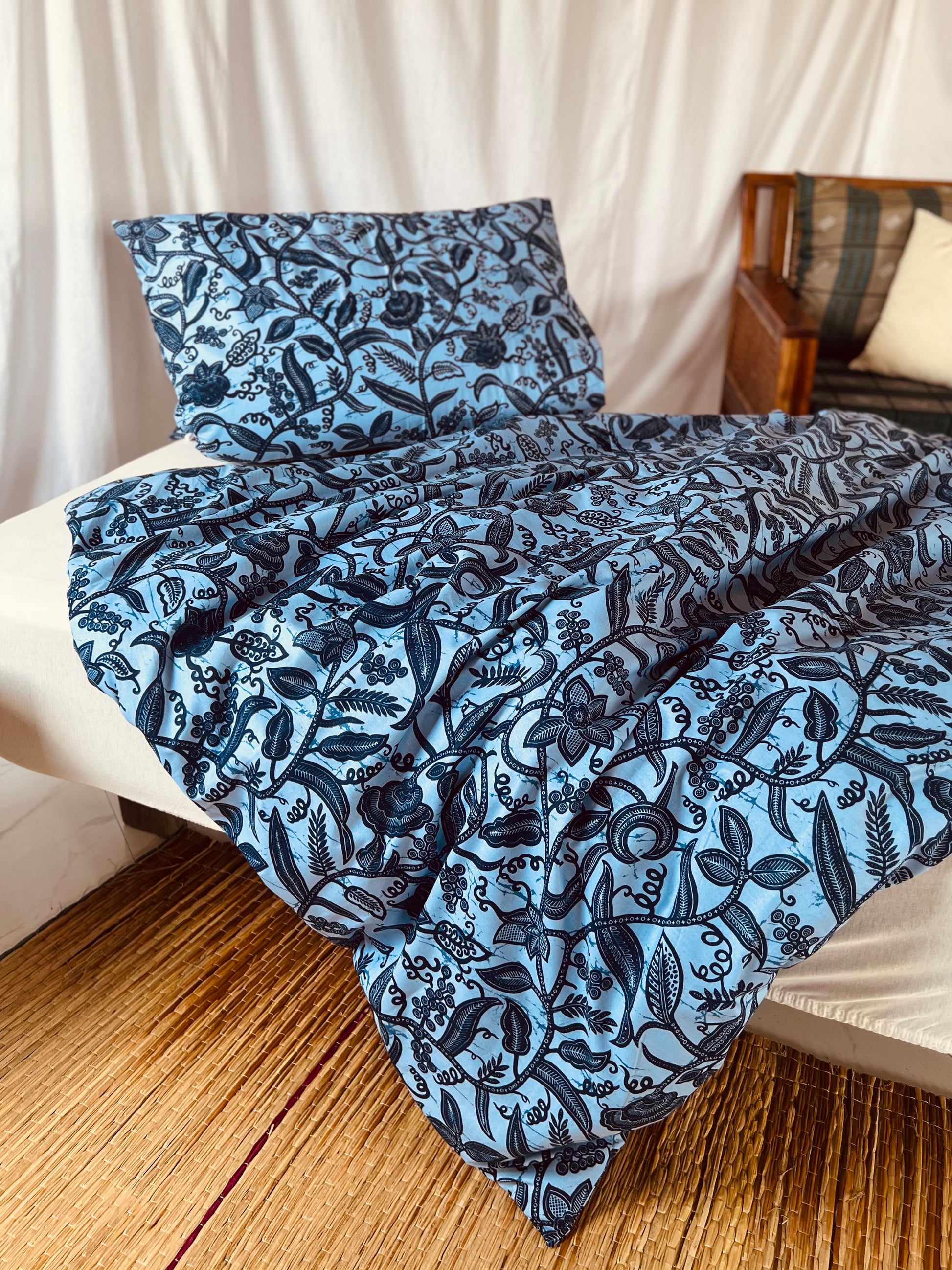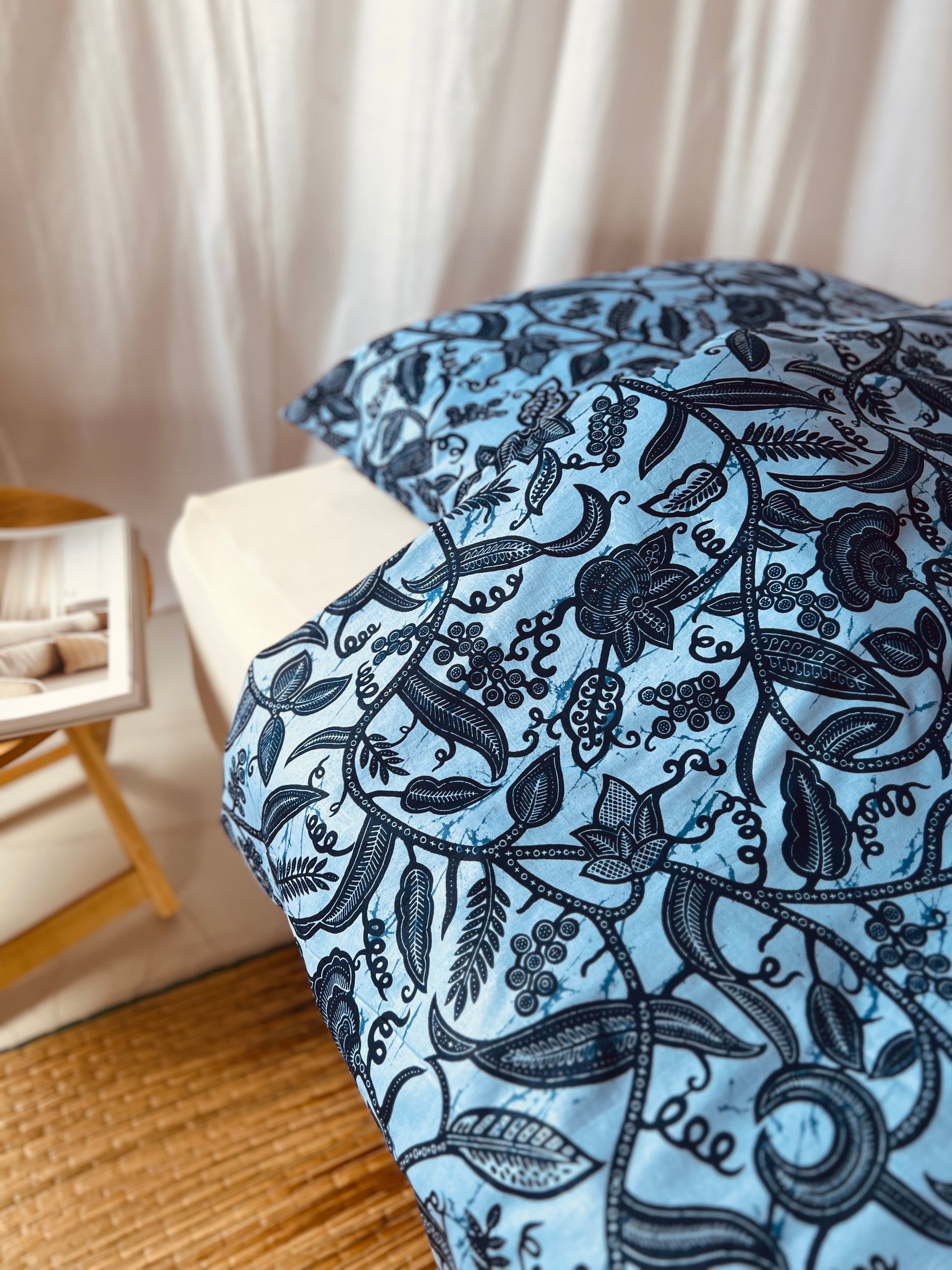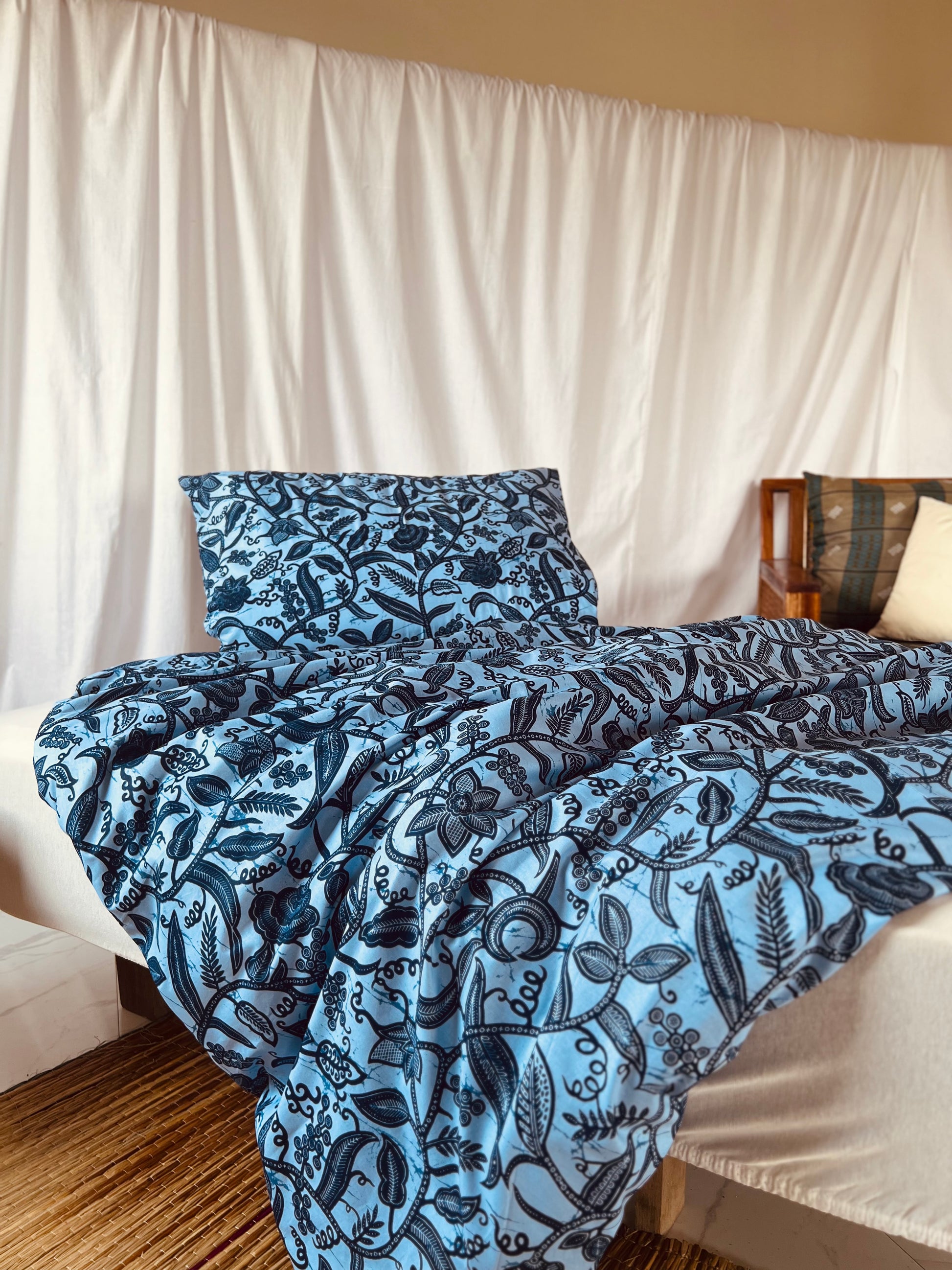 Bring a touch of African elegance to your bedroom with our "Rise and Shine" bedset. The design features a stunning interwoven plant pattern in vibrant blues, with soft and deep blue tones that create a harmonious and calming atmosphere. The intricate floral motifs add a natural element to your space while providing a modern yet culturally inspired aesthetic.