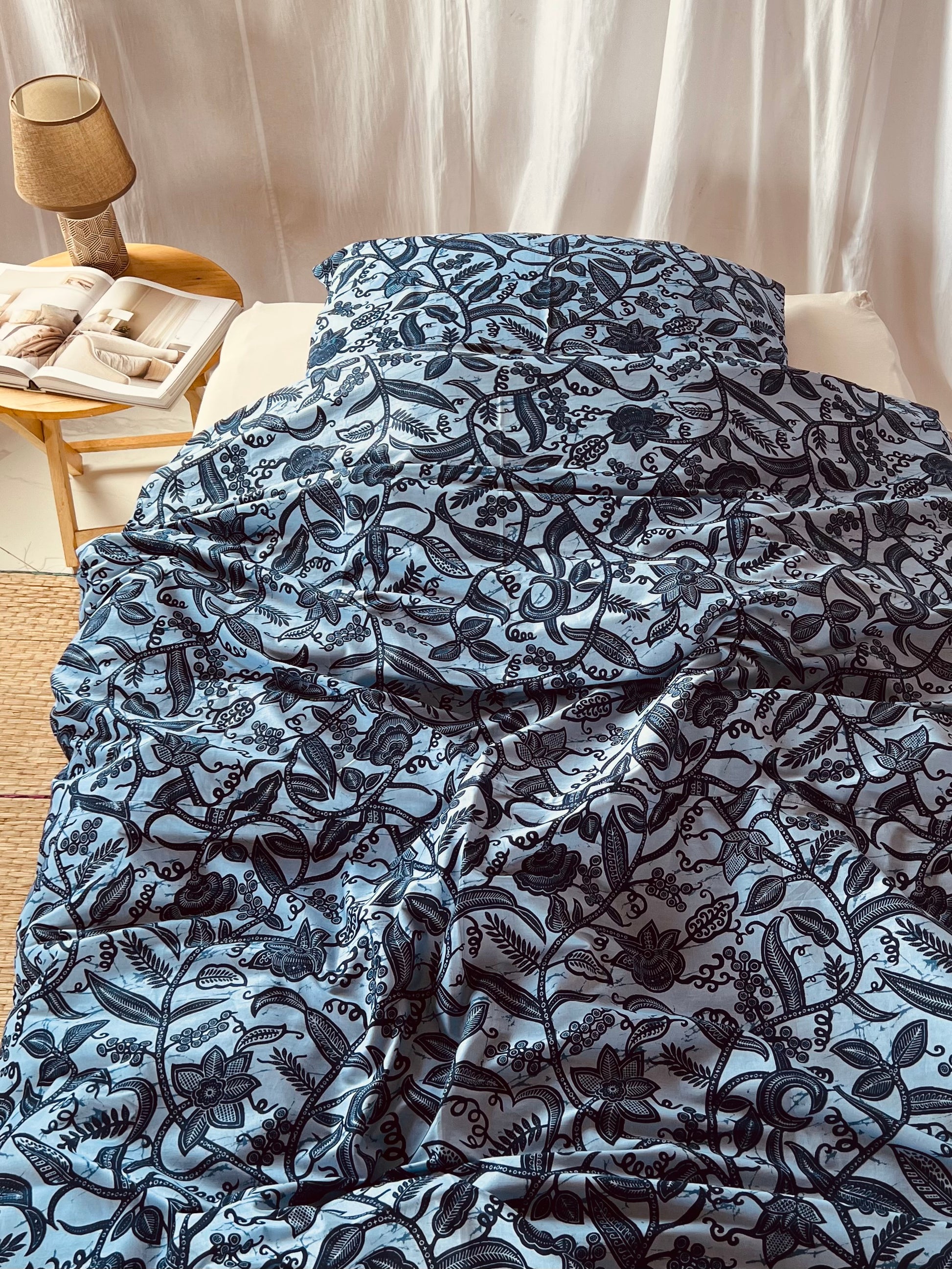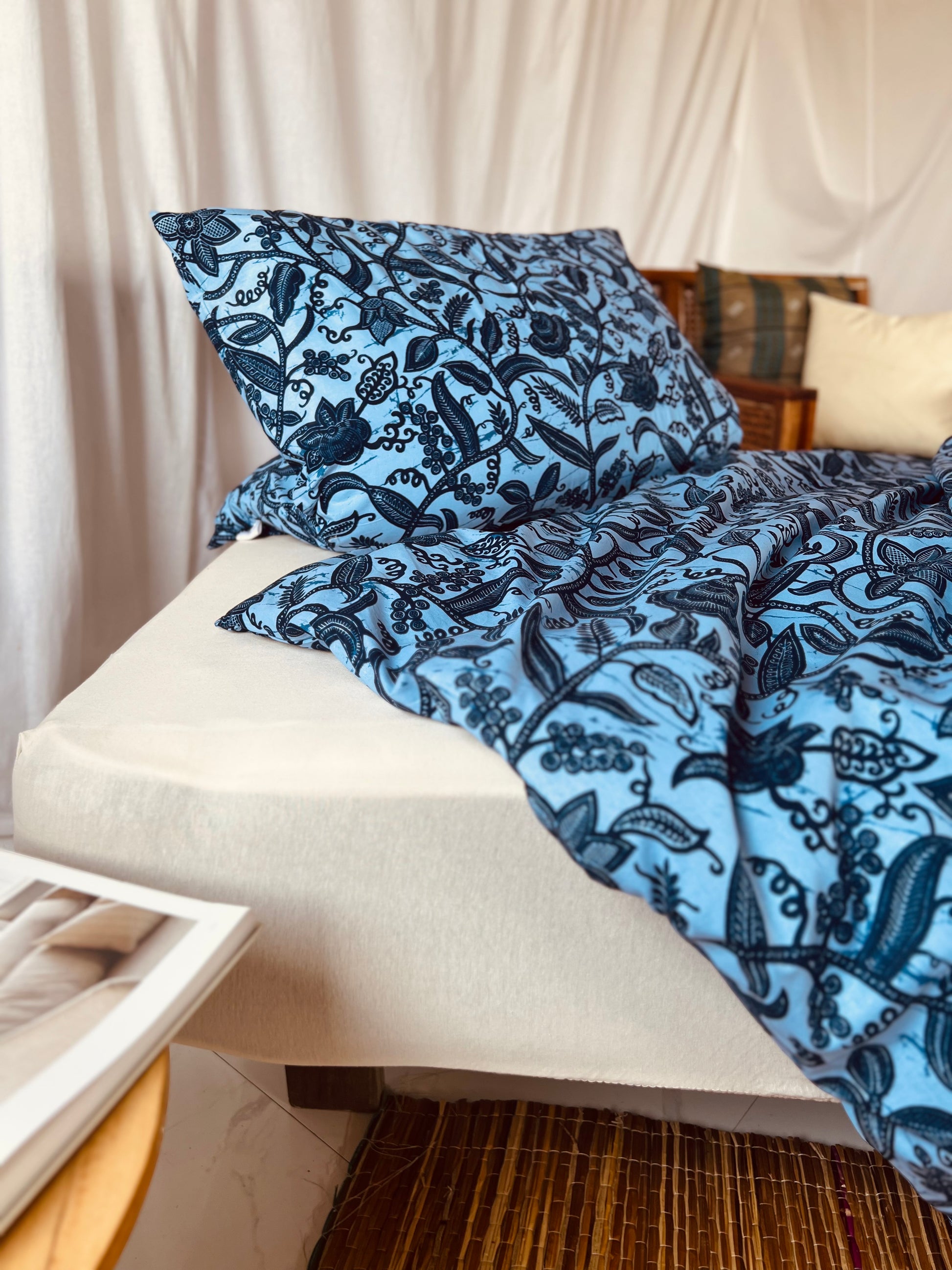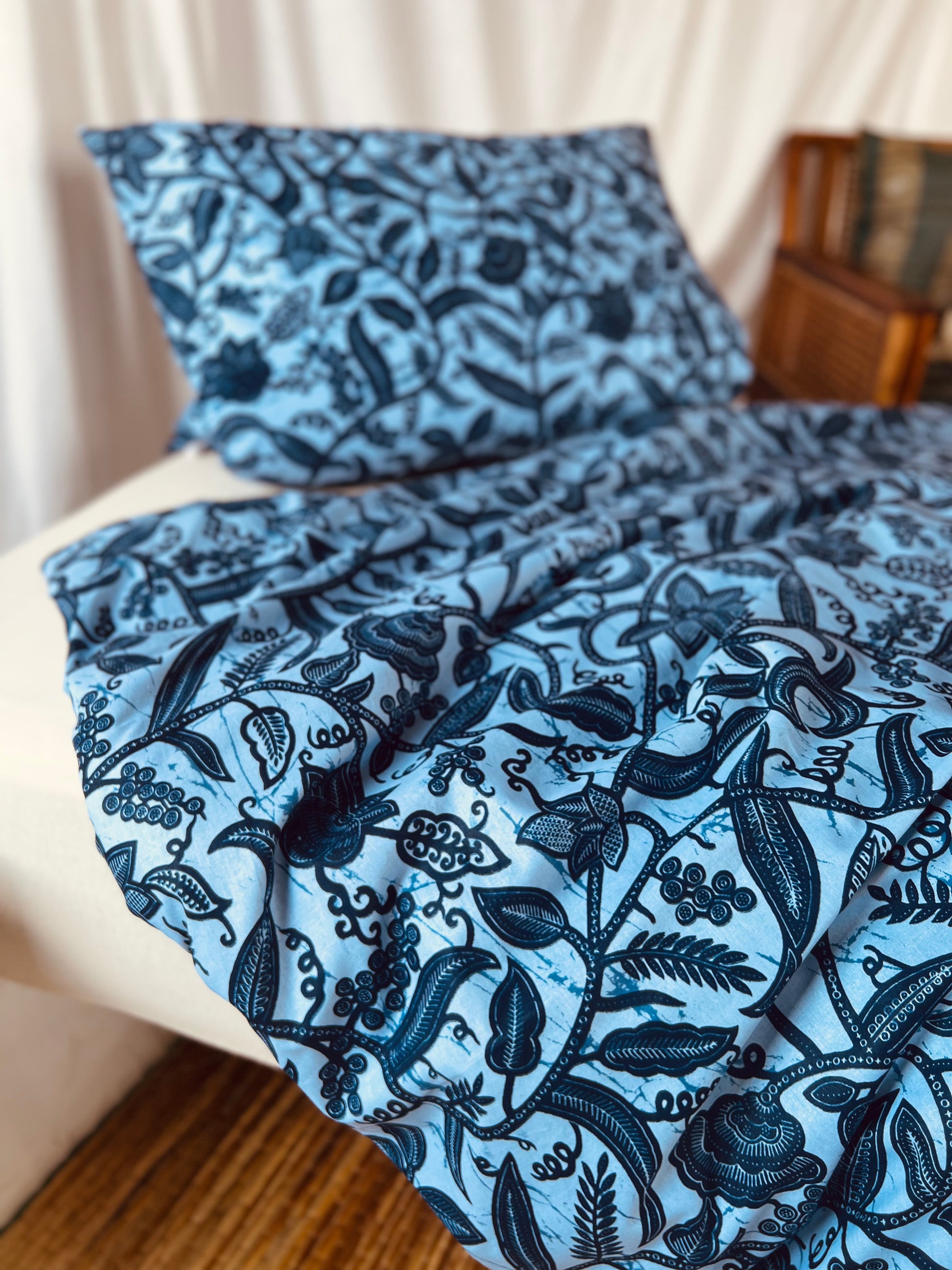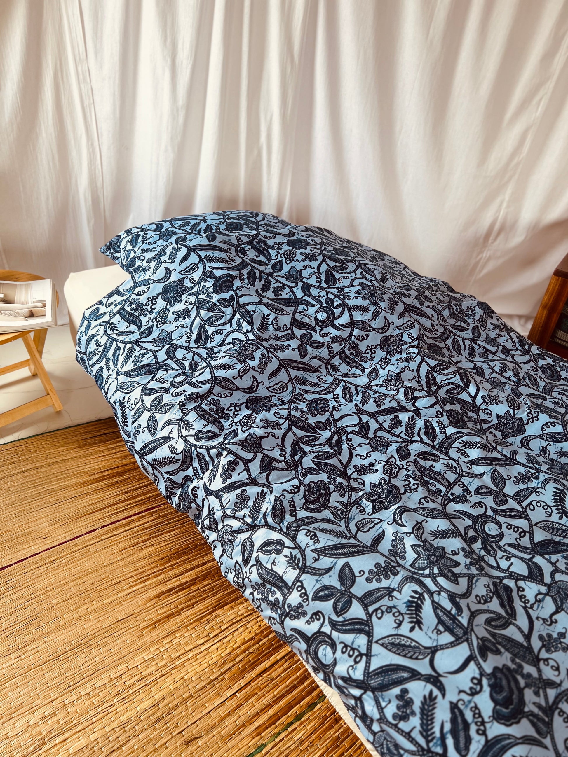 Bring a touch of African elegance to your bedroom with our "Rise and Shine" bedset. The design features a stunning interwoven plant pattern in vibrant blues, with soft and deep blue tones that create a harmonious and calming atmosphere. The intricate floral motifs add a natural element to your space while providing a modern yet culturally inspired aesthetic.