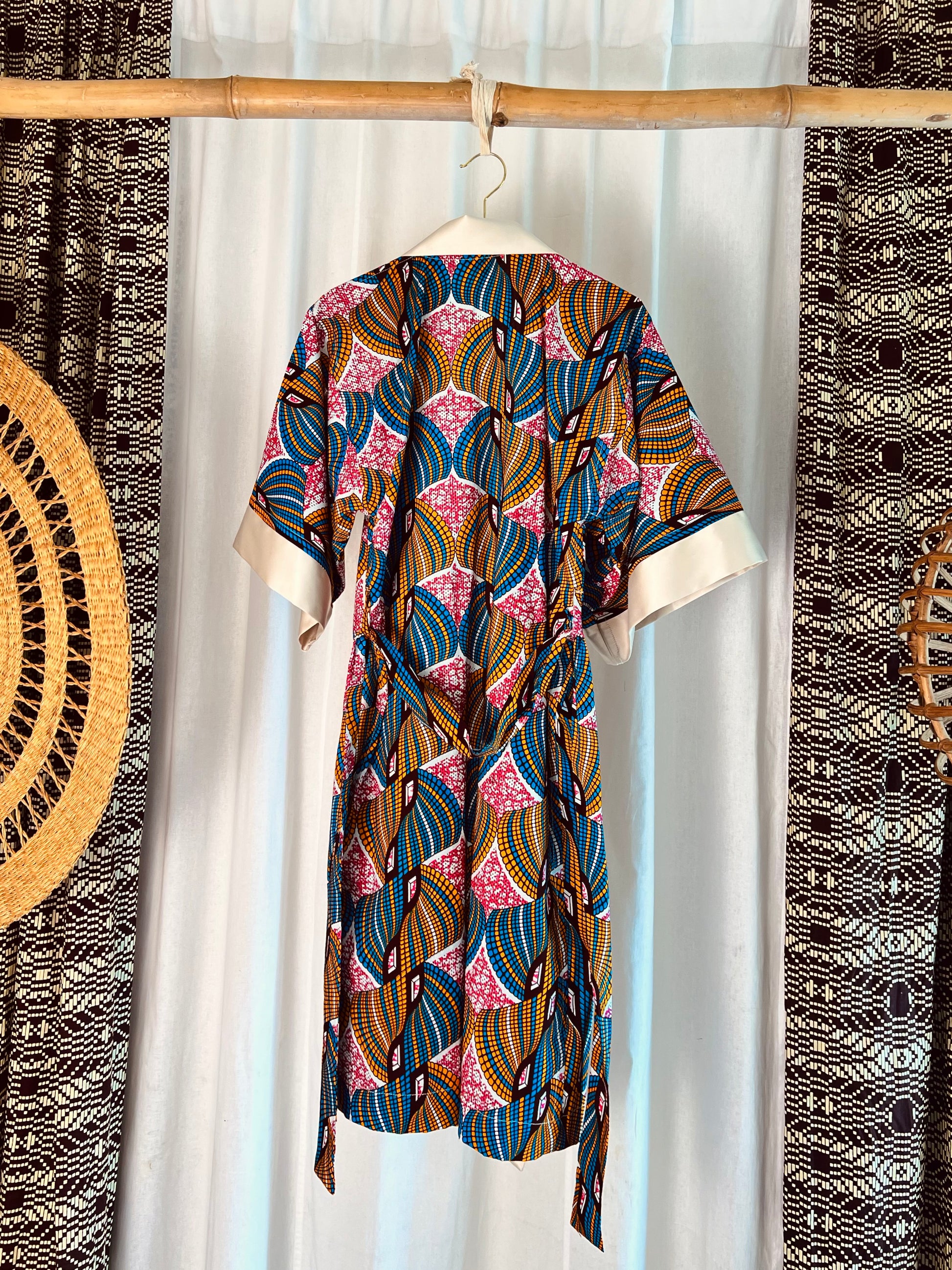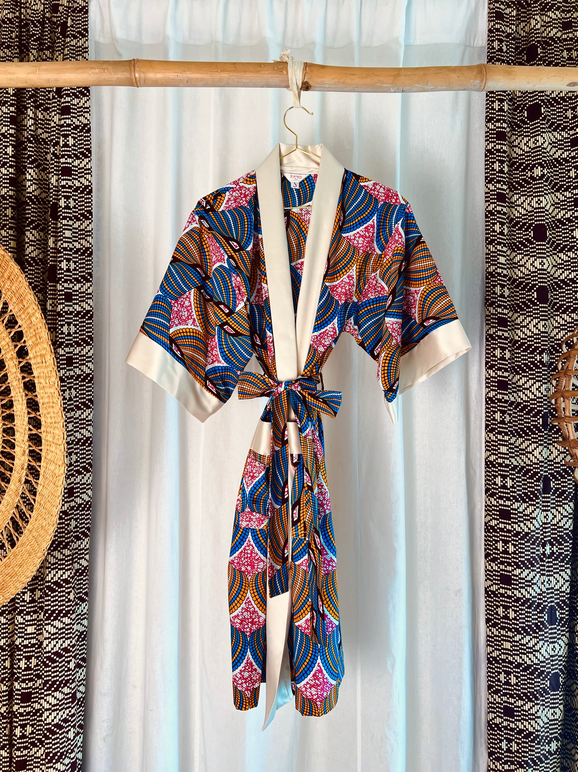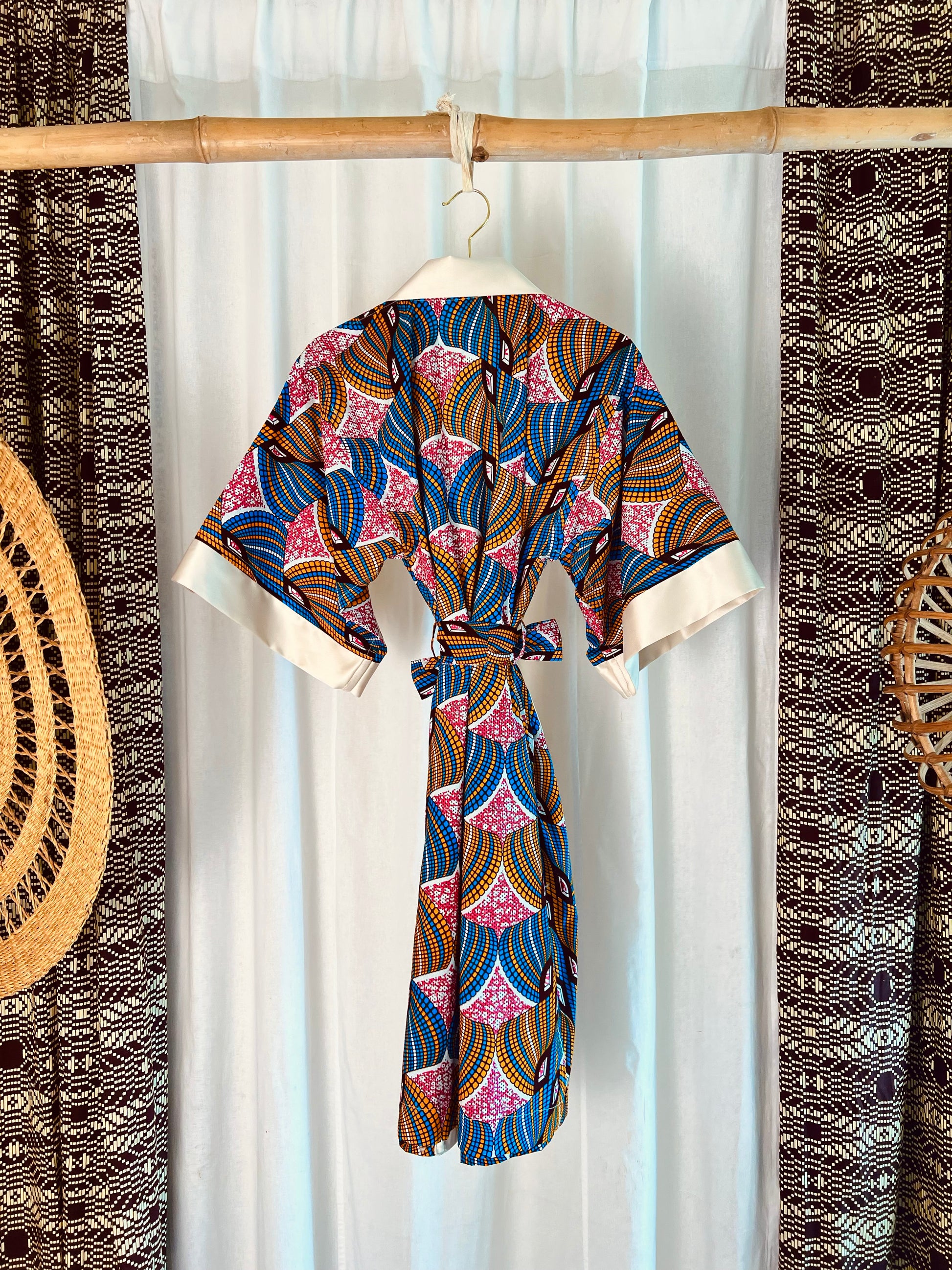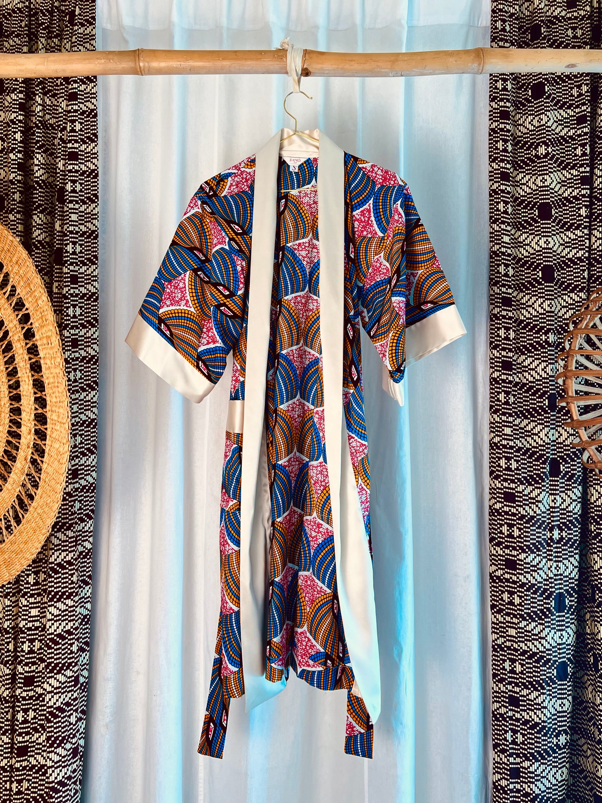 Celebrate your individuality with the Afrikimo "Flair" with Creme Satin. Crafted from authentic GTP African print in vibrant pink and blue tones, this exclusive piece featured on Miss Malaika blends rich Ghanaian heritage with refined elegance. More than just a robe, it empowers you to embrace your natural beauty and express your unique style with confidence and pride.
