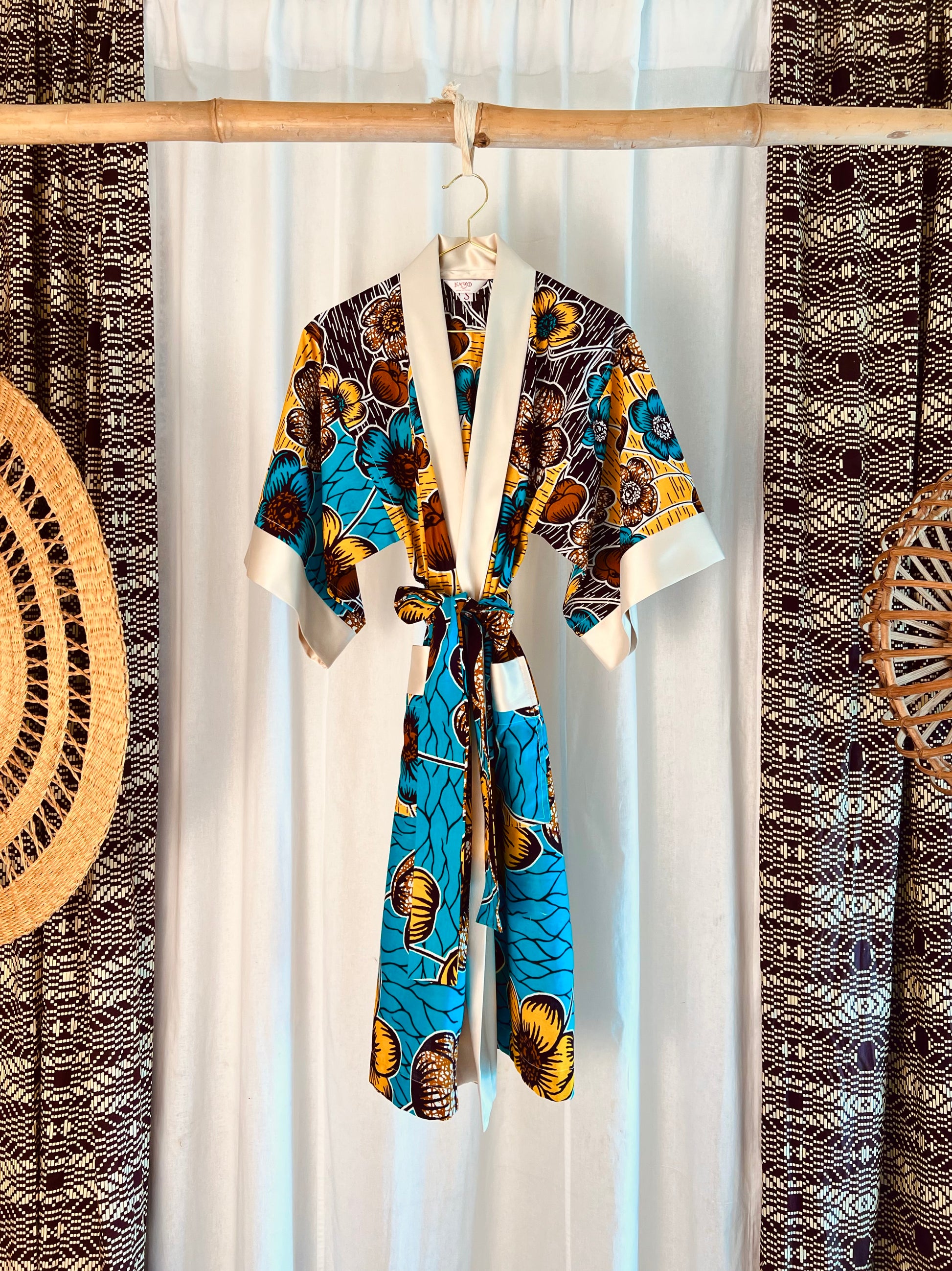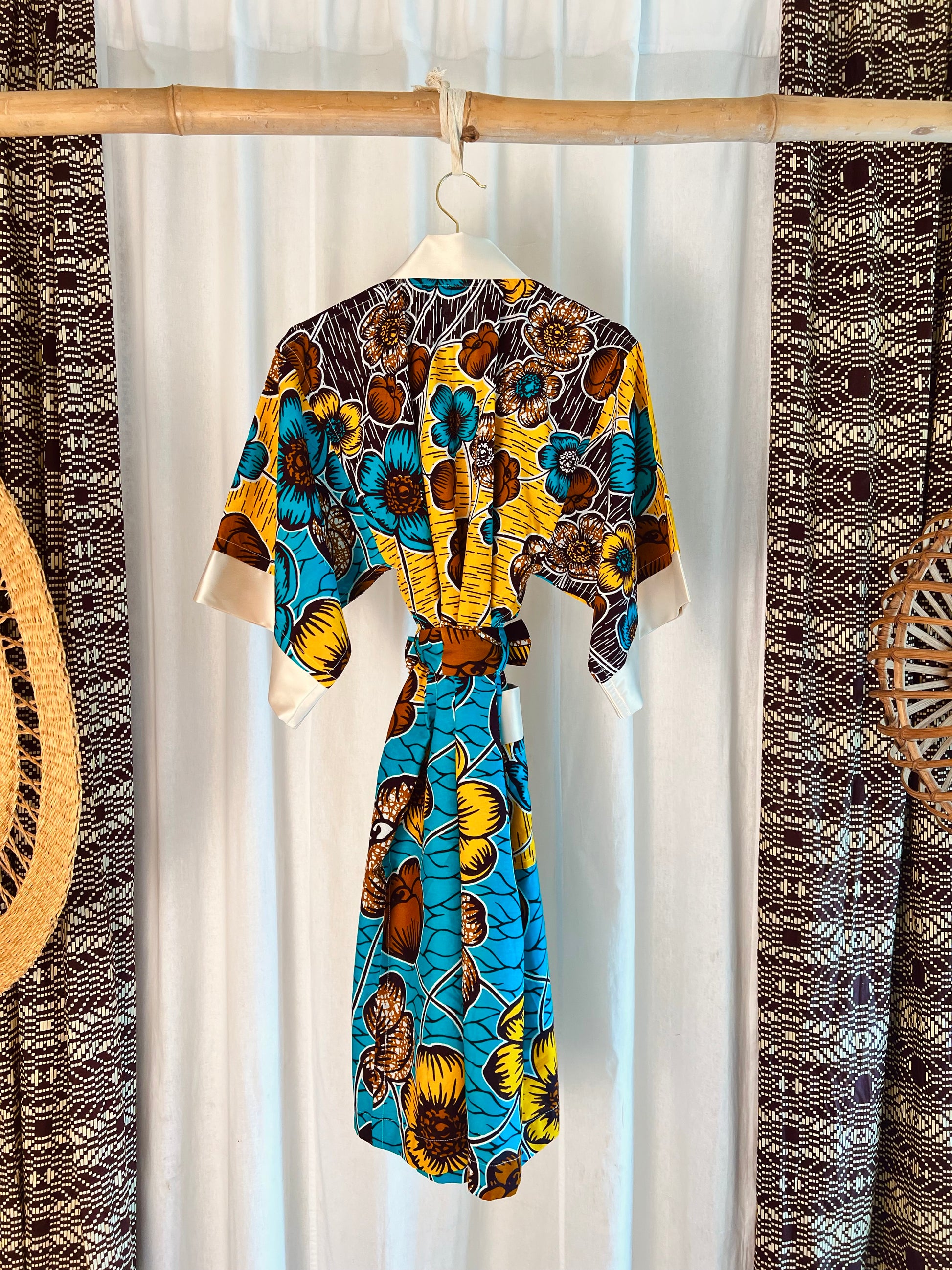 Celebrate your uniqueness with the Afrikimo "Buttercup" robe with creme or brown satin. Made from genuine GTP African print in vibrant mango yellow, accented with light petrol and brown hues, this garment beautifully merges Ghanaian tradition with sophisticated style. Designed to inspire confidence, it allows you to showcase your natural beauty and express your individuality with pride and grace.