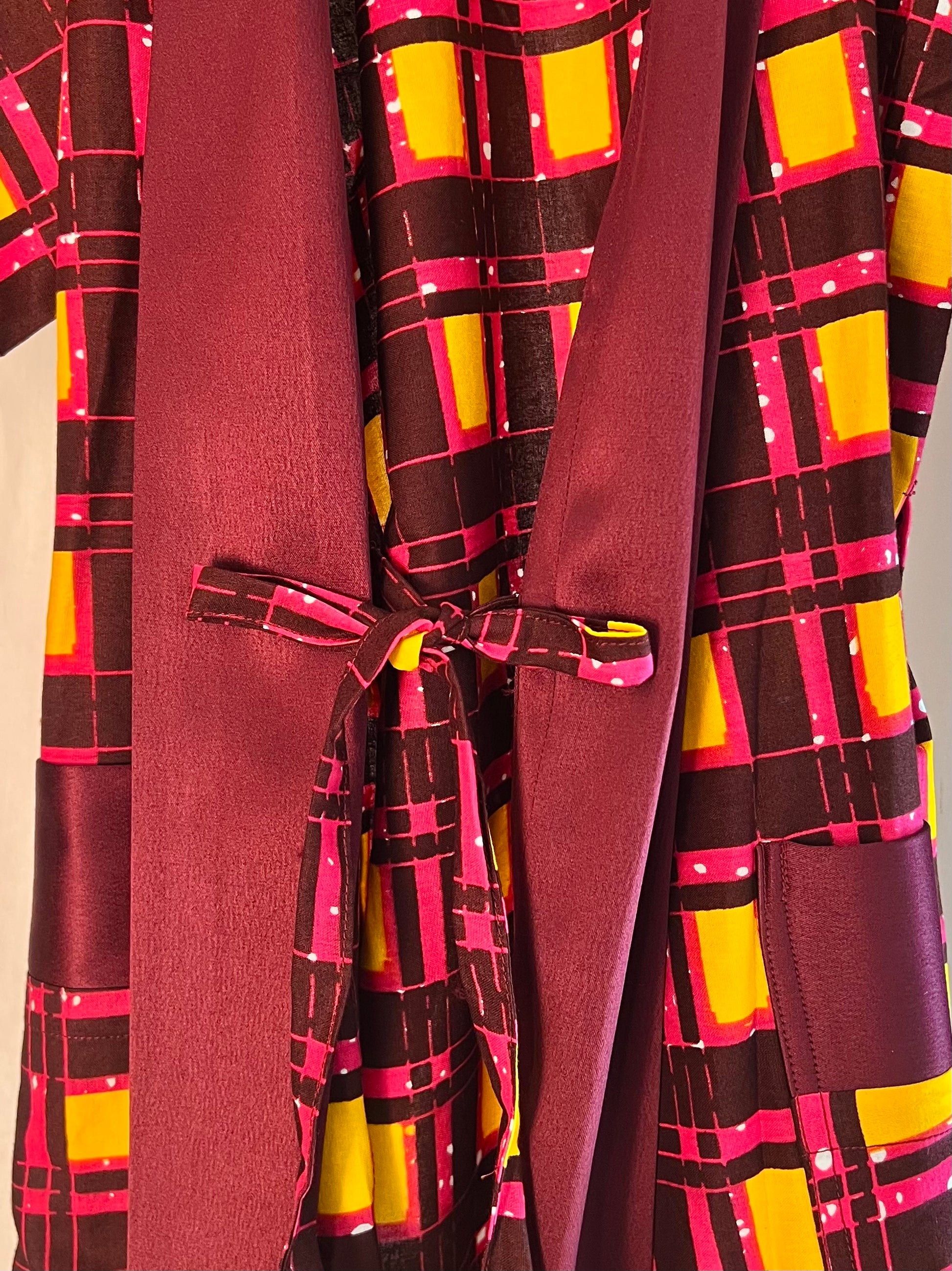 Celebrate your unique style with the Afrikimo "Brilliance" robe with plum or deep pink satin as featured on Miss Malaika. Made from authentic GTP African print in vibrant pink and yellow, this exclusive design showcases rich Ghanaian heritage with elegant crafts(wo)manship. More than a robe, it inspires confidence and pride, allowing you to express your natural beauty with grace and distinction. Perfect for those who want to stand out and embrace their individuality every day.