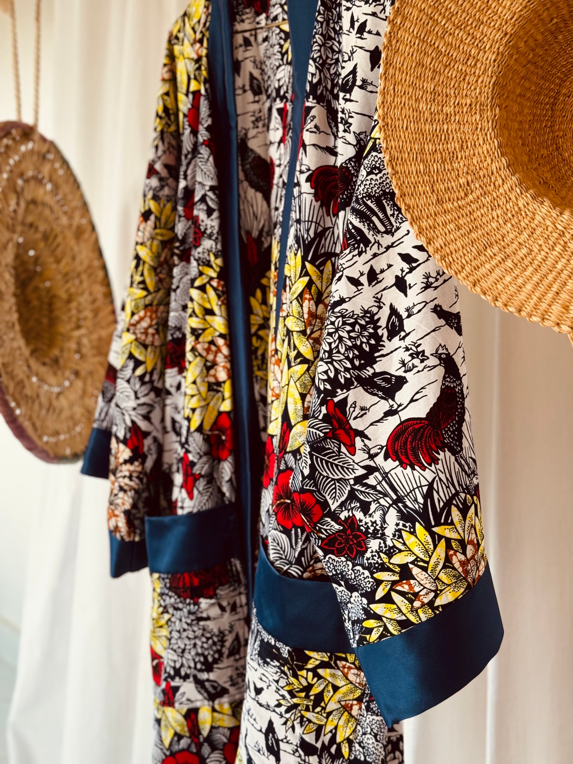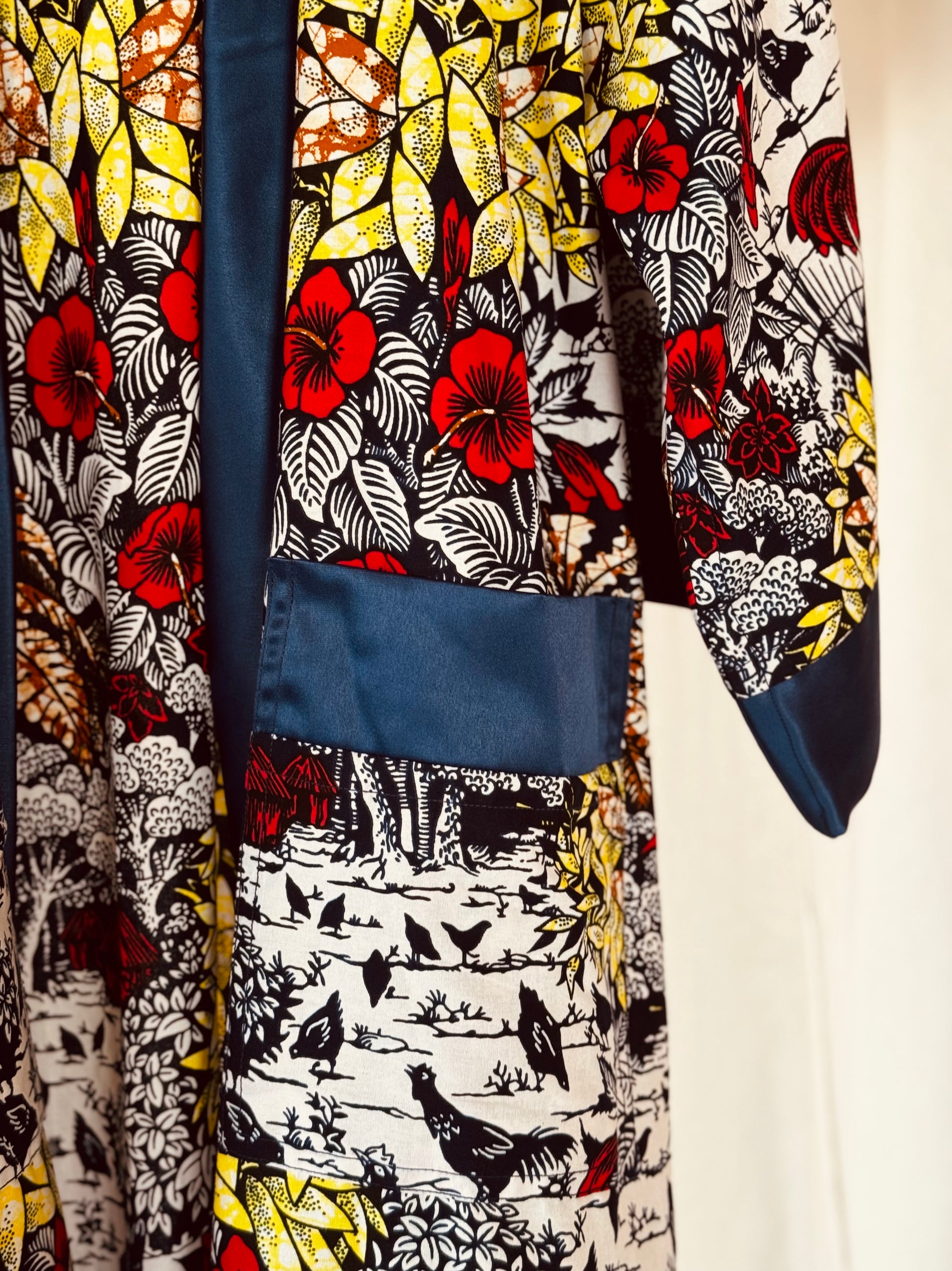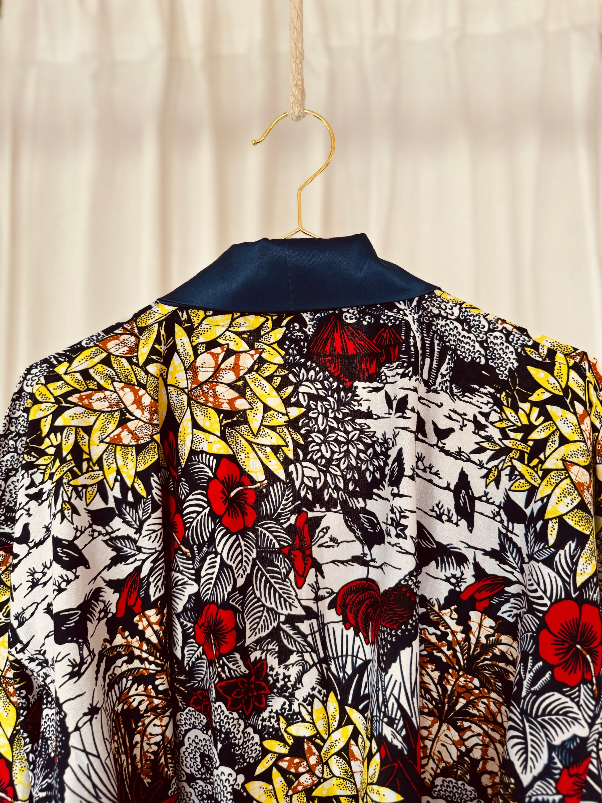 Infuse your wardrobe with artful elegance with the Afrikimo "Mon Petit Village". Crafted from vibrant African Print fabric sourced from Lomé, Togo, this piece beautifully blends rich hues of red, yellow, and brown, reflecting the serene beauty of village life. This African Print in particular is truly a work of art. Sophisticated blue satin details provide a striking contrast, adding a touch of refinement to the design.