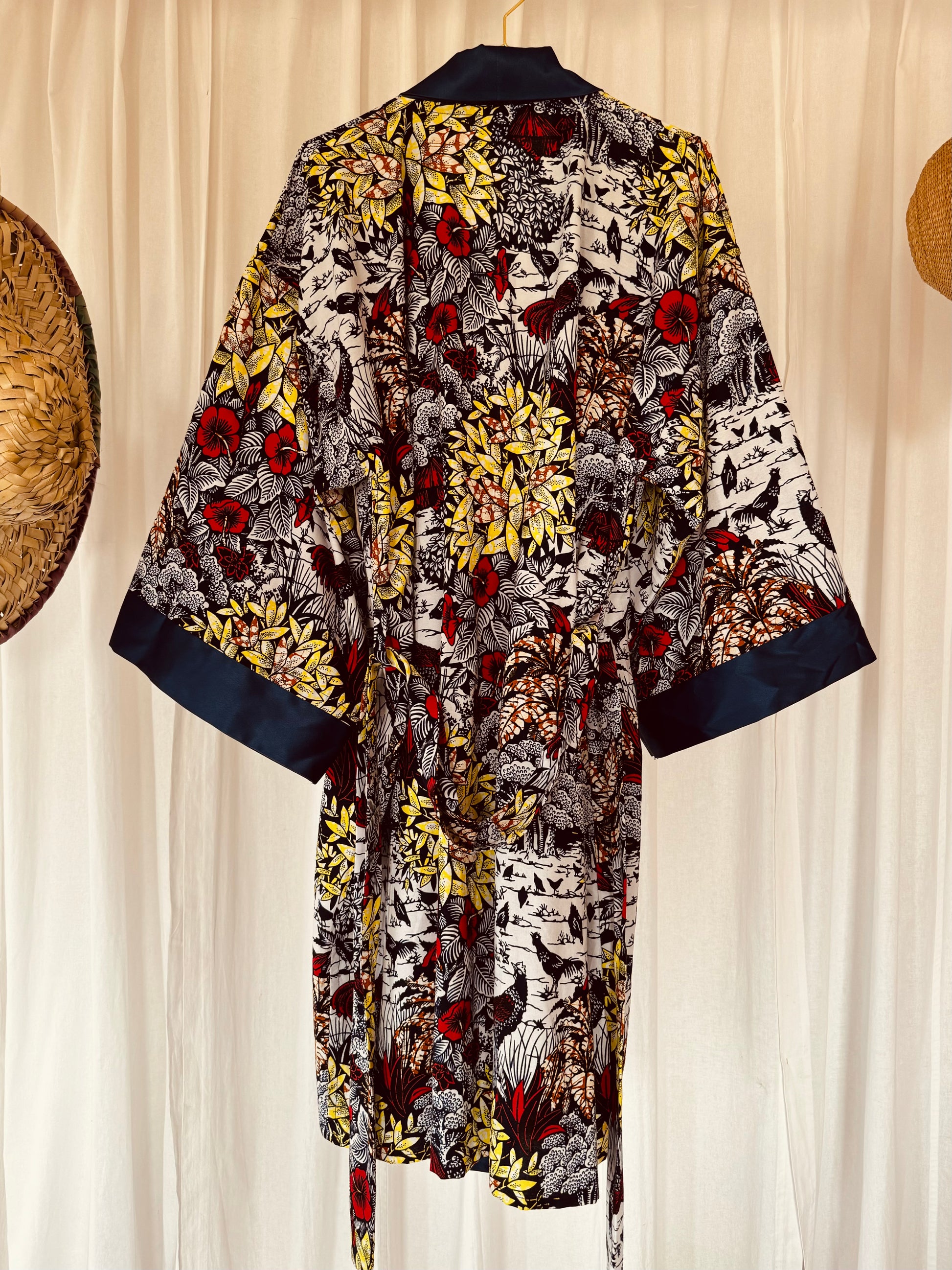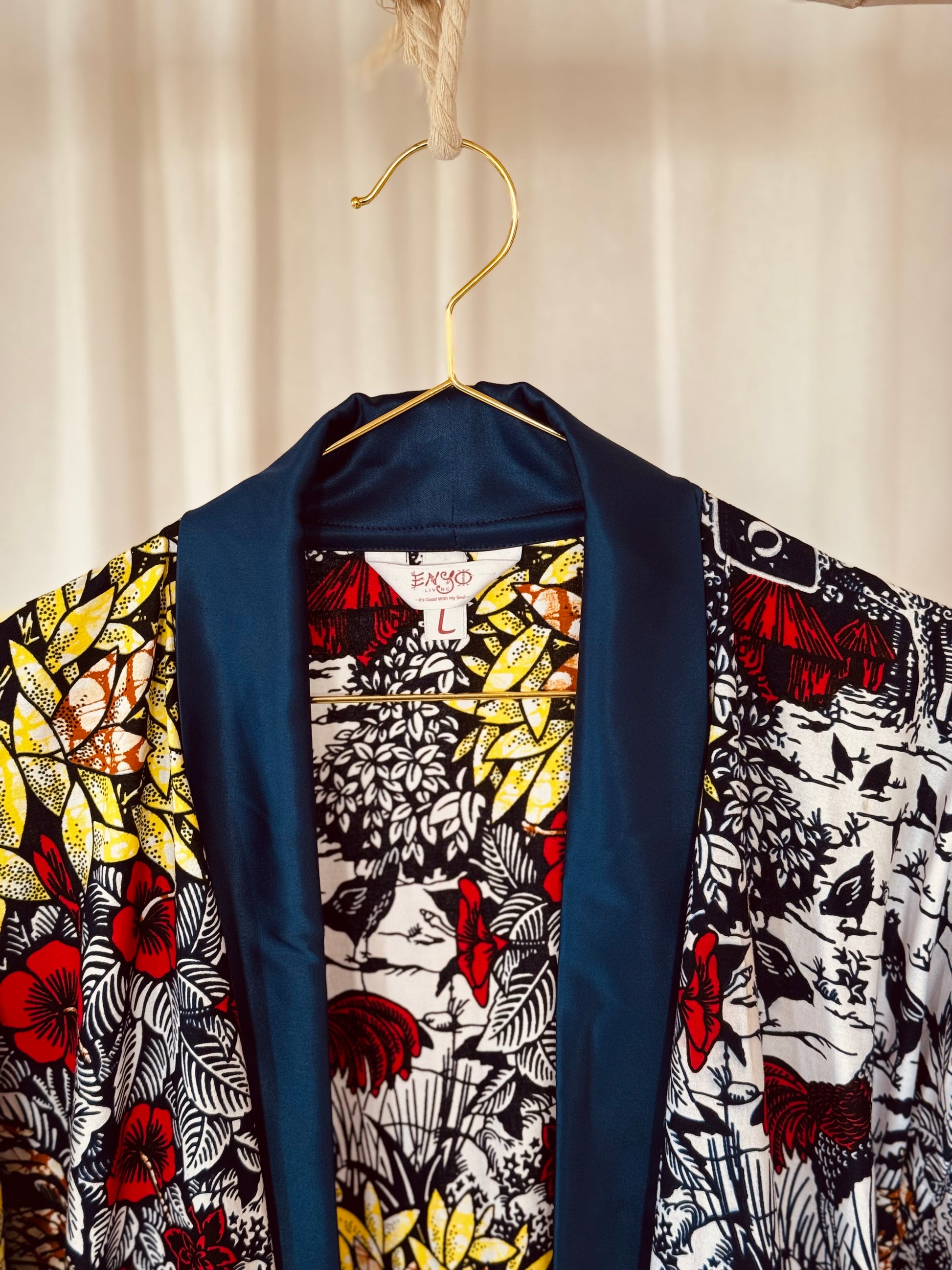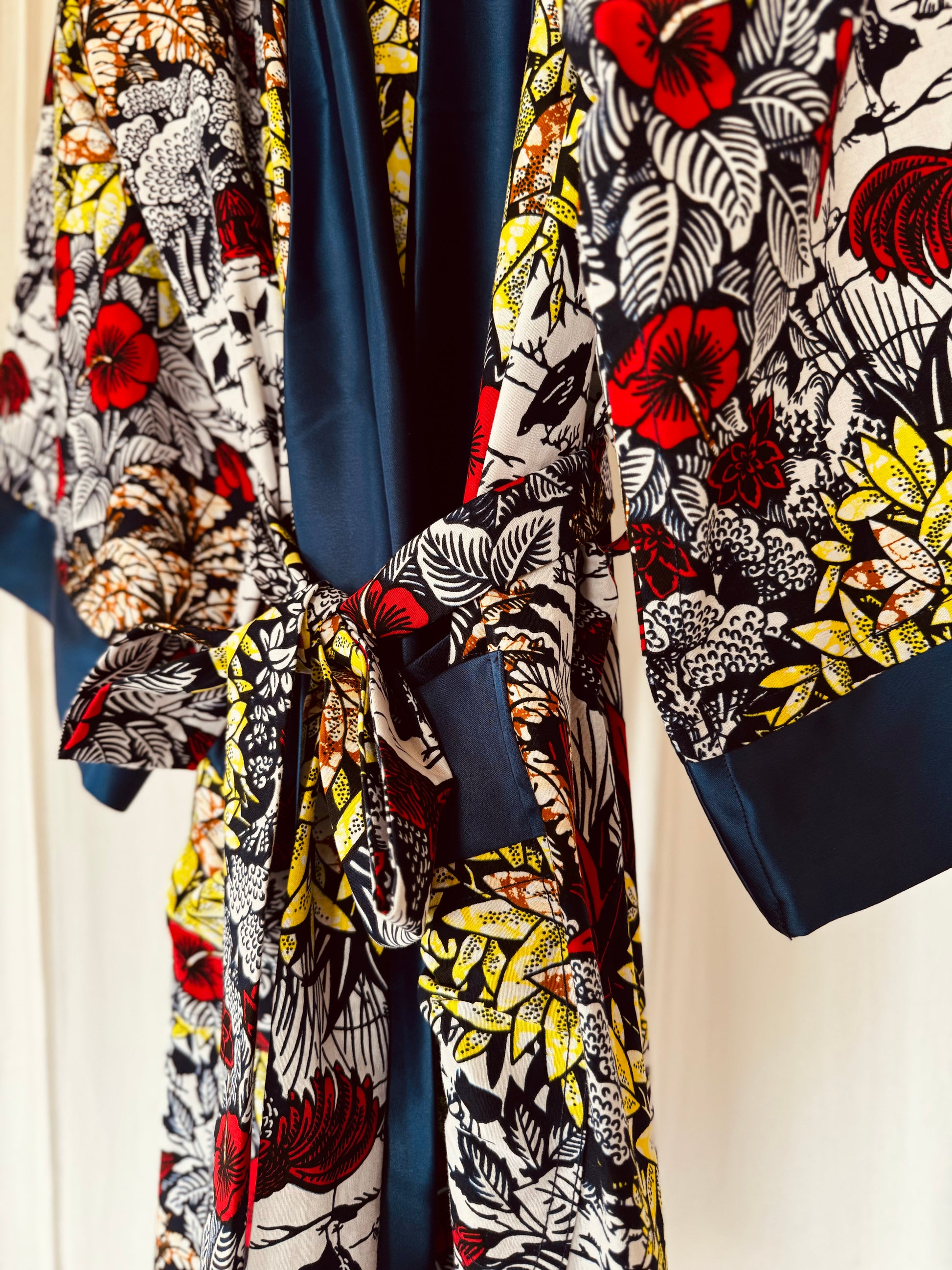 Infuse your wardrobe with artful elegance with the Afrikimo "Mon Petit Village". Crafted from vibrant African Print fabric sourced from Lomé, Togo, this piece beautifully blends rich hues of red, yellow, and brown, reflecting the serene beauty of village life. This African Print in particular is truly a work of art. Sophisticated blue satin details provide a striking contrast, adding a touch of refinement to the design.