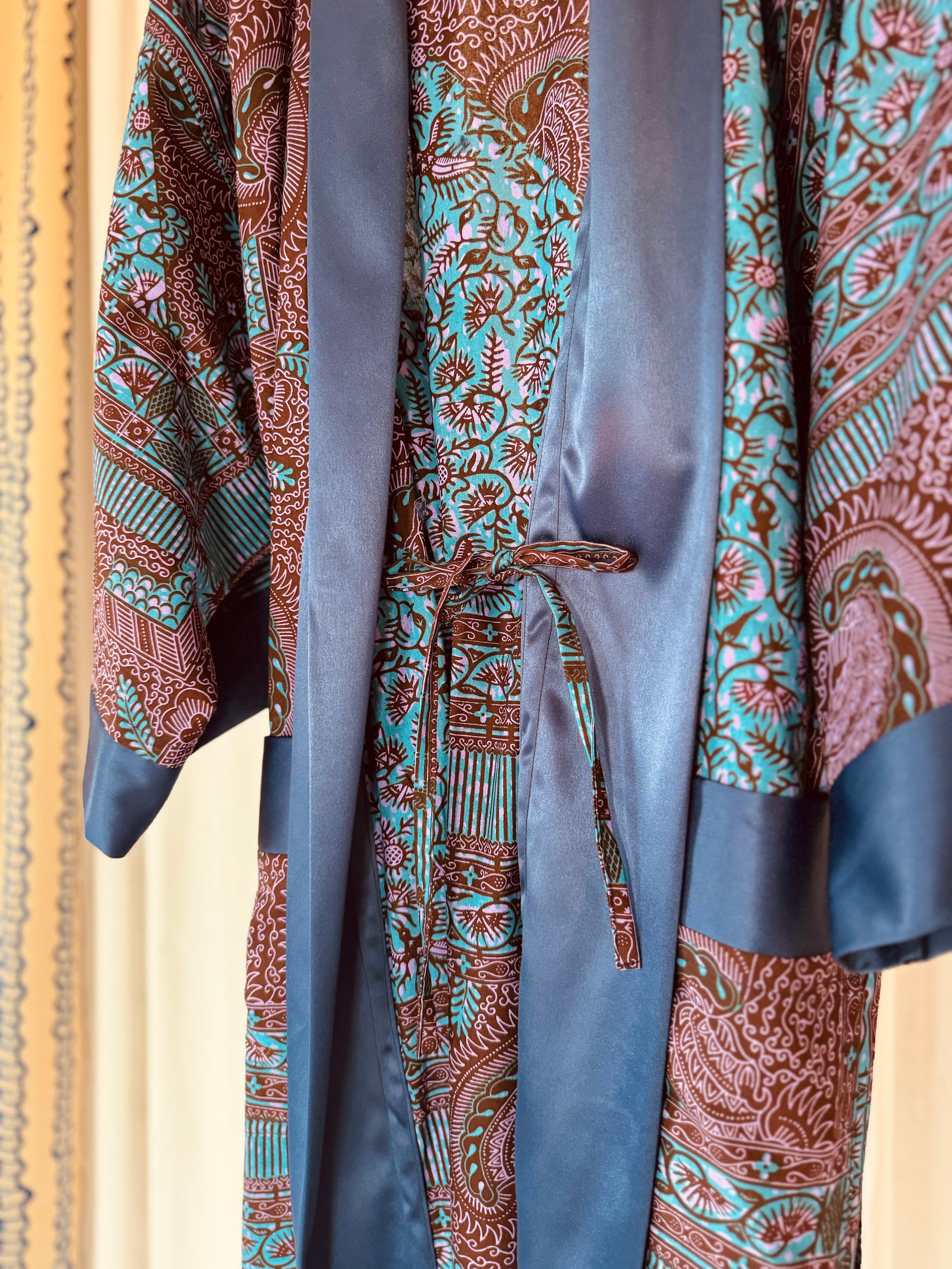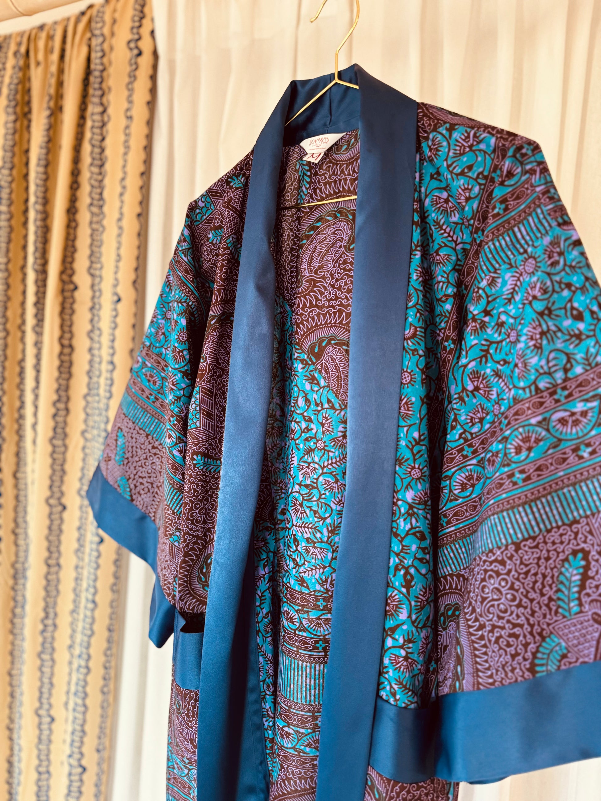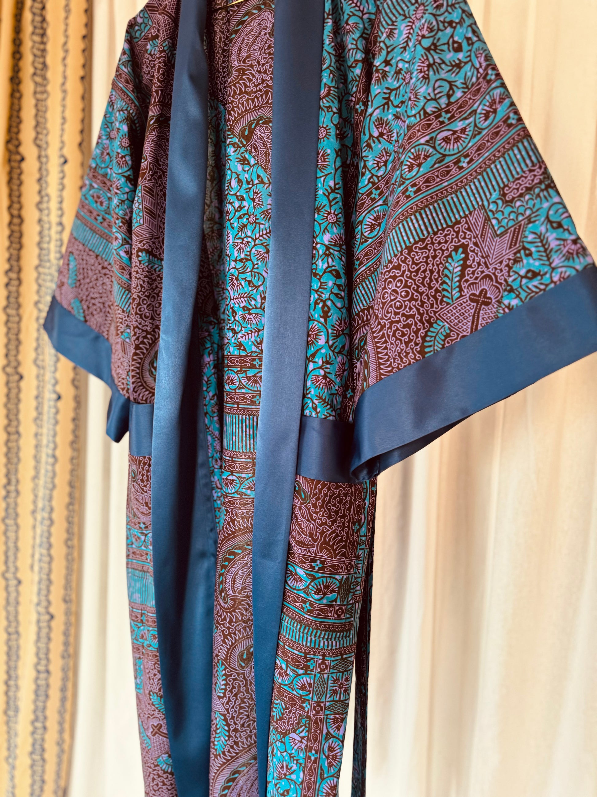 Indulge in luxurious comfort and regal elegance with the Afrikimo "Morning Glory II" with royal blue satin, exuding a fusion of rich tradition and modern sophistication. Crafted from silky royal blue satin, it is accented with a turquoise blue and purple African print, creating a striking middle ground of a robe that bestows confidence and serenity.