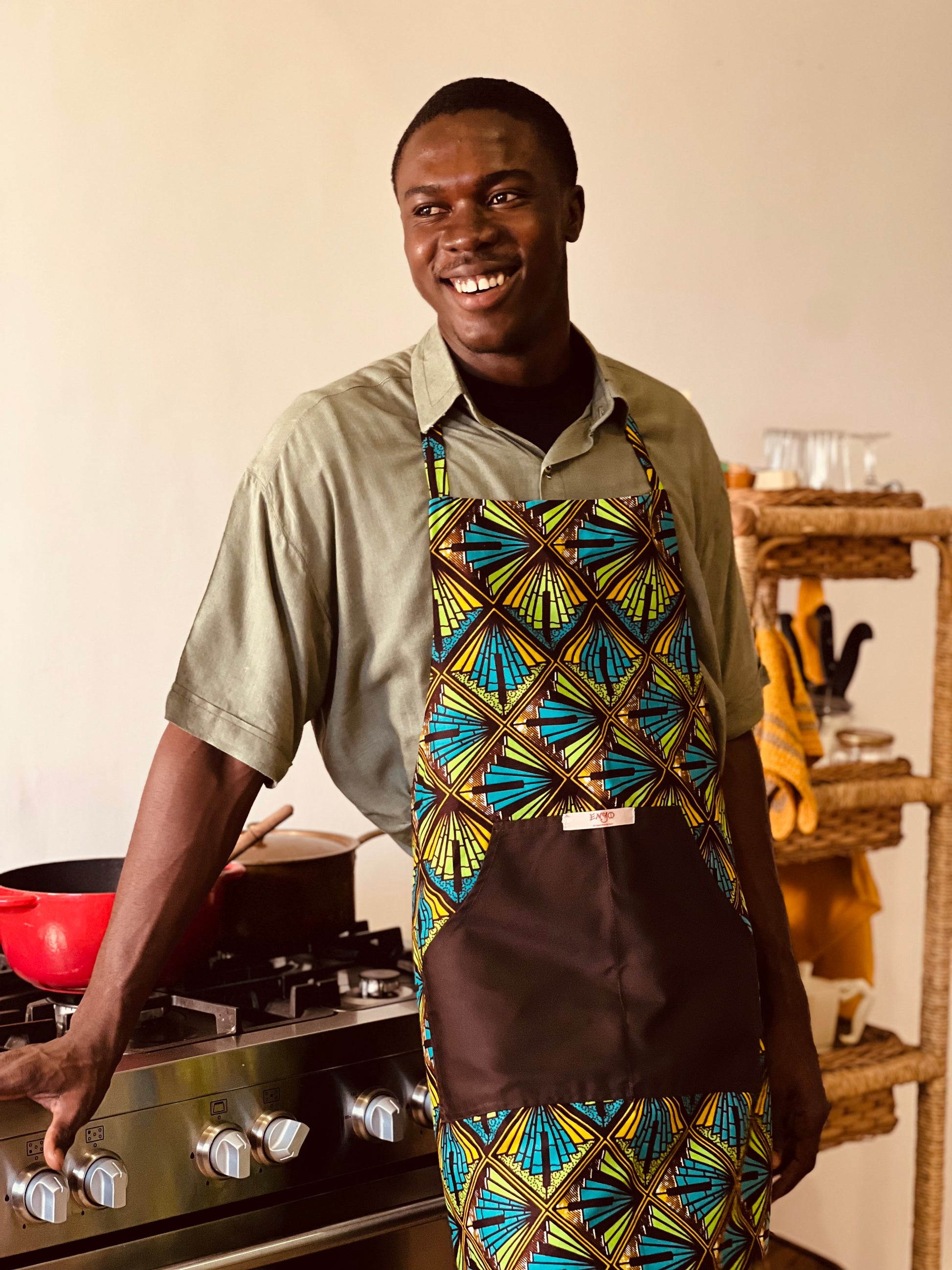 Our "Piano Bar" Apron features a pattern reminiscent of an African take on the Art Deco era in deep brown, lively green and ocean- blue. A nice glass of wine on the kitchen counter, the smell of rich aromas in the air, jazz tunes in the background: That's how you can imagine yourself bringing out your inner master chef wearing this unique and functional piece. With its reversible feature, you can switch up your look easily. The sturdy one-coloured cotton on one side offers versatility in style and extra protection provided by the double-layer in combination with the African Print. Large pockets on both sides conviniently serve as practical storage for cooking utensils, your phone or recipes. A must-have for the modern man.