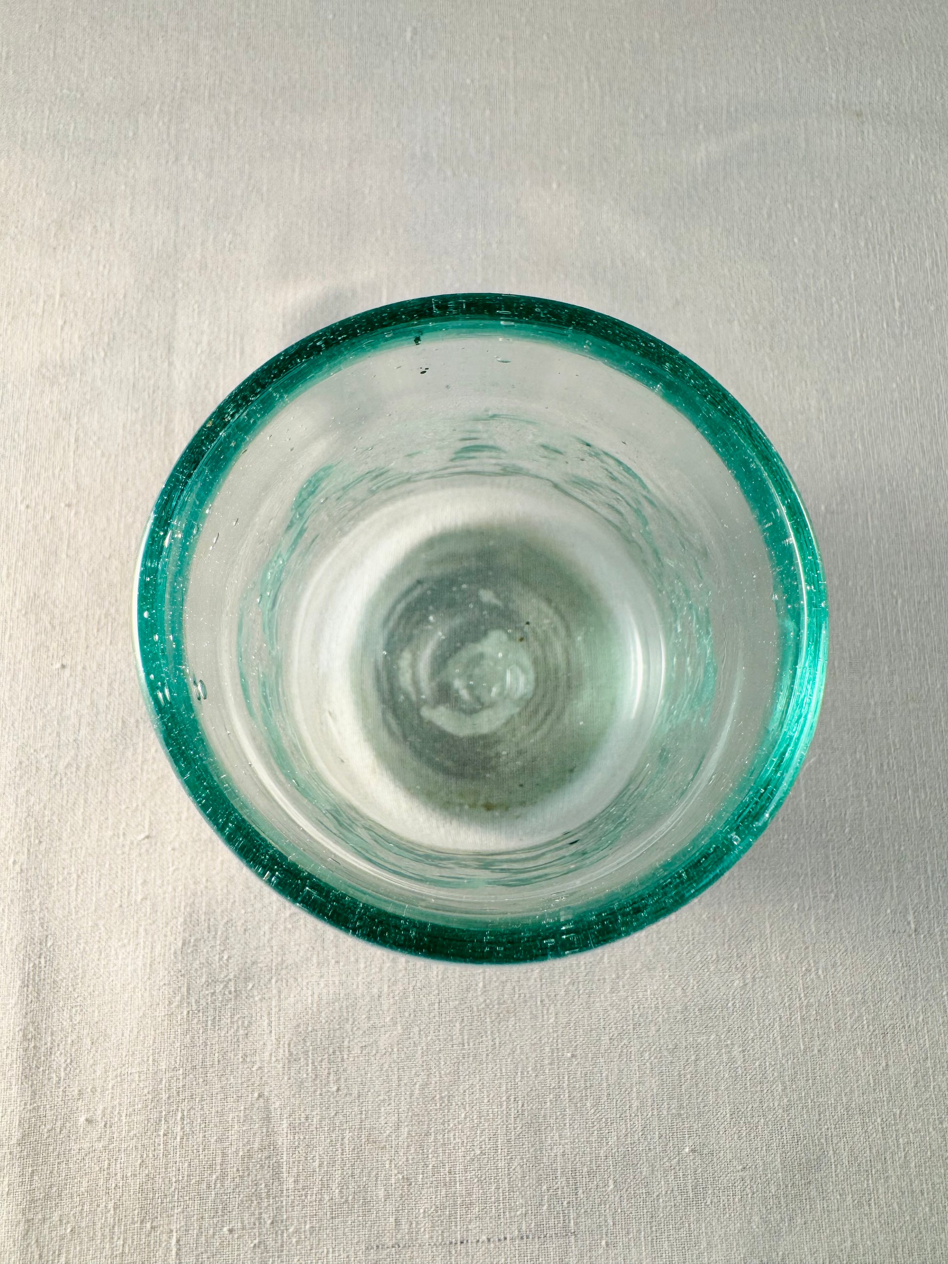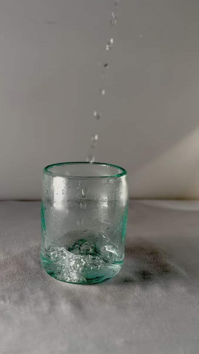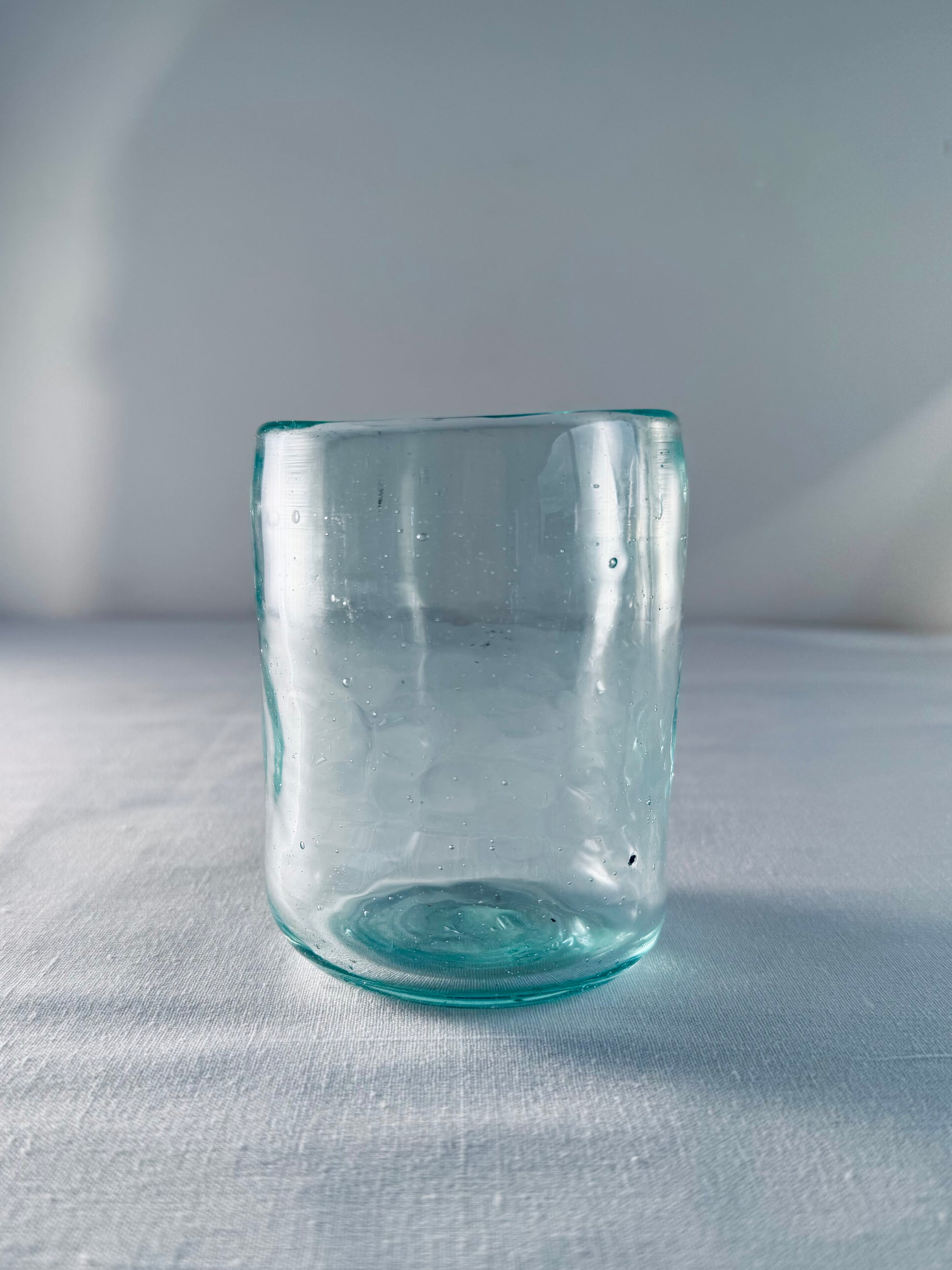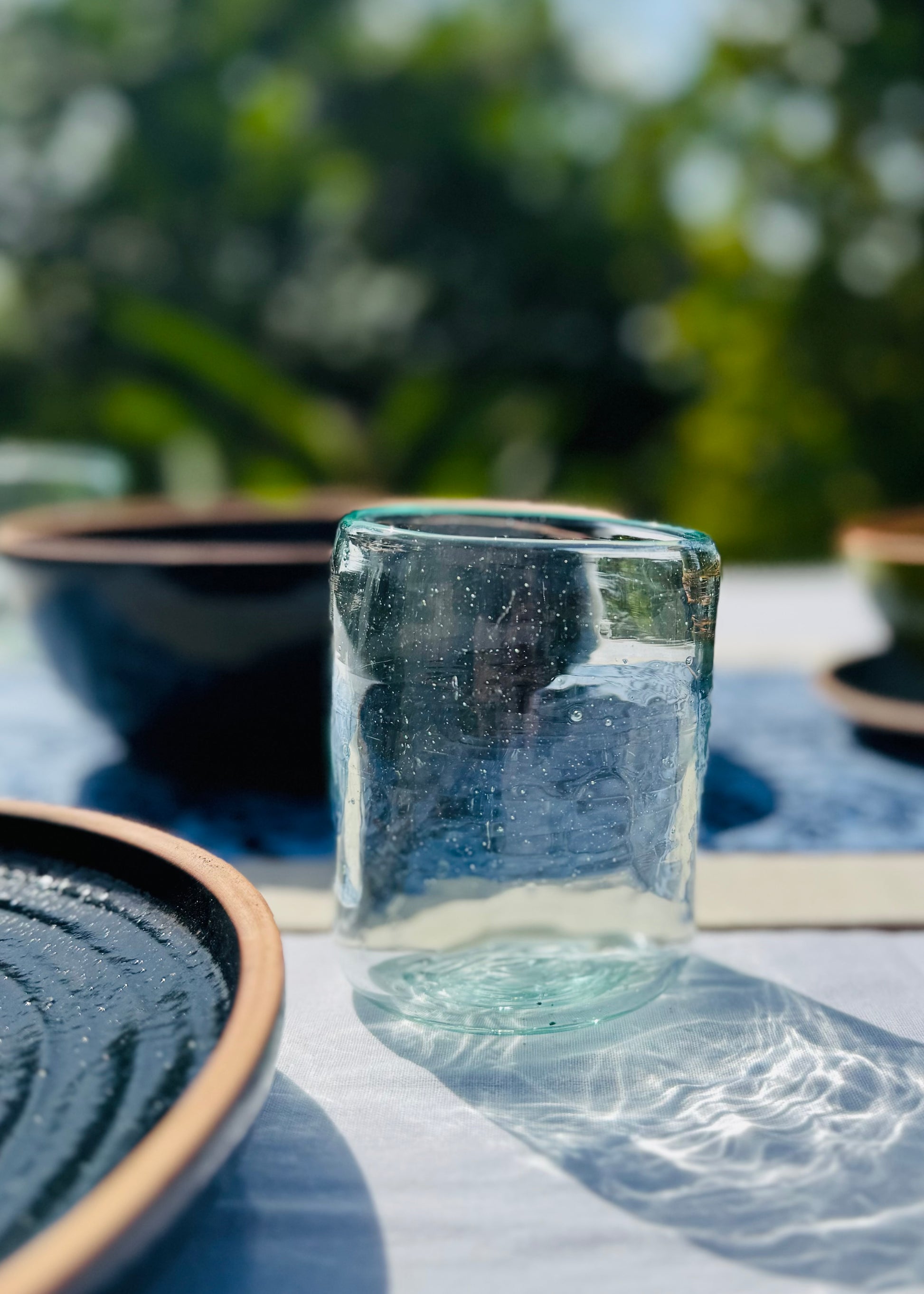 Crafted from recycled glass, the Glass Cup "Ocean Green" transforms repurposed louvers into a stunning, eco-friendly vessel. With a capacity of approximately 300 ml, its clear design features a captivating ocean-green shimmer reminding you of a fresh breeze of Ghana's beaches, adding a touch of natural elegance to your drinkware. Each single bubble in the glass tells a story of the traditional glassblowing technique forming one-of-a-kind glass cups, ready to lighten up your home.