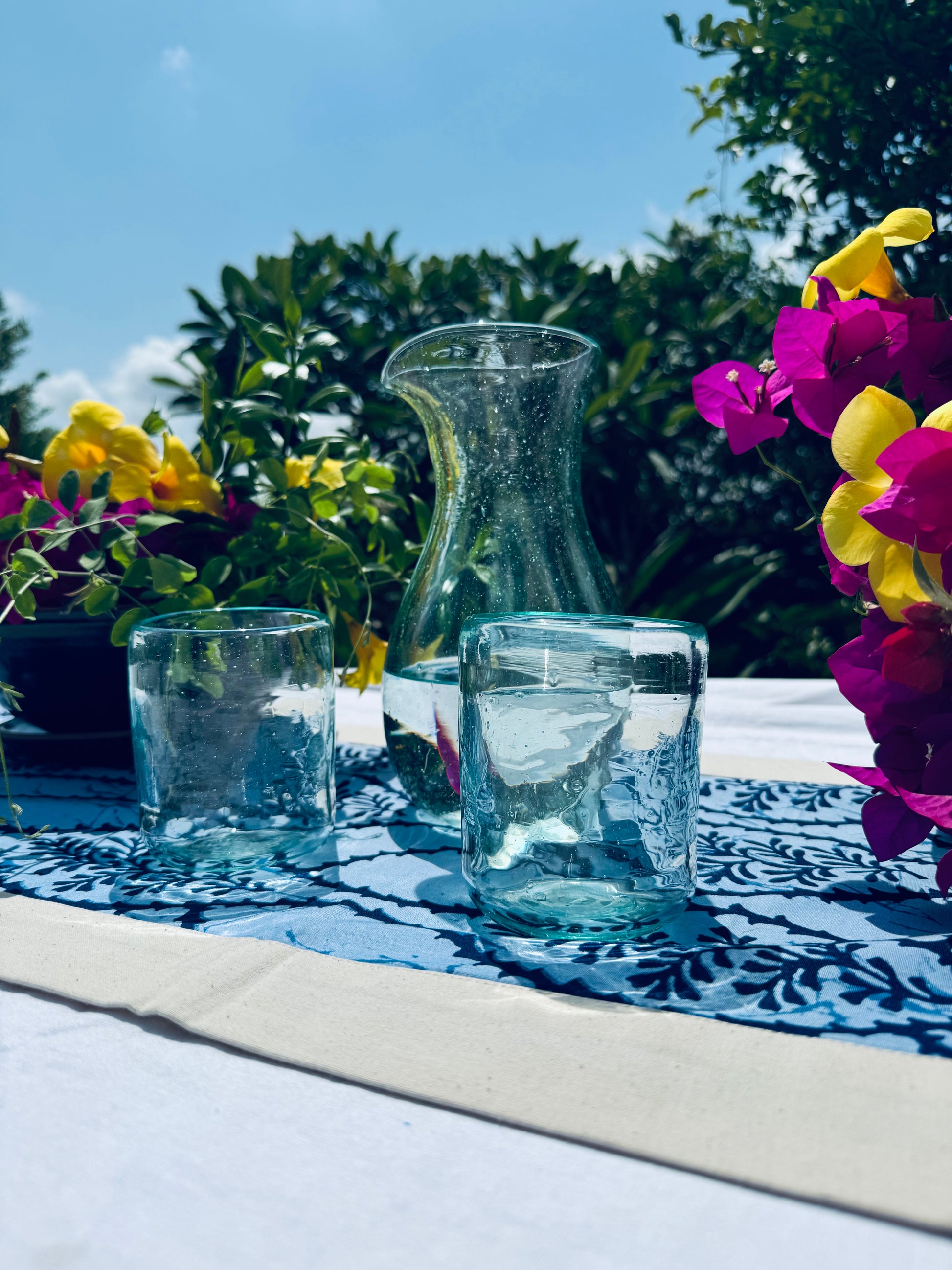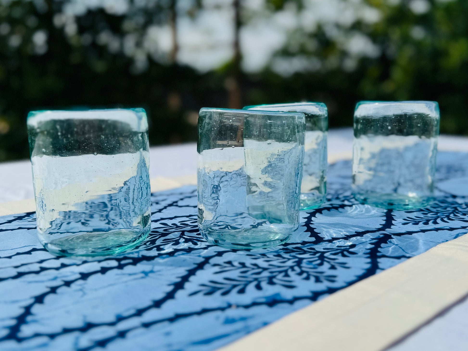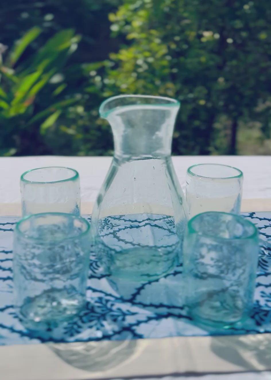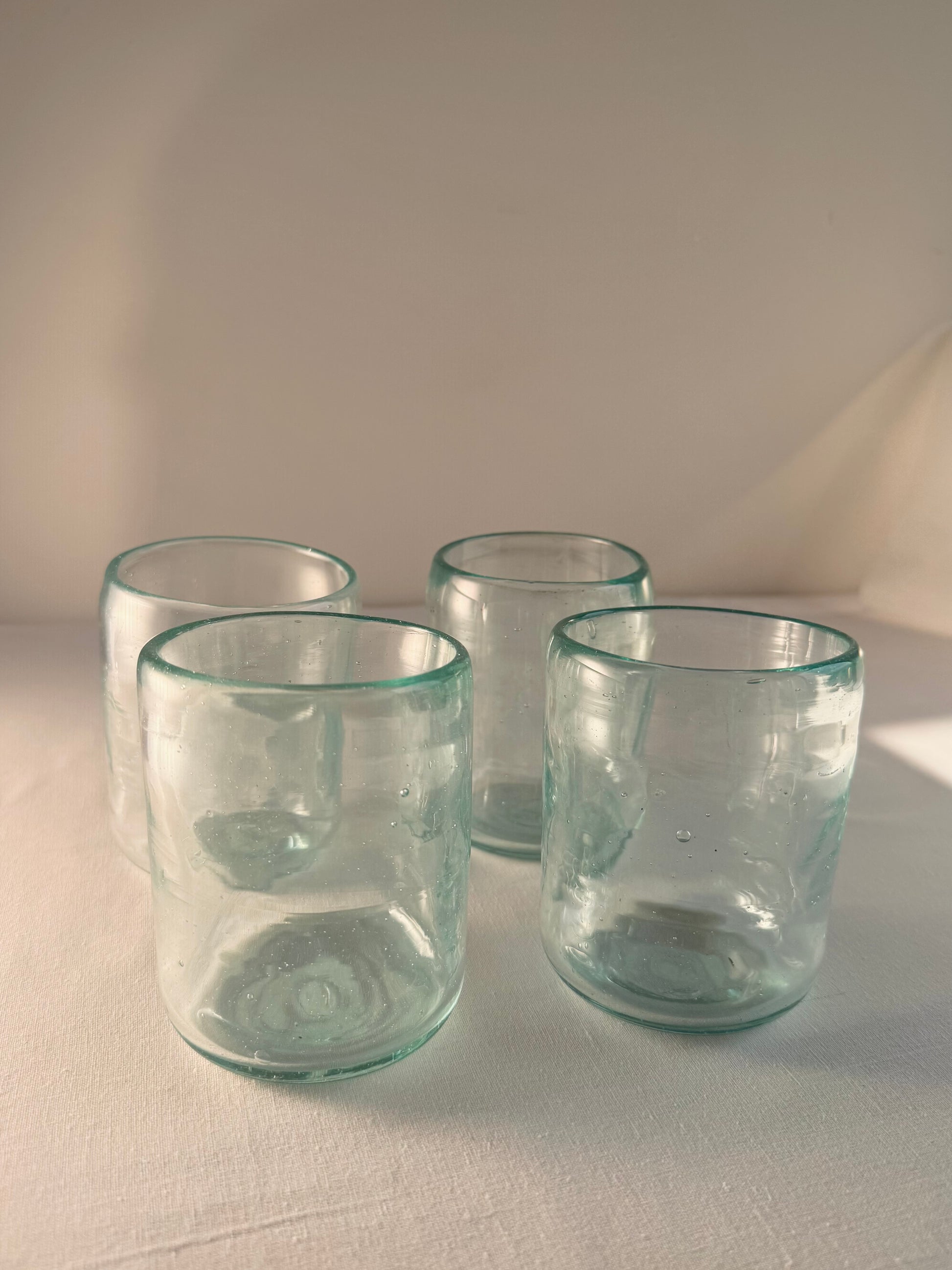 Crafted from recycled glass, the Glass Cup "Ocean Green" transforms repurposed louvers into a stunning, eco-friendly vessel. With a capacity of approximately 300 ml, its clear design features a captivating ocean-green shimmer reminding you of a fresh breeze of Ghana's beaches, adding a touch of natural elegance to your drinkware. Each single bubble in the glass tells a story of the traditional glassblowing technique forming one-of-a-kind glass cups, ready to lighten up your home.
