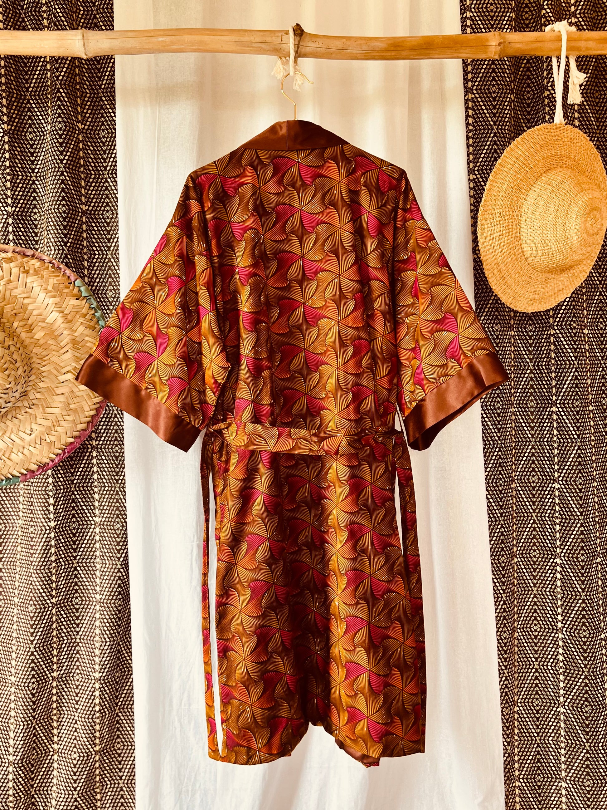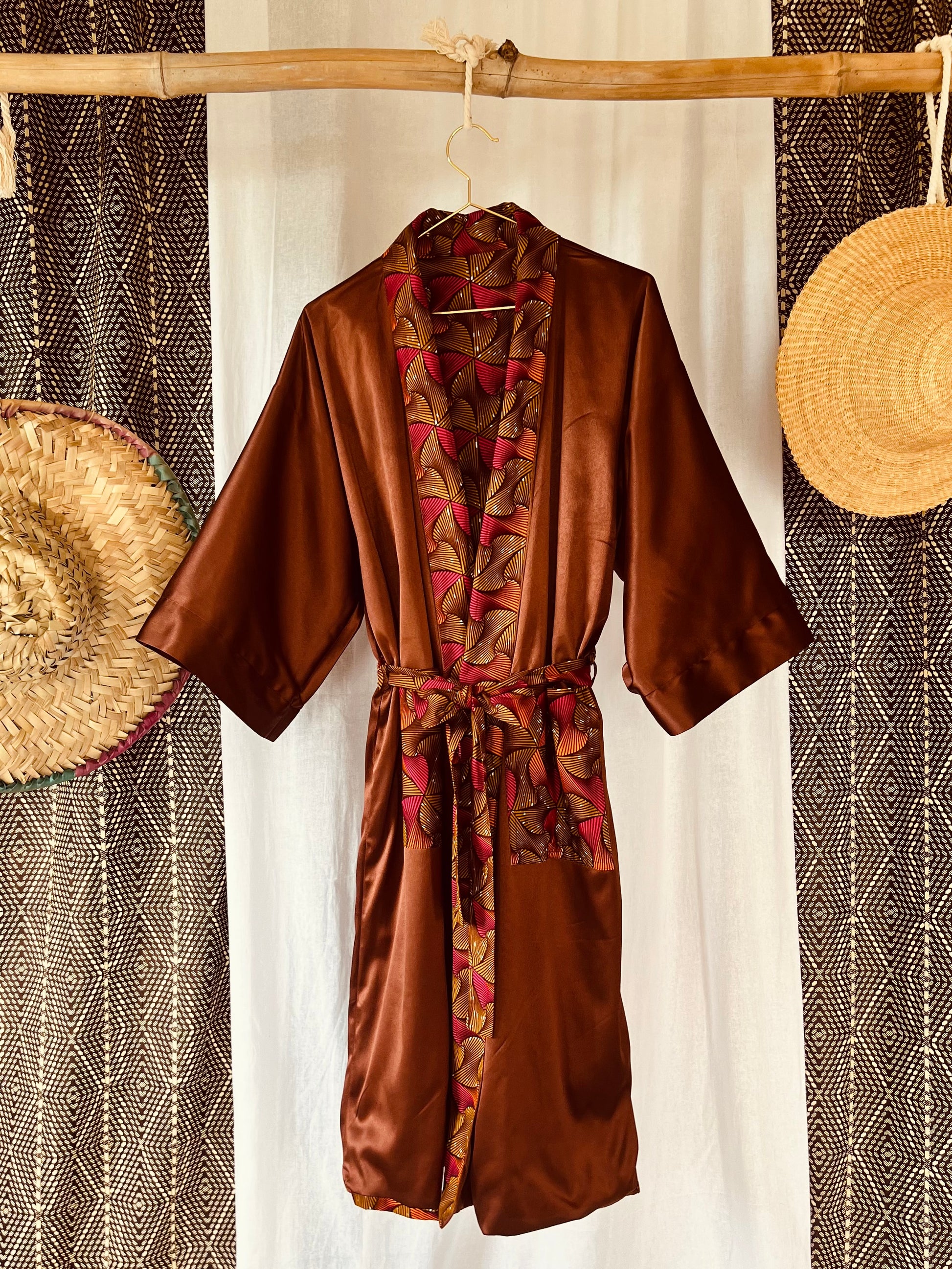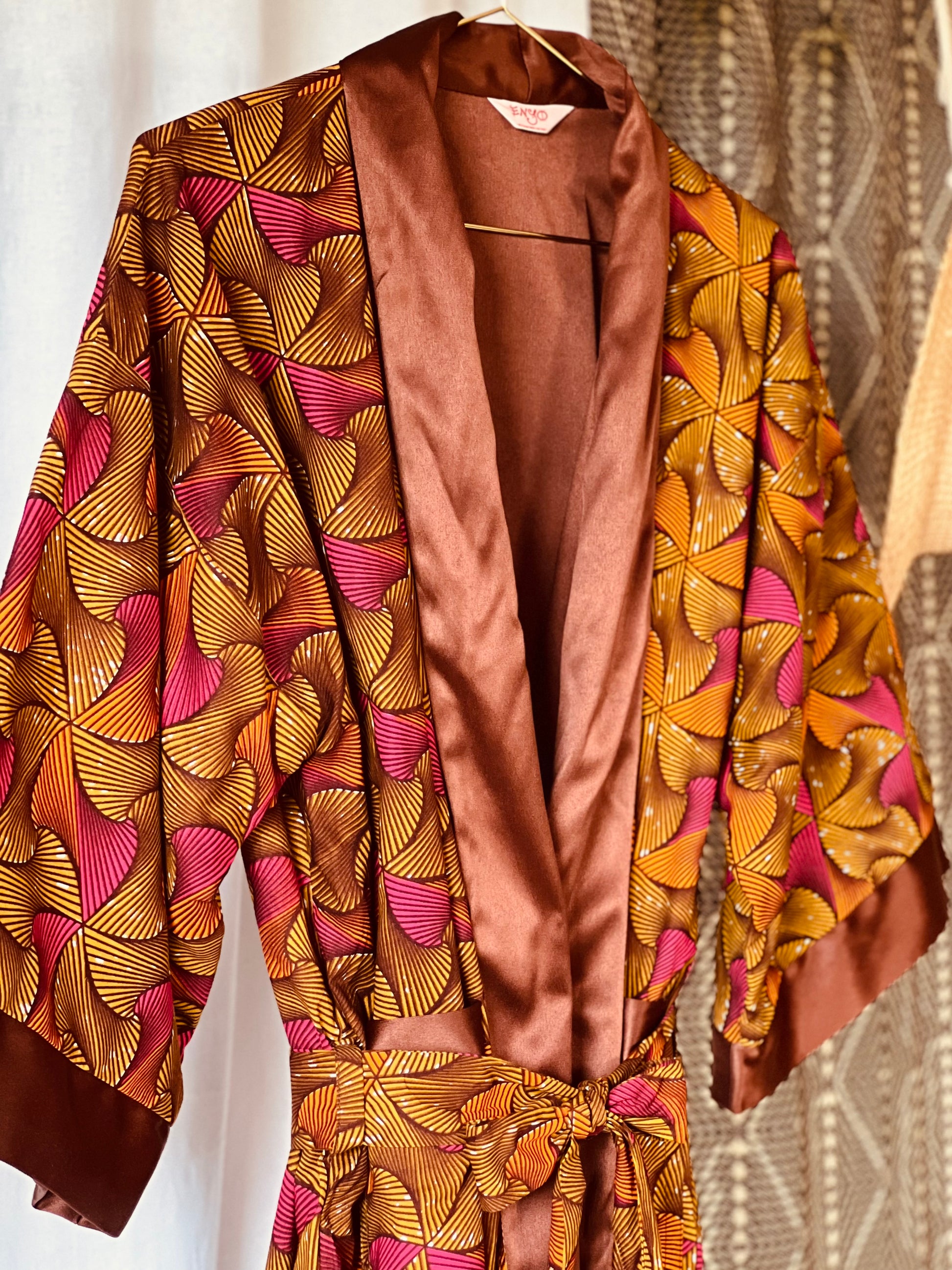 Dance to your own beat with our Afrikimo "Subtle Beating Drum"! This reversible piece combines African Print fabric featuring a warm pink with more subtle brown tones in combination with brown luxurious satin. Perfect to unwind on a relaxing sunday - or literally any other day - or for a slow dance with your love. This versatile Afrikimo lets you choose between playful or serene, depending on which side you put on display.