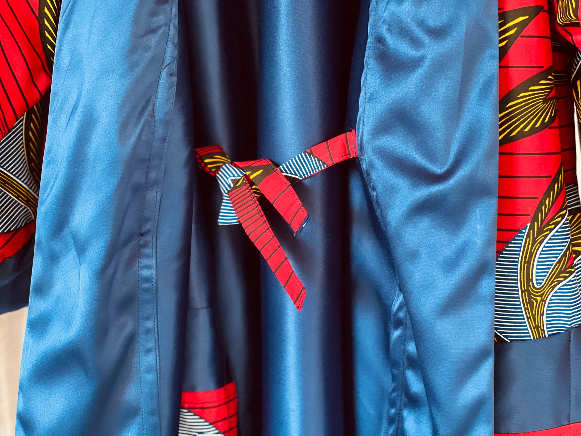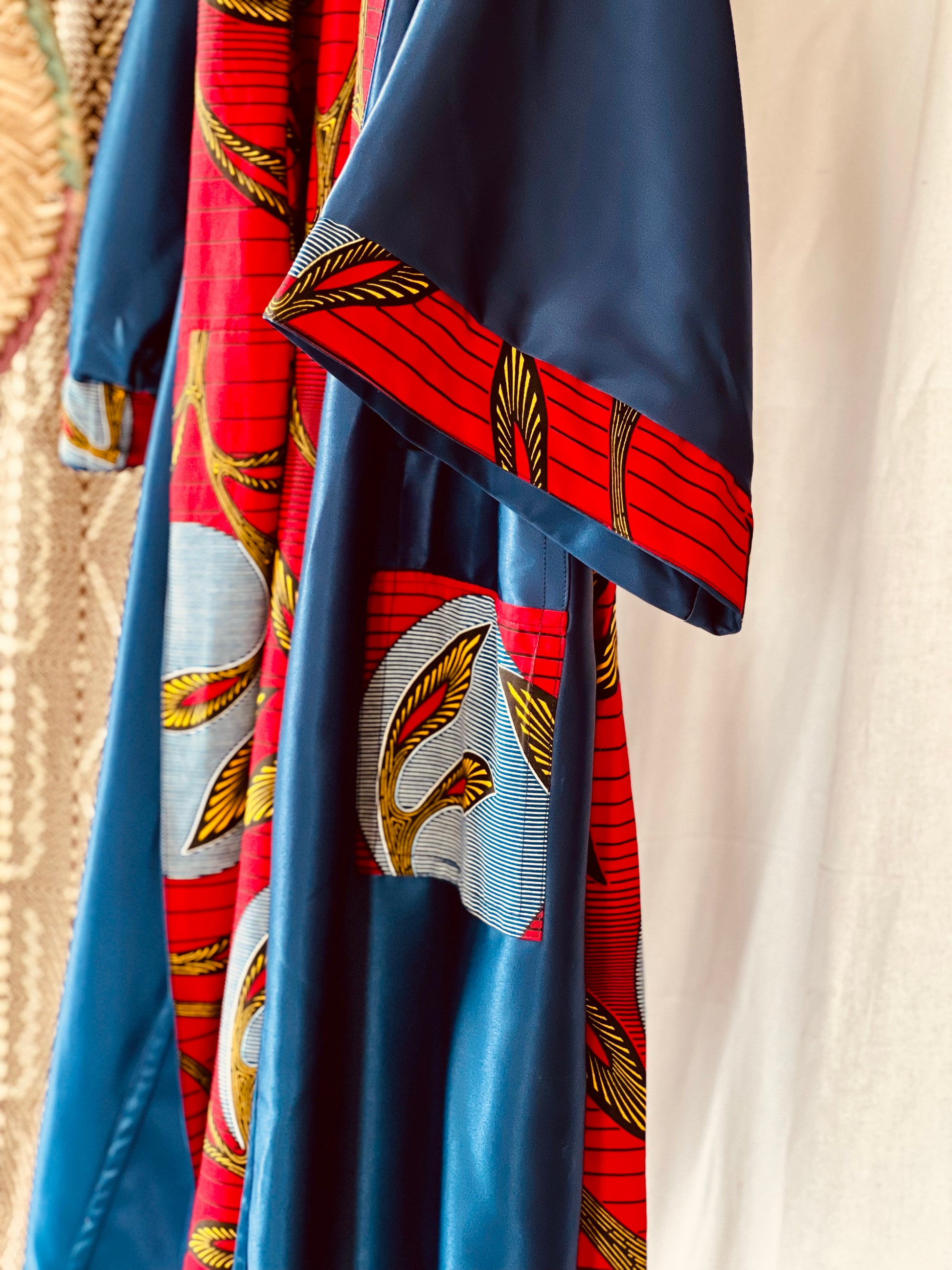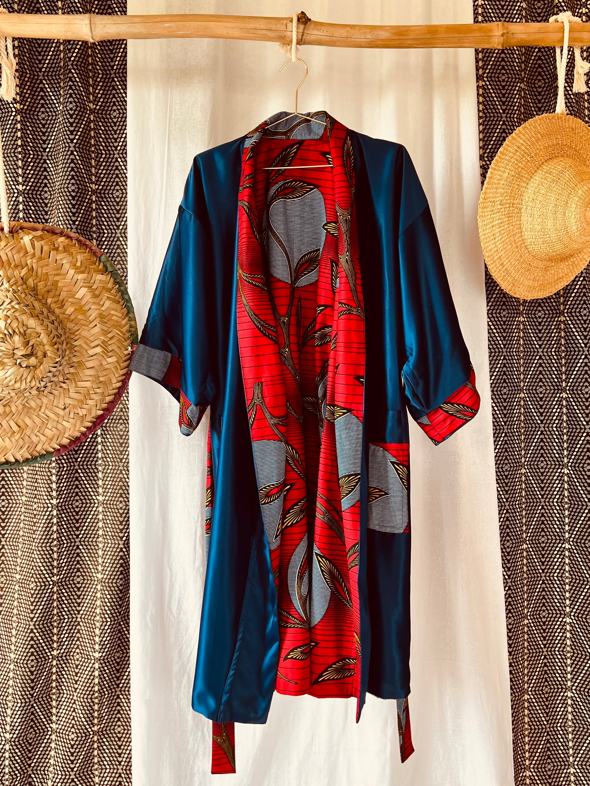 Indulge in relaxation and luxury with our Afrikimo "Moon Flower". Featuring a unique combination of bold red African print and luxurious midnight blue satin, this reversible kimono is as versatile as you are. Perfect for cozy mornings, late midnights or simply any time of the day when you choose to pamper yourself and unwind.