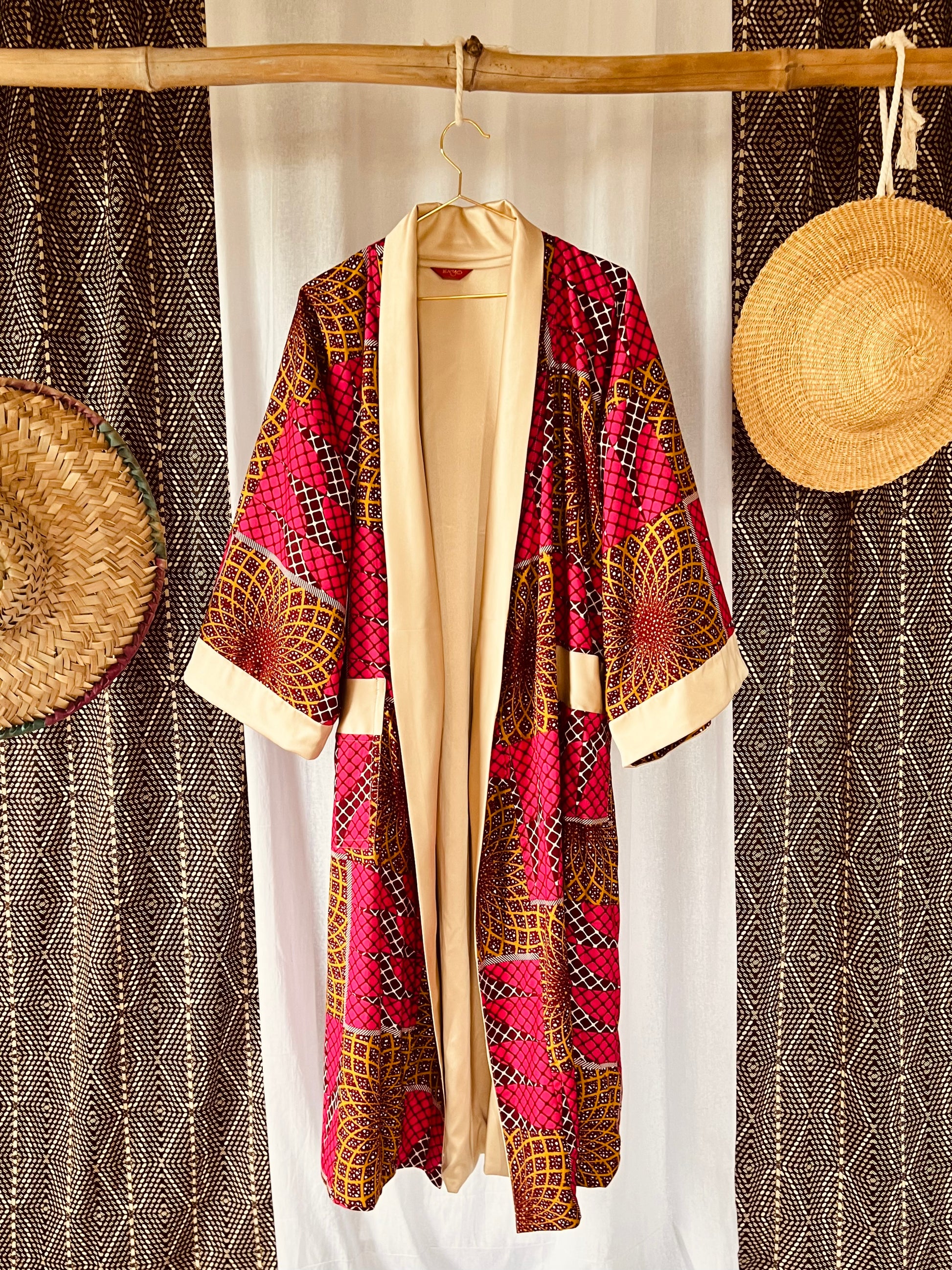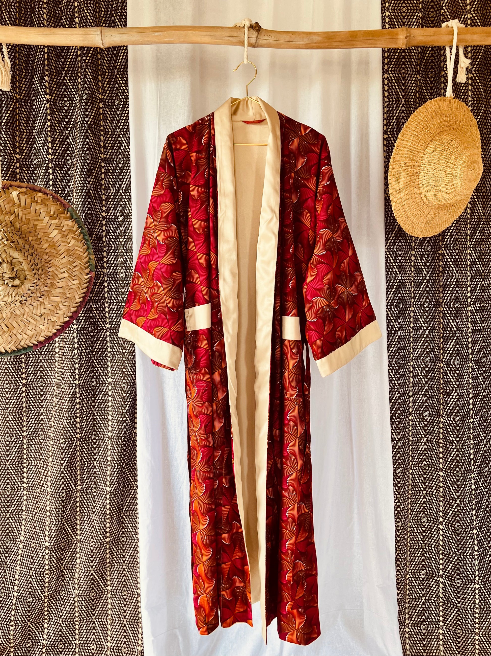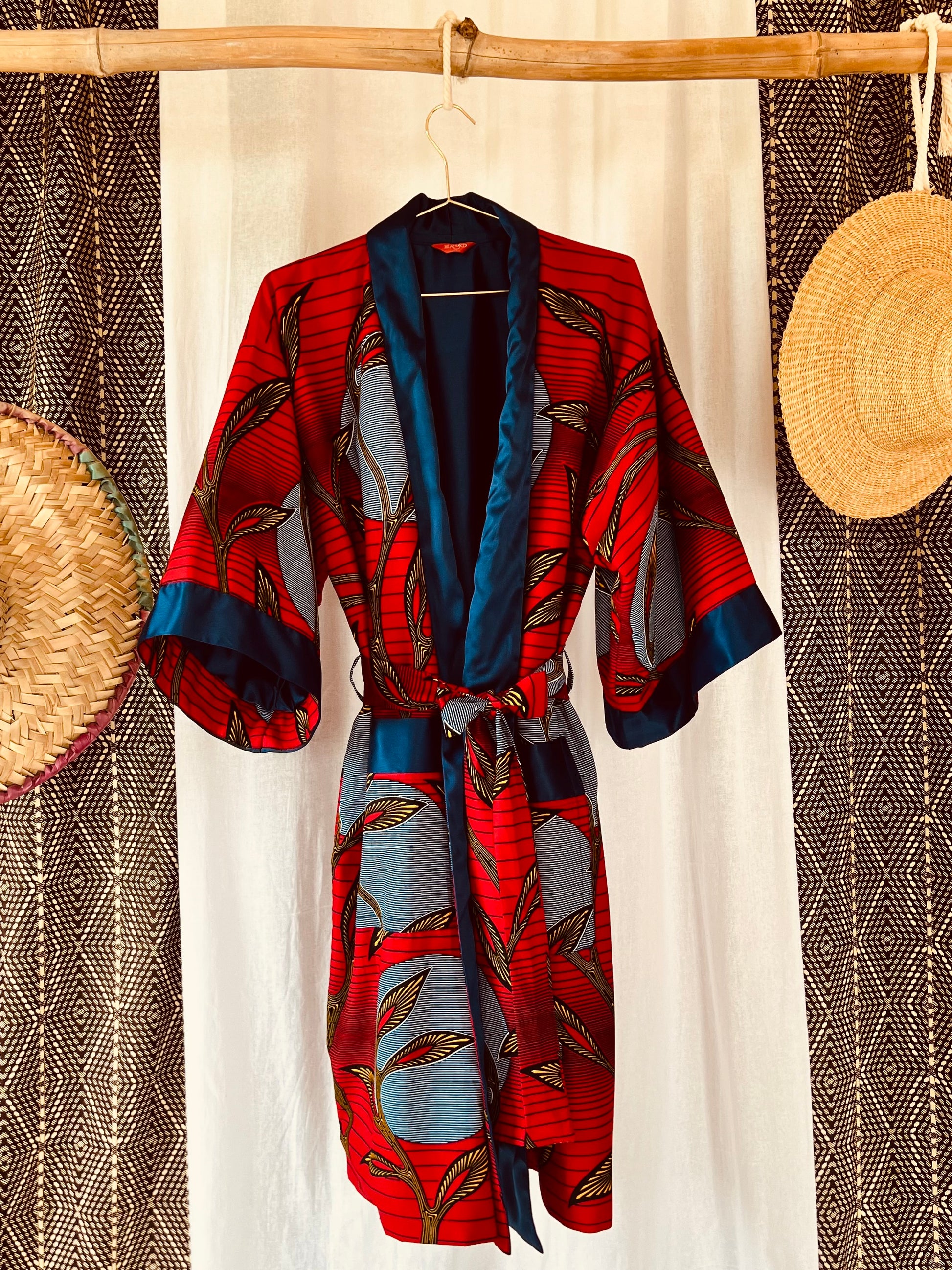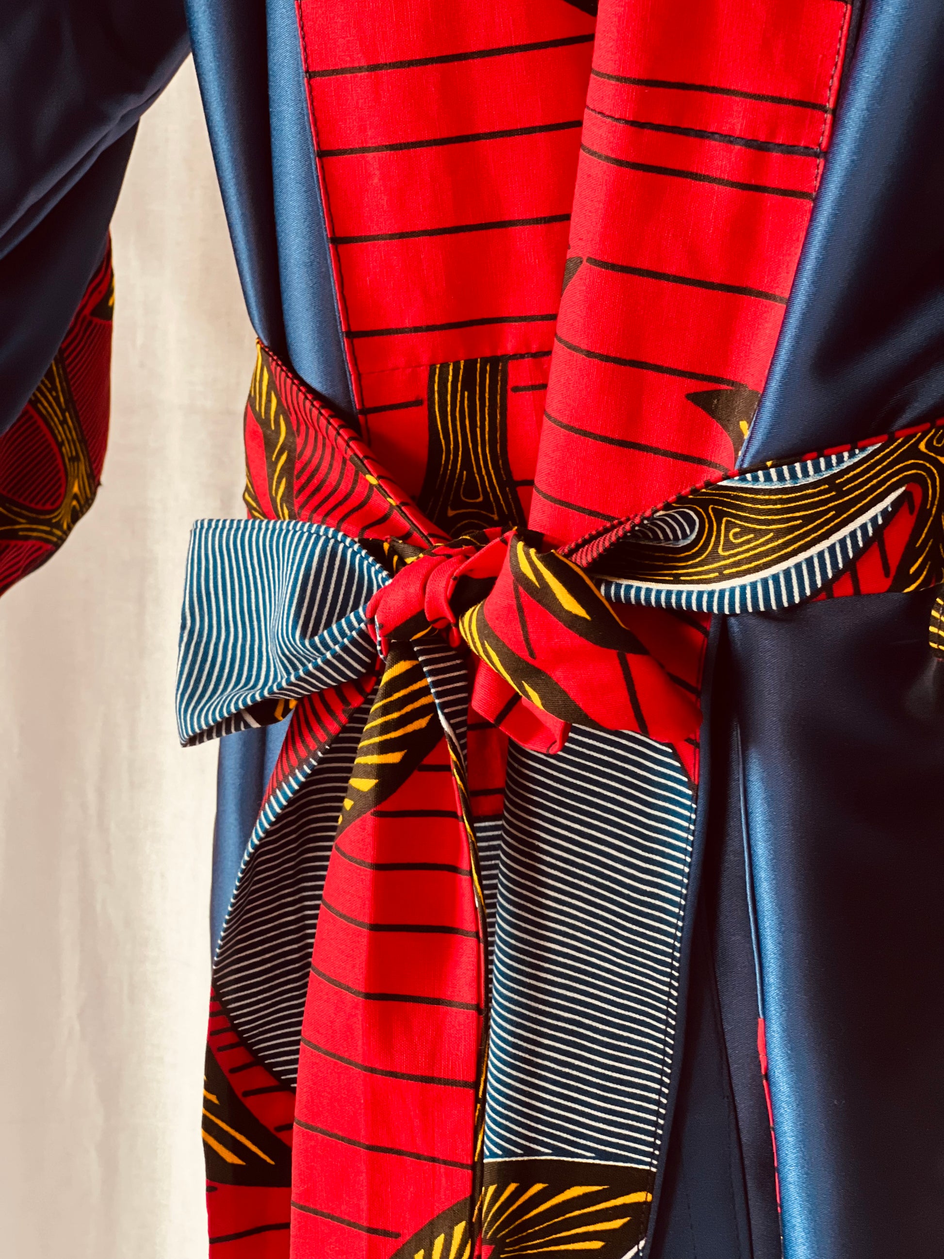 Indulge in relaxation and luxury with our Afrikimo "Moon Flower". Featuring a unique combination of bold red African print and luxurious midnight blue satin, this reversible kimono is as versatile as you are. Perfect for cozy mornings, late midnights or simply any time of the day when you choose to pamper yourself and unwind.