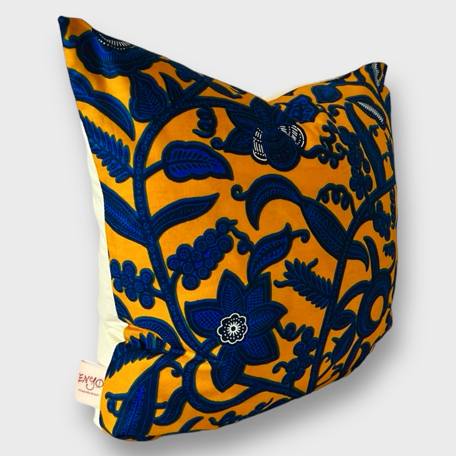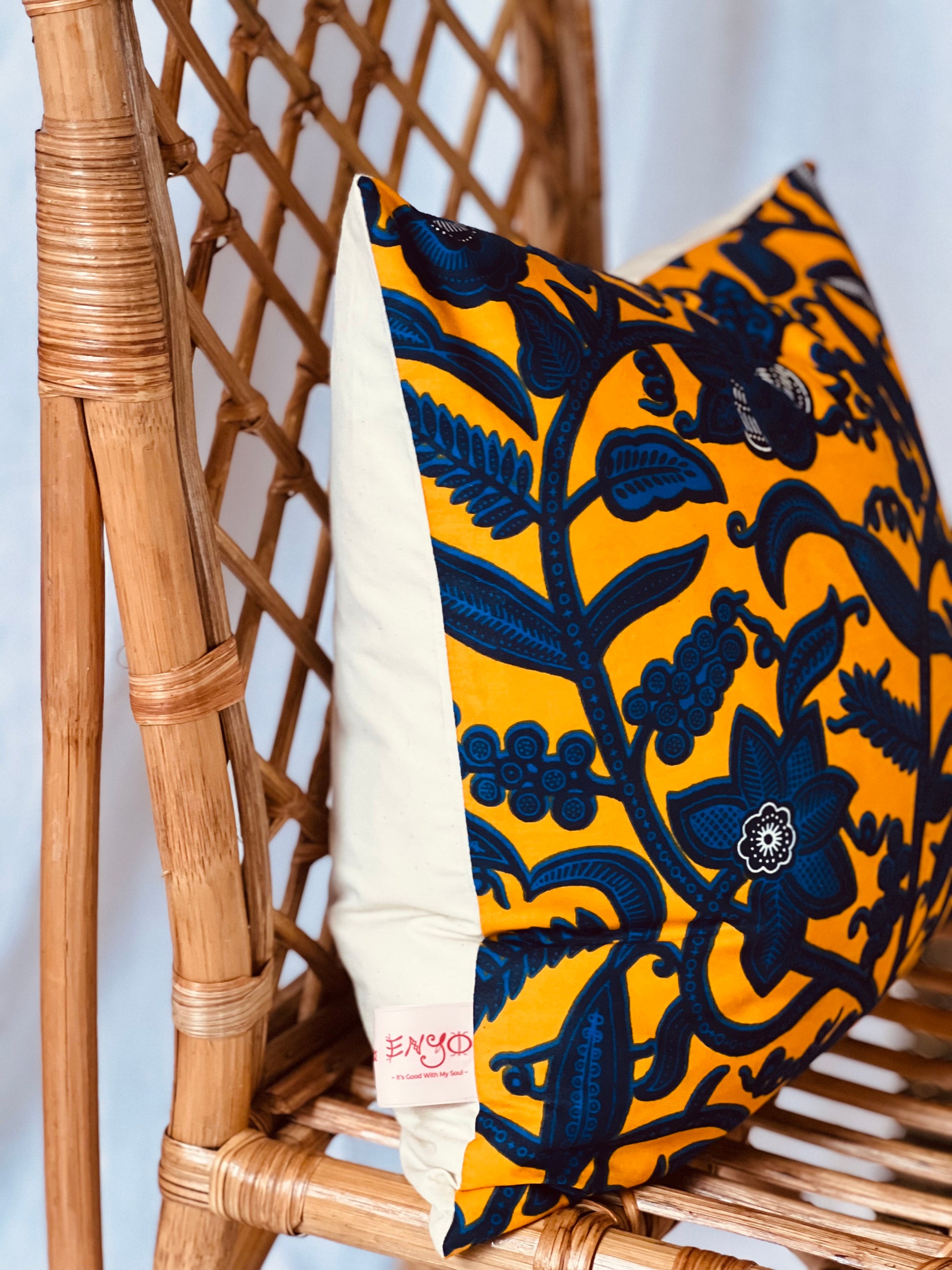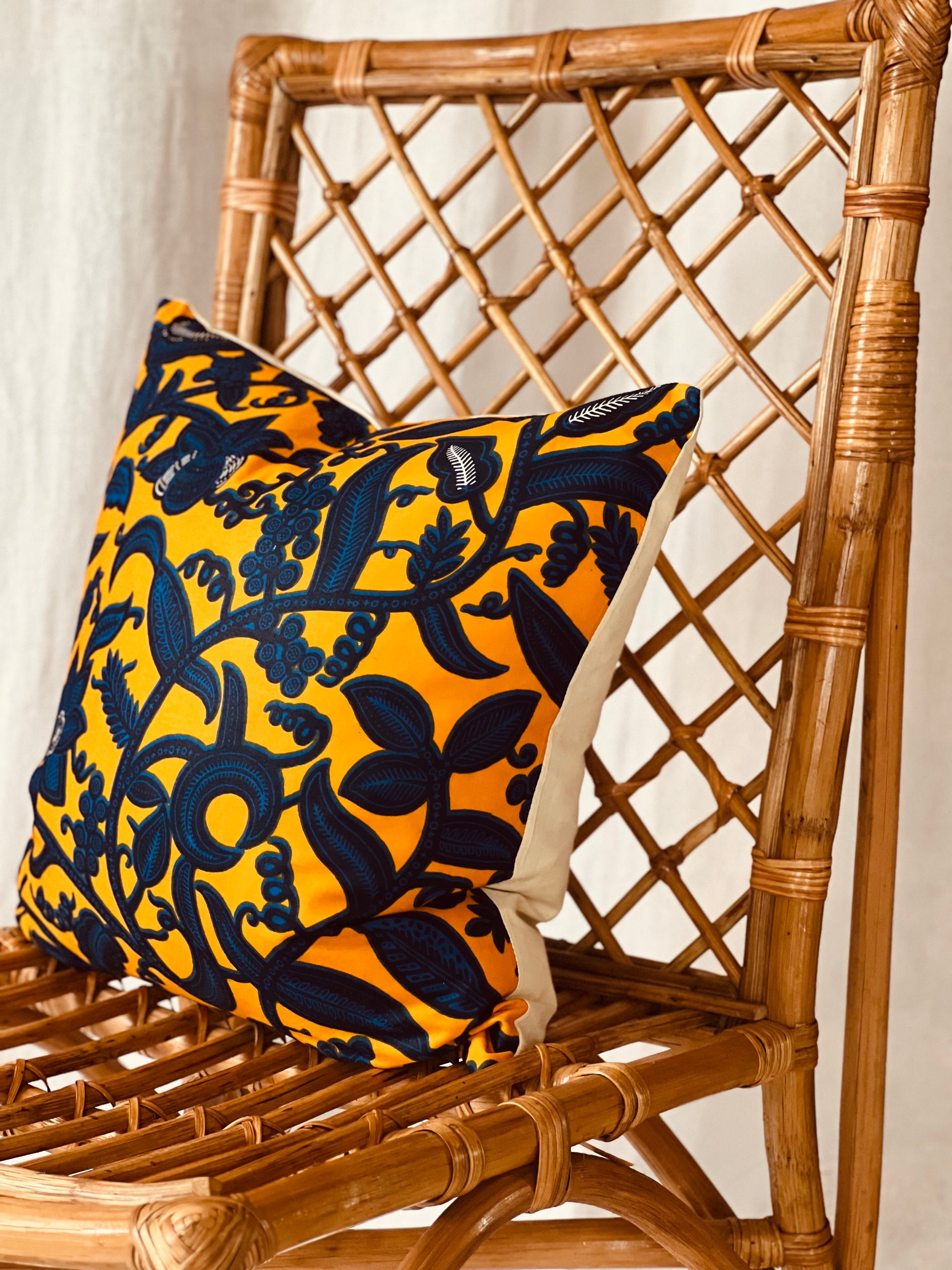 Let our "Rise and Shine" pillowcase bring a burst of energy to your space! Vivid African Print meets creme natural cotton on the back, topped with a hidden zip for easy fitting. The perfect pop of colour for any room. The splash of blue on mango yellow radiates the vibrancy that we so love about African Prints!