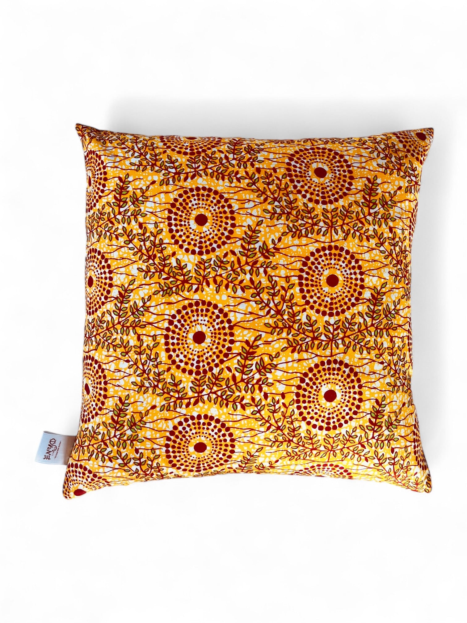 Add a pop of color and good vibes to your living space with our "Foliage Fireworks" pillowcase. Made from fine African Print with red floral foliage spanning across the fabric and firework inspired highlights on a happy sunny-yellow background, this throw pillow is sure to inspire a joyful mood. The shiny creme coloured finish on the back makes it an extra-classy piece to add to the styling of any room. Embrace the floral design and treat your couch, accent chair or bed to some stylish flair!