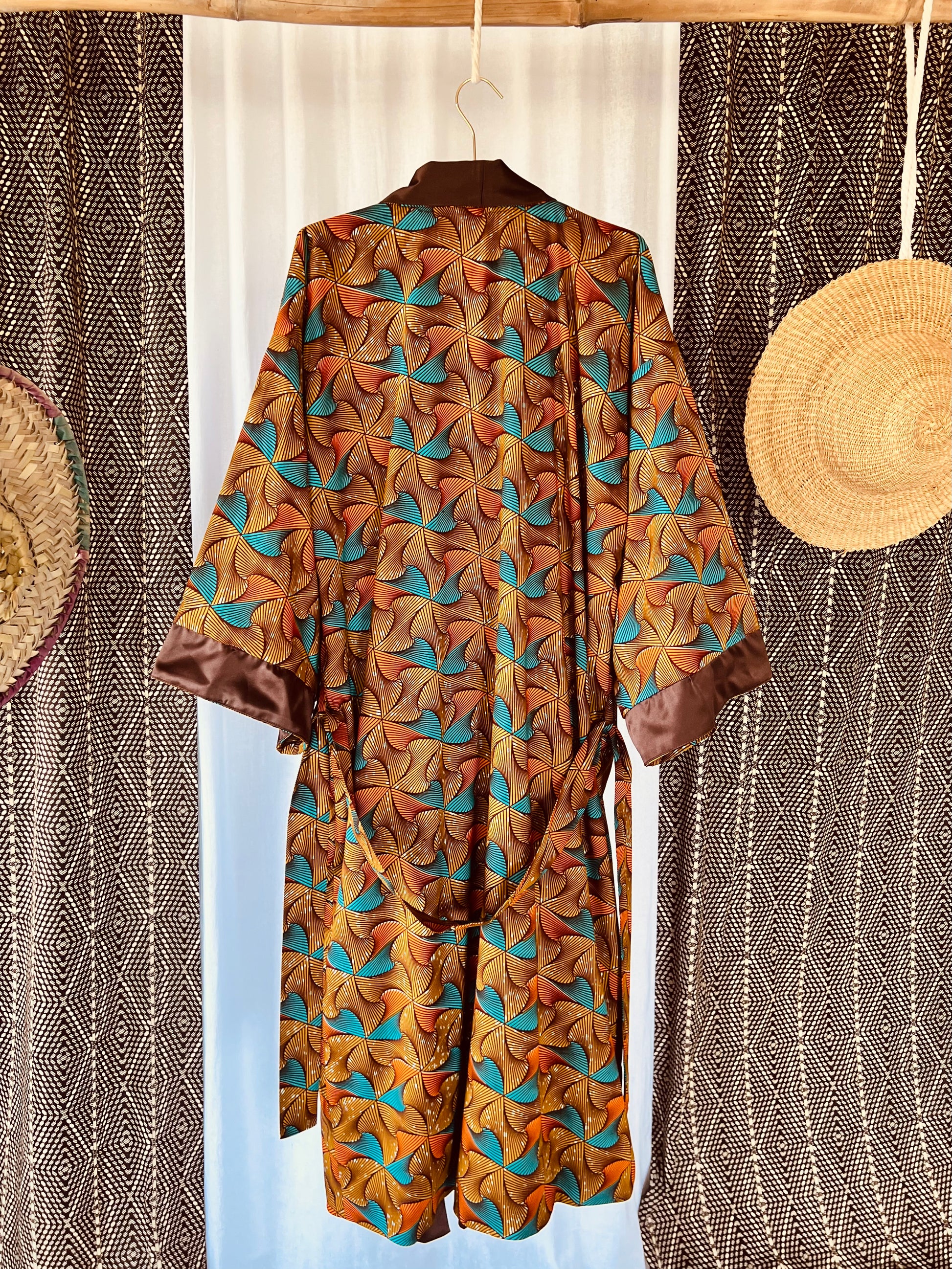 Dance to your own beat with our Afrikimo "Subtle Beating Drum"! This reversible piece combines African Print fabric featuring a warm blue with more subtle brown tones in combination with brown luxurious satin. Perfect to unwind on a relaxing Sunday - or literally any other day - or for a slow dance with your love. This versatile Afrikimo lets you choose between playful or serene, depending on which side you put on display.